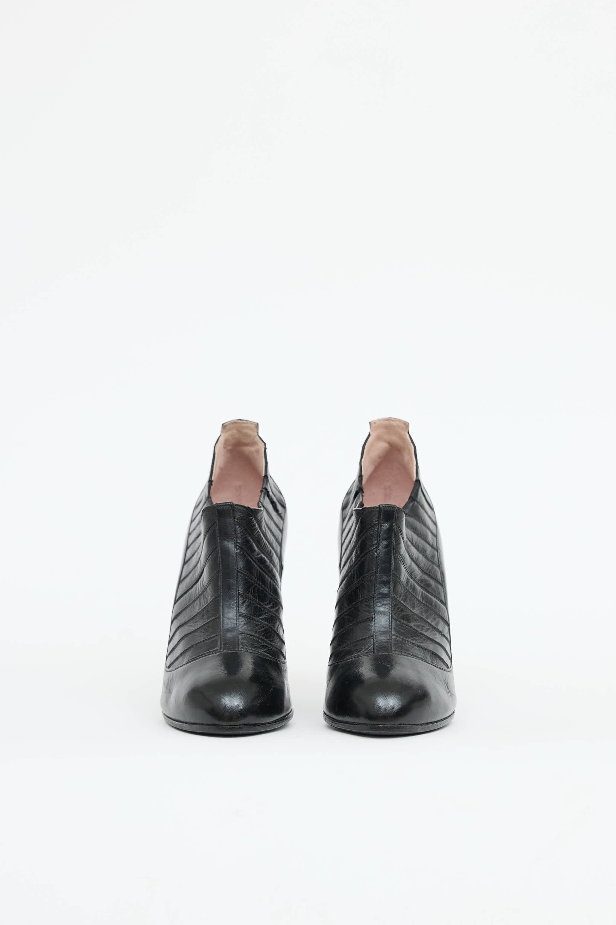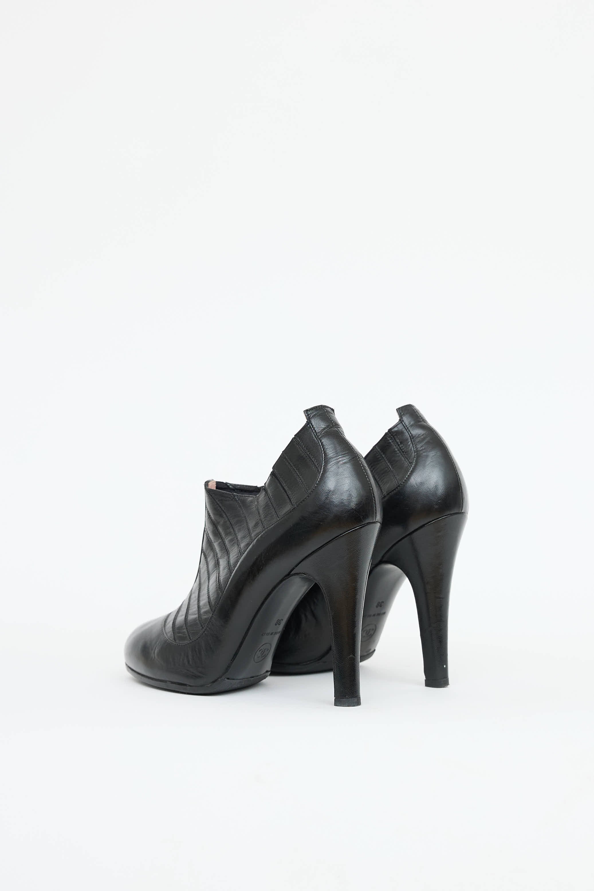 Pre-owned Chanel black leather ankle bootie featuring almond toe, paneled upper, and covered heel.