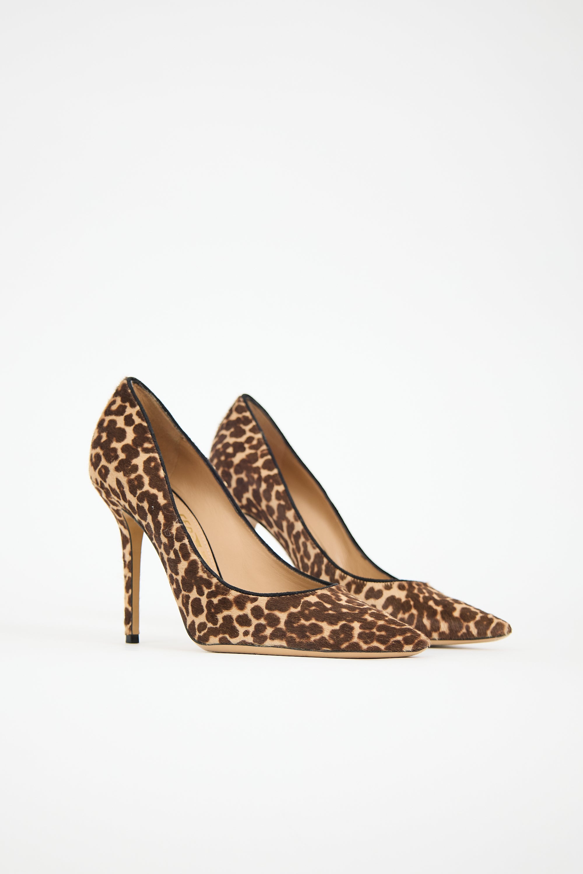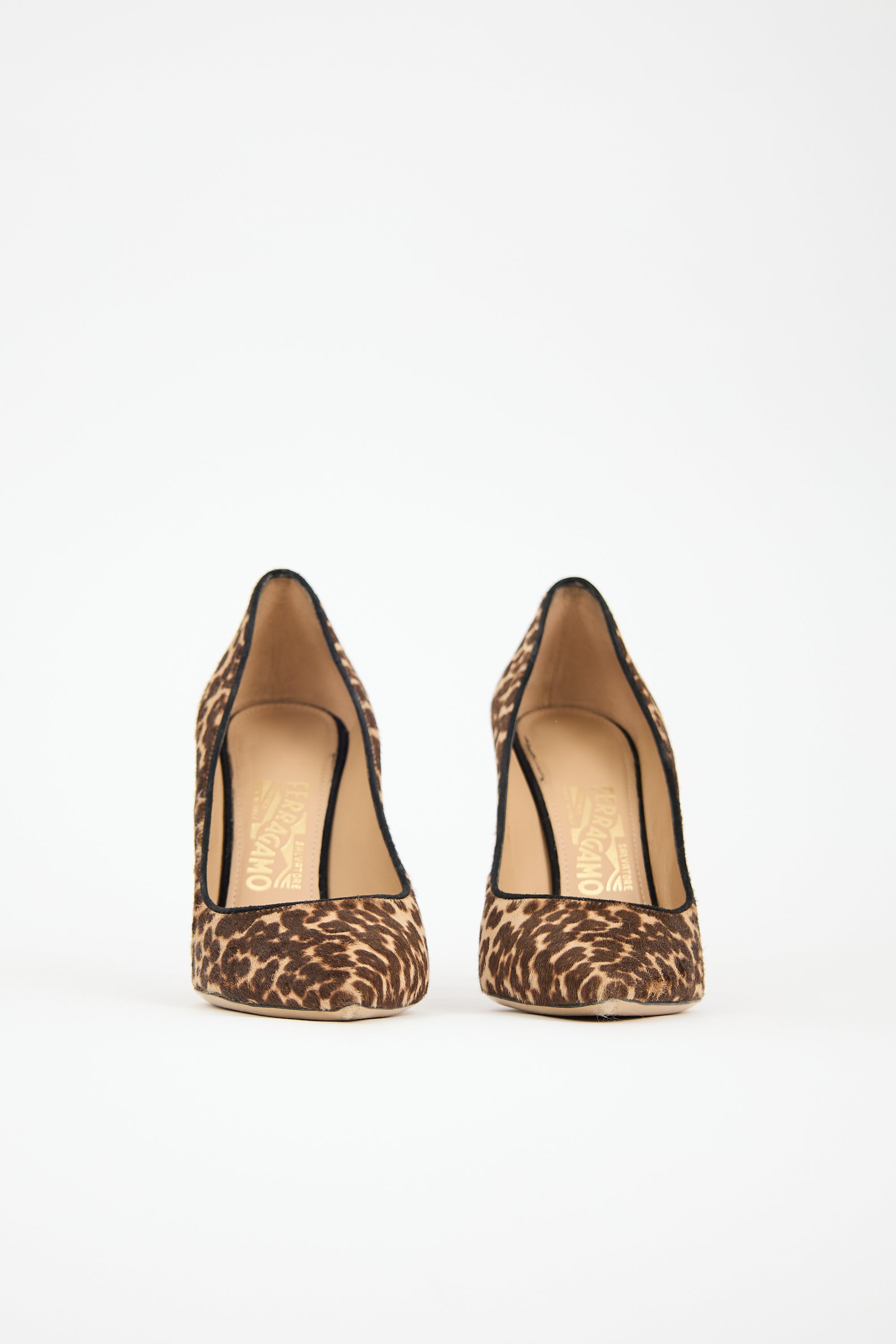 Pre-owned Ferragamo brown and beige hair pumps featuring pointed toe, cheetah print, and covered stiletto heel. Comes with original dust bags and spare heel tips.