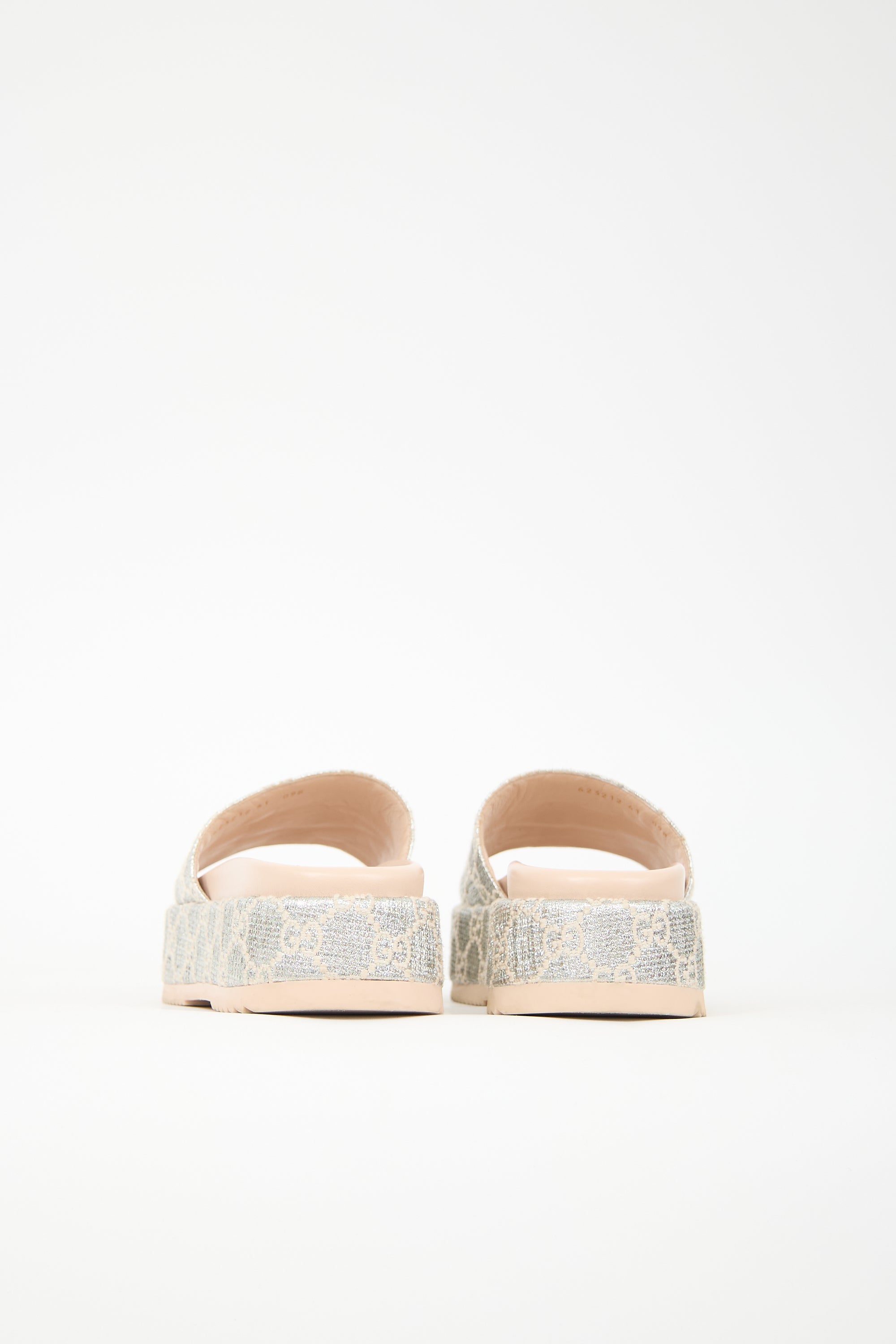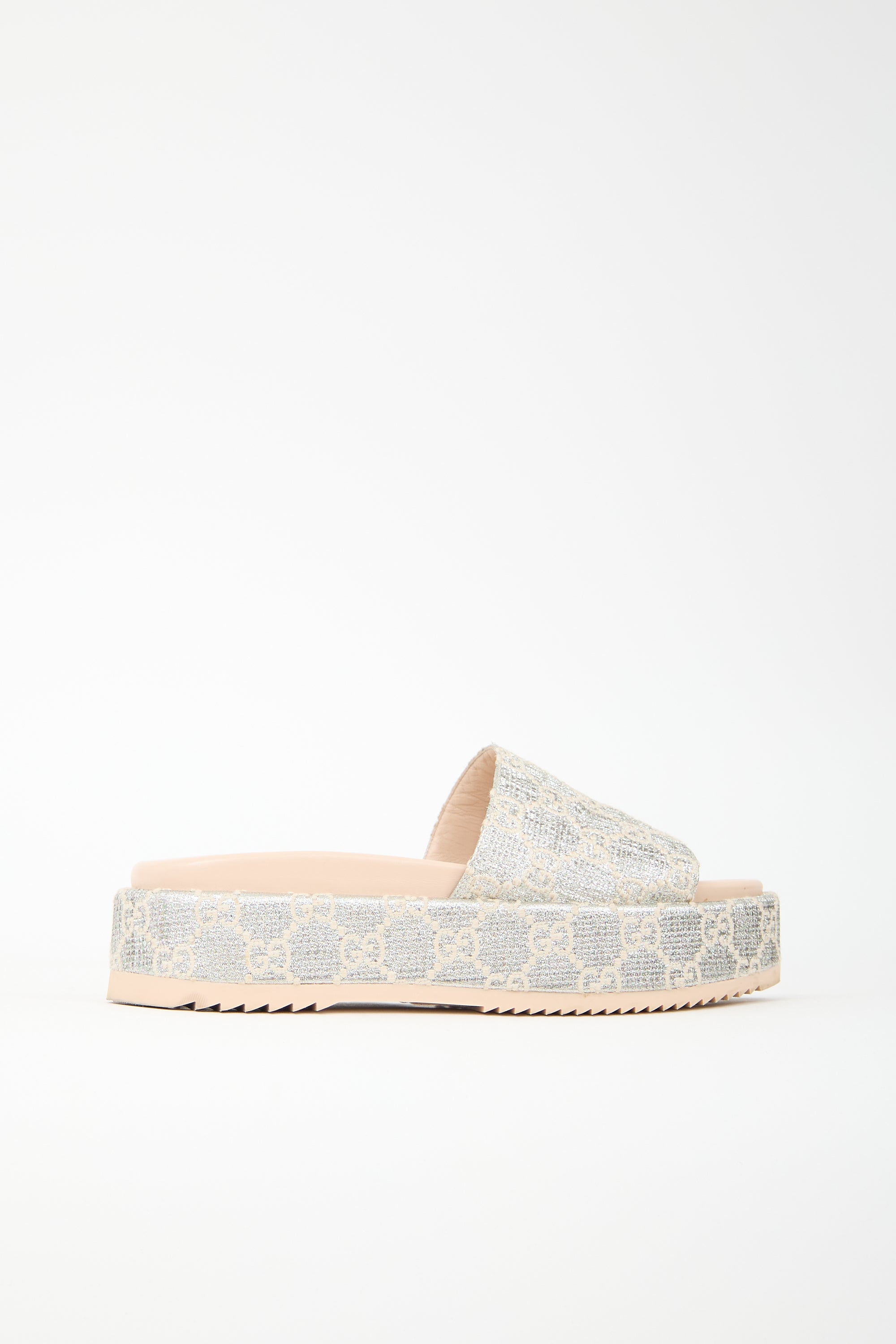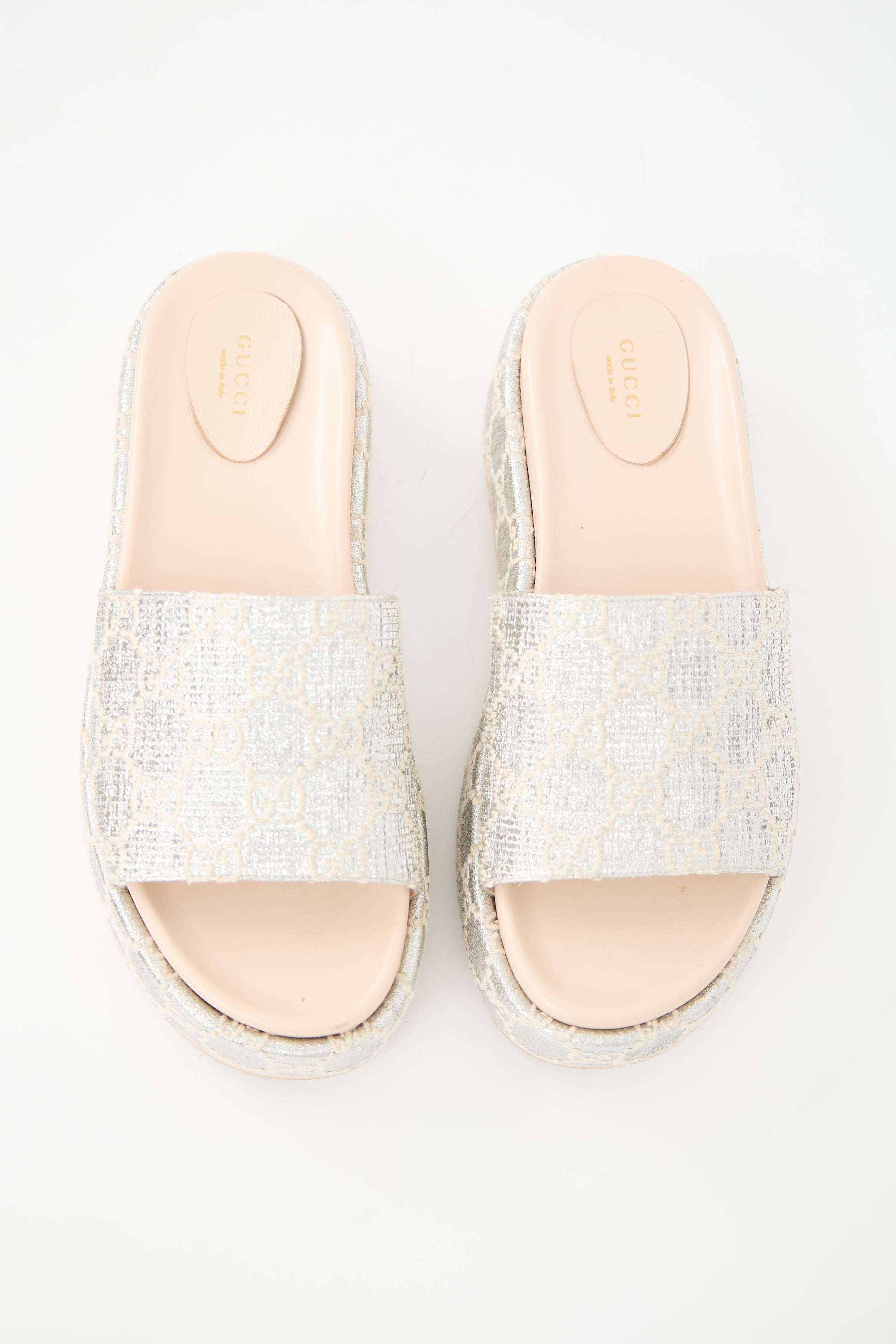 Pre-owned Gucci silver Lame platform slides featuring open rounded toe, interlocking GG monogram print, leather insole, and rubber outsole. Includes original dust bag.