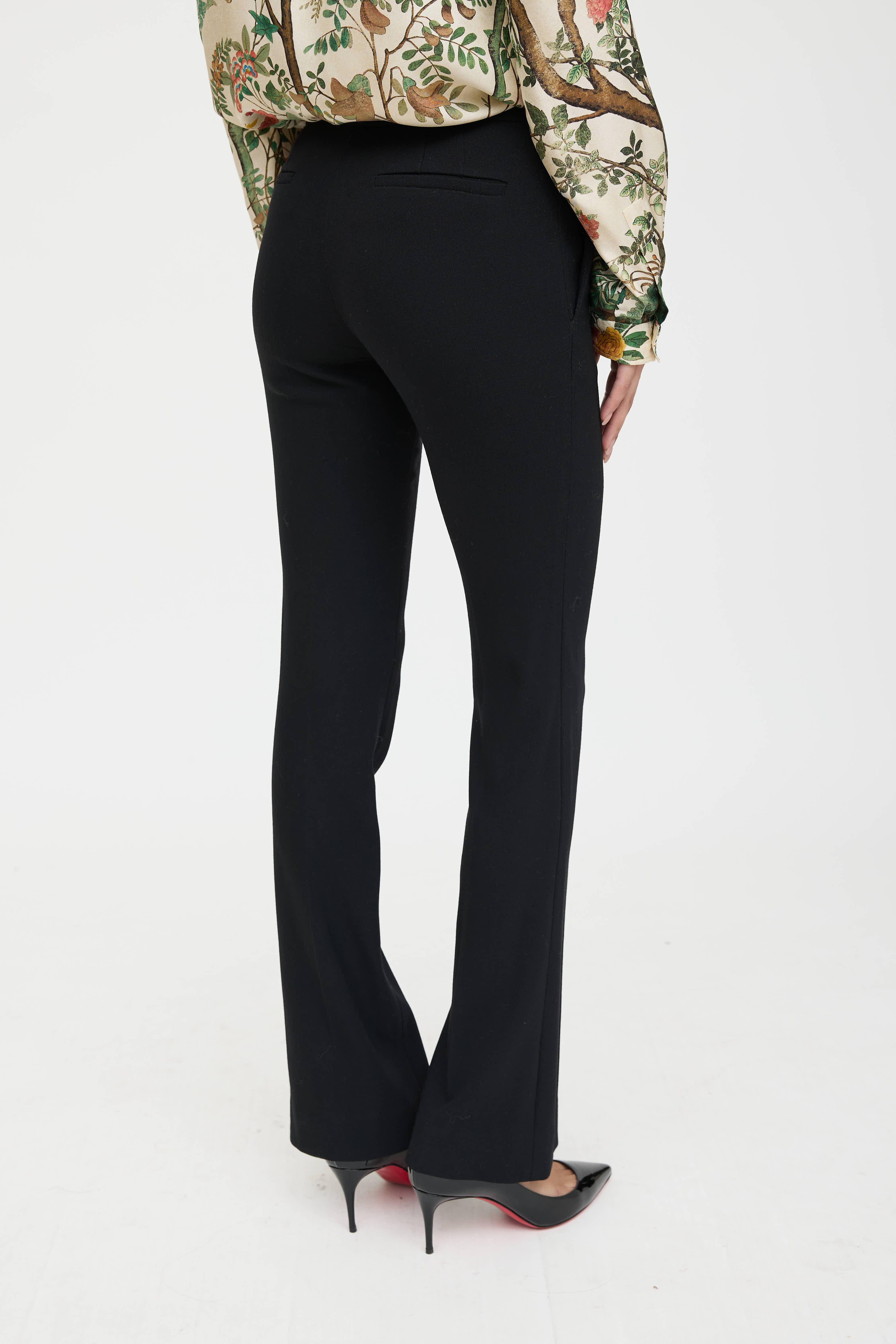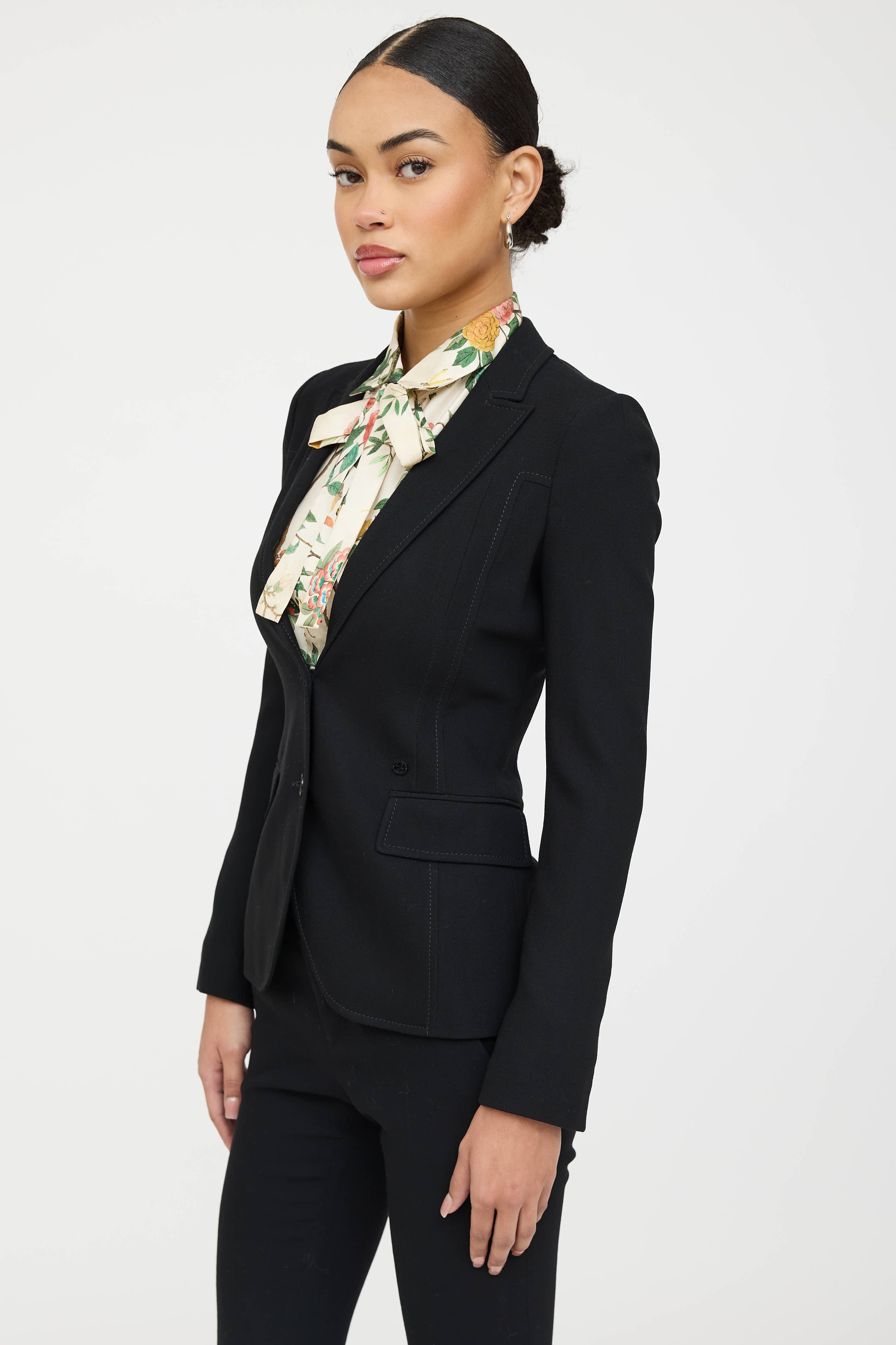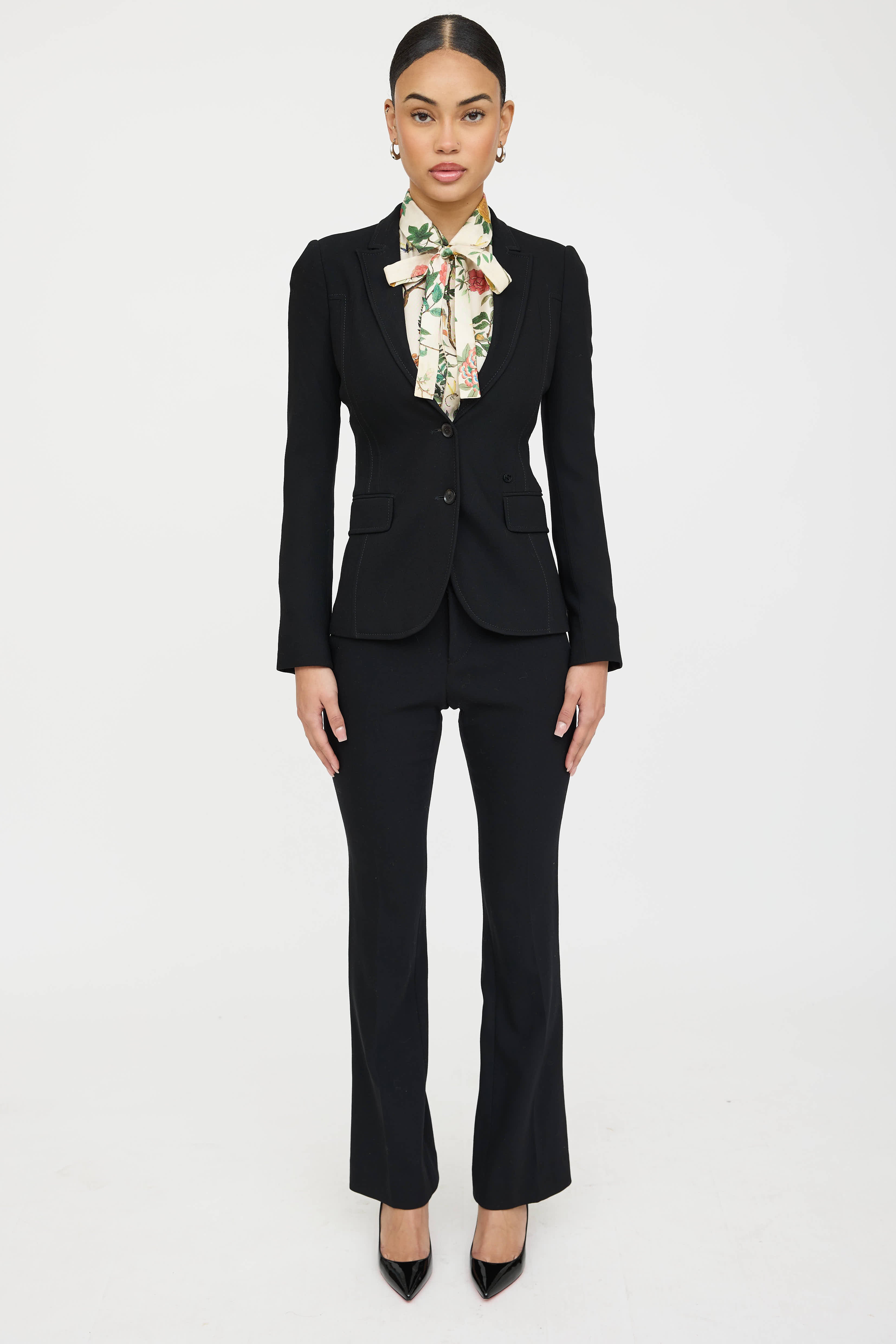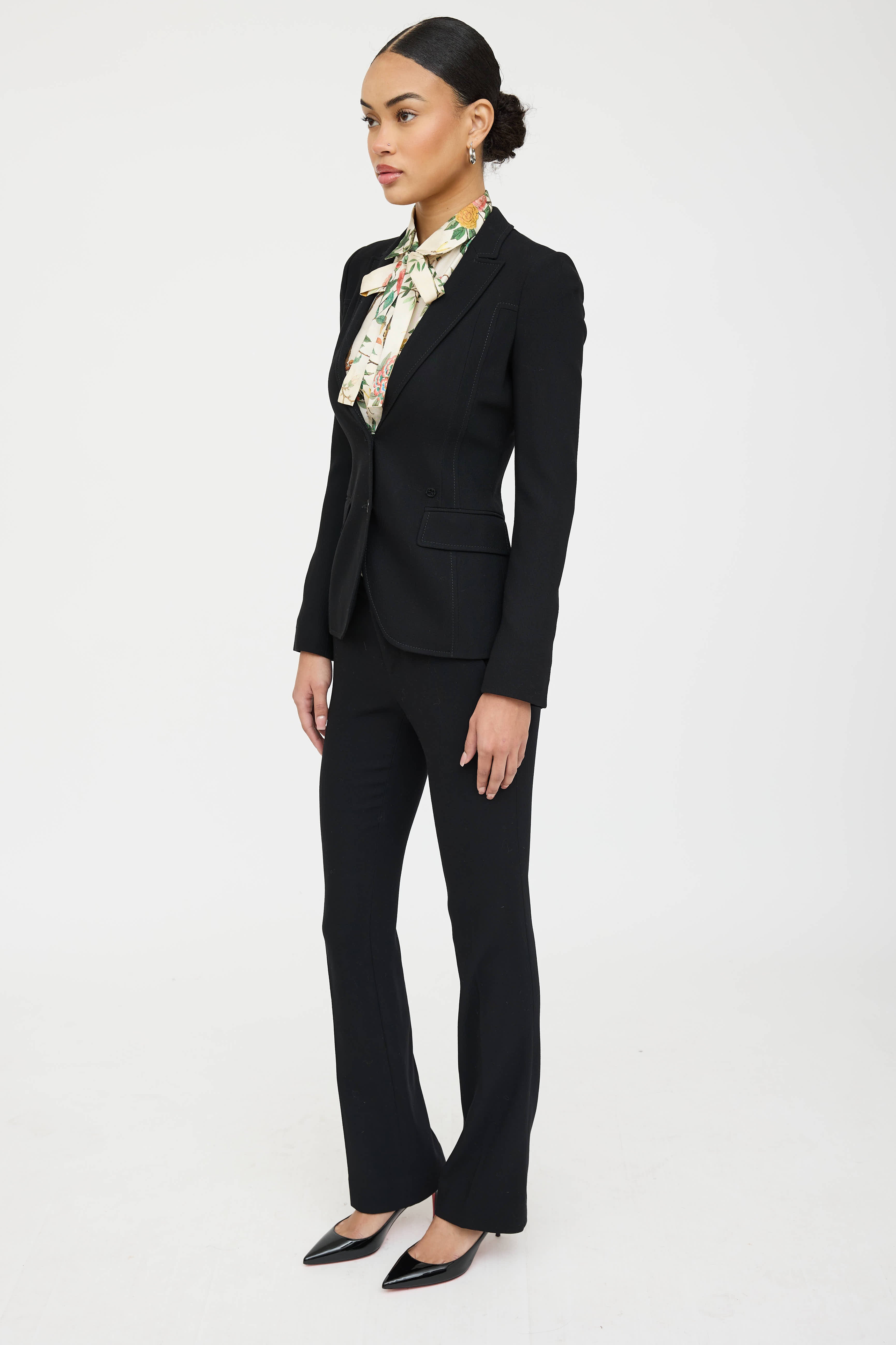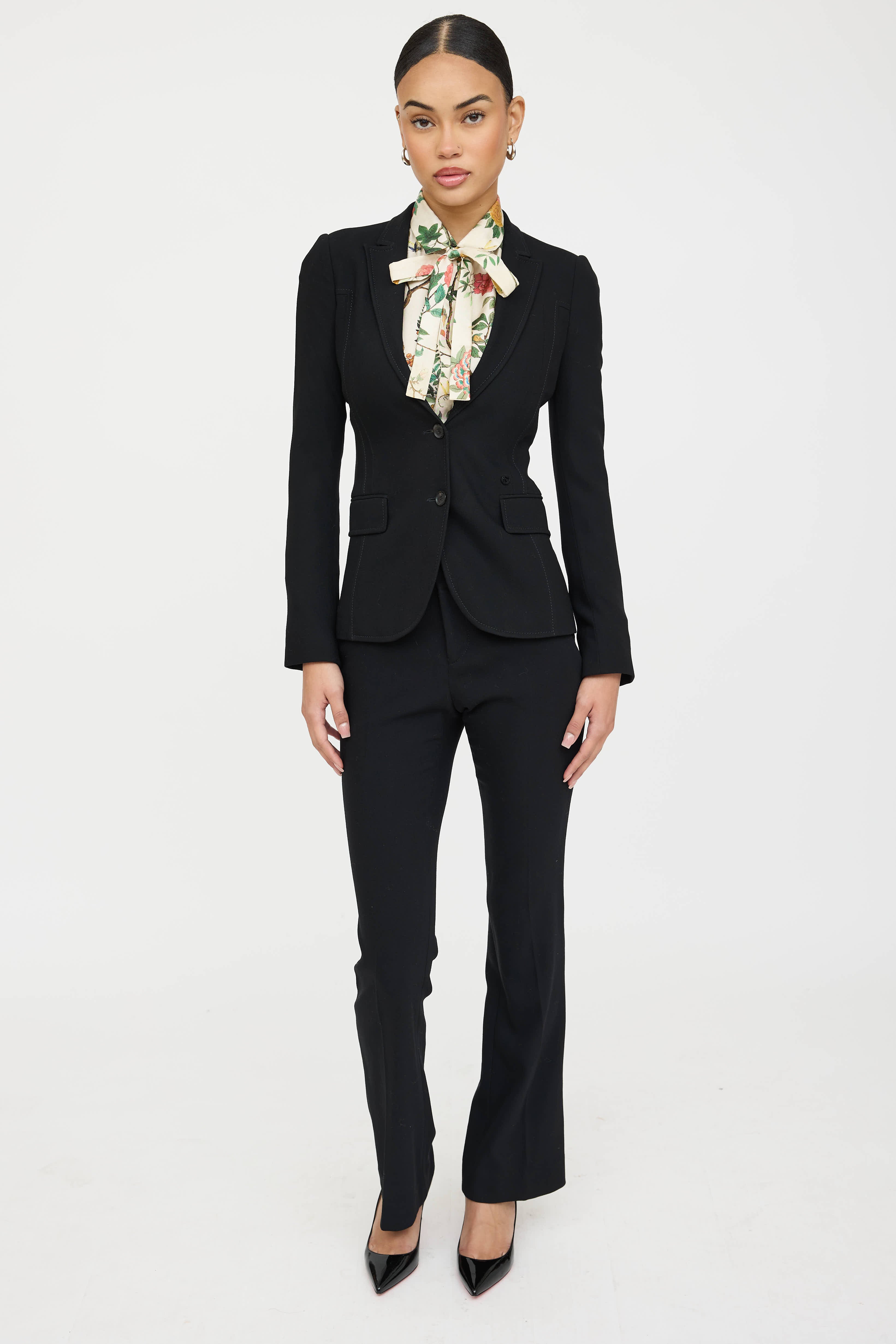Pre-owned Gucci black wool long sleeve blazer featuring peak lapel collar, single breasted button front, flap pockets at front, interlocking GG metal logo, and buttoned cuffs. Matching pant featuring zip fly, interlocking GG metal logo at front, slit pockets at hip, and welt pockets at back.