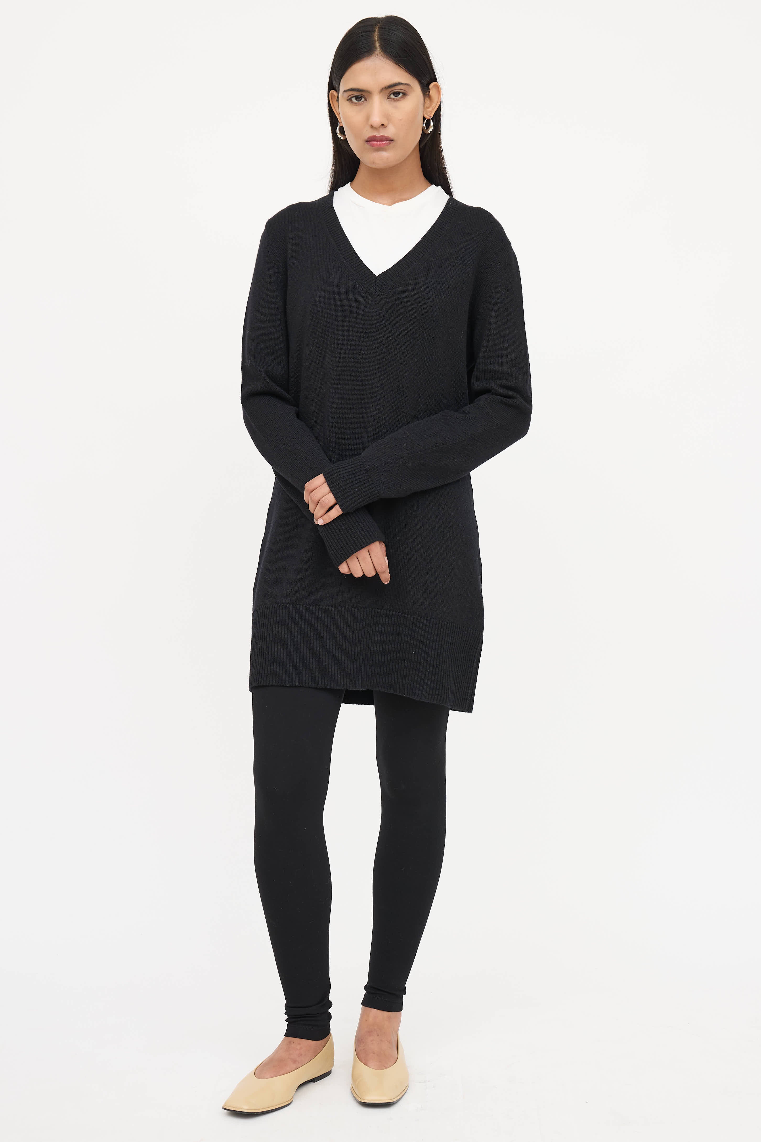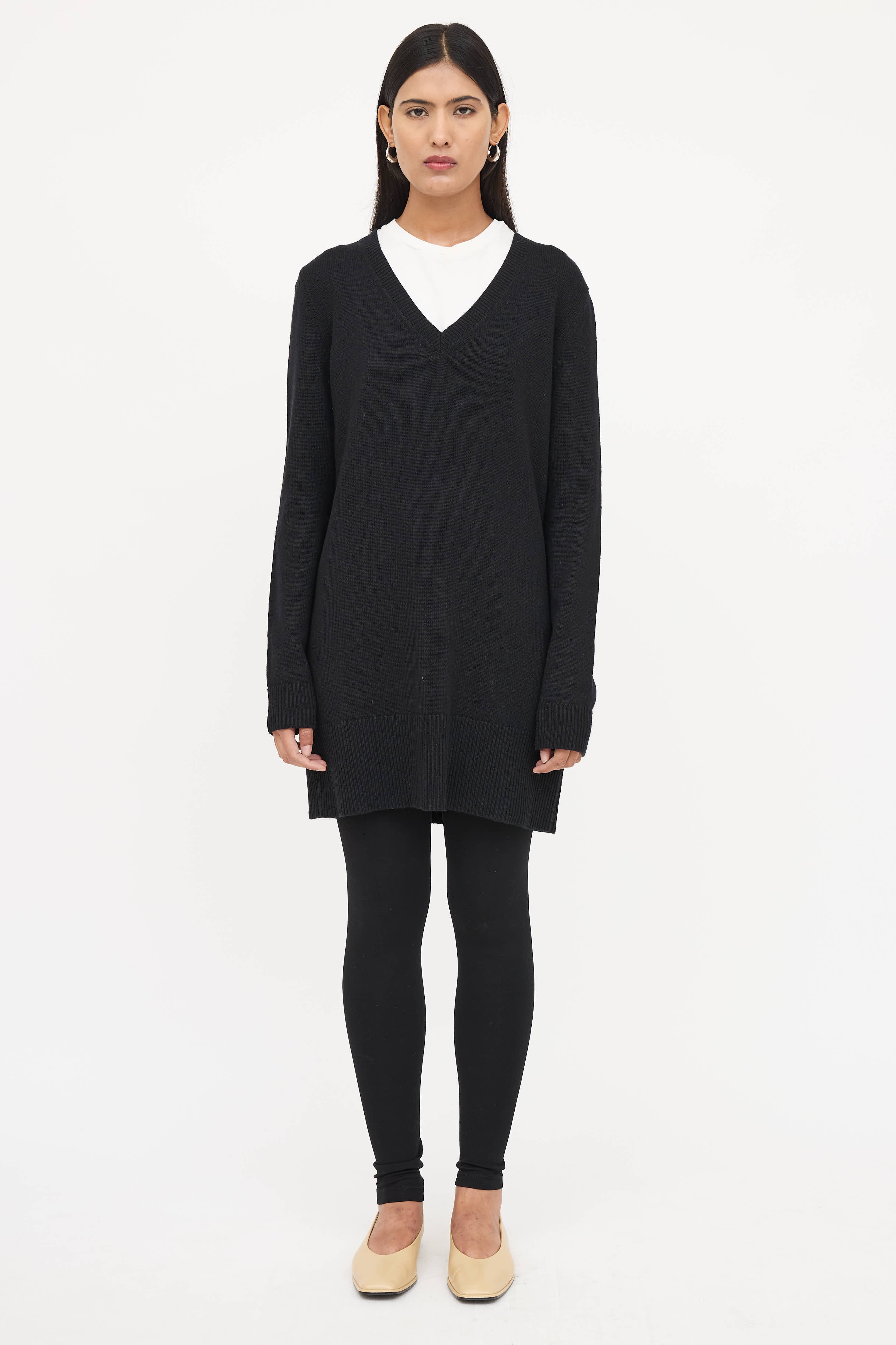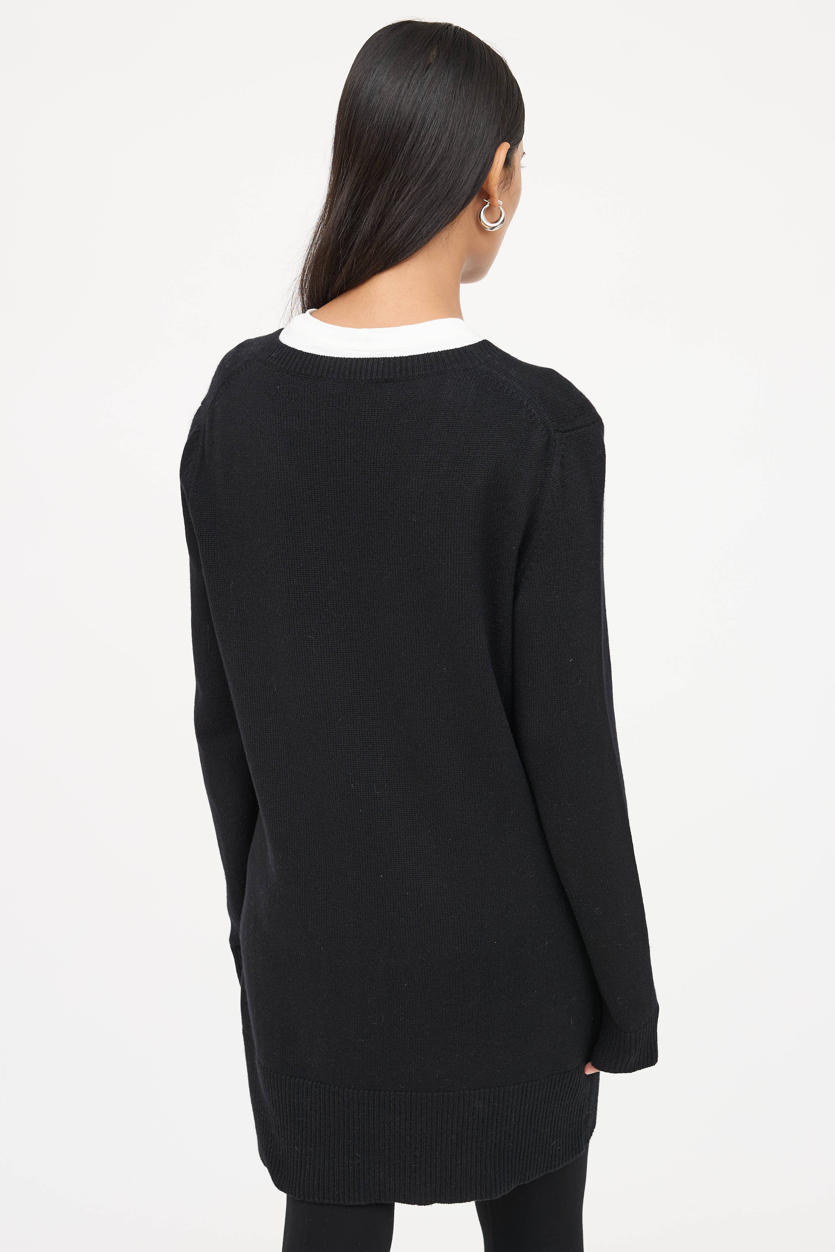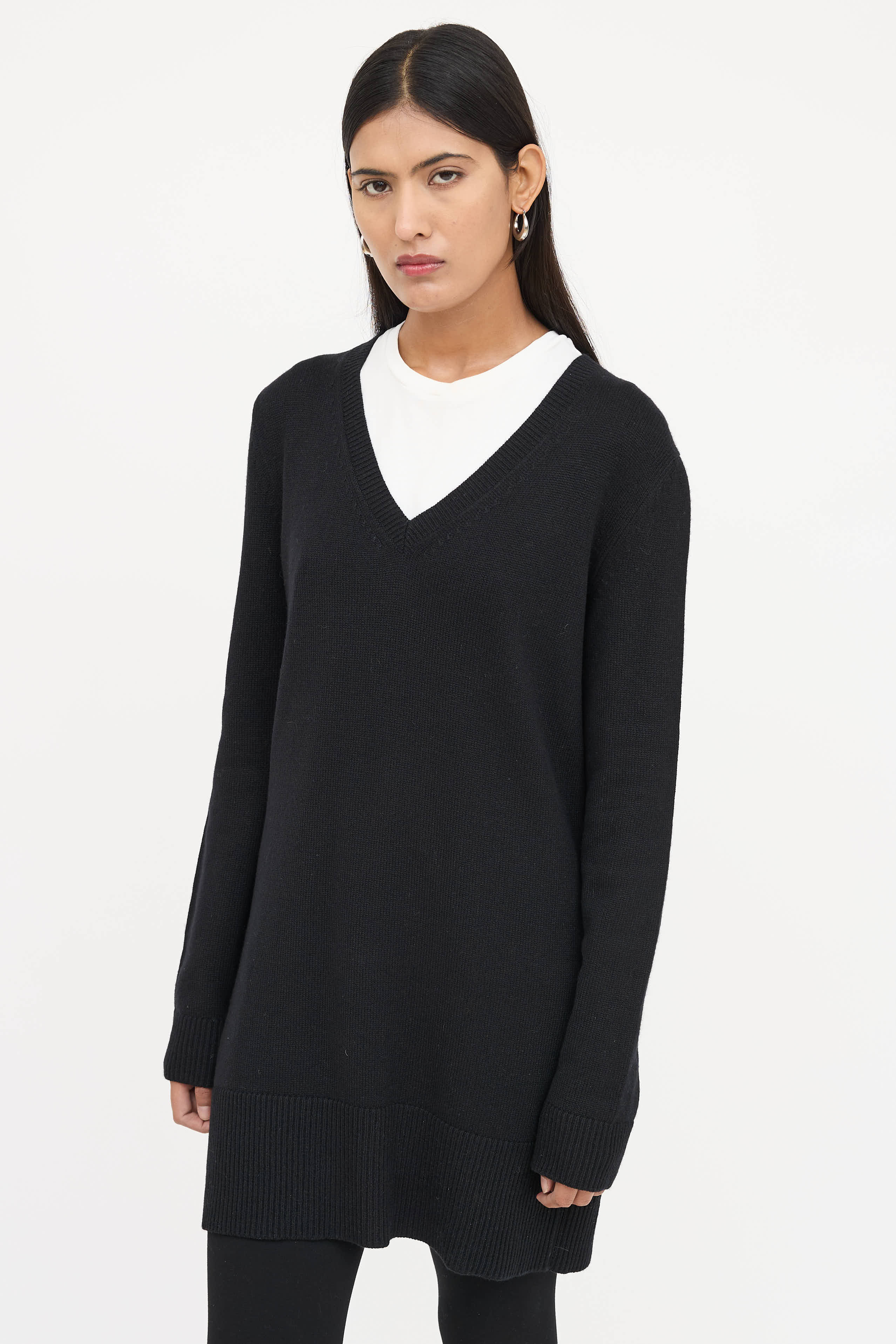 Pre-owned Jil Sander black long sleeve sweater featuring v-neckline and ribbed trim. Styled with a T-shirt.
