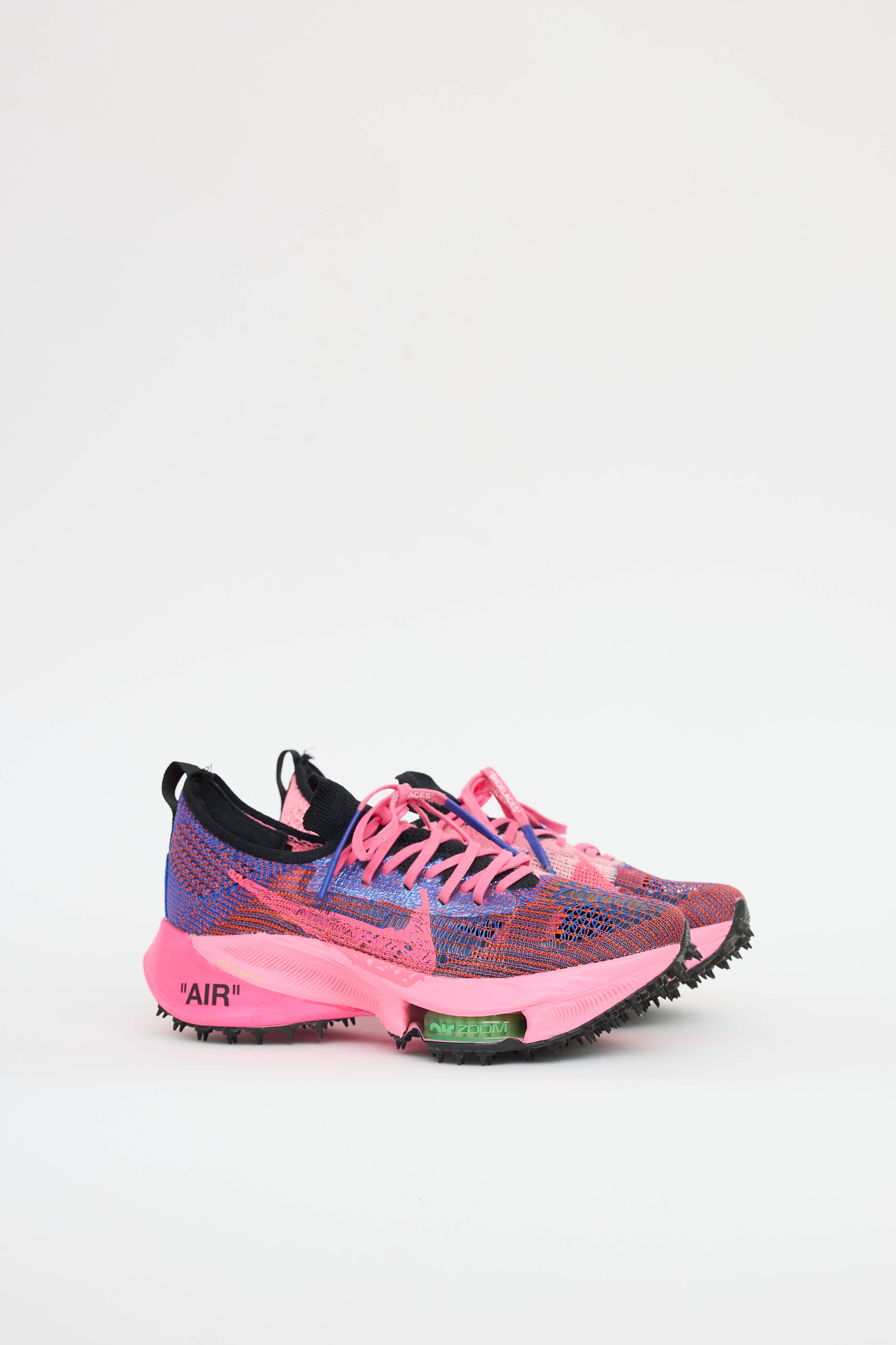 Pre-owned Off- White x Nike pink and multicolor Air Zoom Tempo Next% sneaker featuring rounded toe, open knit and mesh upper, lace-up vamp with toggle, signature Swoosh at sides, green zip tie at left shoe, black printed wording at inner sides, and spiked rubber outsole.