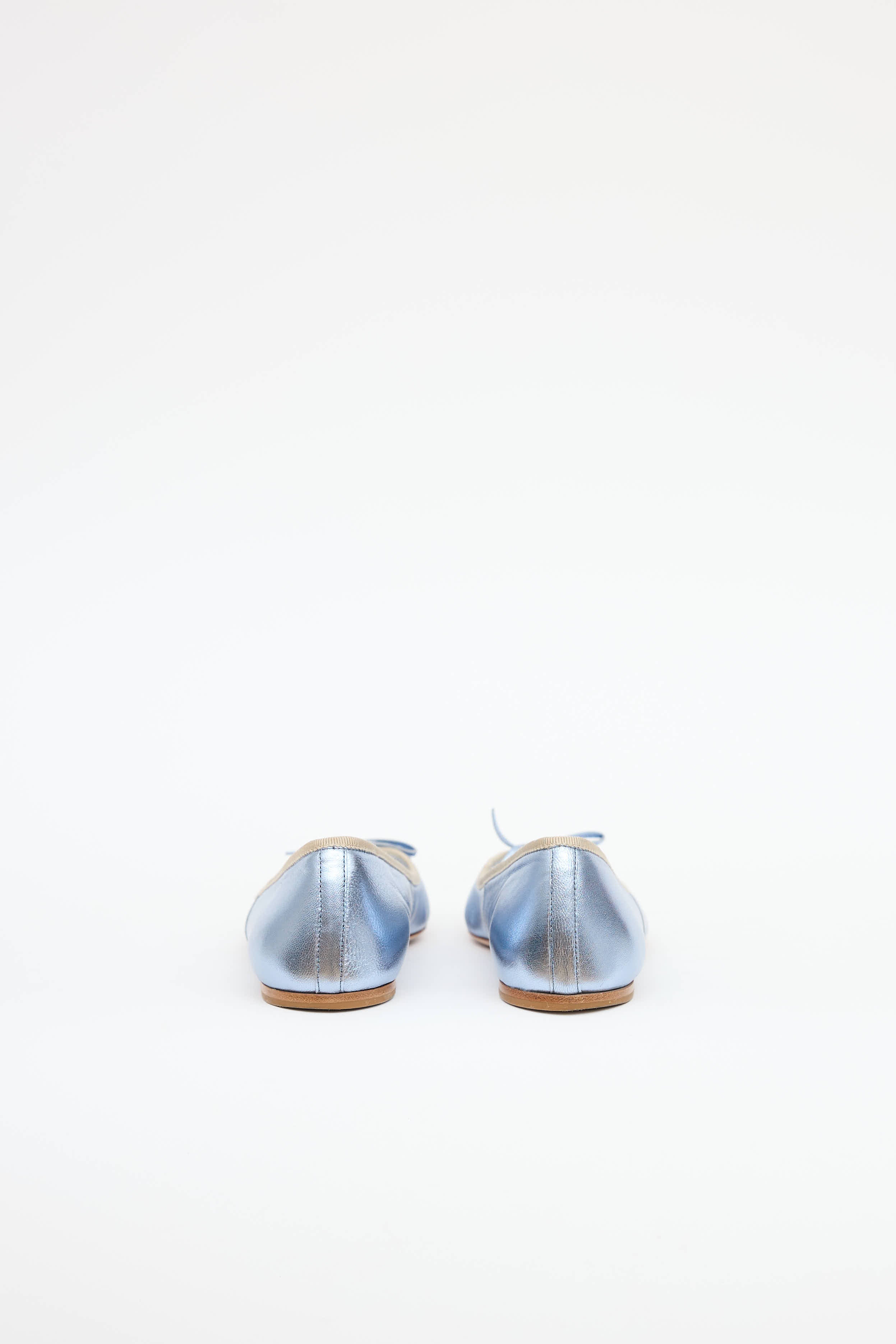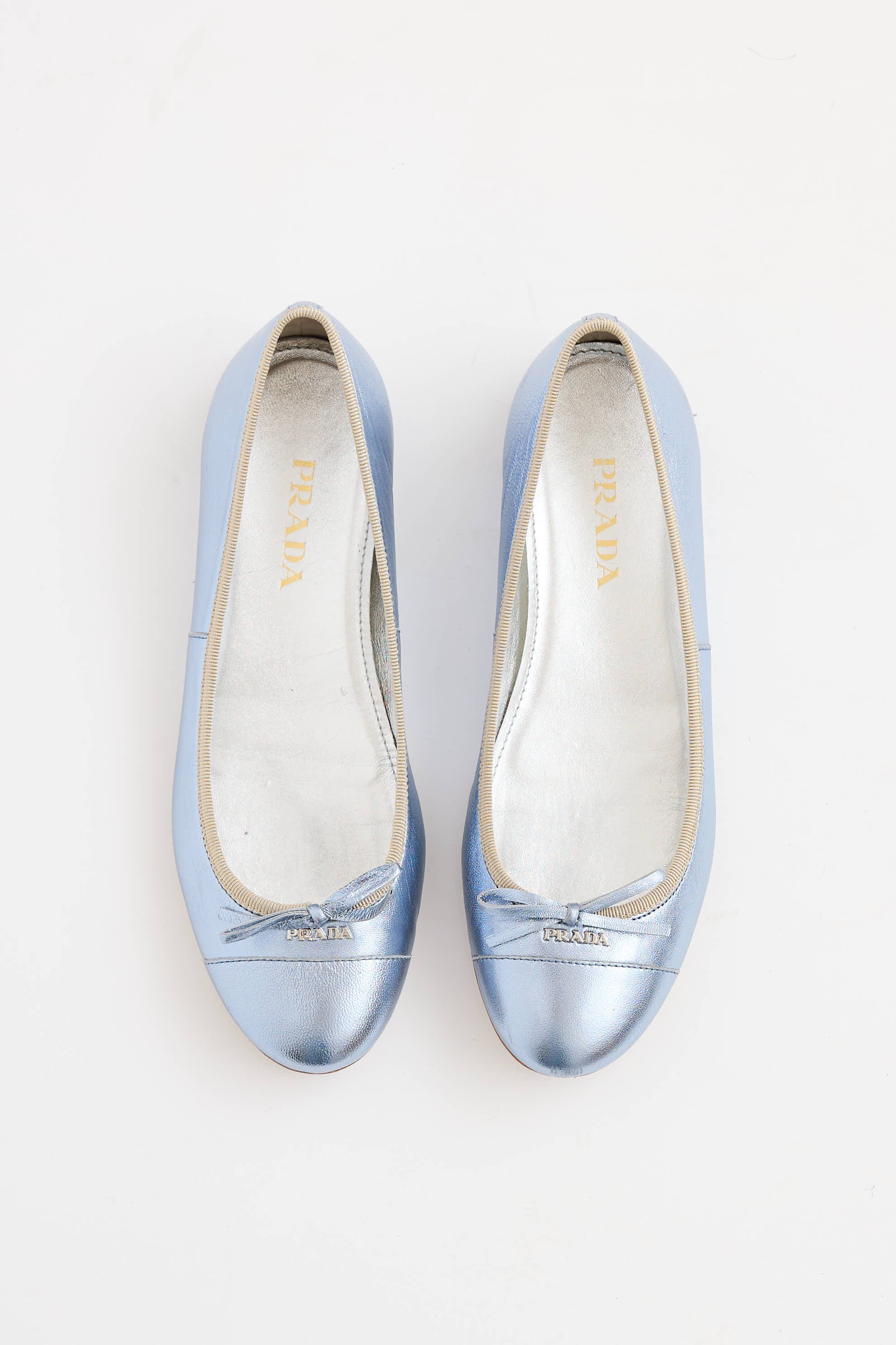 Pre-owned Prada metallic blue leather flat featuring round toe, silver tone logo with bow at vamp, and stacked heel.