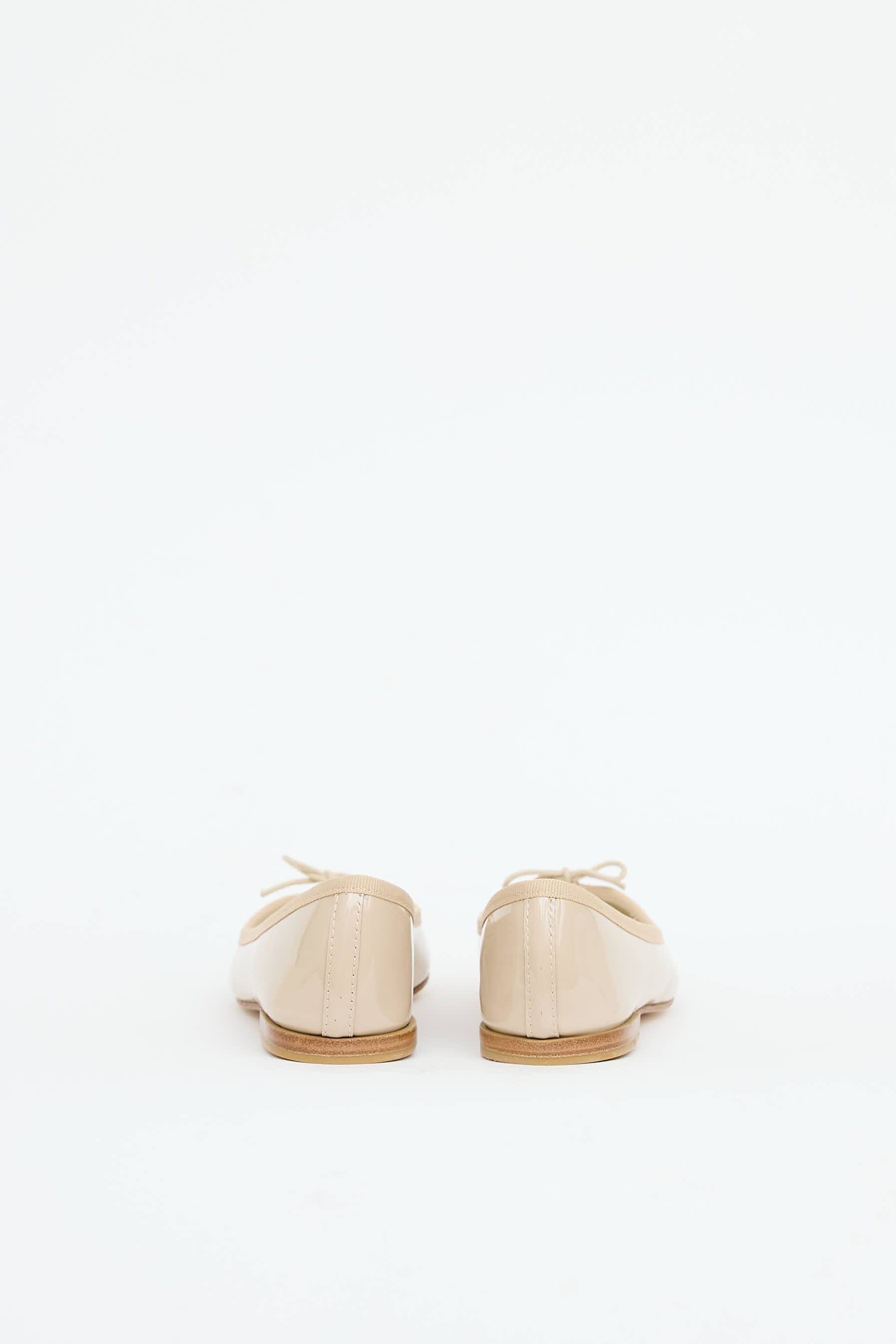Pre-owned Repetto beige patent leather ballet flat featuring round toe, bow at vamp, and stacked heel.
