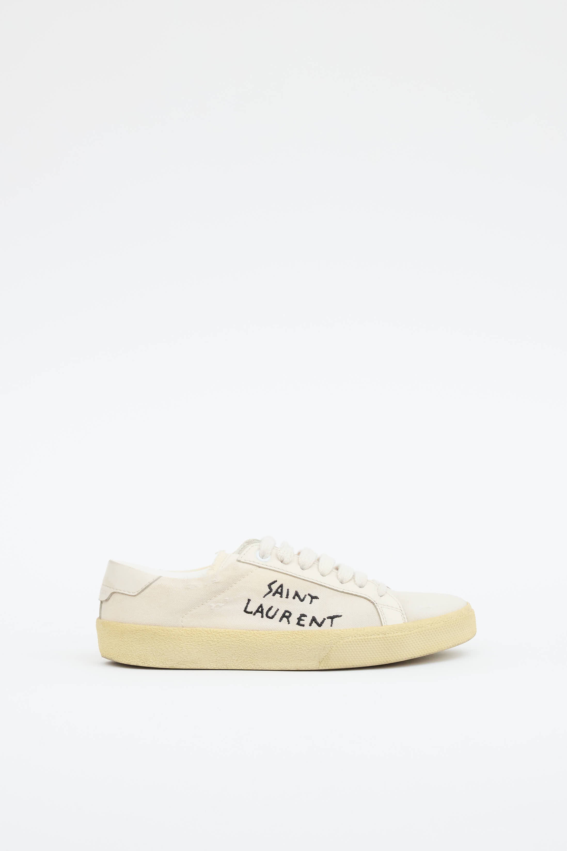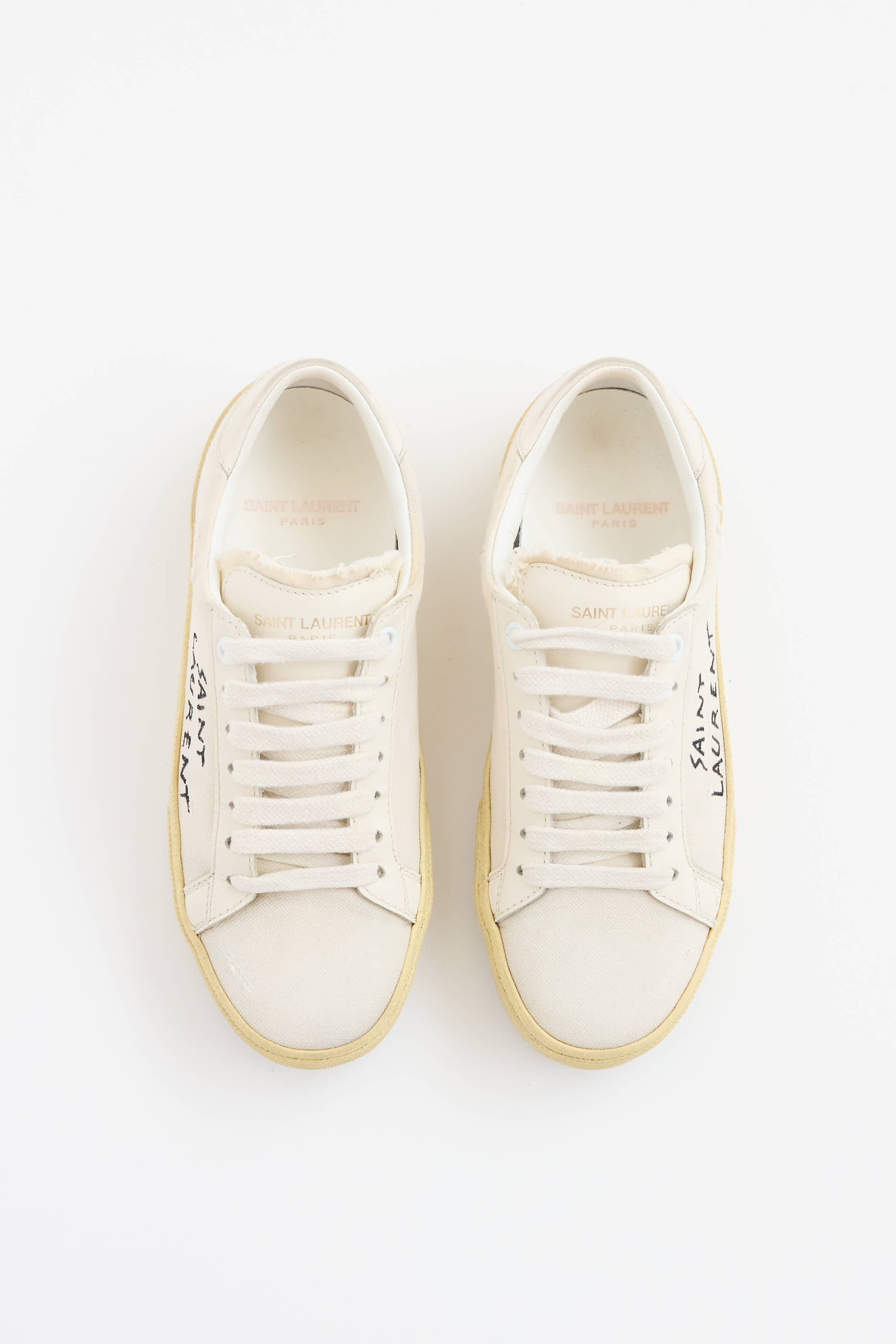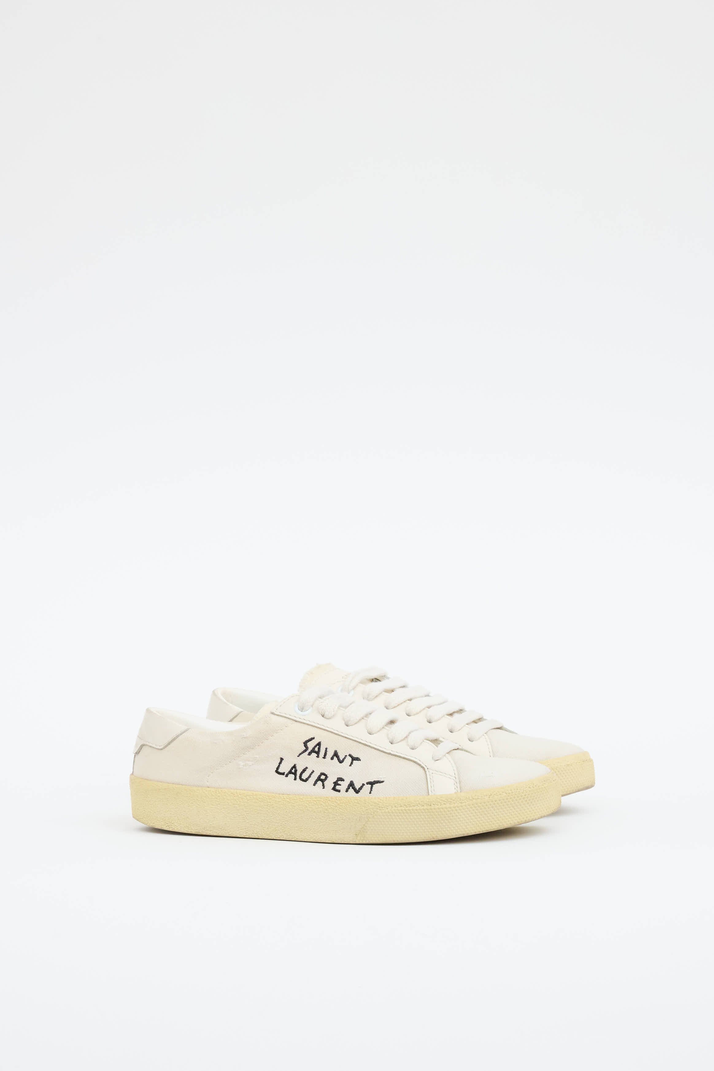 Pre-owned Saint Laurent white canvas Court Classic sneaker featuring rounded toe, lace-up vamp, black embroidered logo at sides, embossed logo at counter, and intentional distressing.
