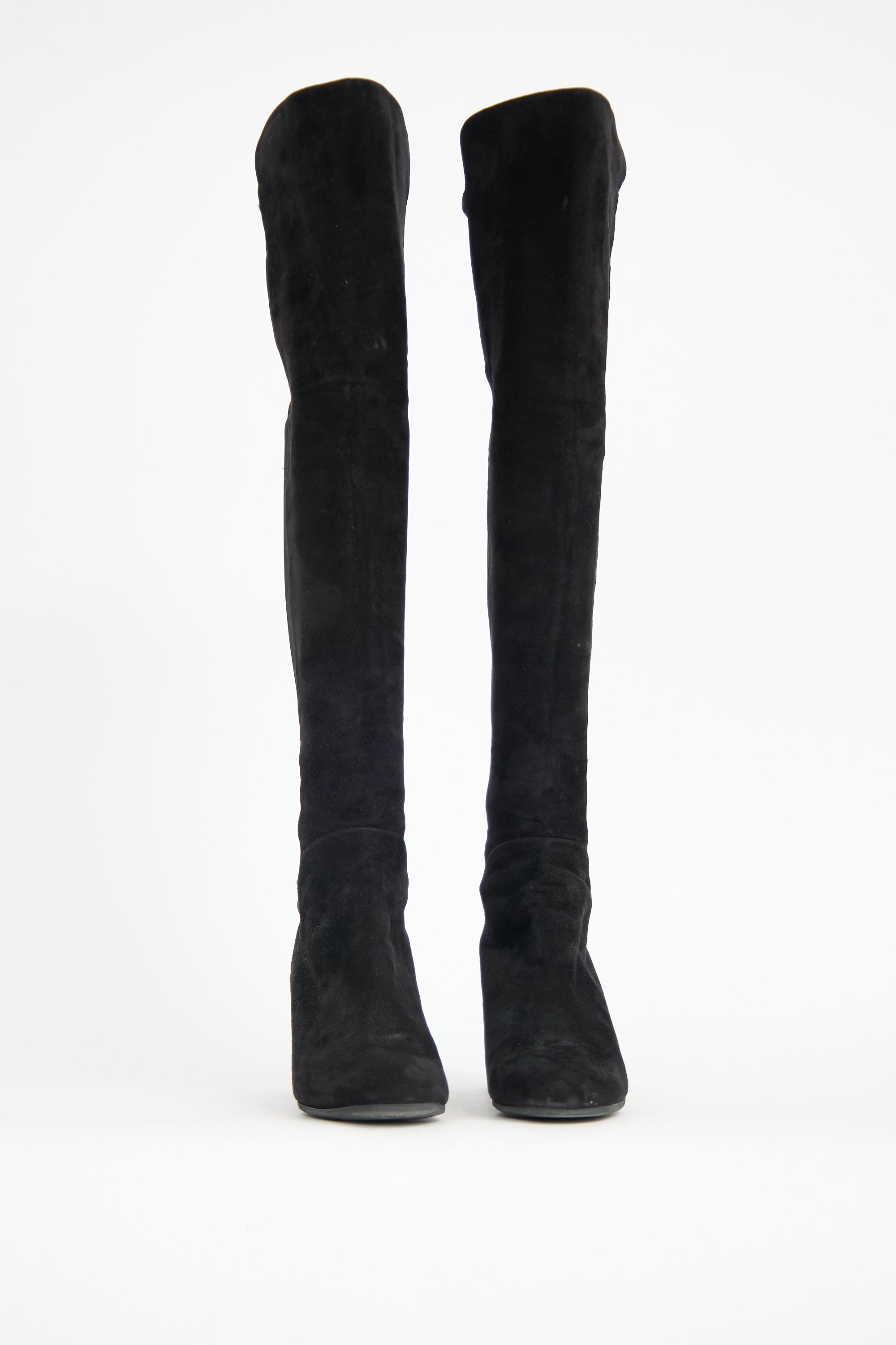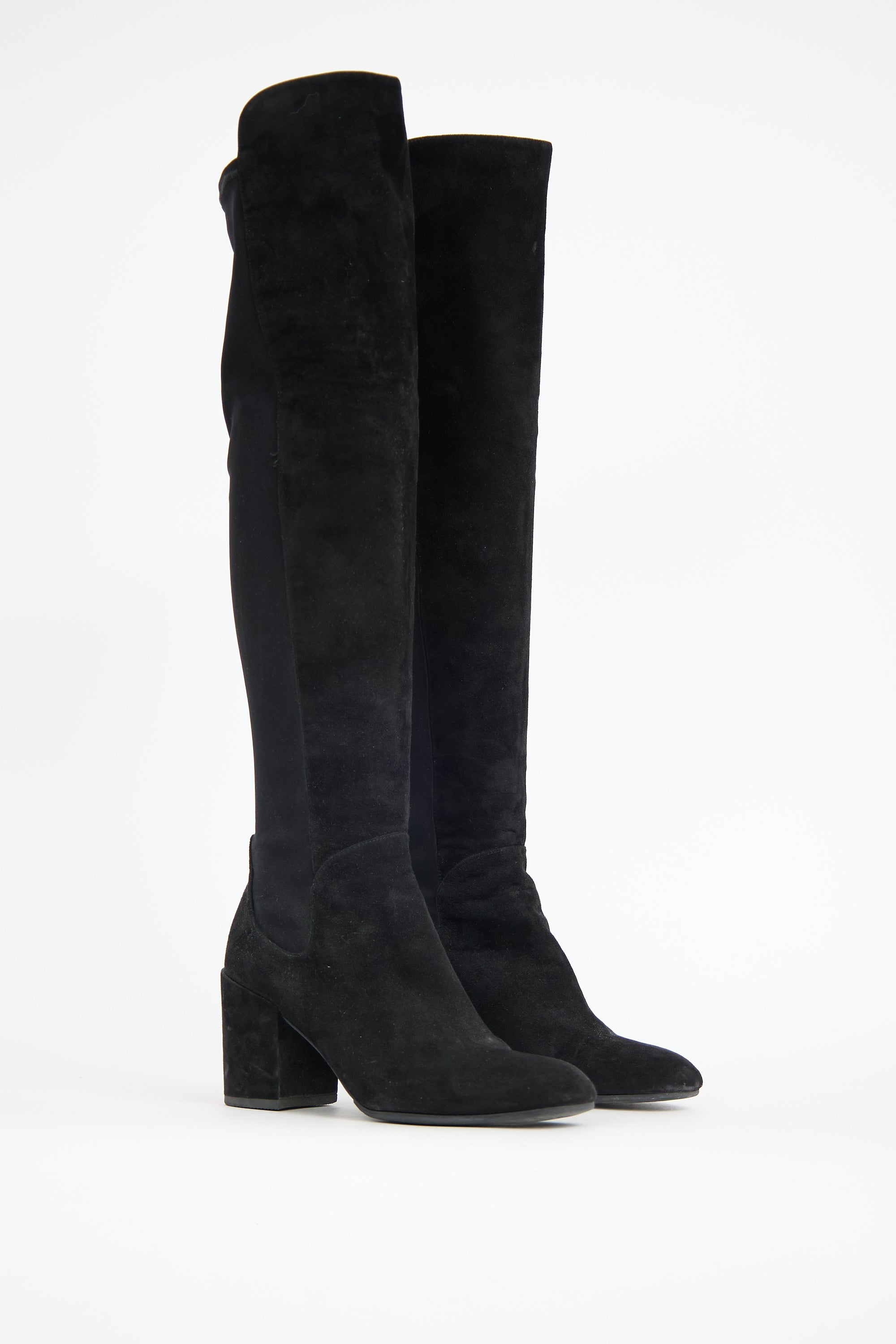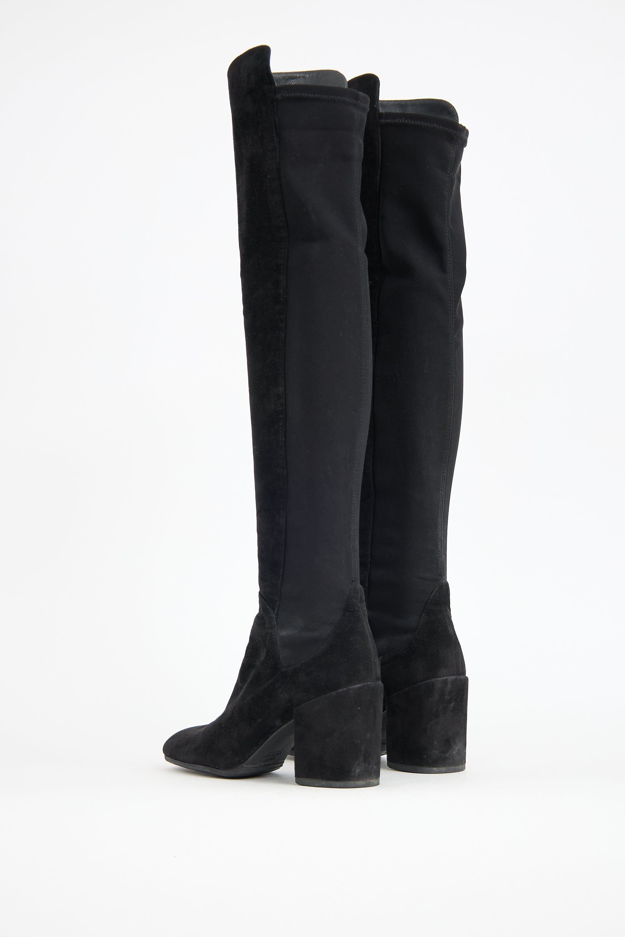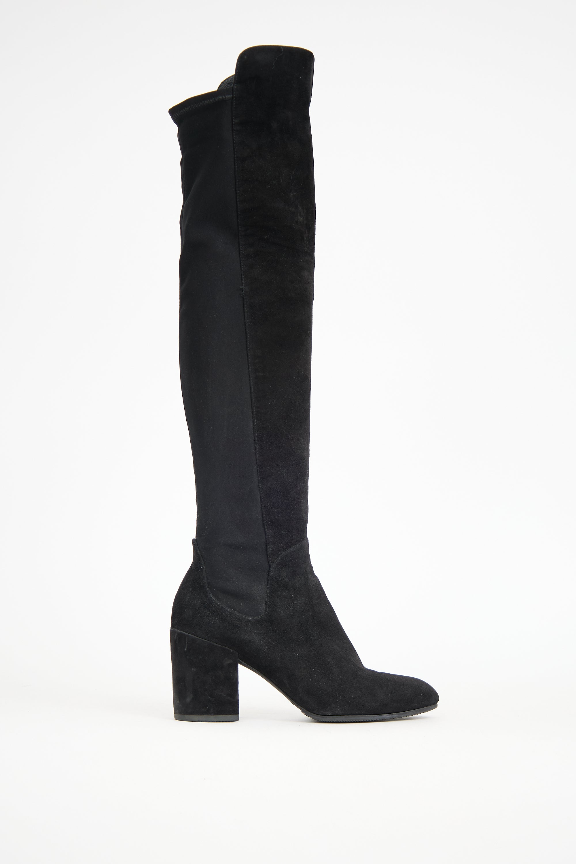 Pre-owned Stuart Weitzman black suede thigh high boot featuring an almond toe, pull on entry, stretch textile back, and a covered block heel.