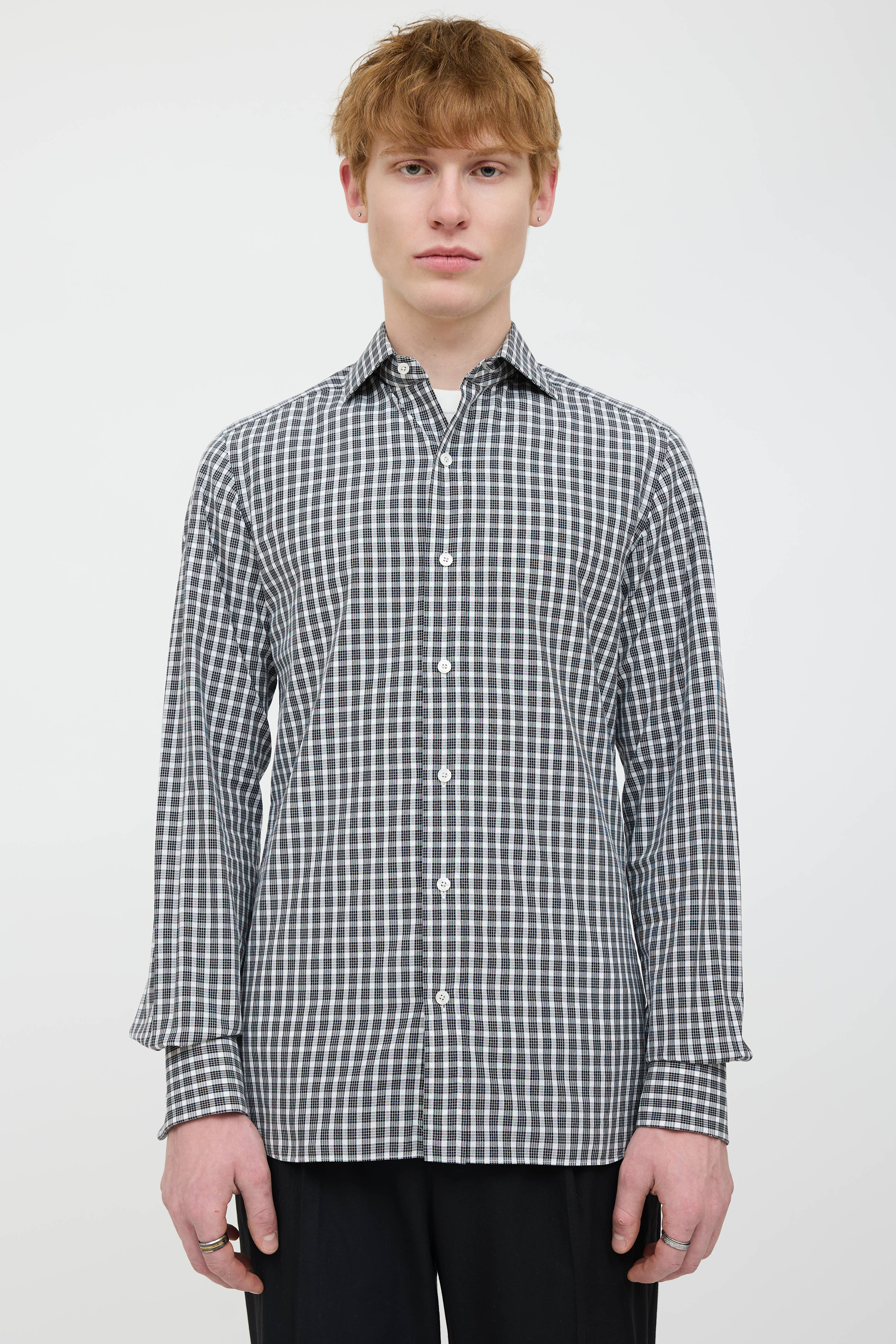 Pre-owned Tom Ford black and white long sleeve shirt featuring pointed collar, button front, rounded hemline with gussets, and buttoned cuffs.