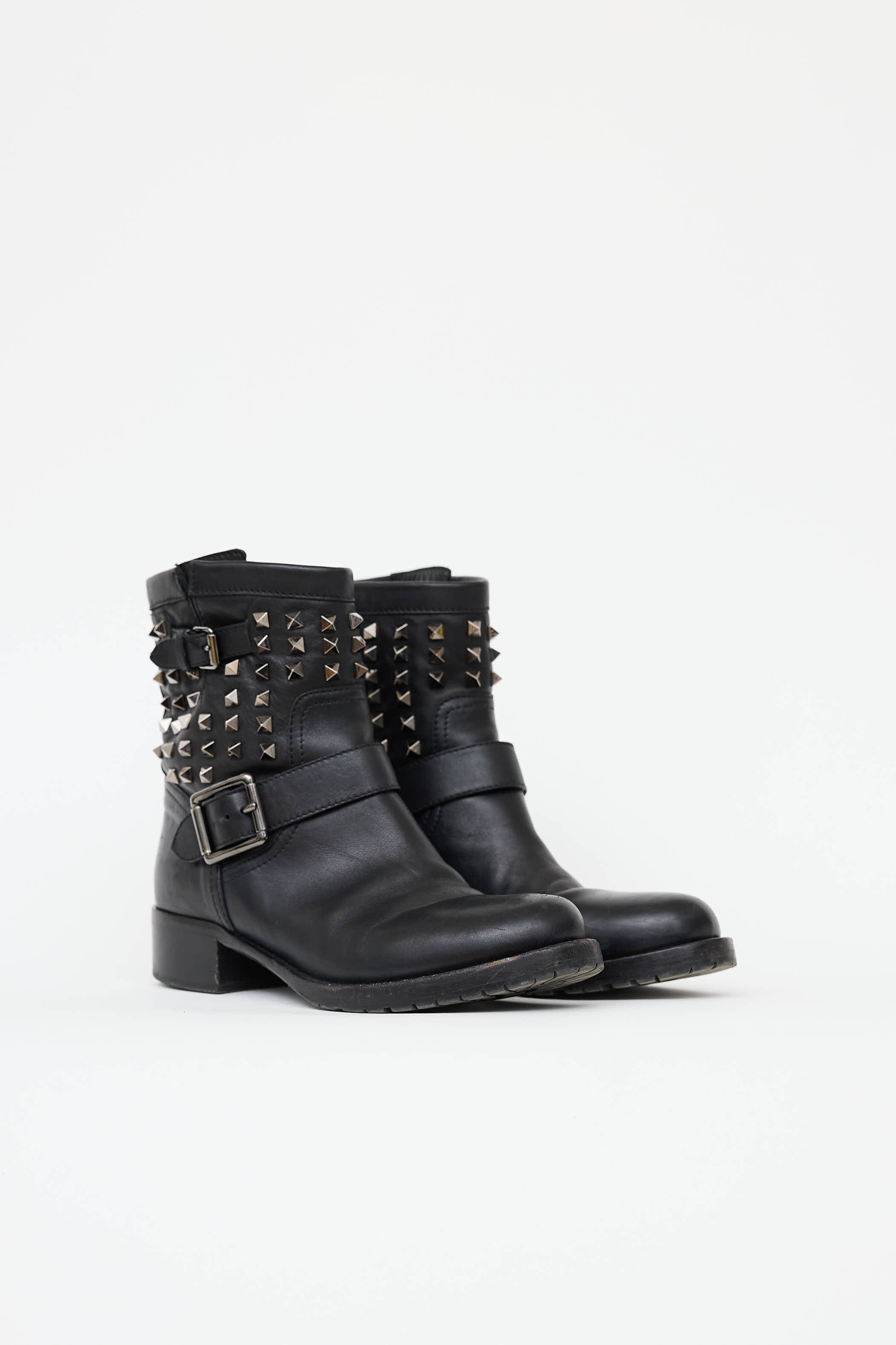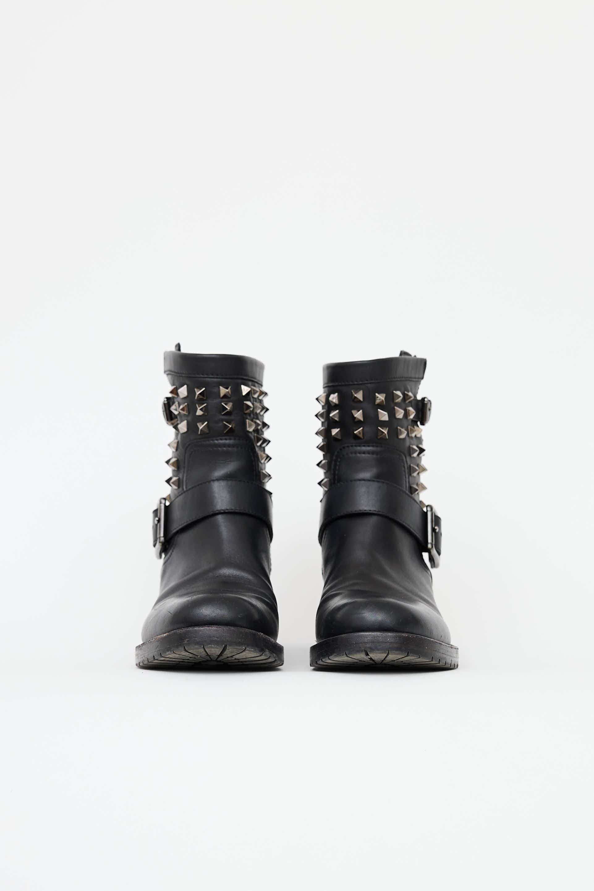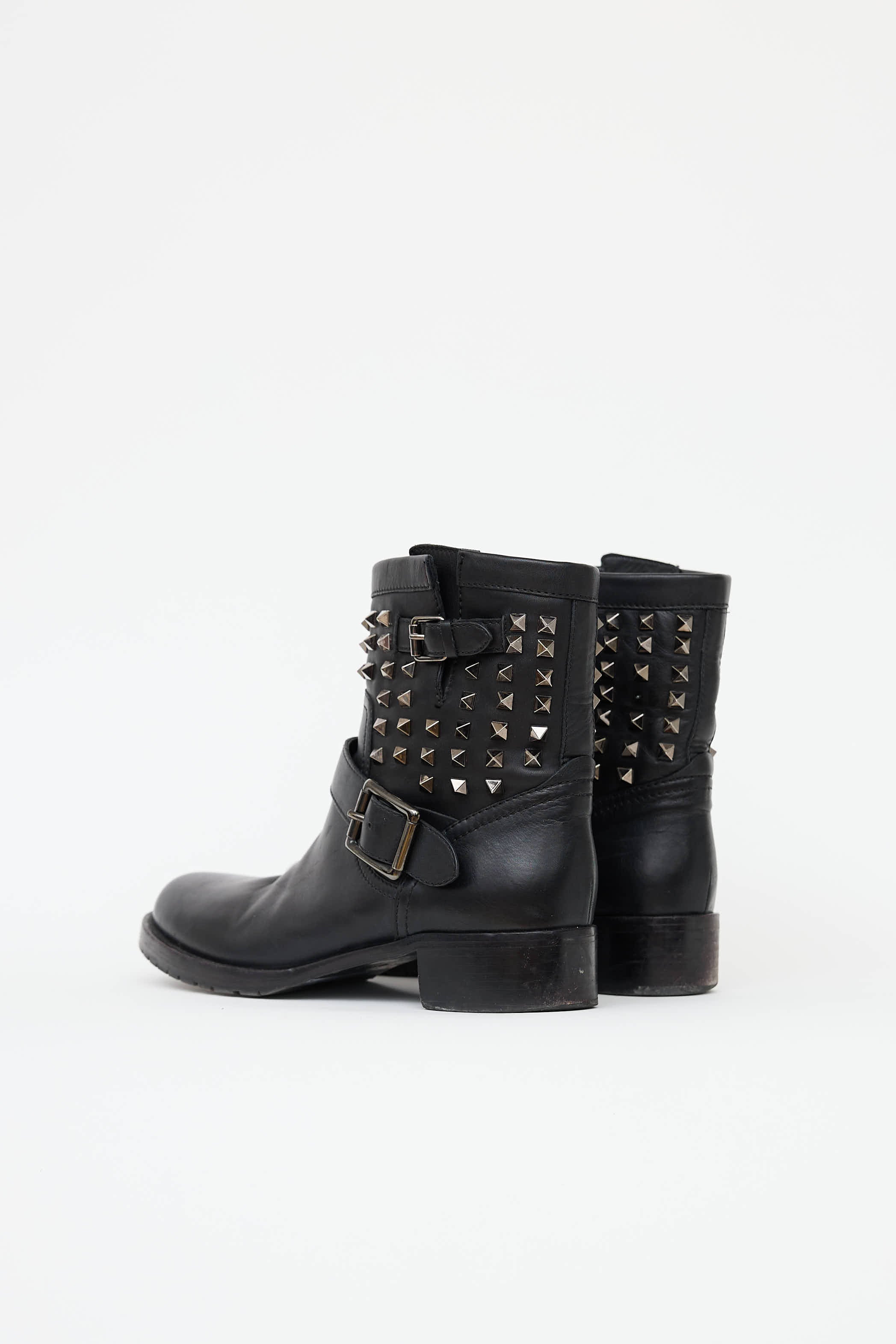 Pre-owned Valentino black Rockstud ankle boot featuring round toe, slip on entry, leather straps with silver tone buckles at vamp, signature rockstuds at shaft and stacked heel.