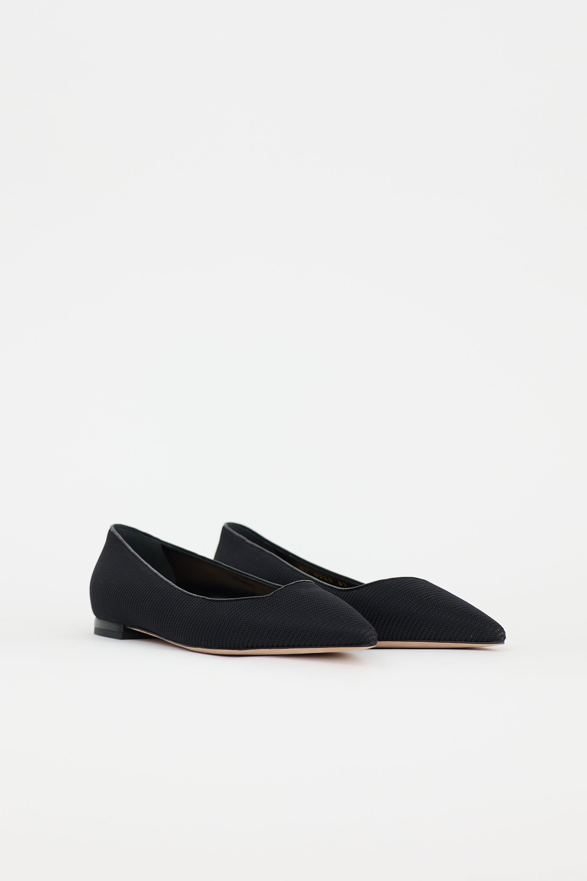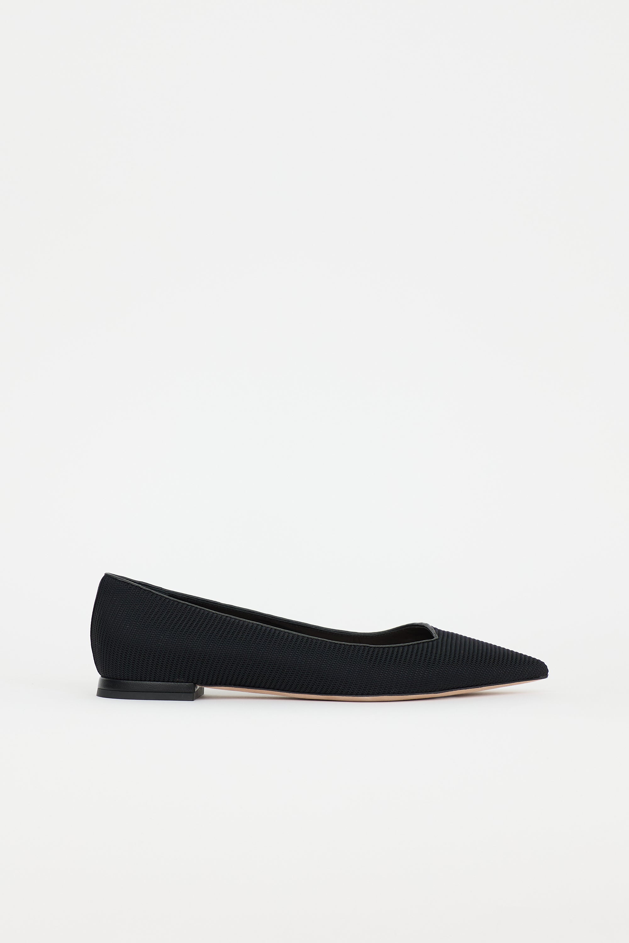Pre-owned Dior black flats featuring pointed toe, ribbed upper, asymmetrical topline, and leather insole and outsole.