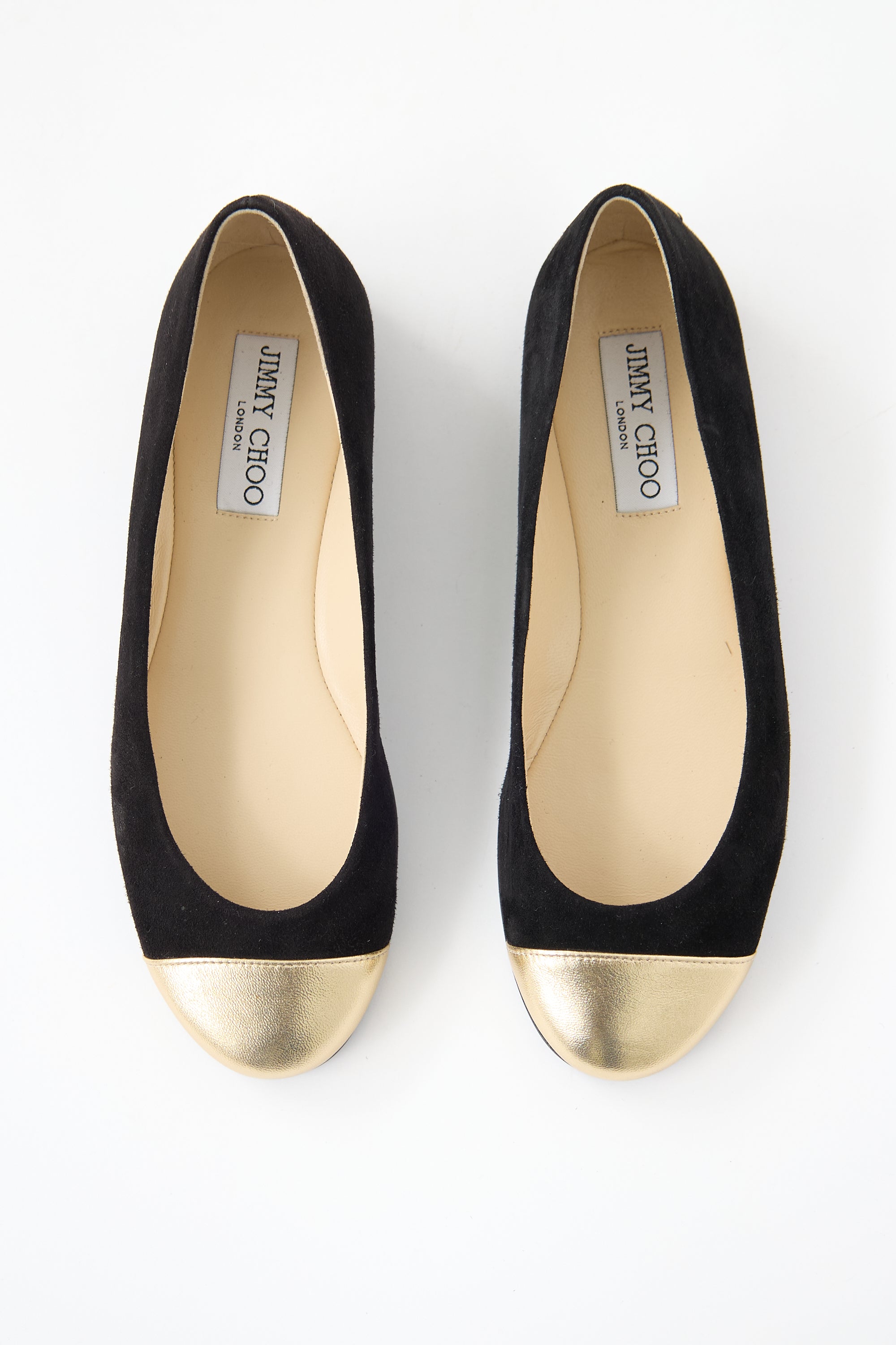 Pre-owned Jimmy Choo black suede Gaze flats featuring rounded toe, gold tone metallic leather cap toe, gold tone etched logo plaque at counter, leather insole, and rubber outsole. Comes with original dust bag.