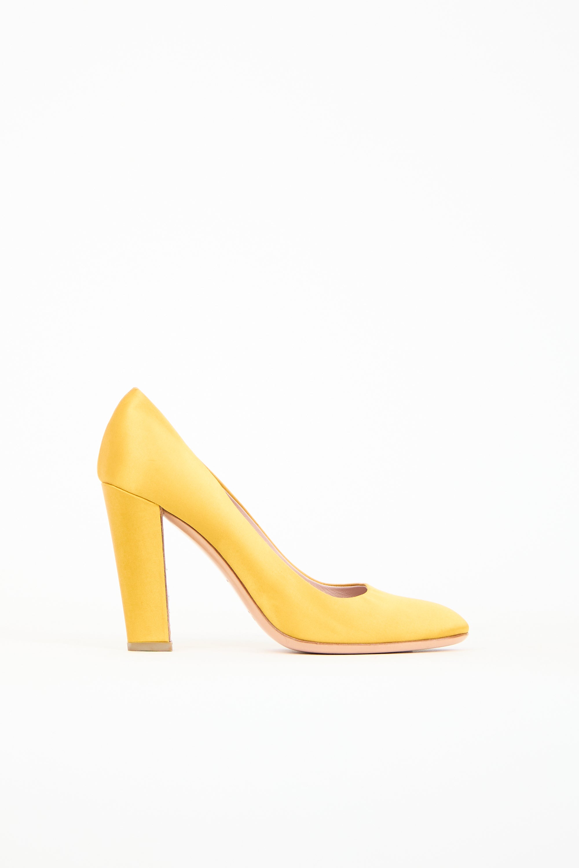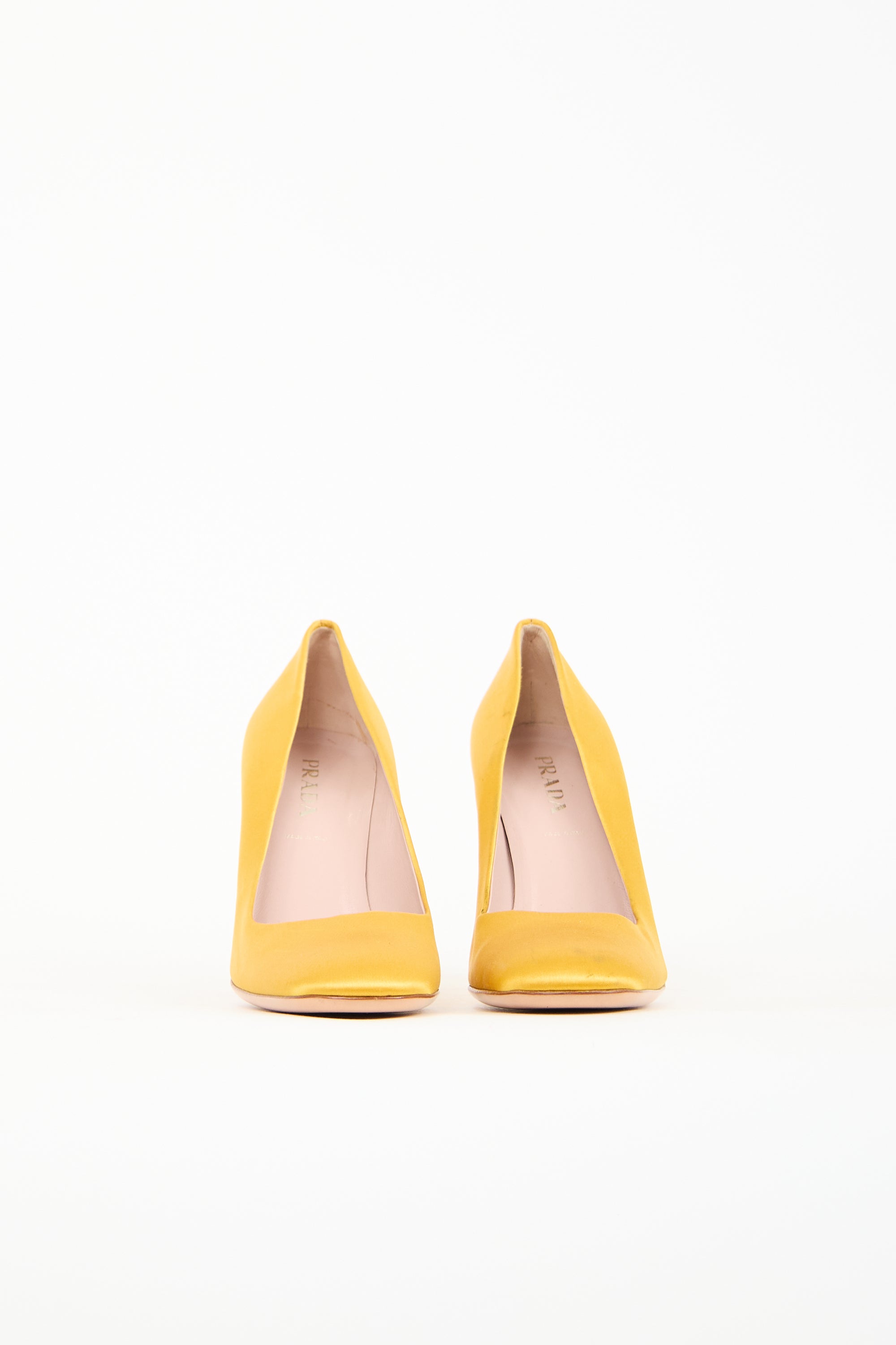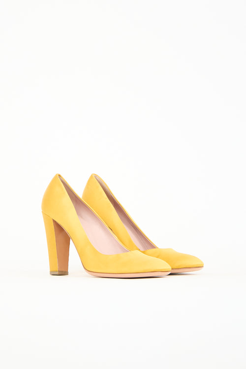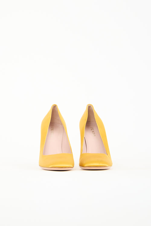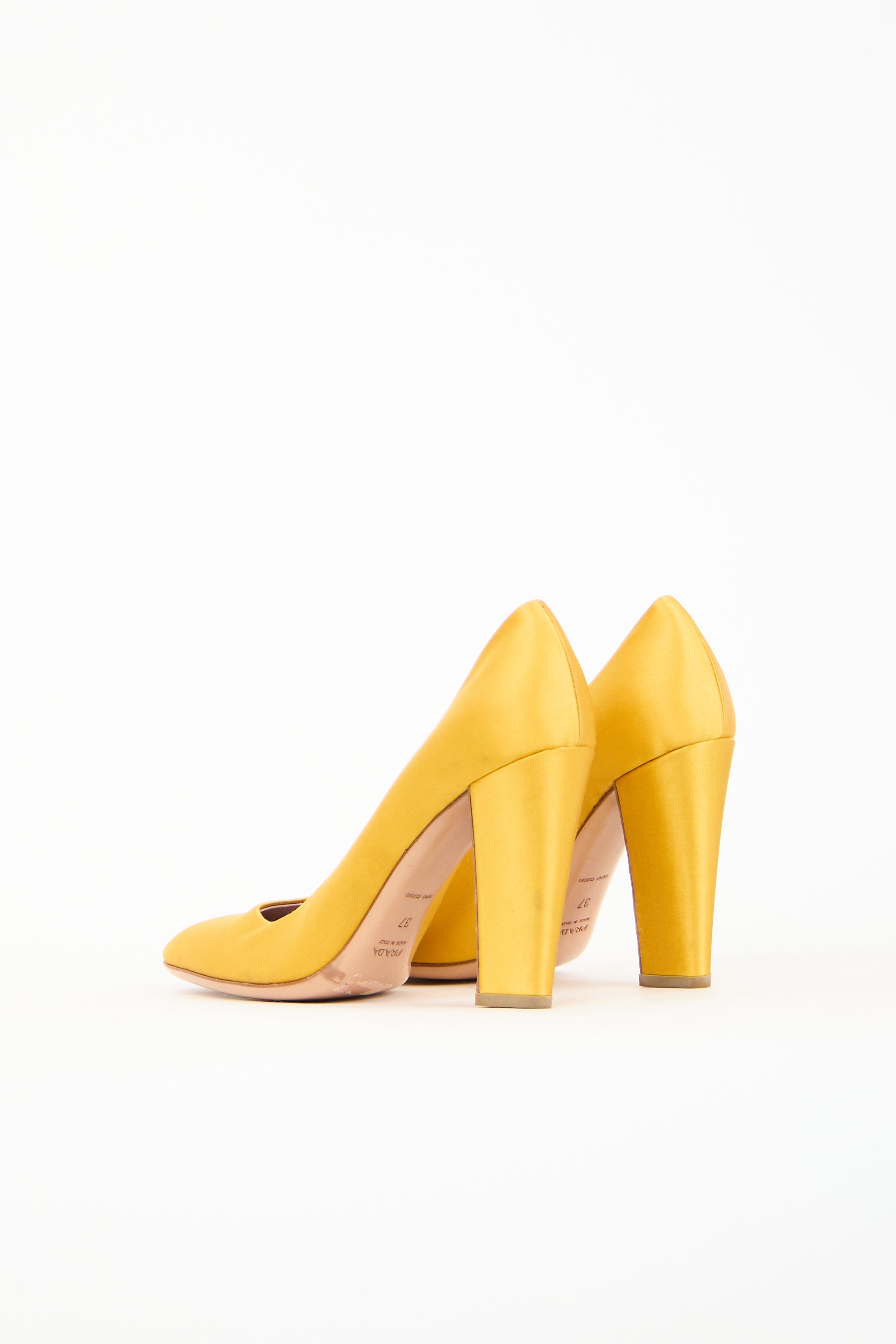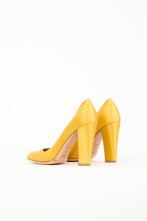 Pre-owned Prada yellow satin pumps featuring a rounded toe, square topline, slip on entry, and a covered block heel.