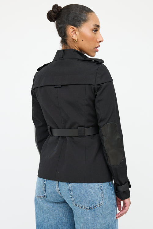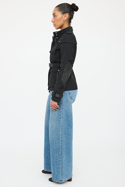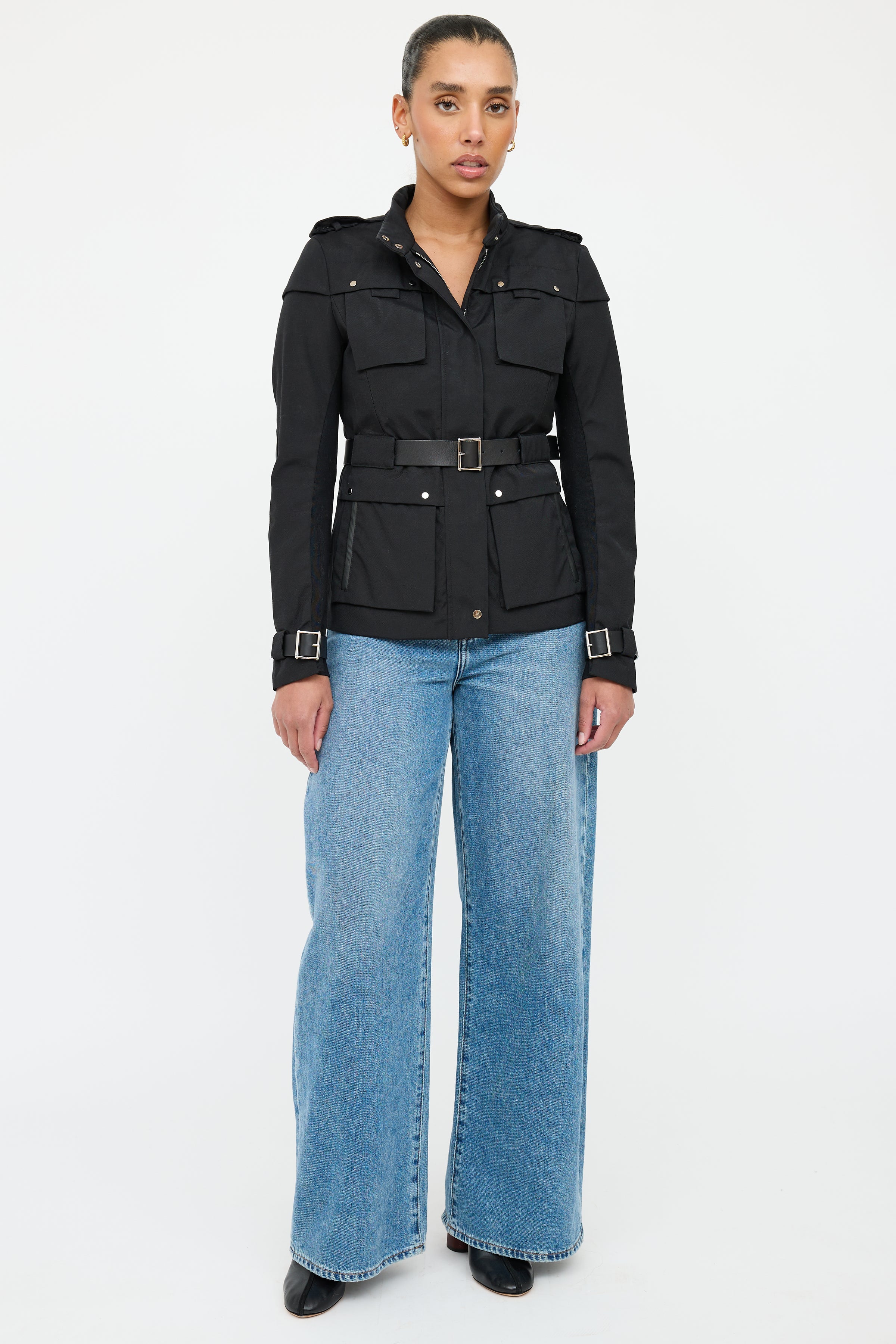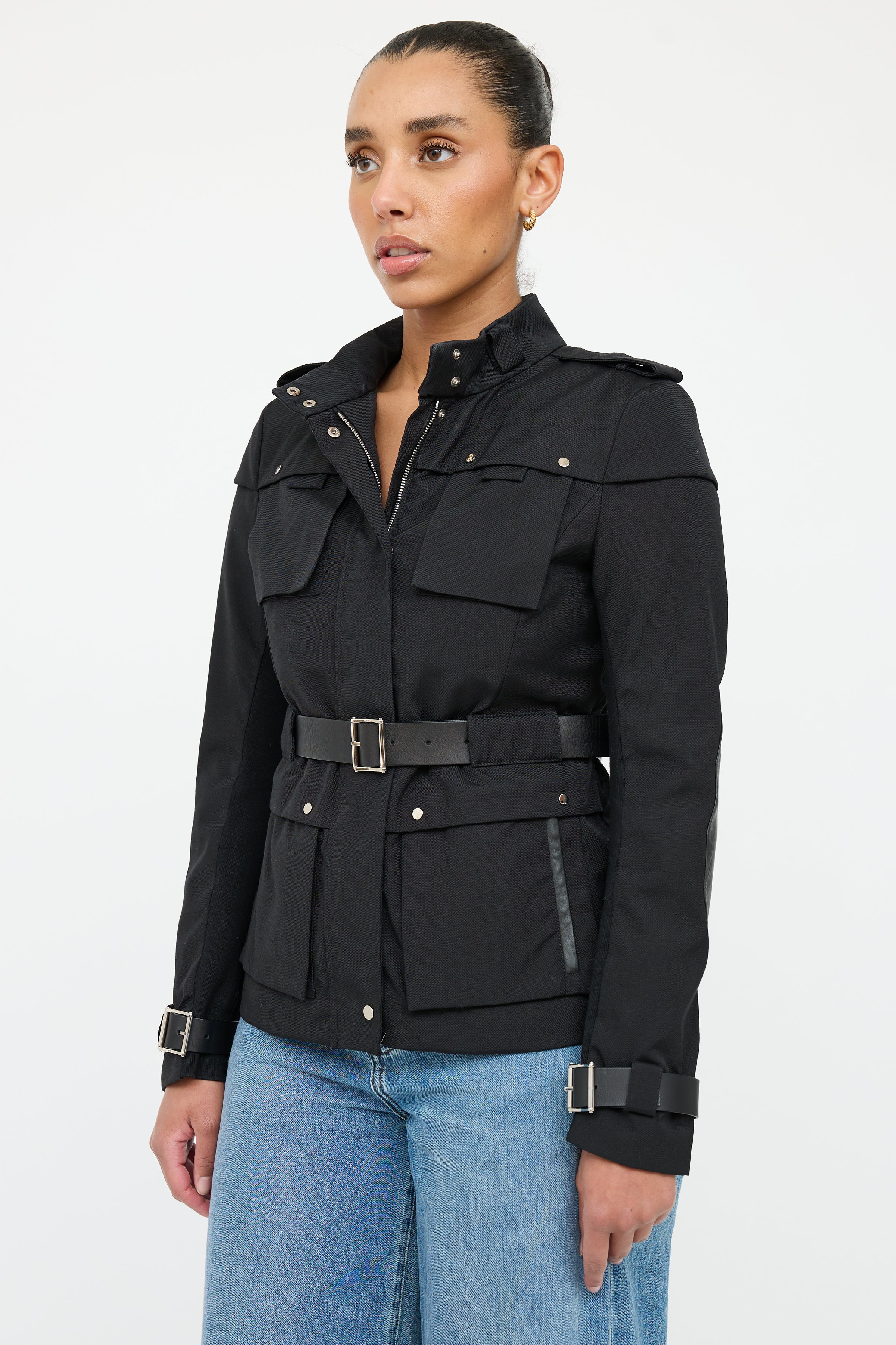Pre-owned Gucci black nylon safari jacket featuring a funnel neck collar, epaulets at shoulders, long sleeves with belted cuffs, leather elbow pads, two slip pockets at chest, two slip pockets and two zip pockets at hip, adjustable leather belt at waist, and zip front with snap closure. Lined. Tom Ford era.