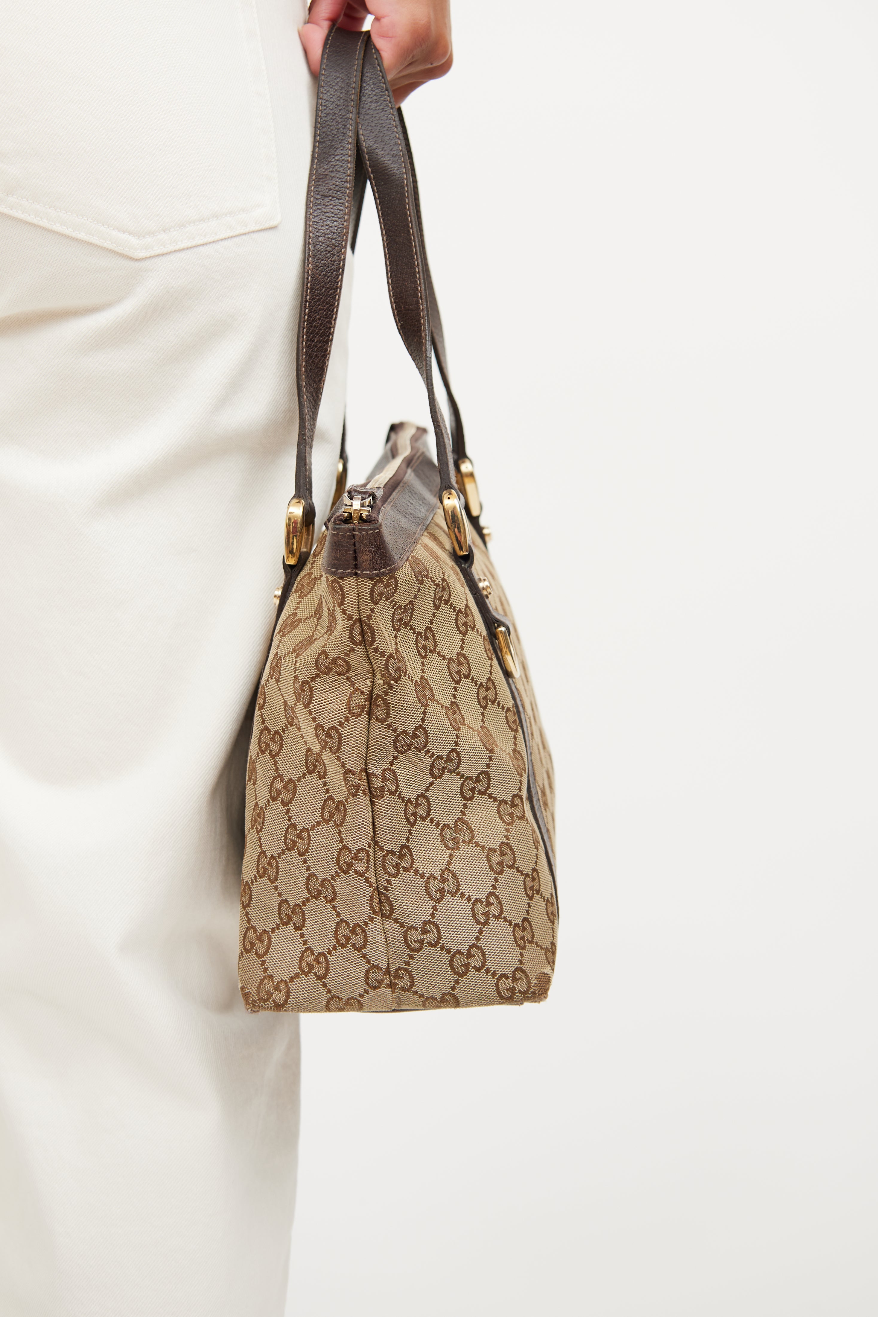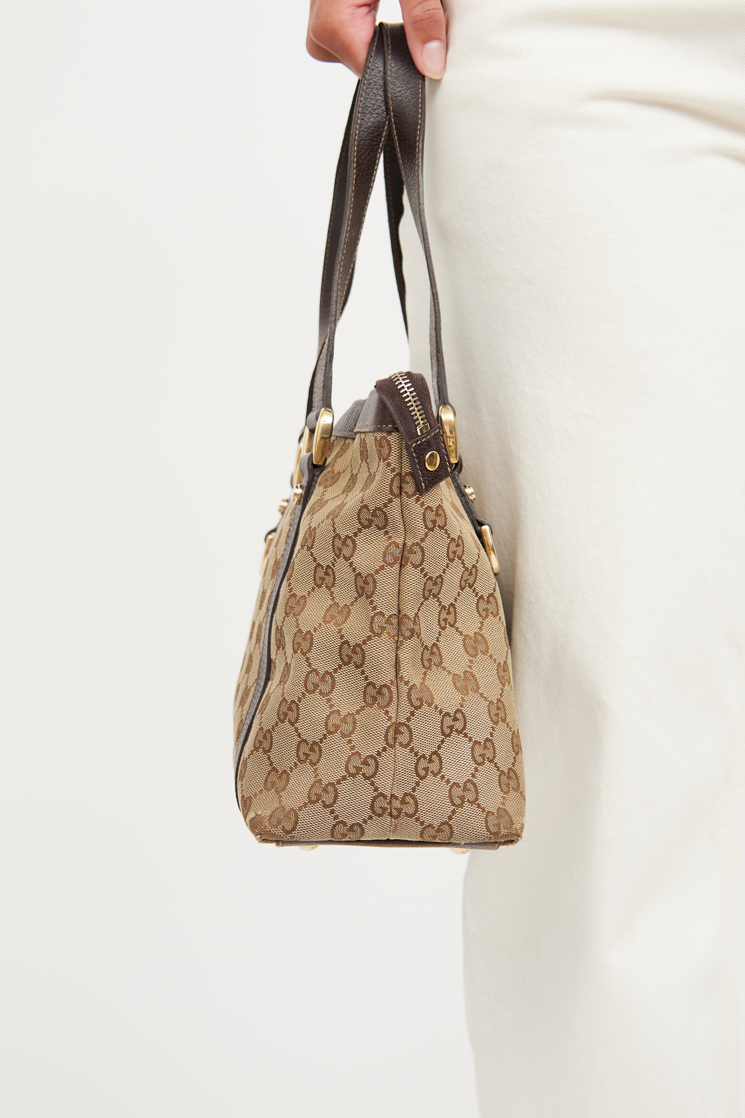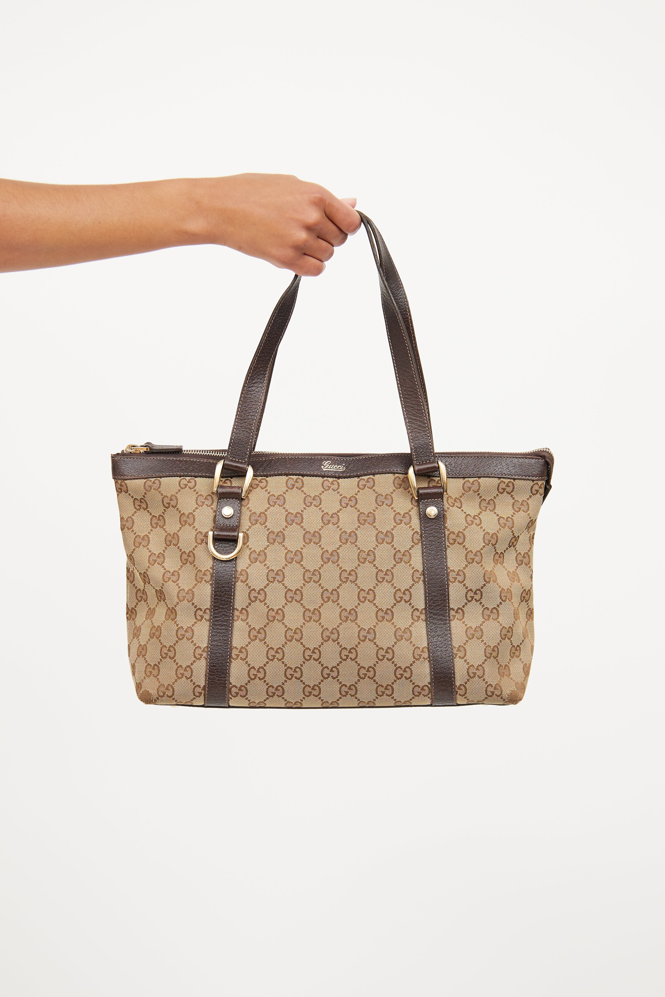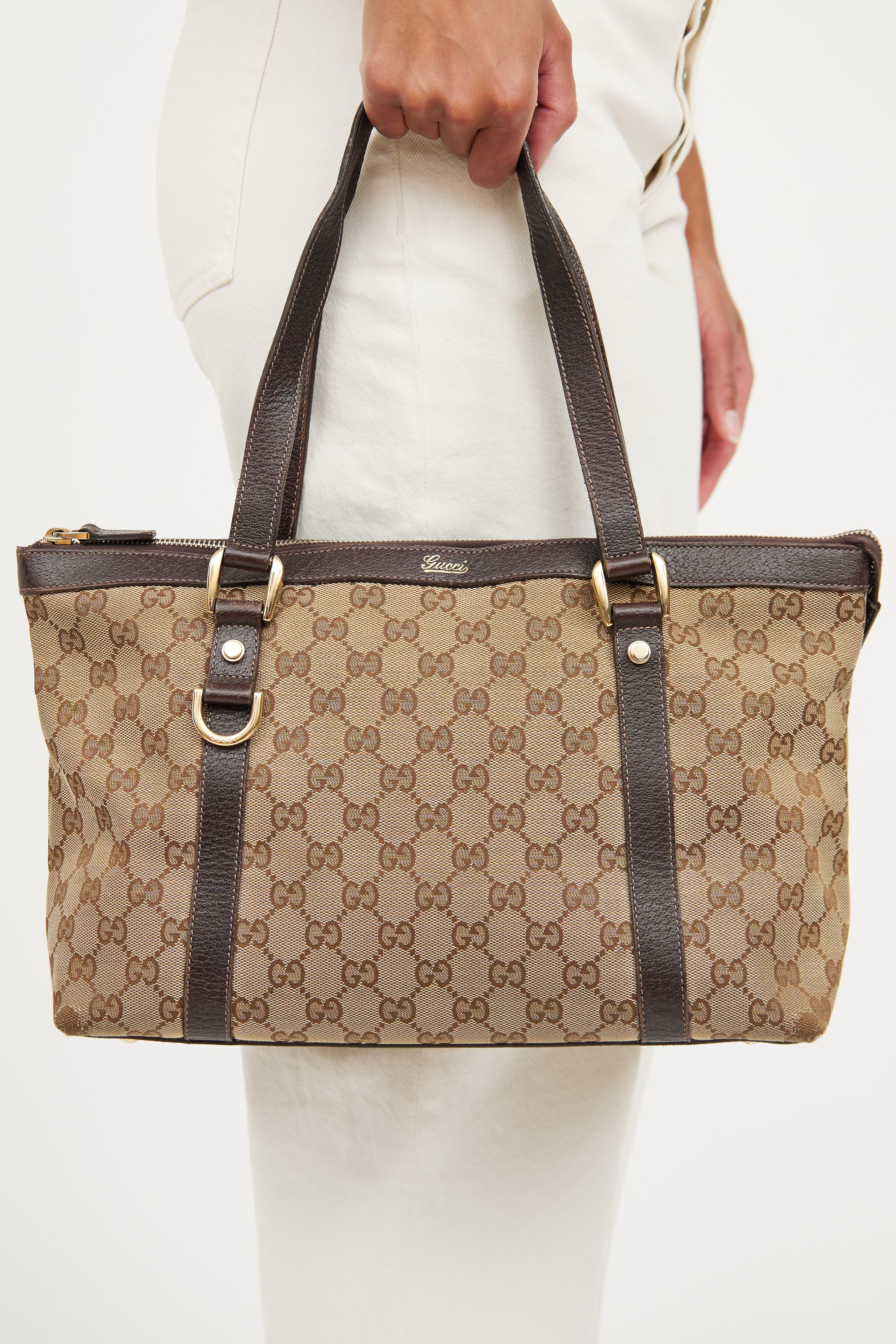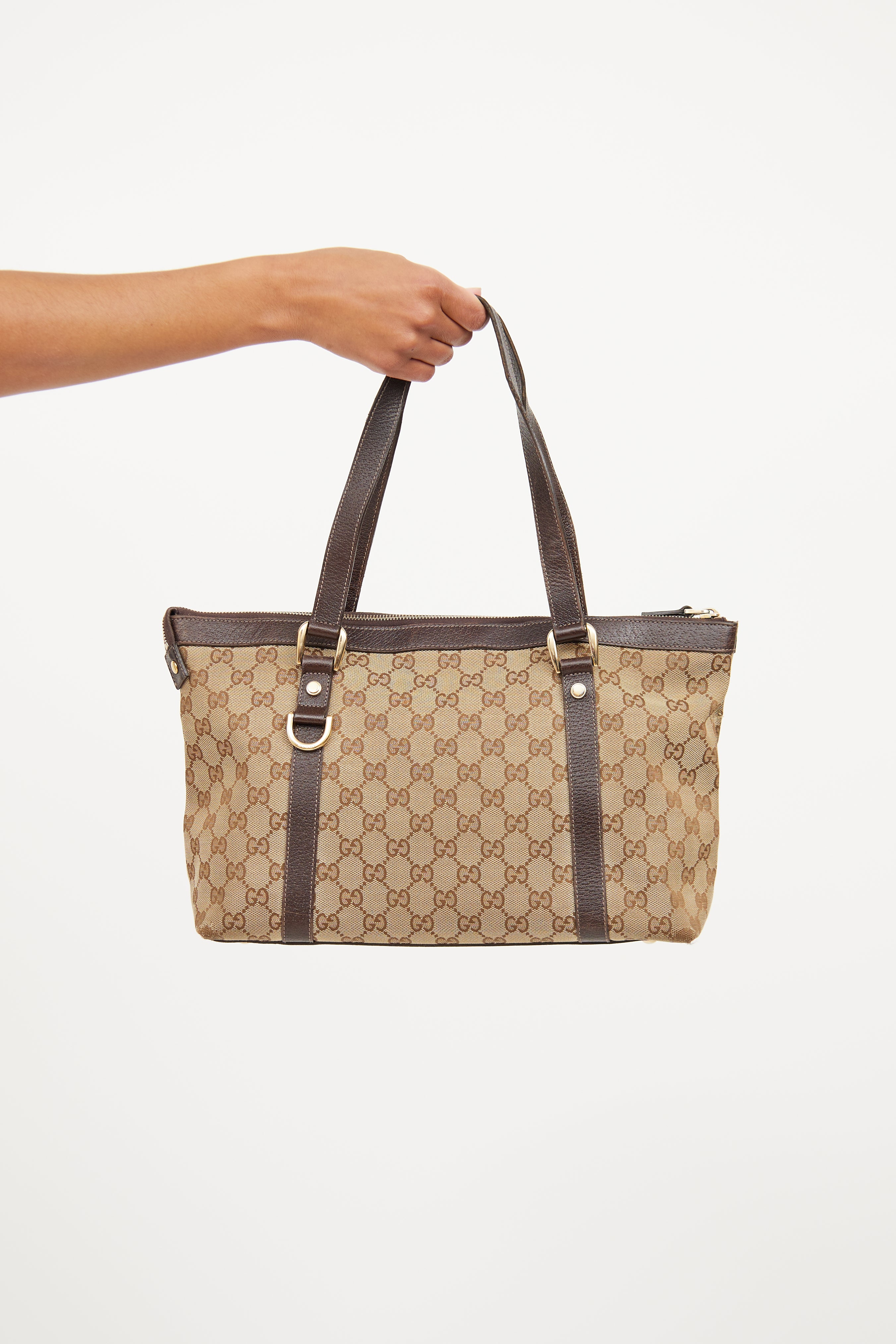 Pre-owned Gucci brown GG Abbey medium bag featuring monogram canvas, two leather handles, leather trim, gold tone hardware, D ring, embossed logo, leather bottom with metal feet, zipper closure, brown canvas lining and one internal zip pocket.