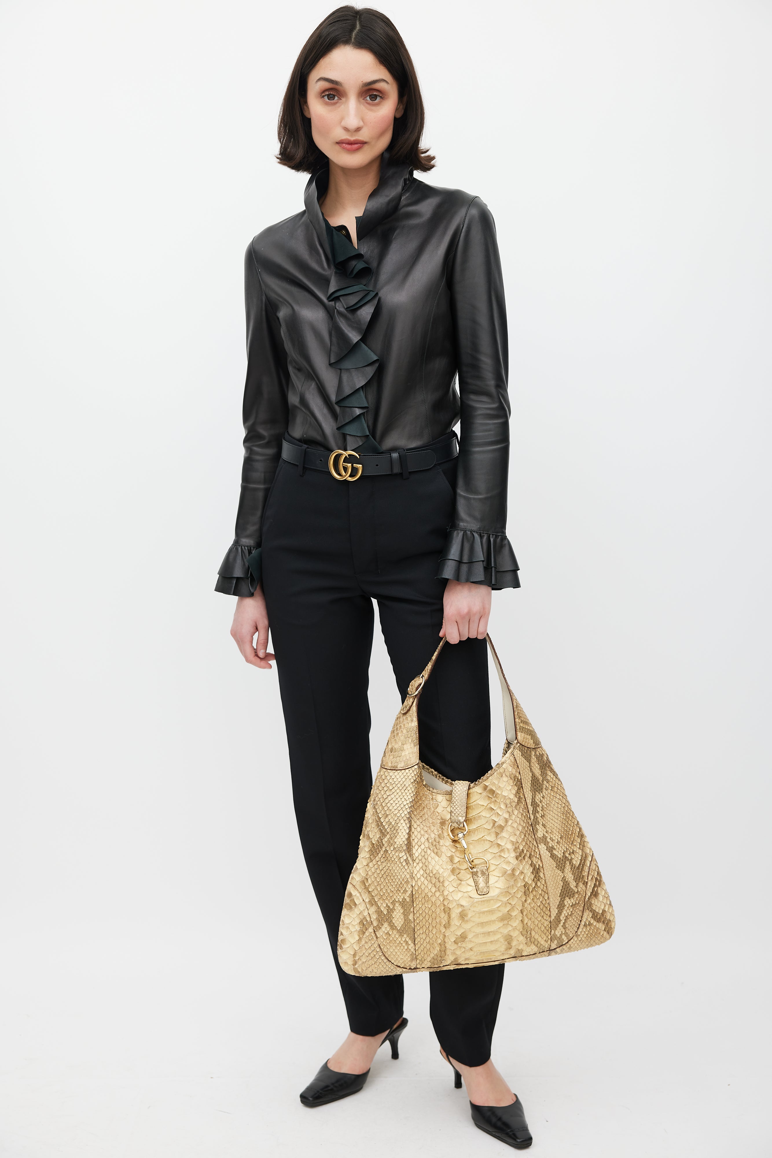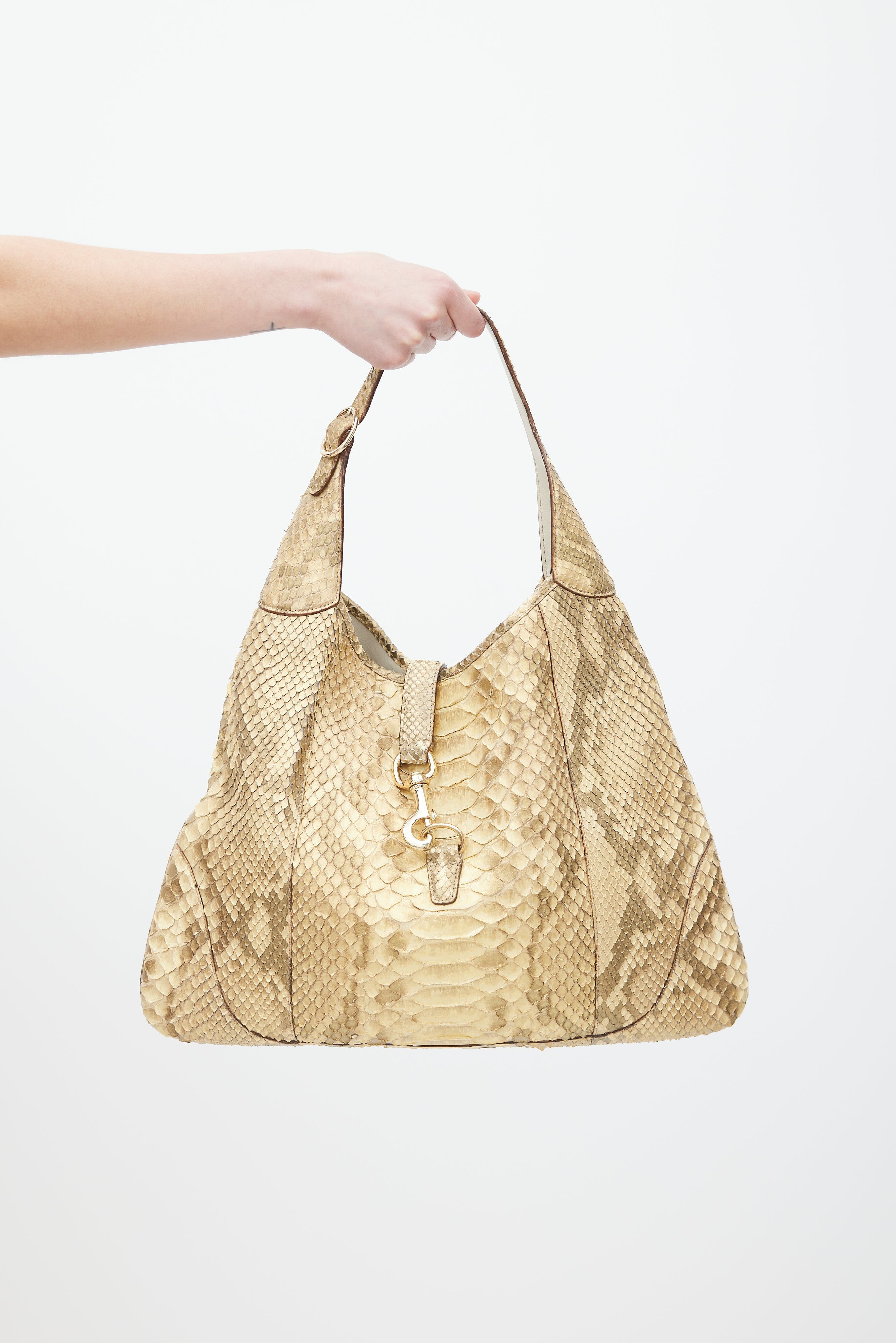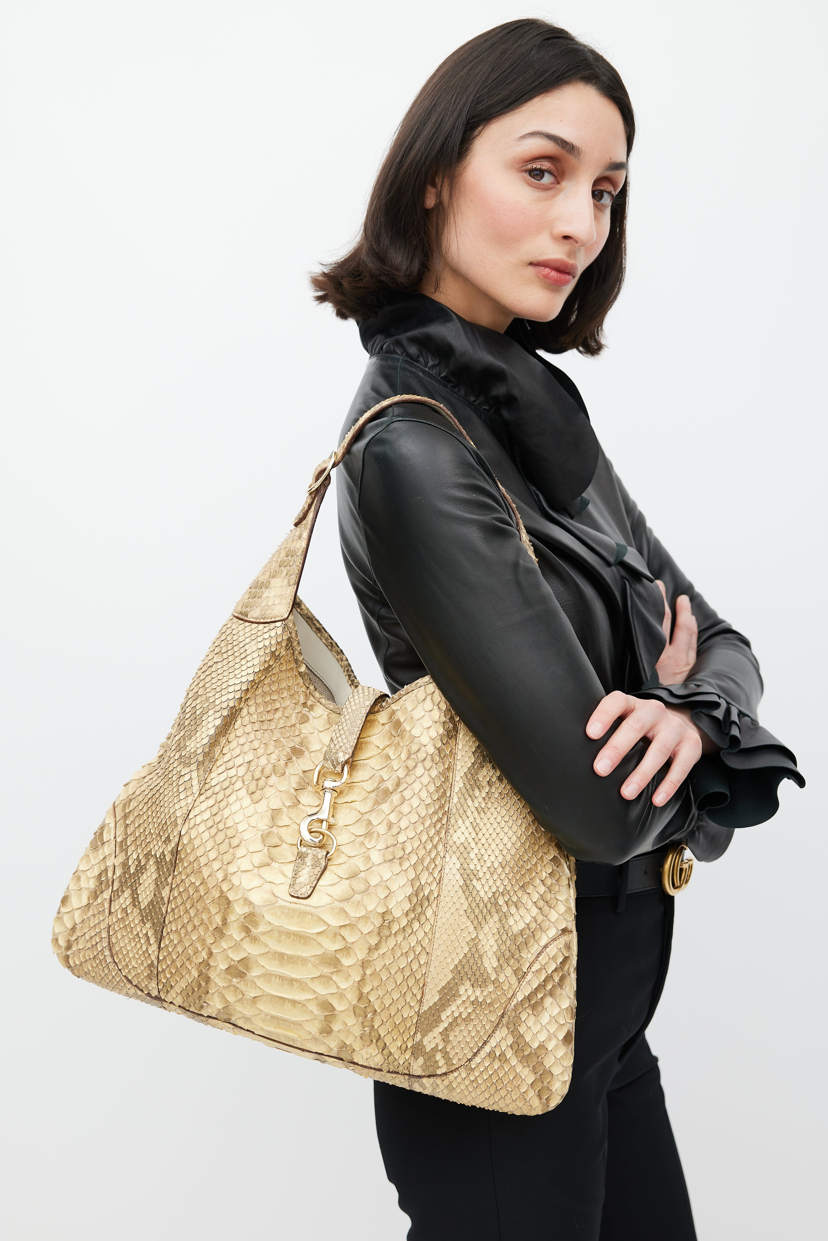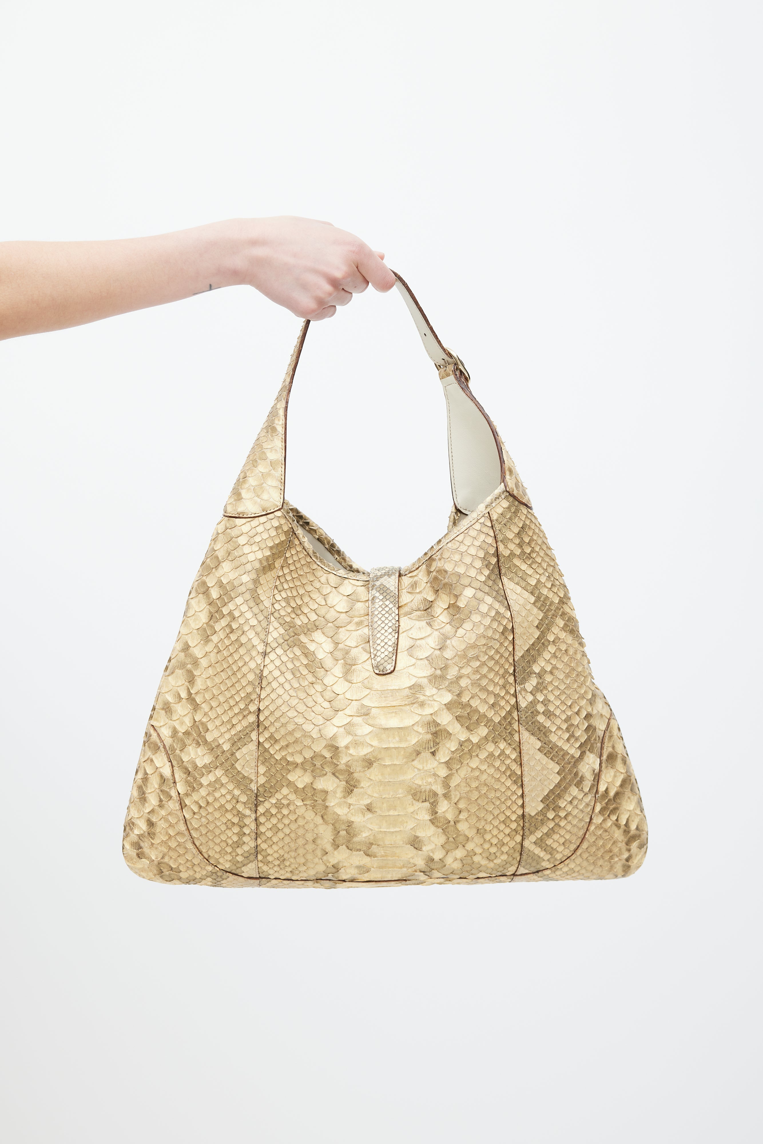 Pre-owned Gucci brown Jackie O Bouvier bag in embossed python leather featuring an adjustable top handle, one main compartment with one slip pocket and one zip pocket, and gold tone latch closure.