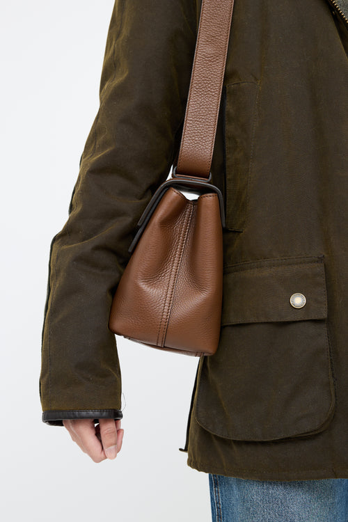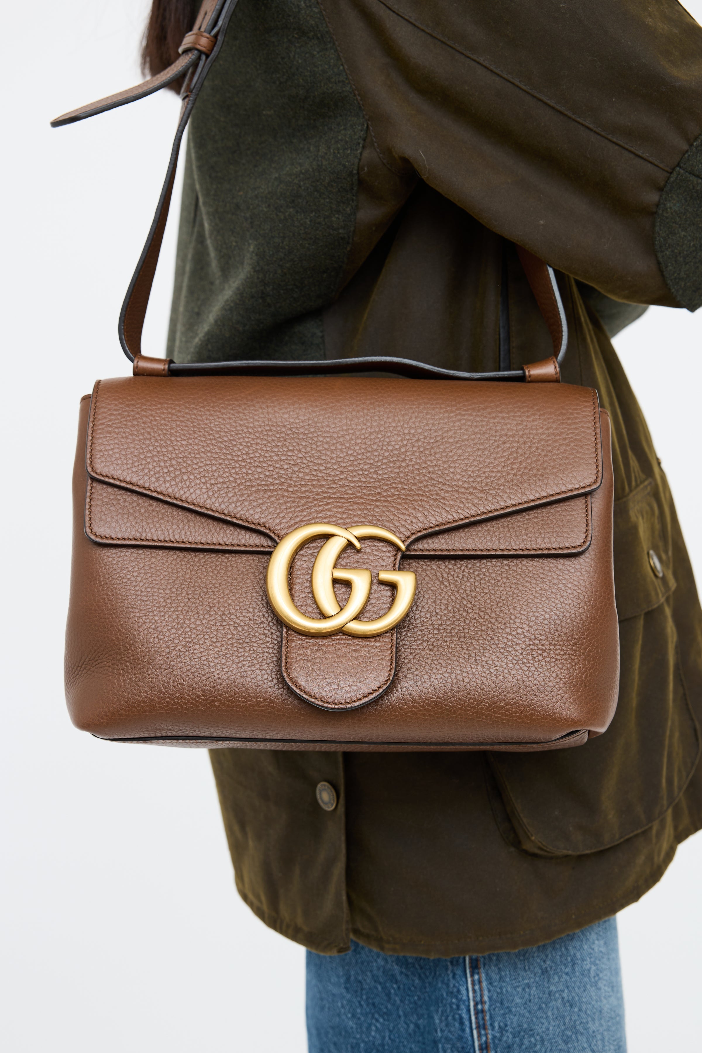 Pre-owned Gucci brown leather Marmont messenger bag featuring adjustable flat shoulder strap, gold tone hardware, pebbled leather, GG hardware on front flap with push button closure. Canvas lined main compartment with divider, zip pocket and two slip pockets.
