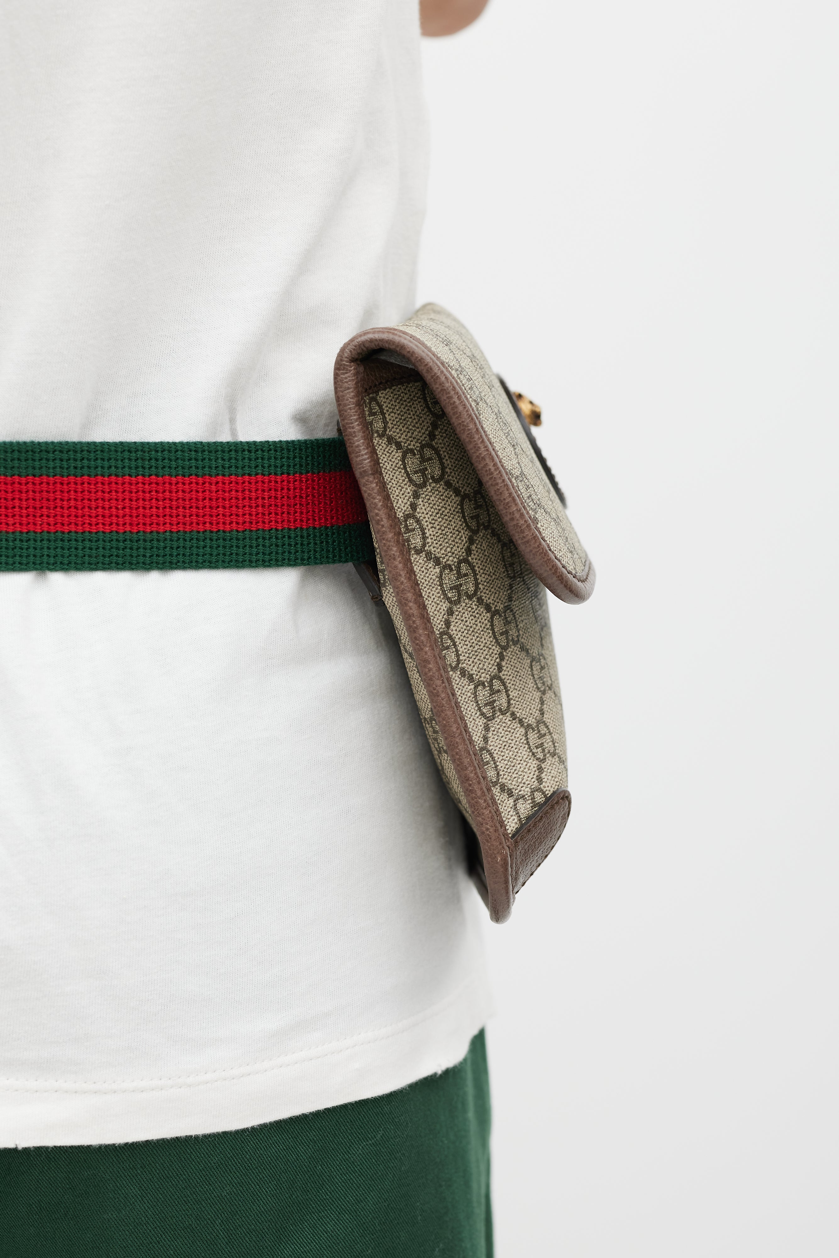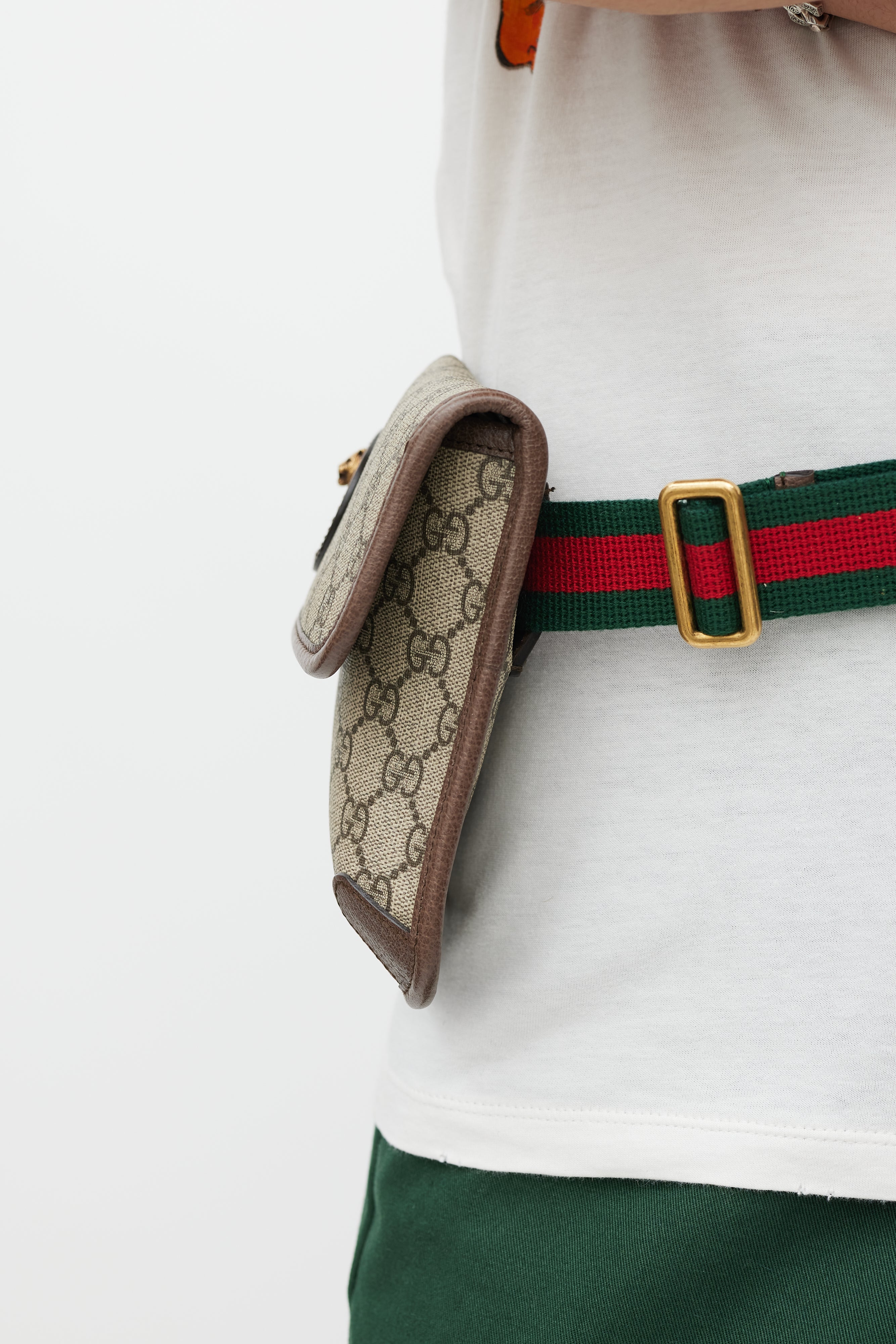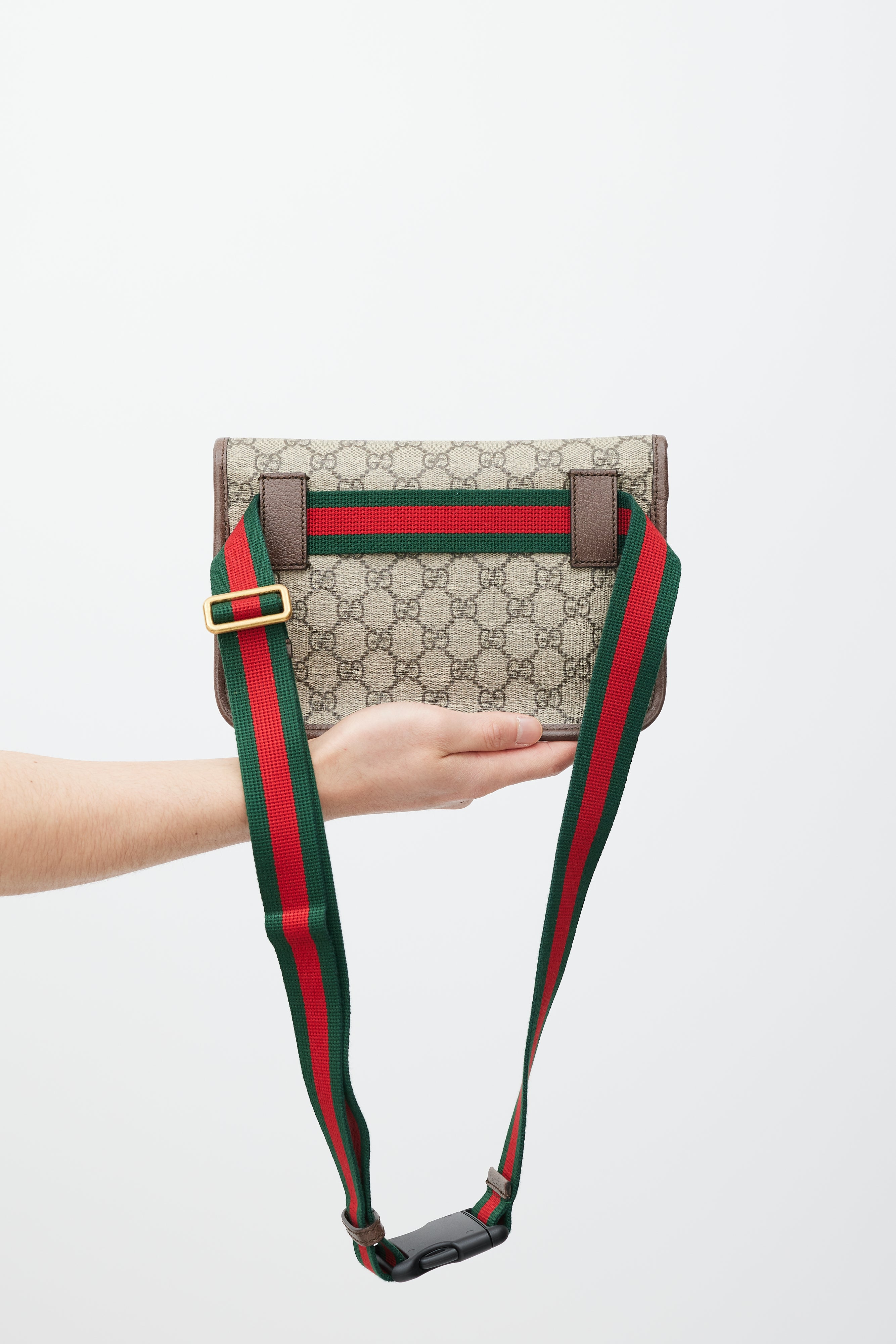 Pre-owned Gucci brown belt bag in GG Supreme monogram coated canvas featuring an embossed leather logo tab at front with gold tone tiger head hardware, top flap, one main compartment, brown leather trim, multicolour webbed striped belt strap, and magnetic snap closure. Comes with original dust bag.