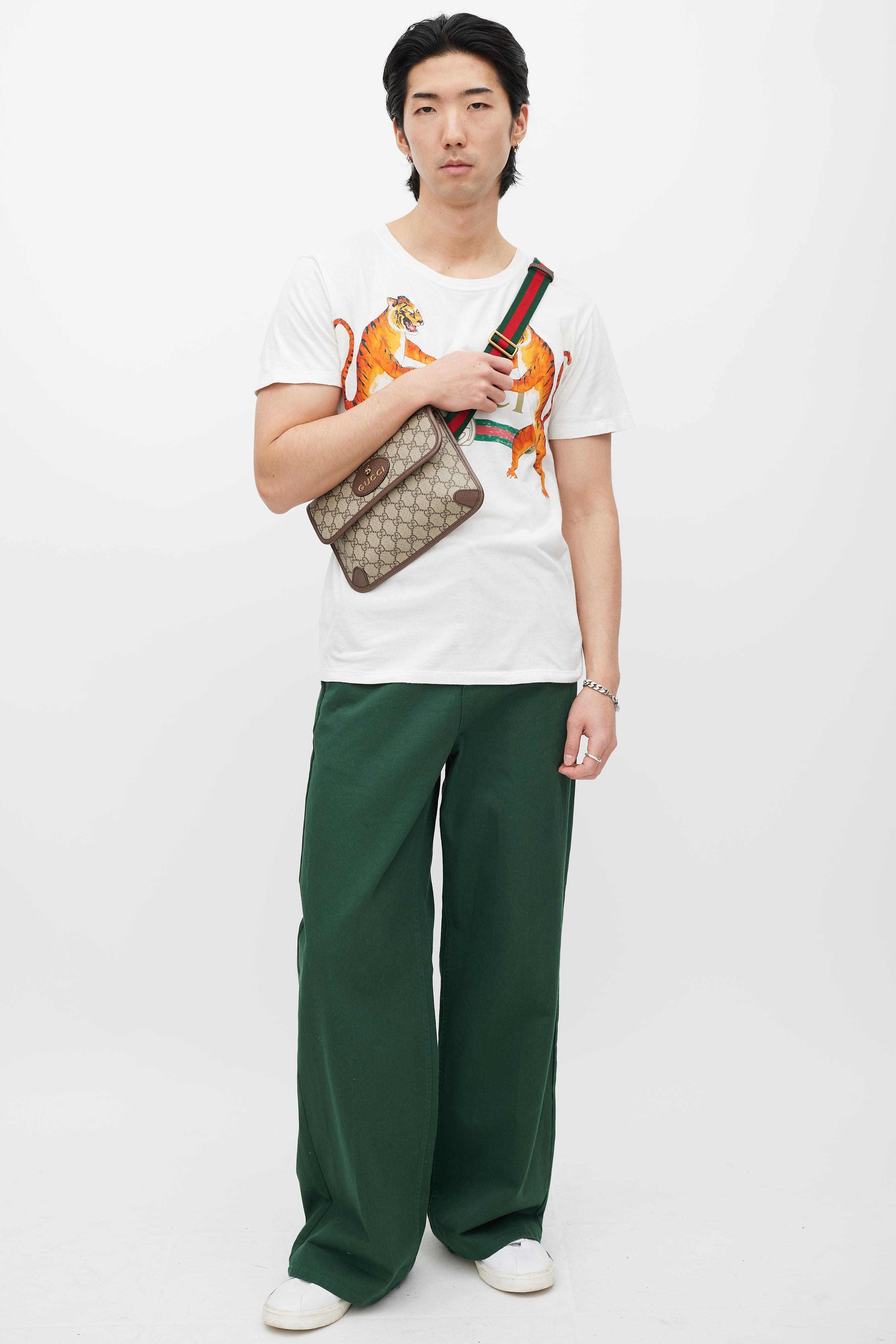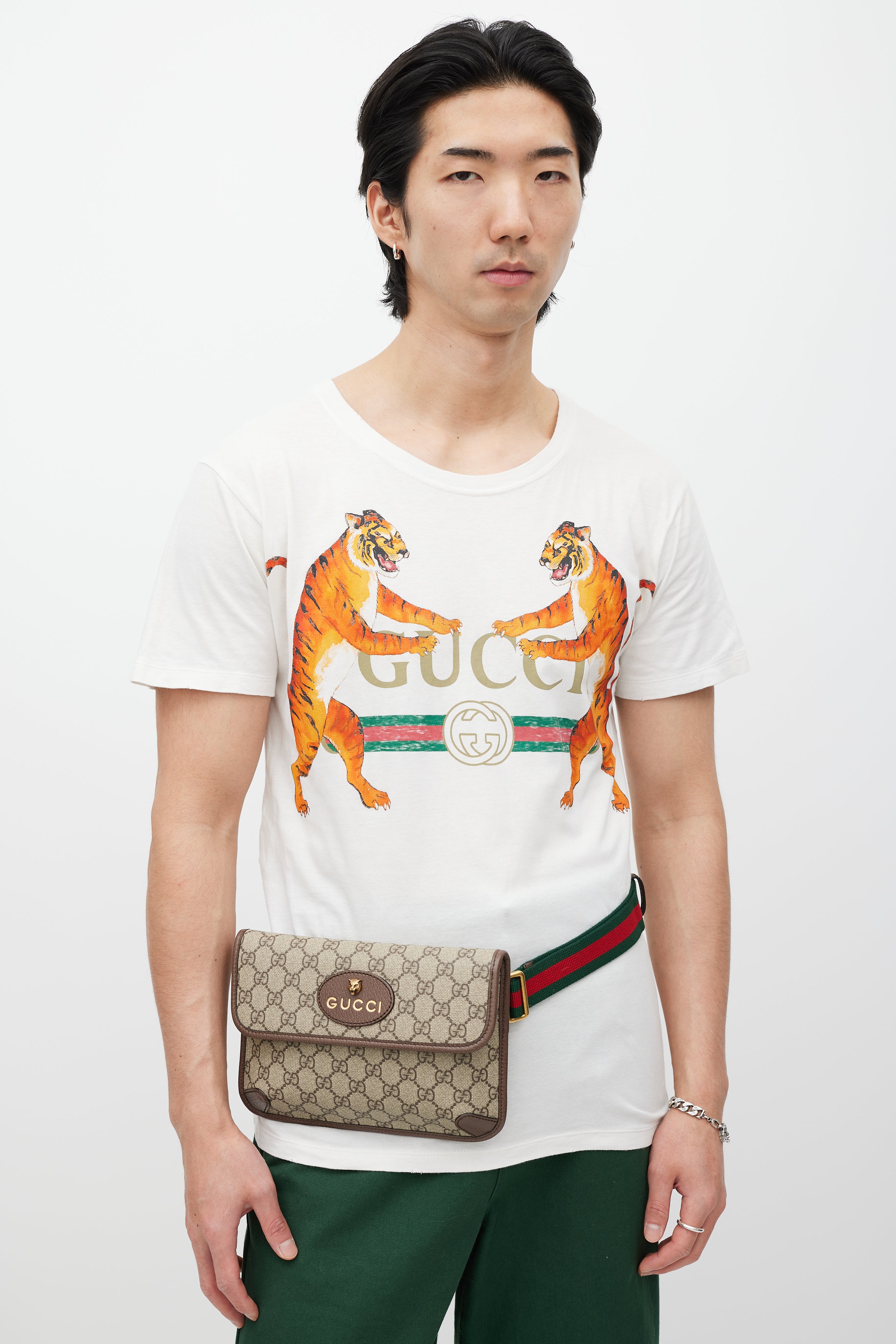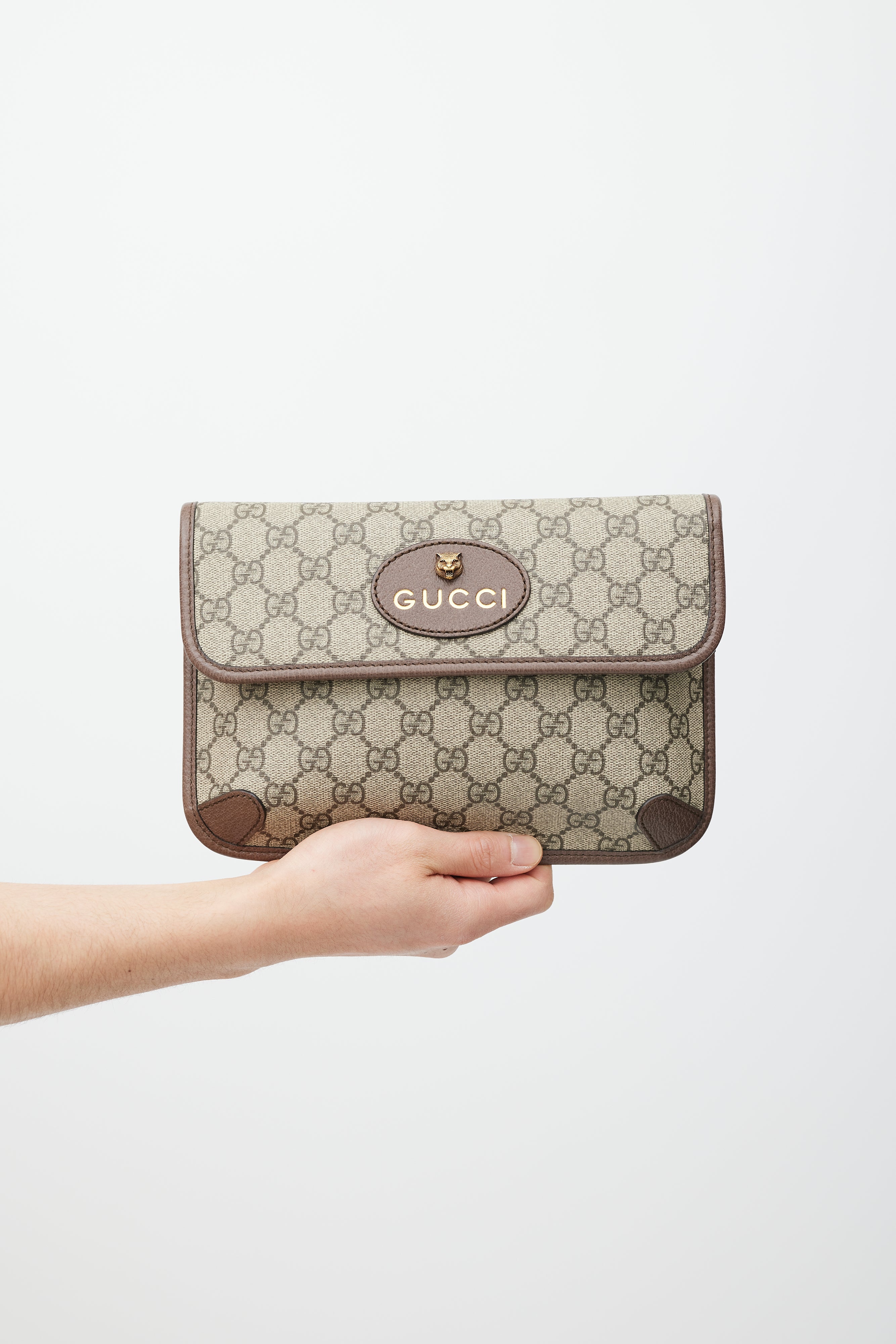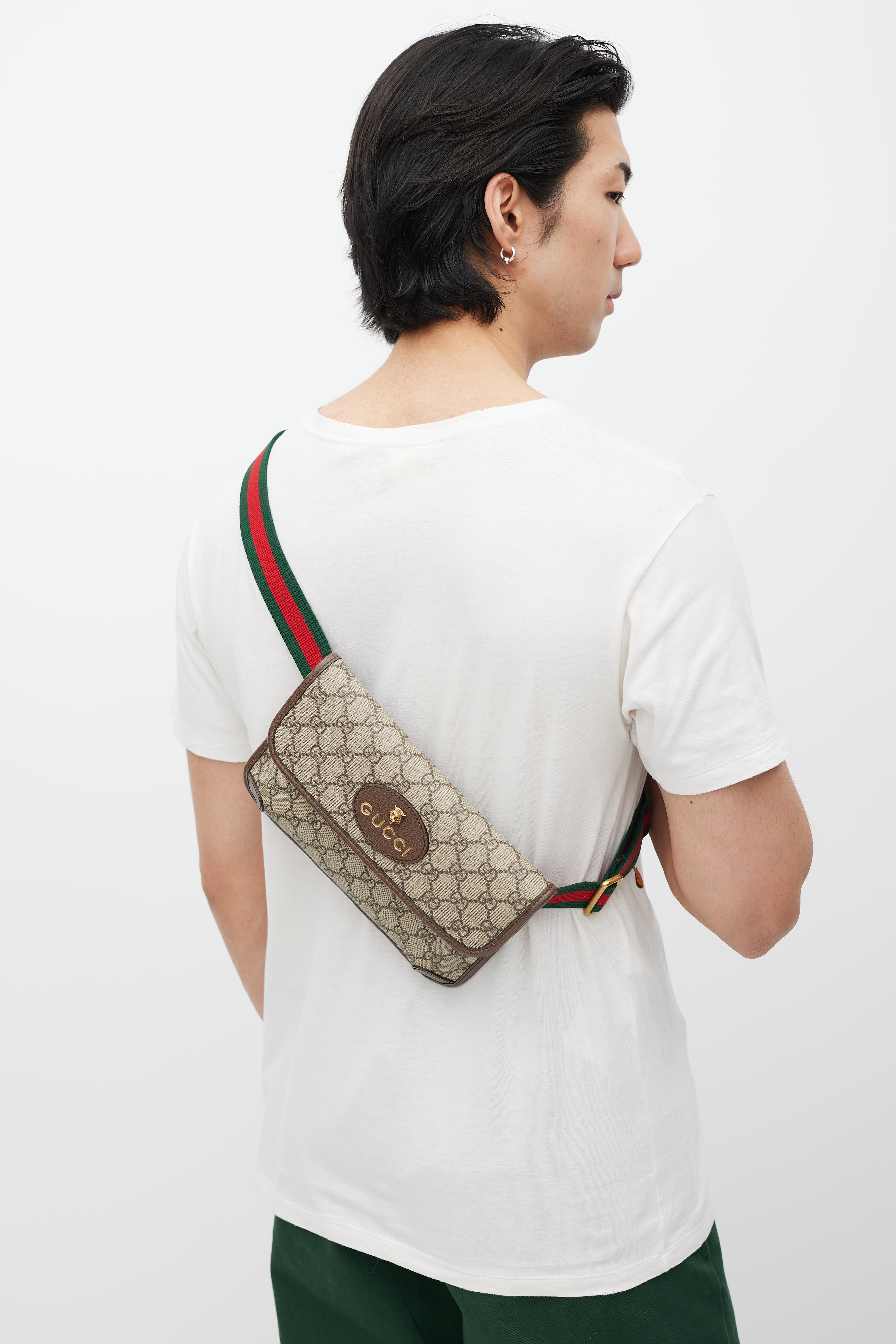 Pre-owned Gucci brown belt bag in GG Supreme monogram coated canvas featuring an embossed leather logo tab at front with gold tone tiger head hardware, top flap, one main compartment, brown leather trim, multicolour webbed striped belt strap, and magnetic snap closure. Comes with original dust bag.