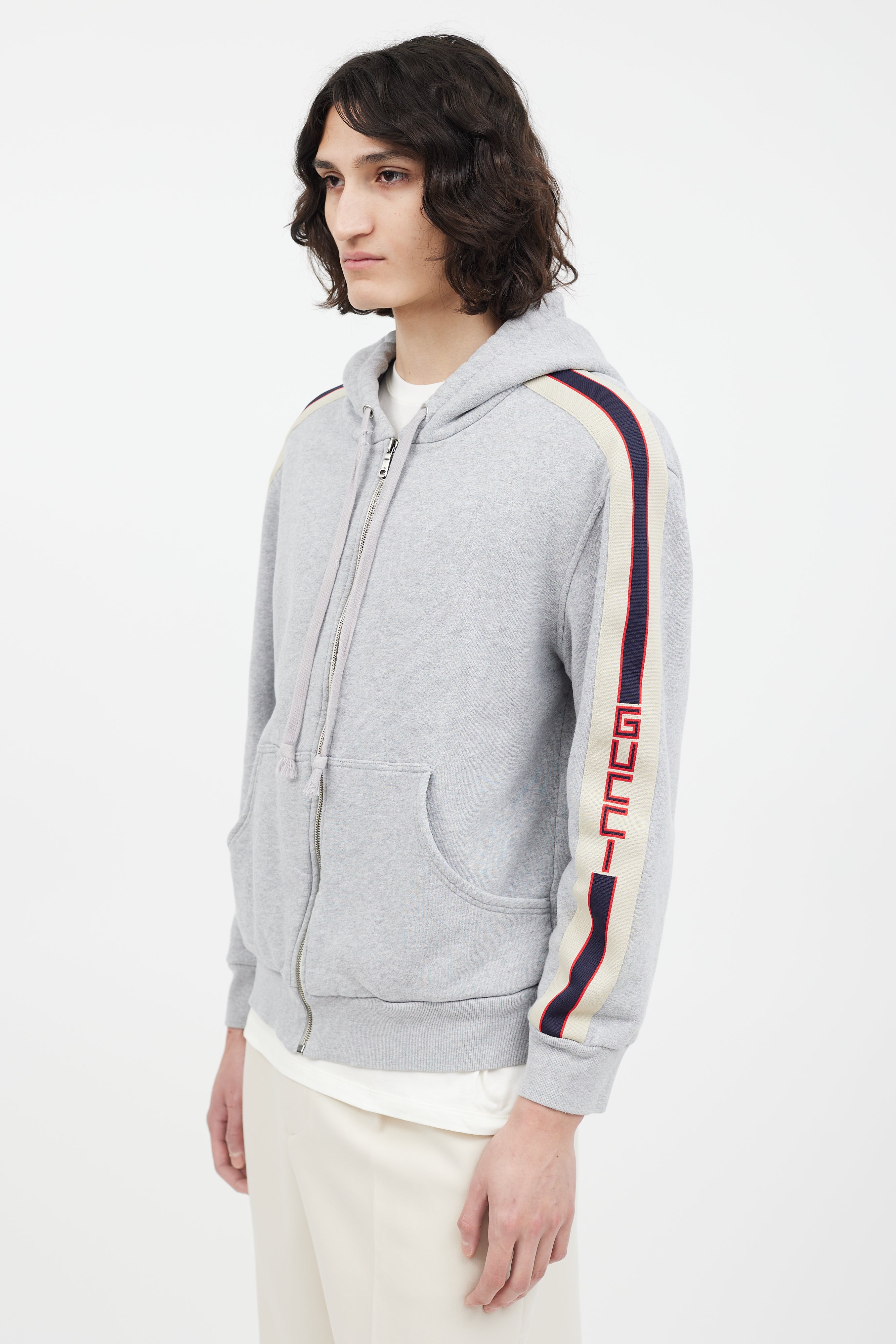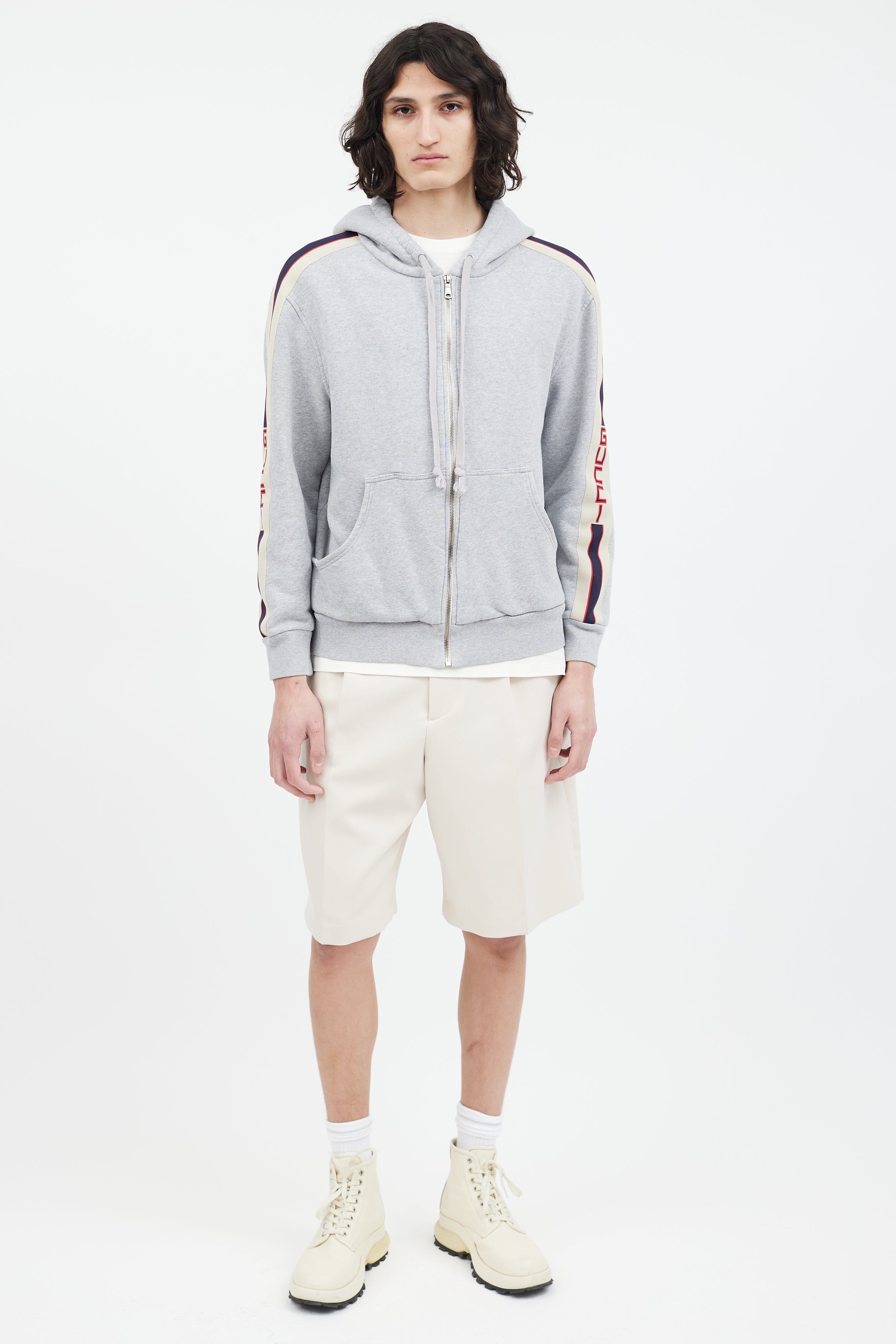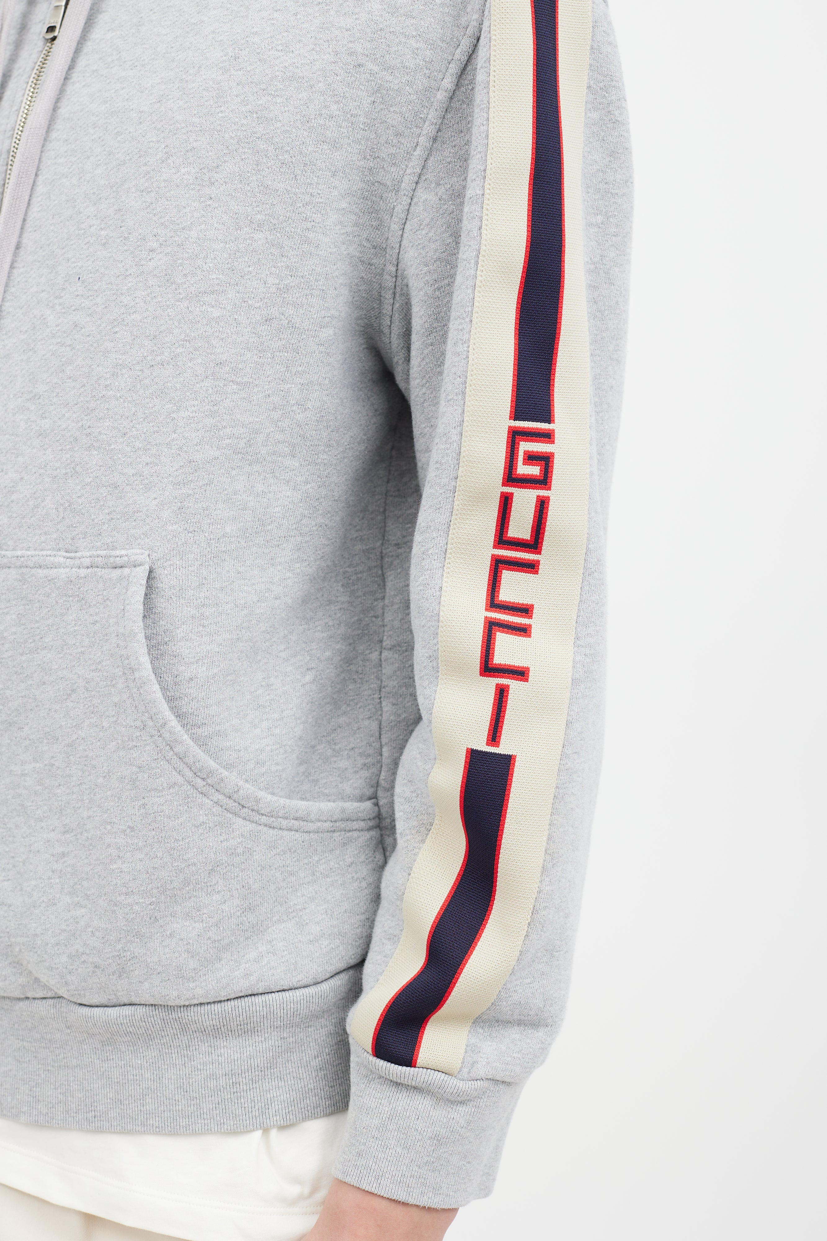 Pre-owned Gucci grey hoodie featuring full zip up front, attached hood with drawstring fastening, two hip pockets, and cream and navy webbed trim with logo intarsia.