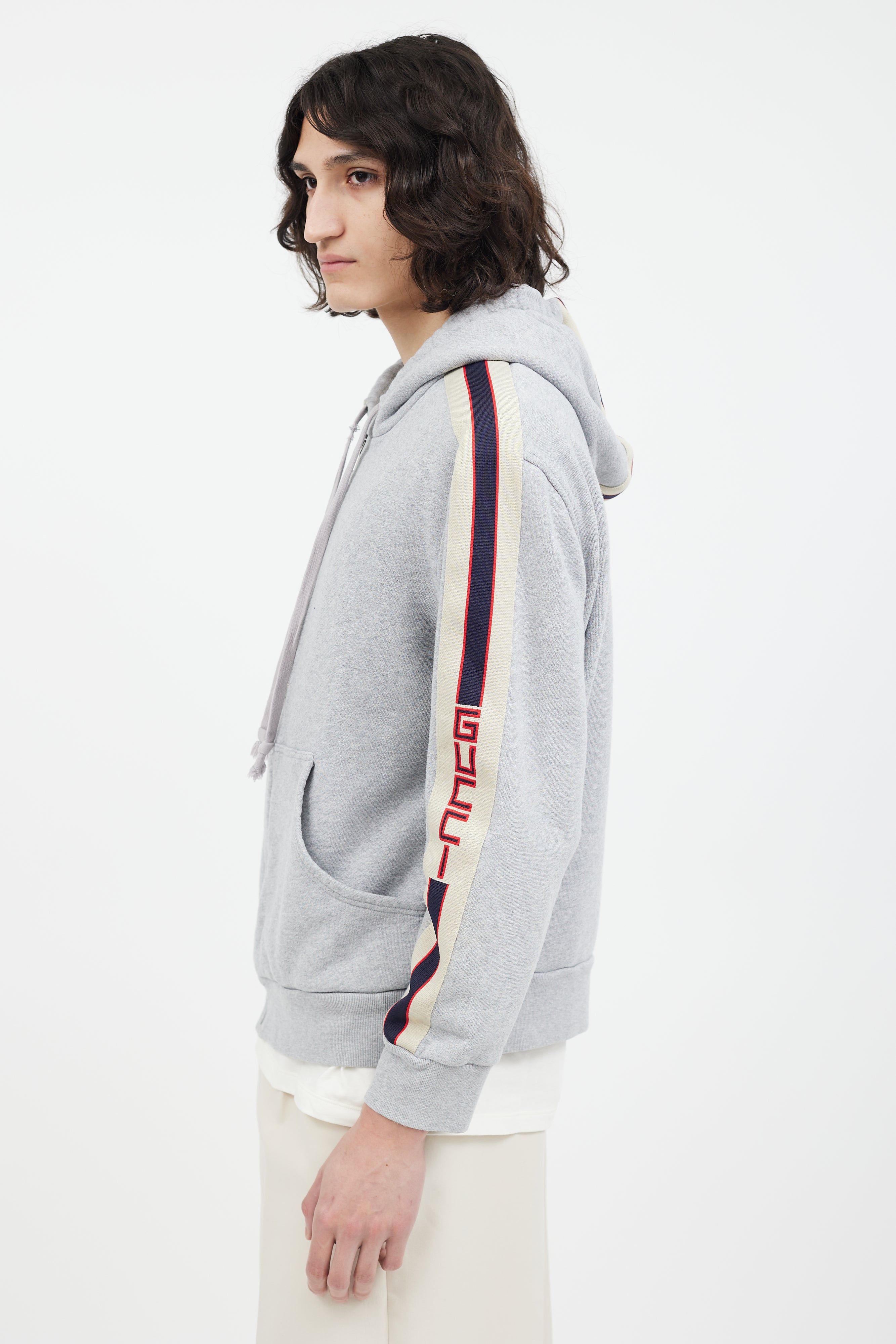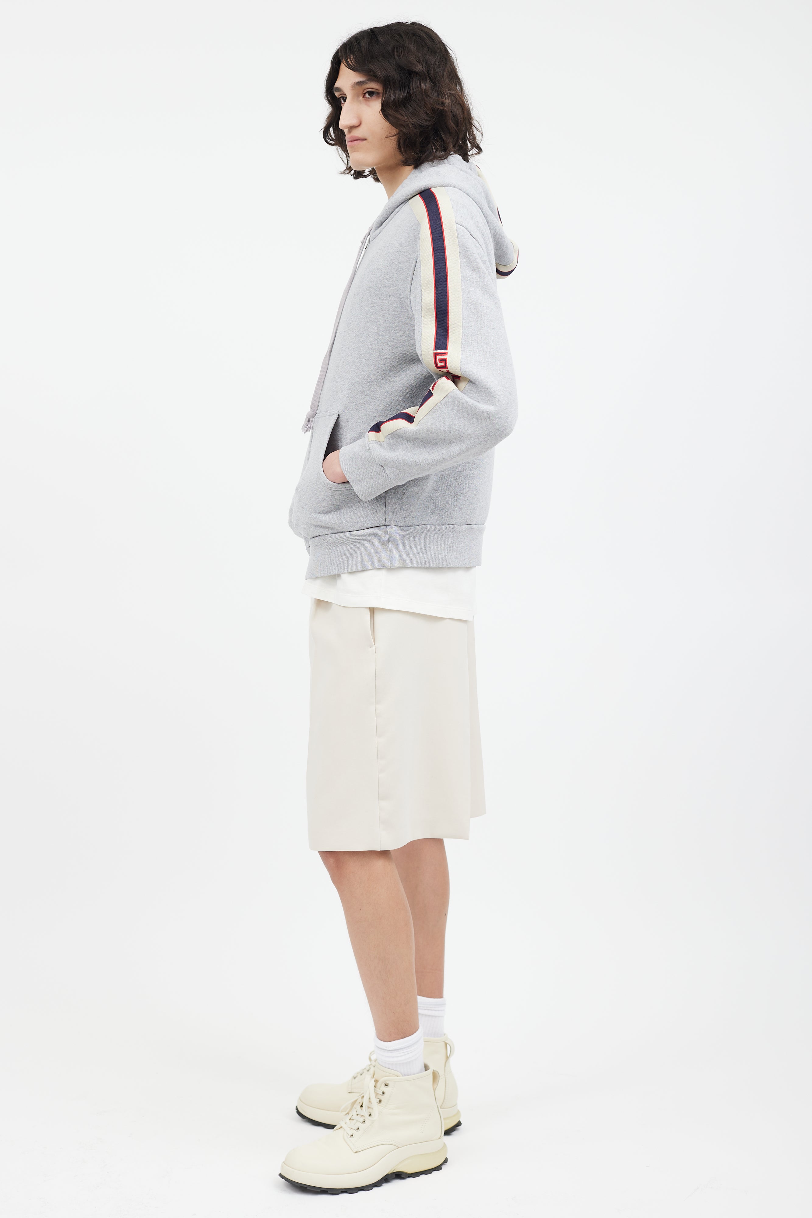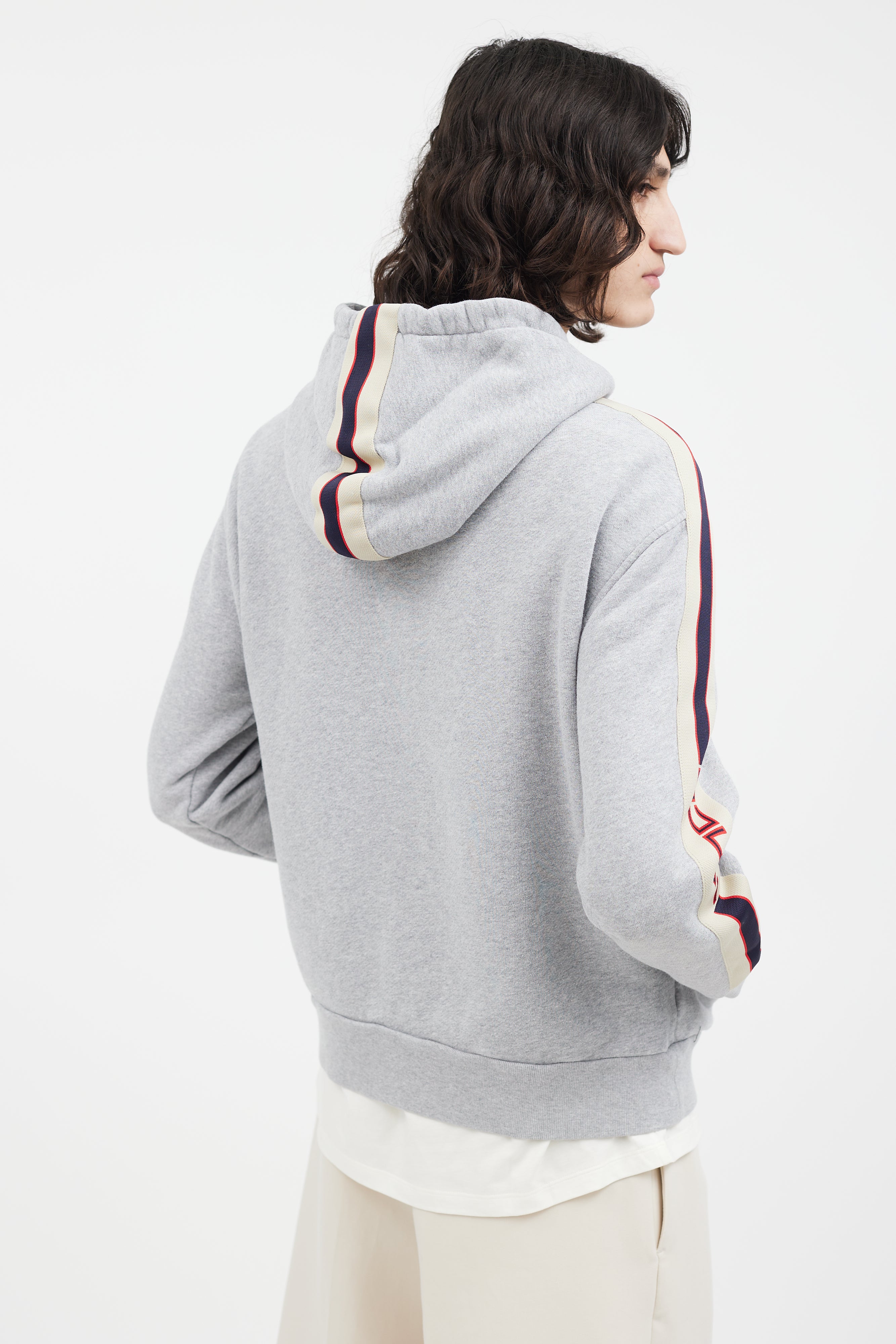 Pre-owned Gucci grey hoodie featuring full zip up front, attached hood with drawstring fastening, two hip pockets, and cream and navy webbed trim with logo intarsia.