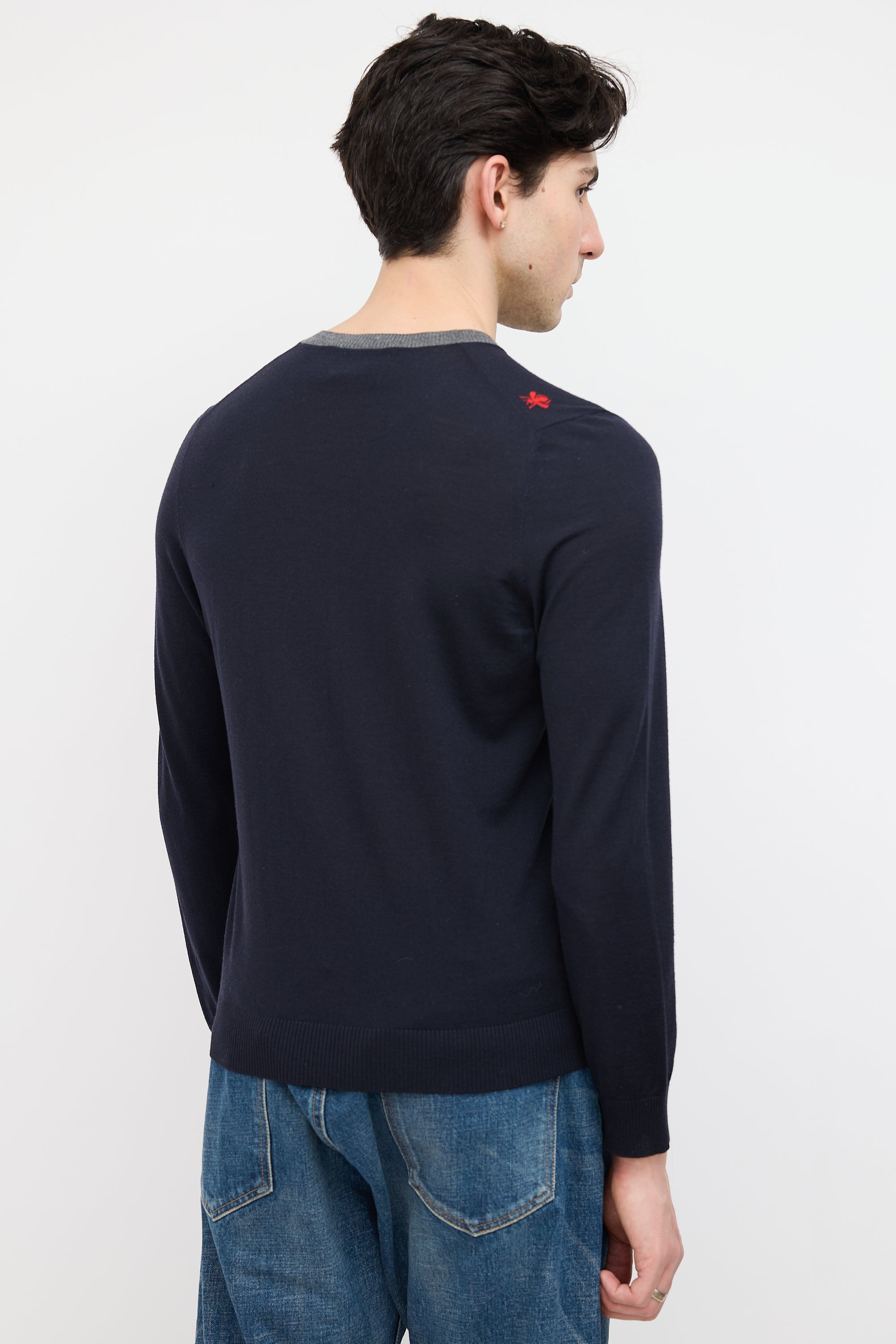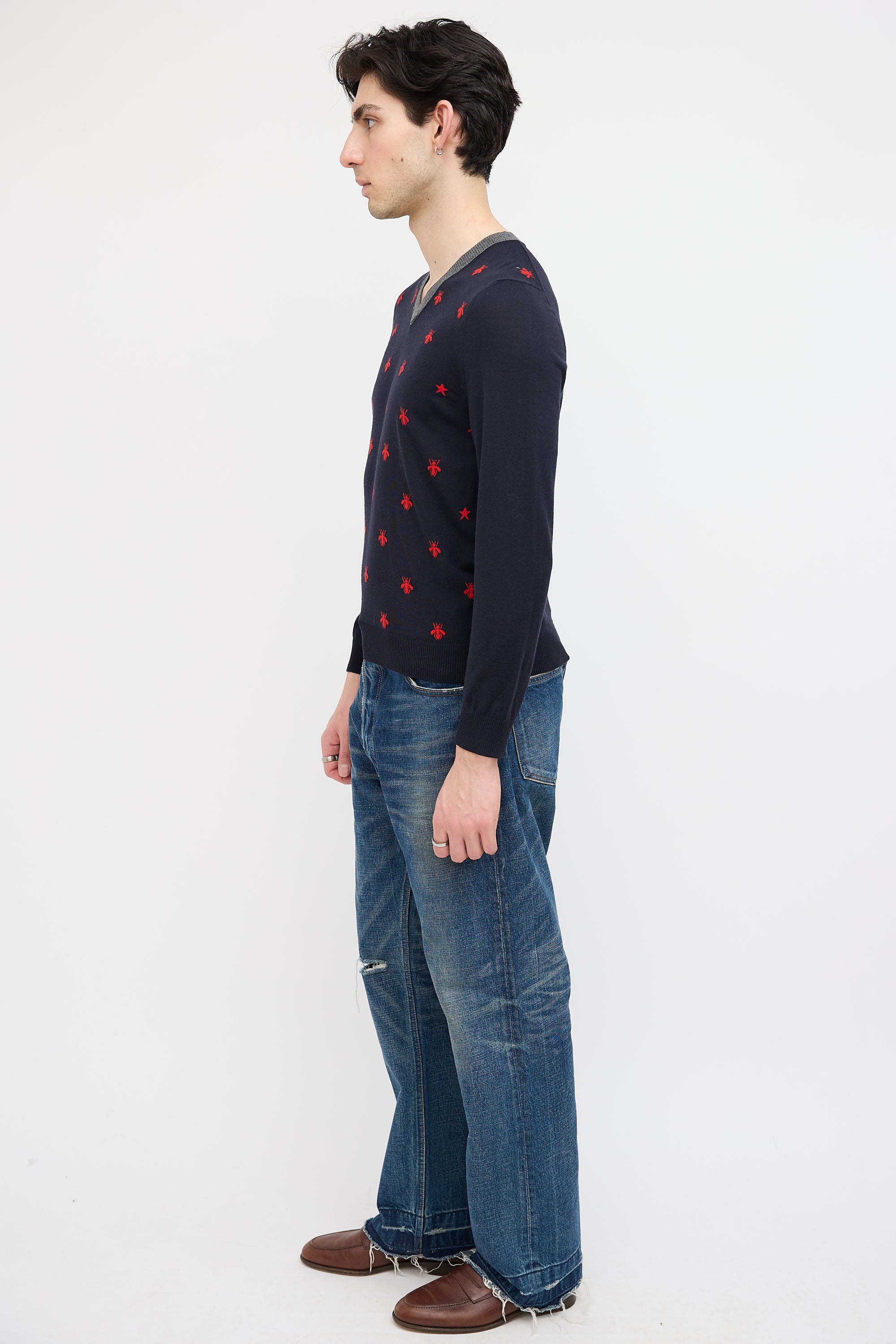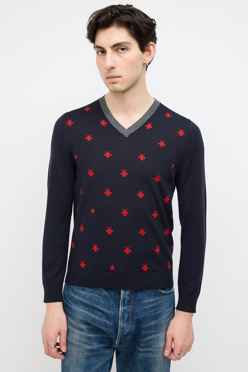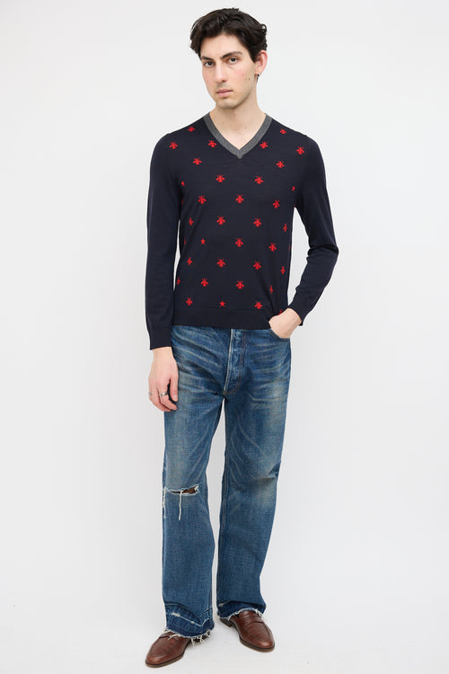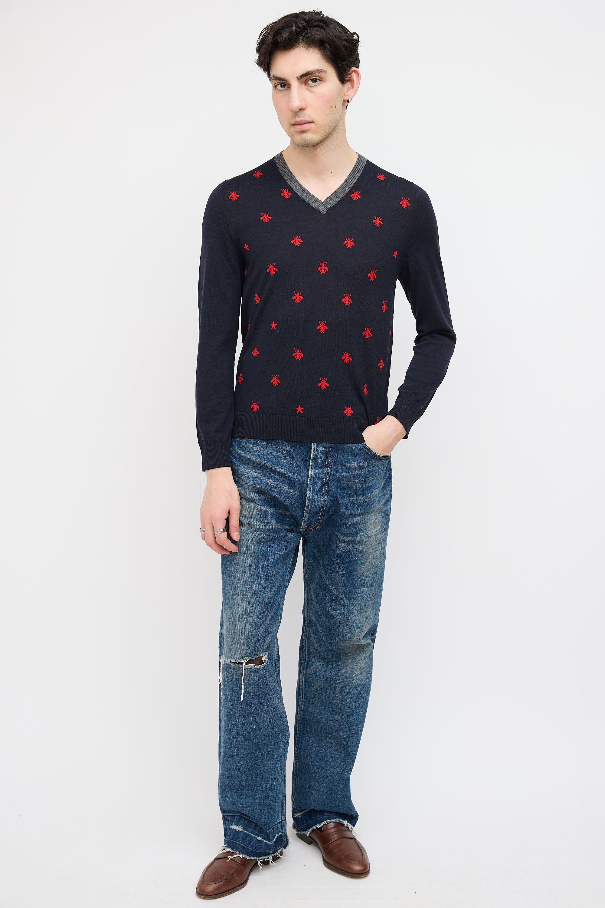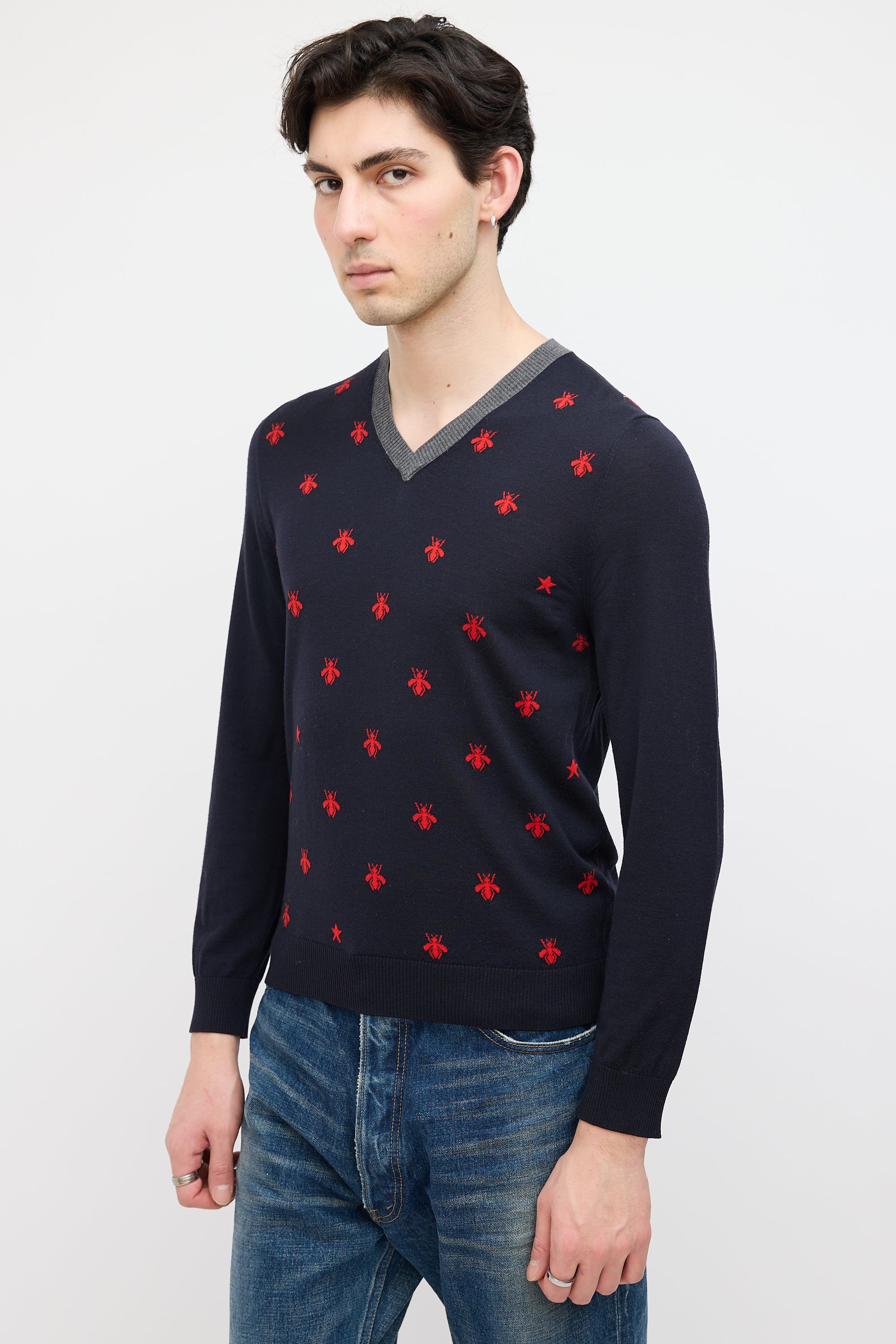 Pre-owned Gucci navy wool sweater featuring red bee intarsia throughout, V-neckline with ribbed grey trim, and tonal ribbed cuffs and hem.