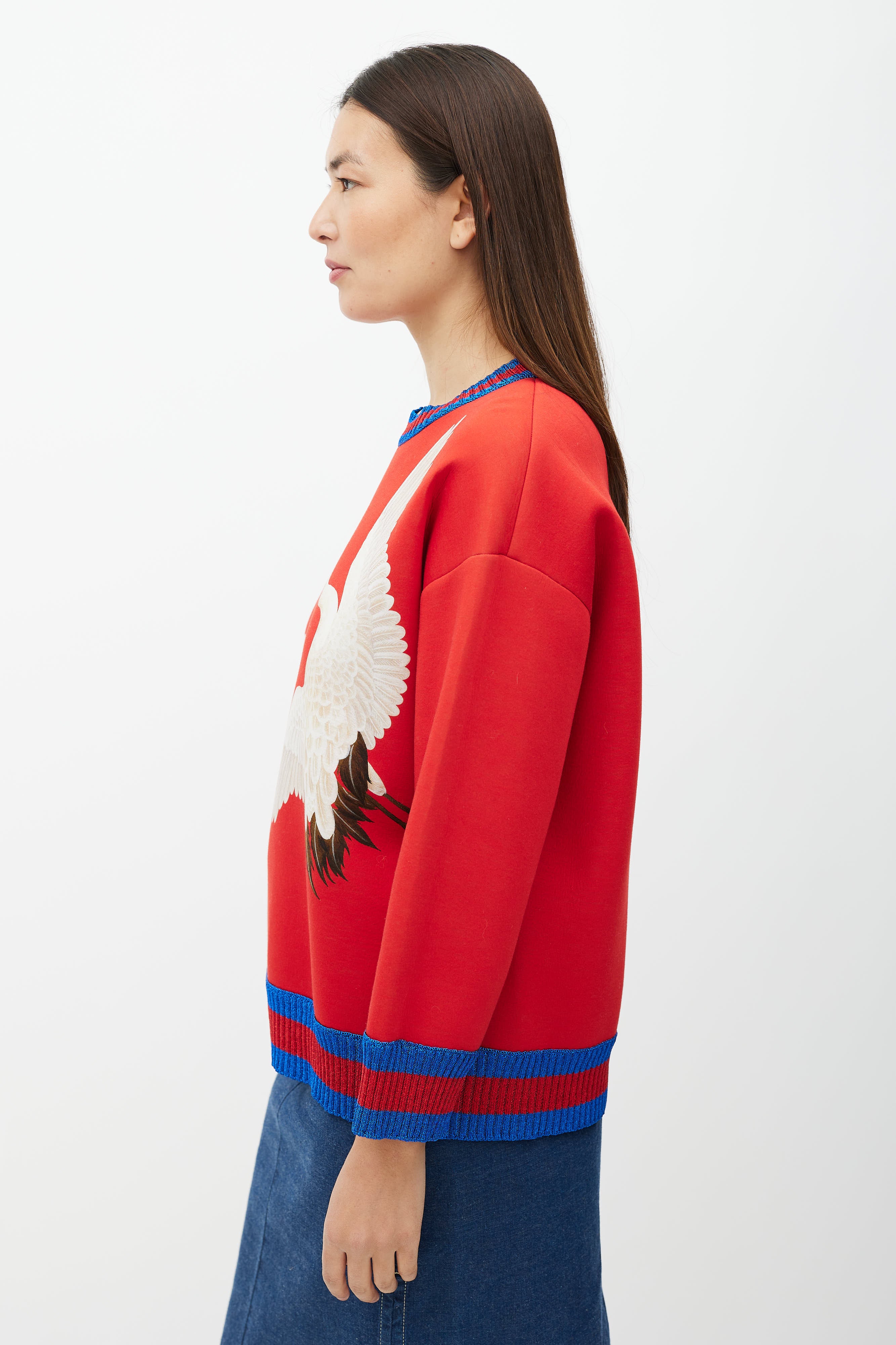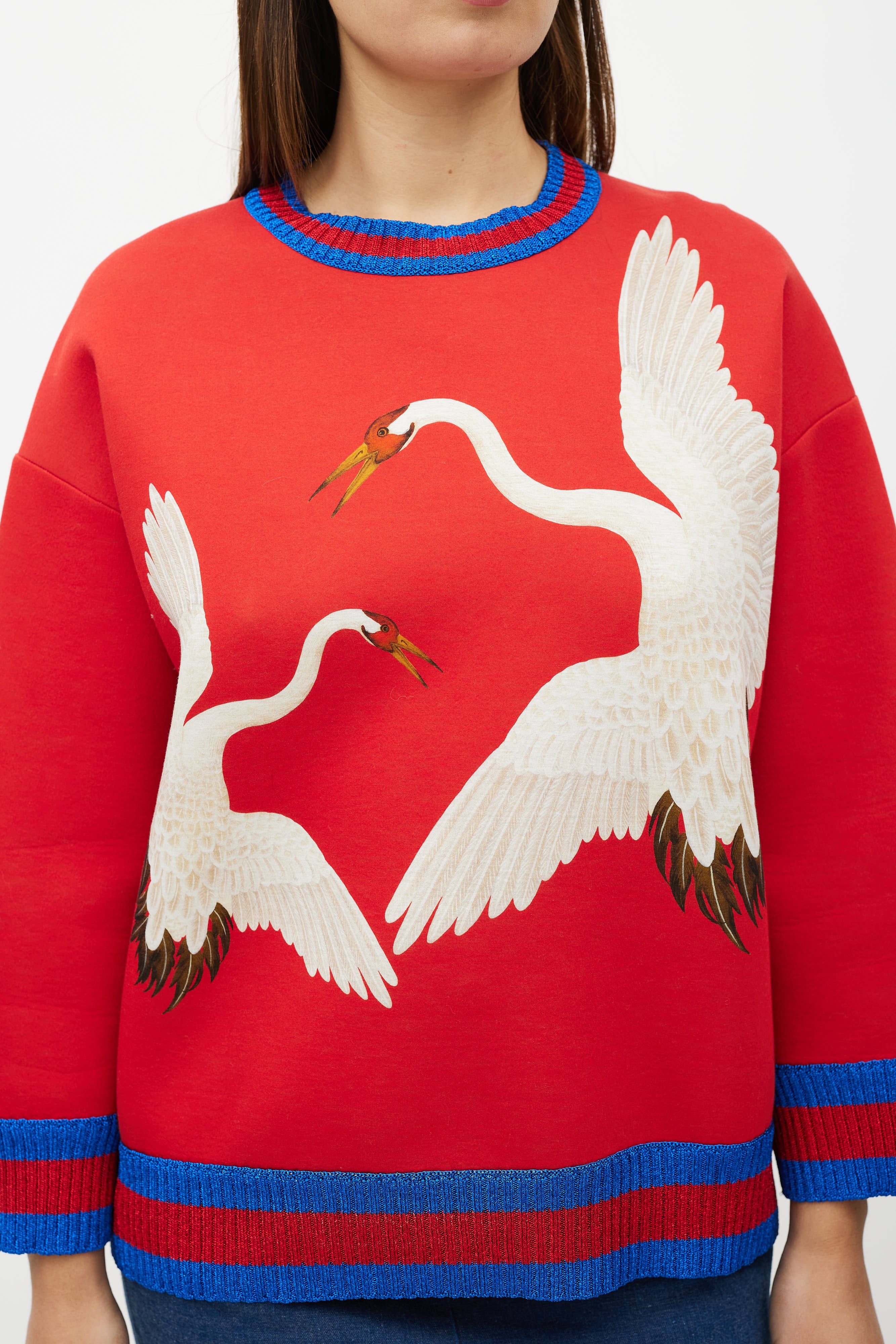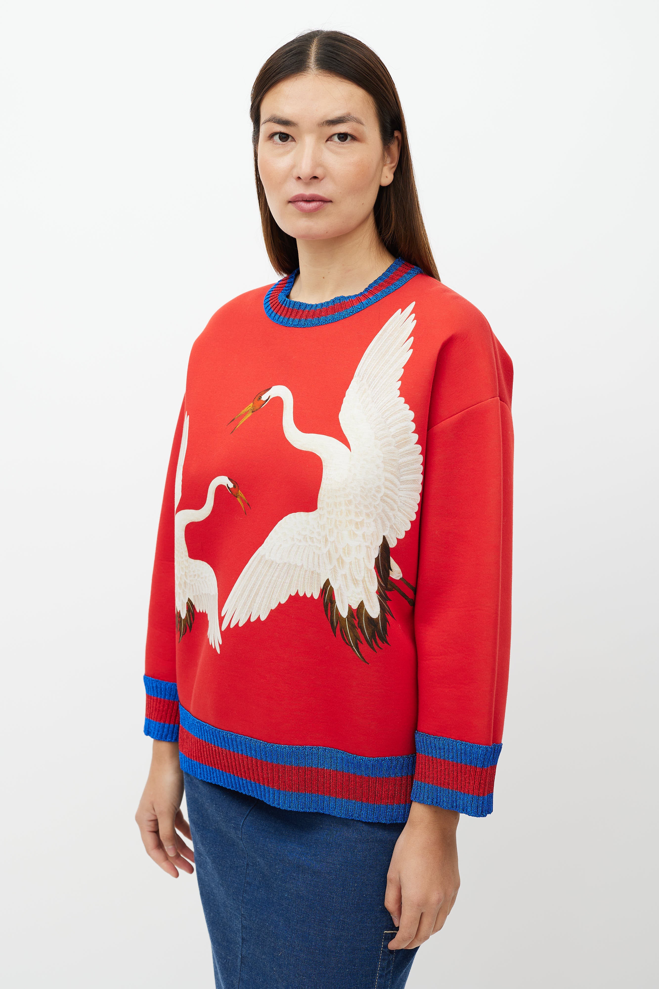 Pre-owned Gucci red neoprene sweatshirt featuring crane graphic at front, crew neckline and a sparkly blue and red stripe rib trim at neckline, hem, and cuffs.