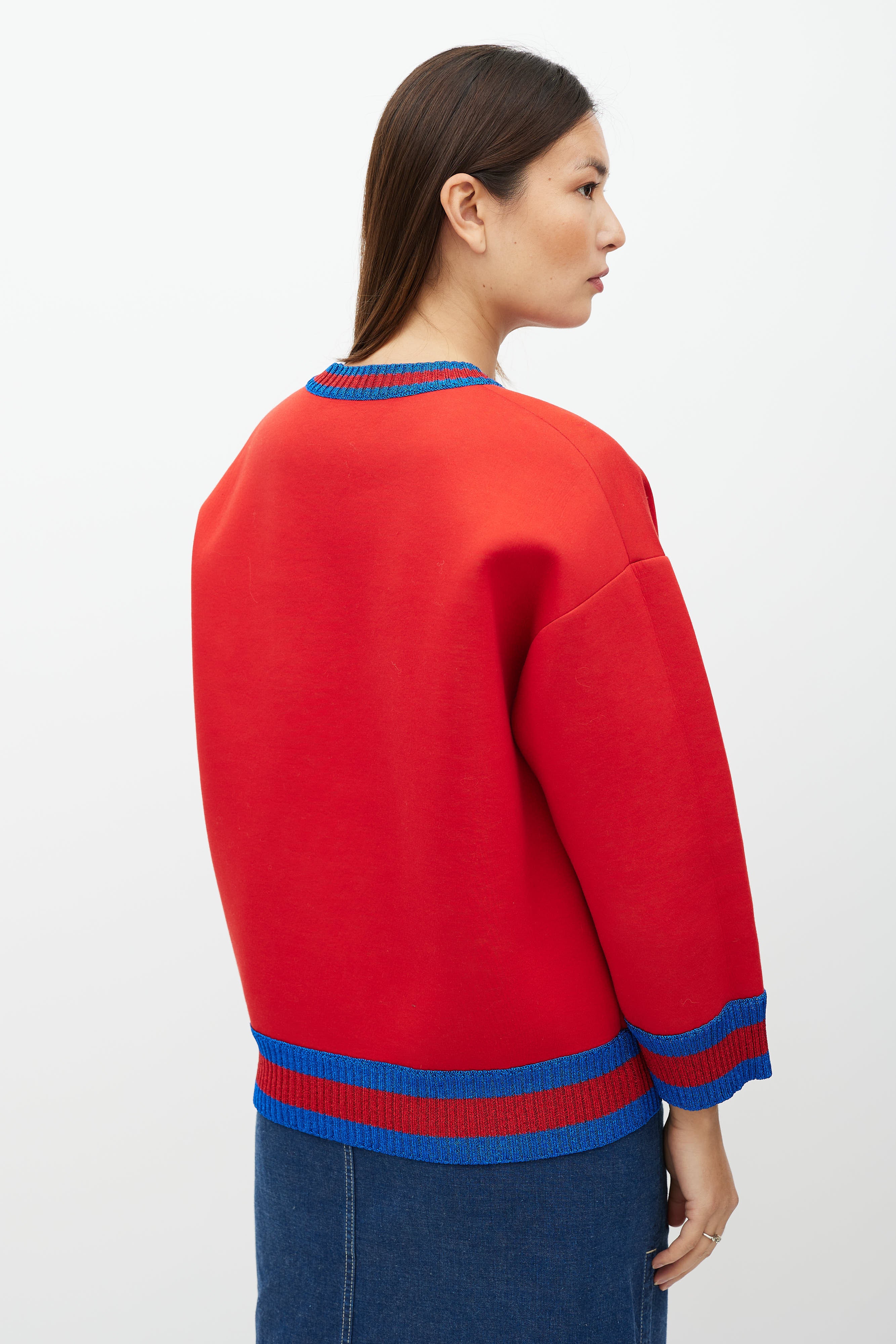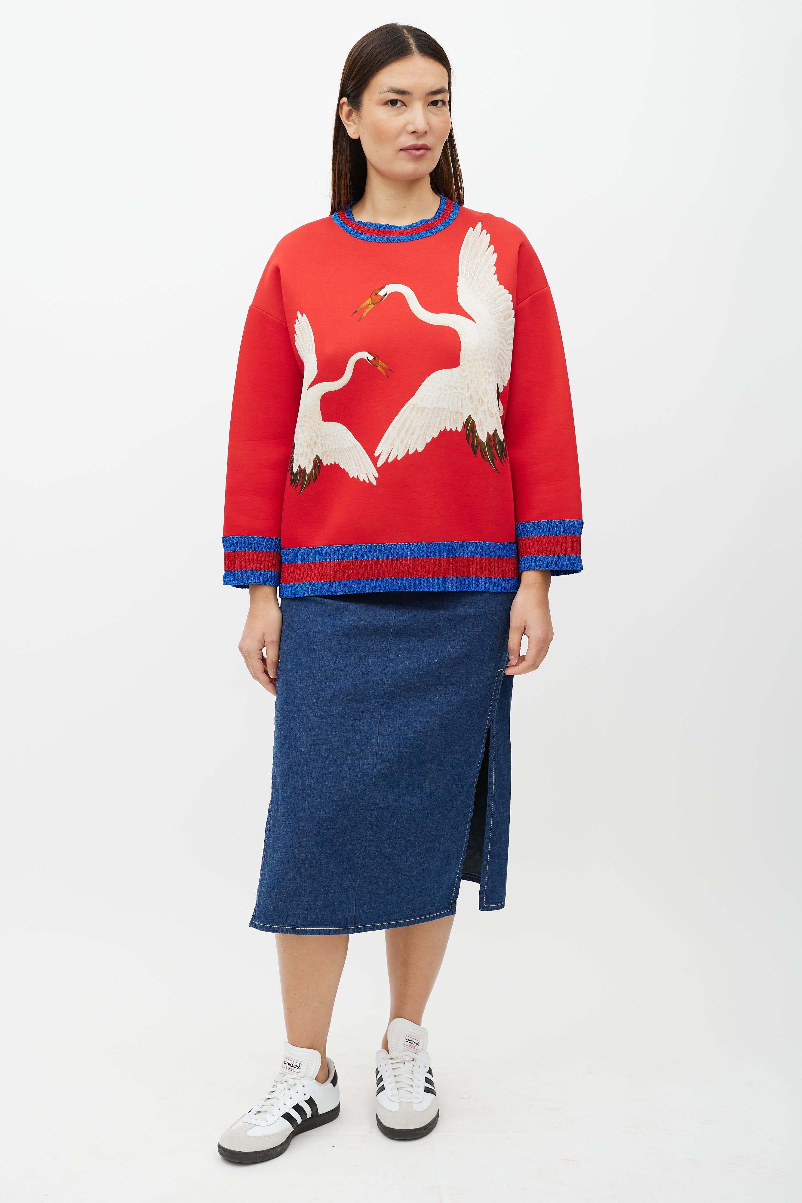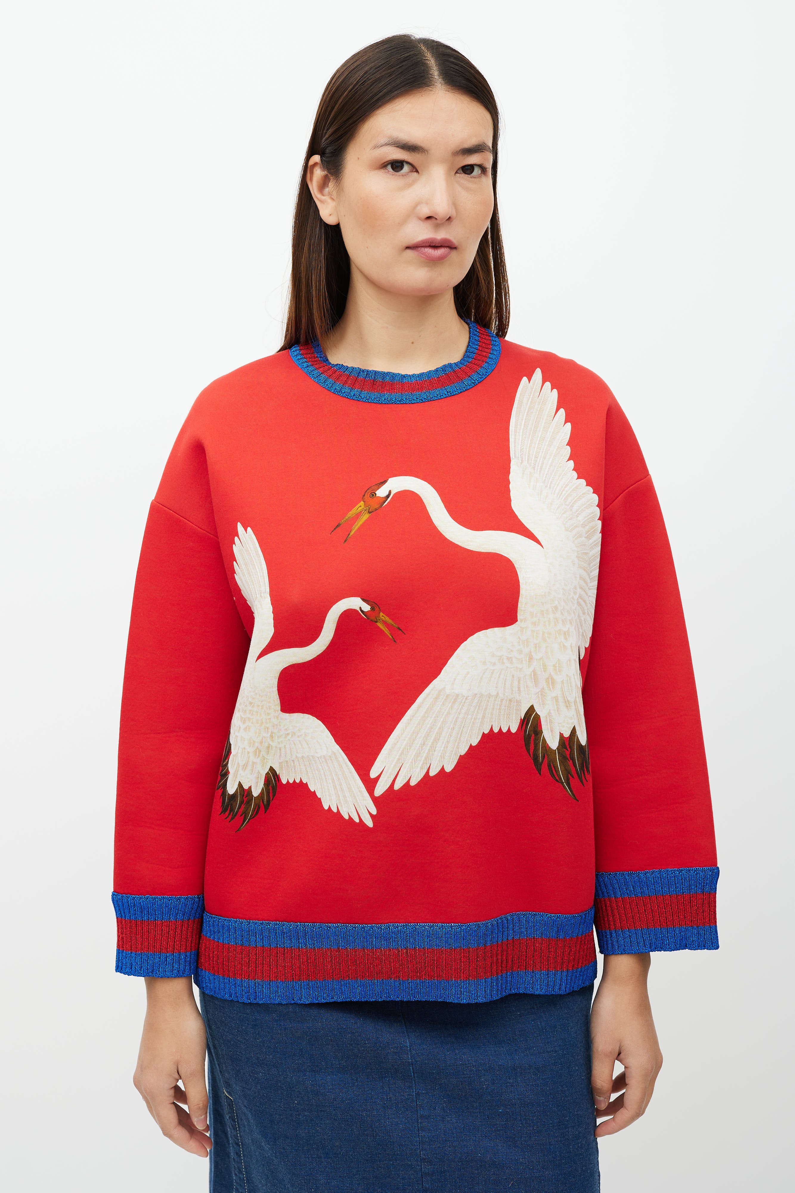 Pre-owned Gucci red neoprene sweatshirt featuring crane graphic at front, crew neckline and a sparkly blue and red stripe rib trim at neckline, hem, and cuffs.