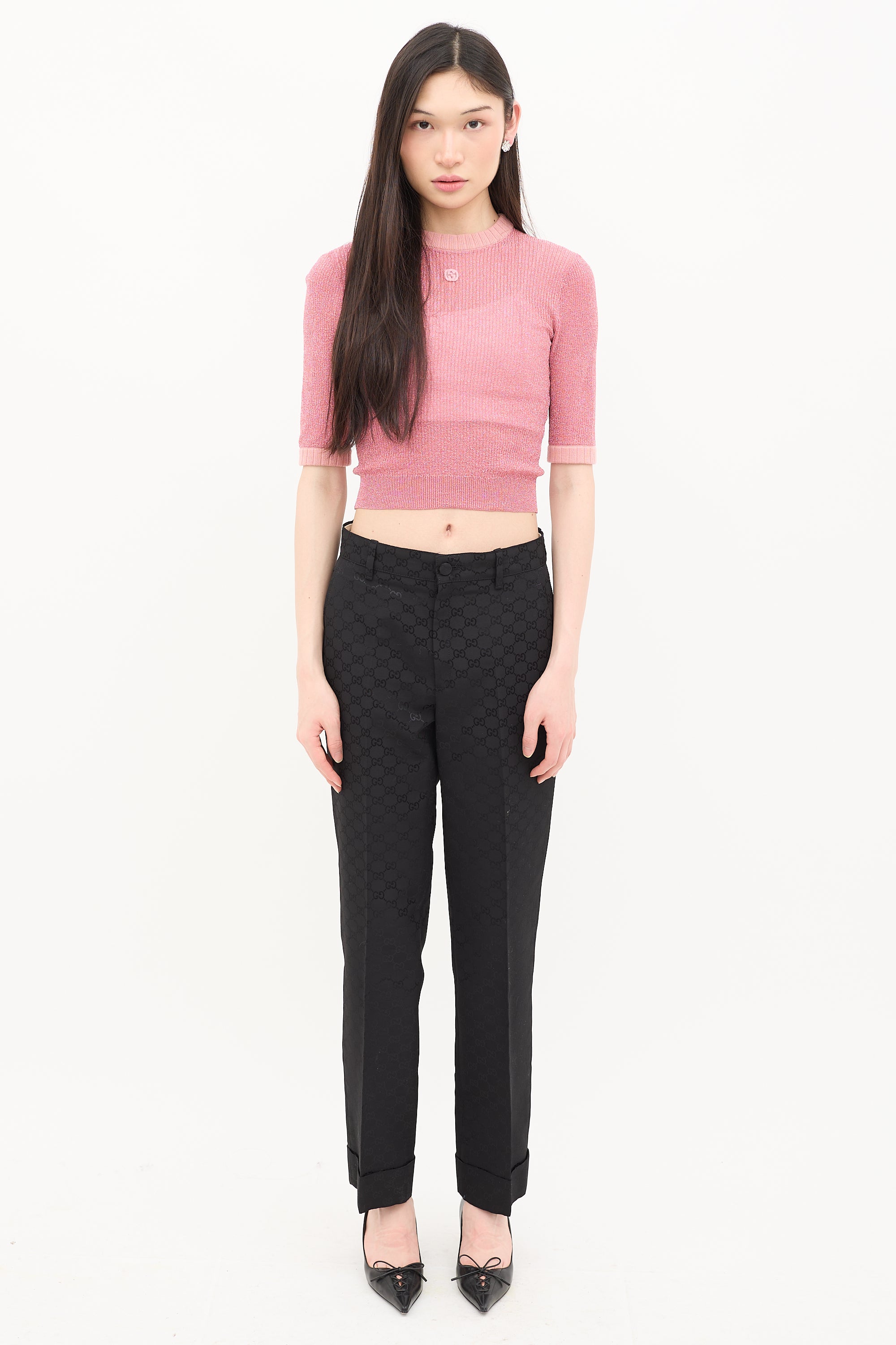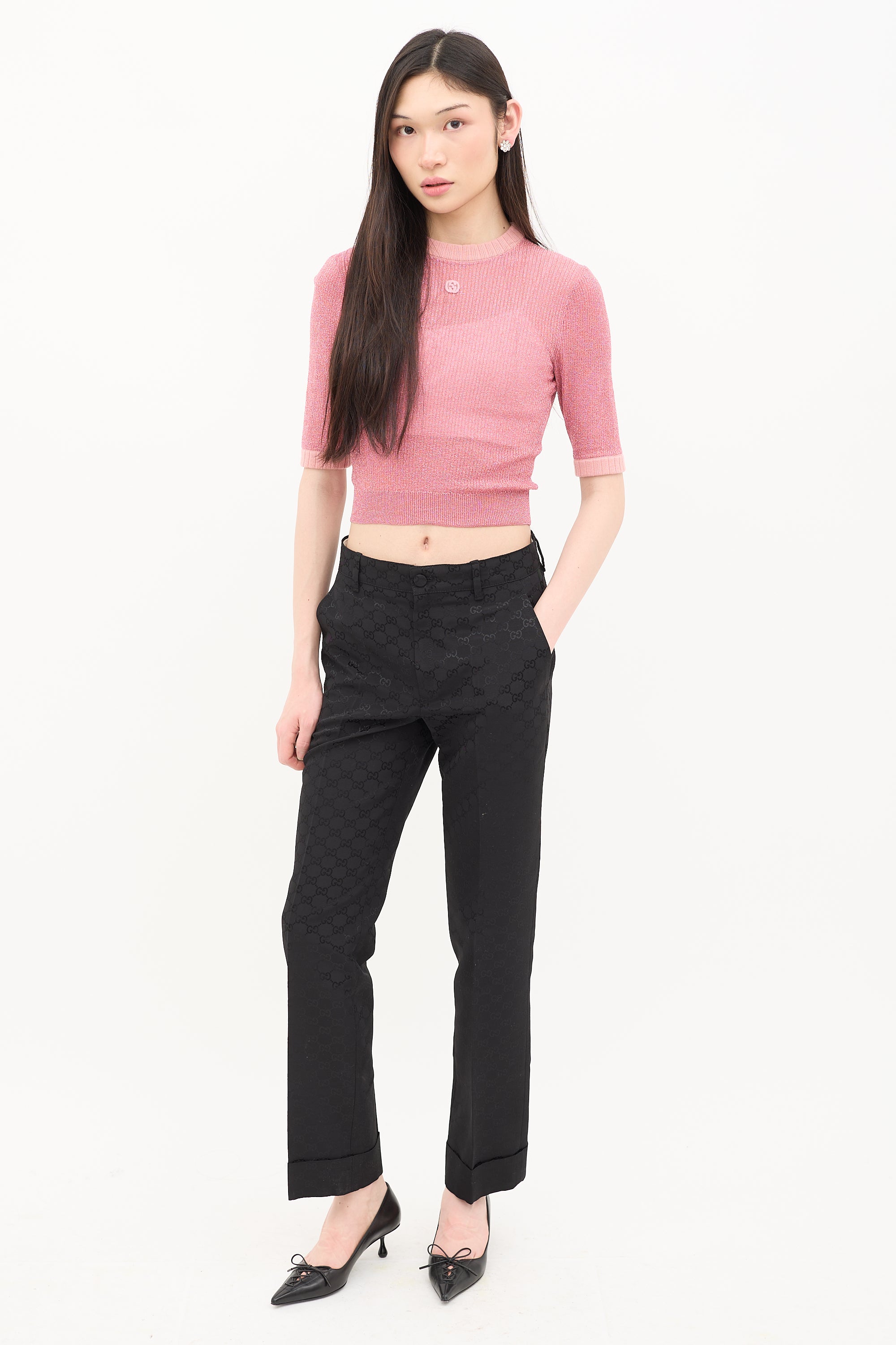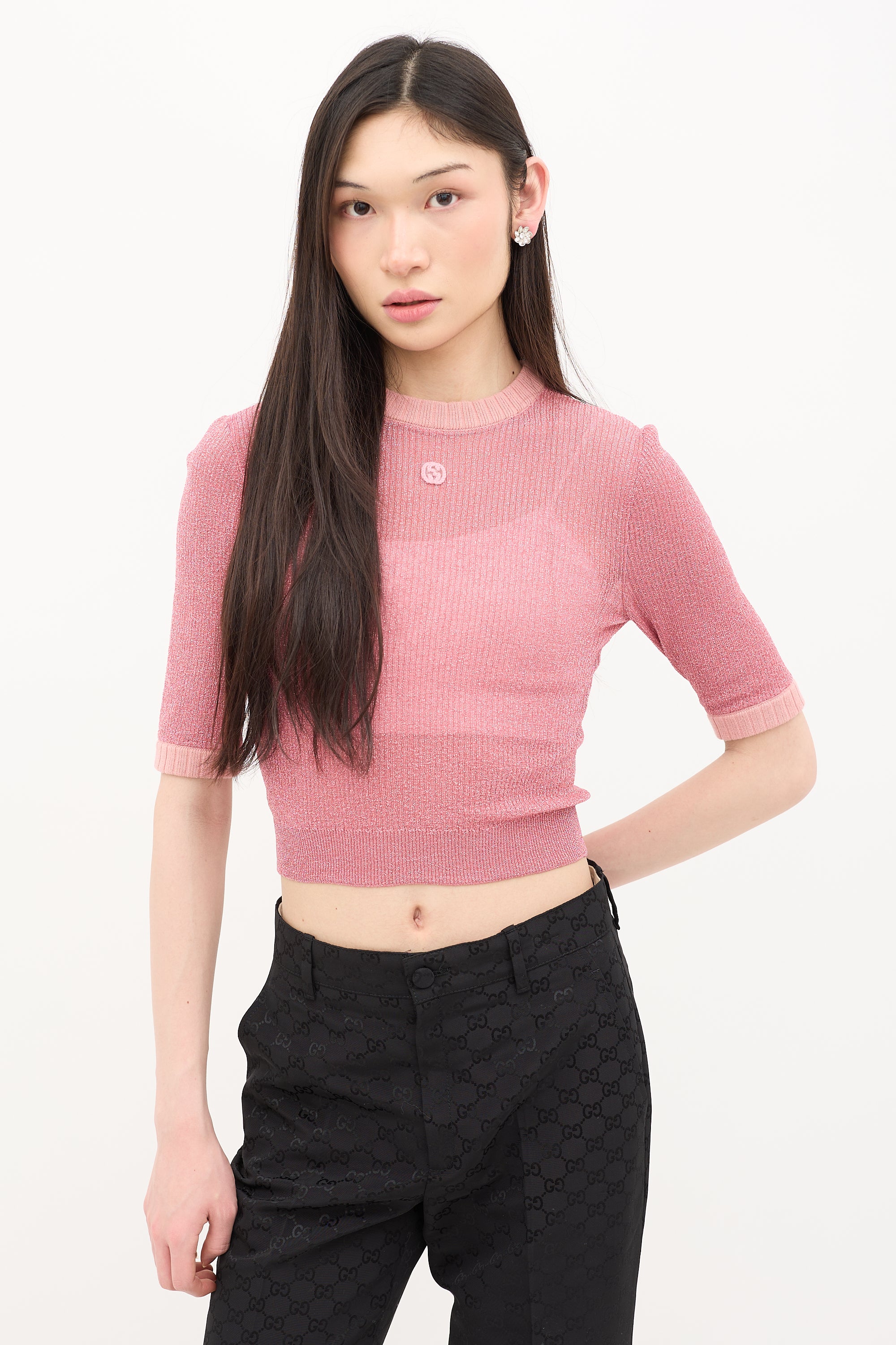 Pre-owned Gucci pink sparkly knit top featuring crew neck, interlocking GG patch at chest, and ribbed collar and cuffs.