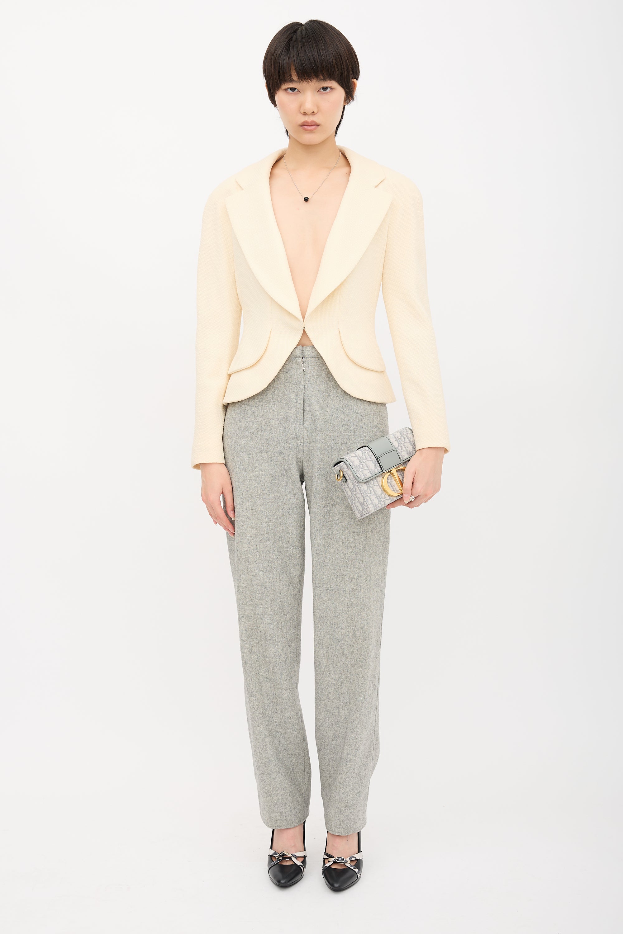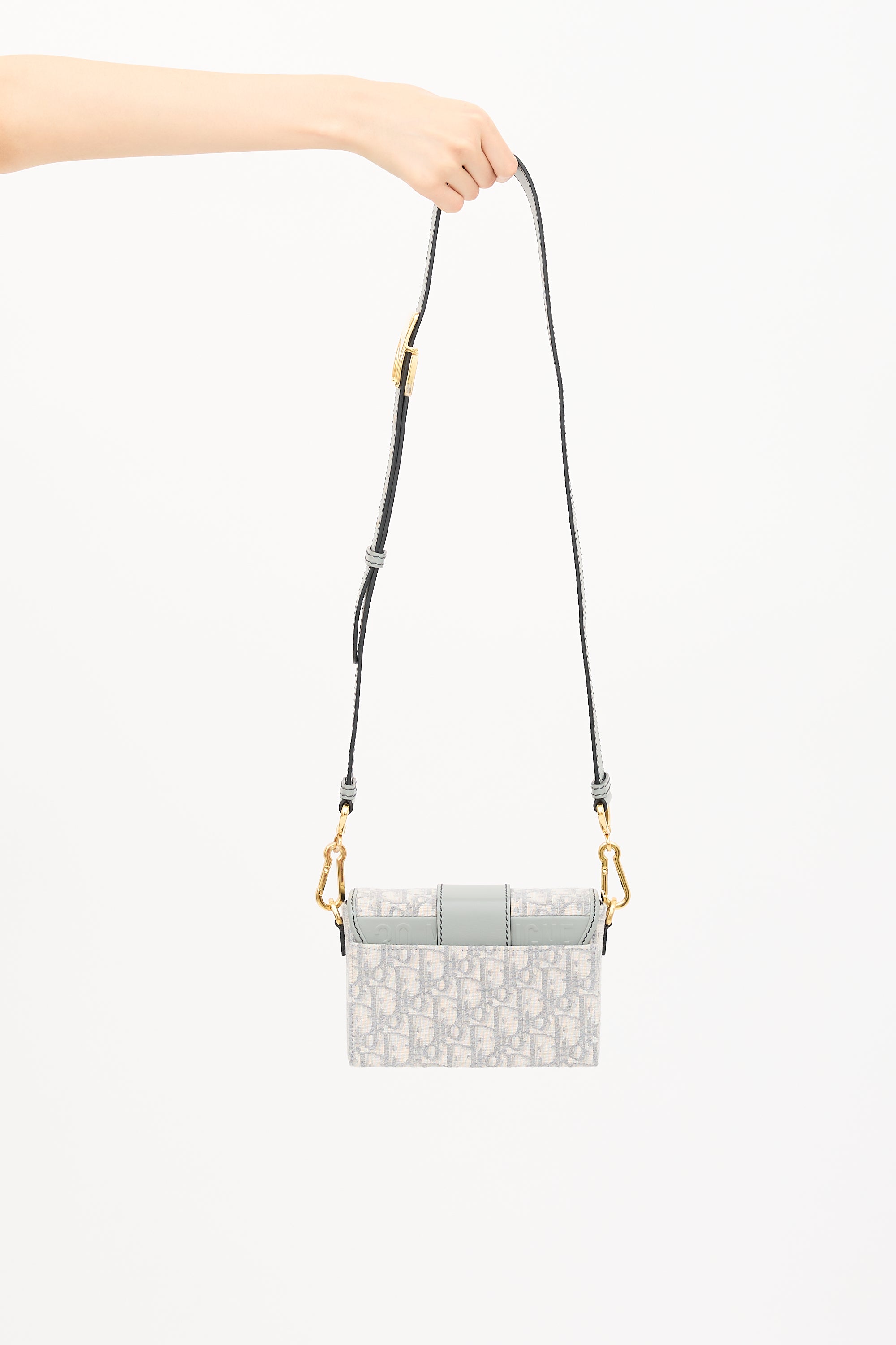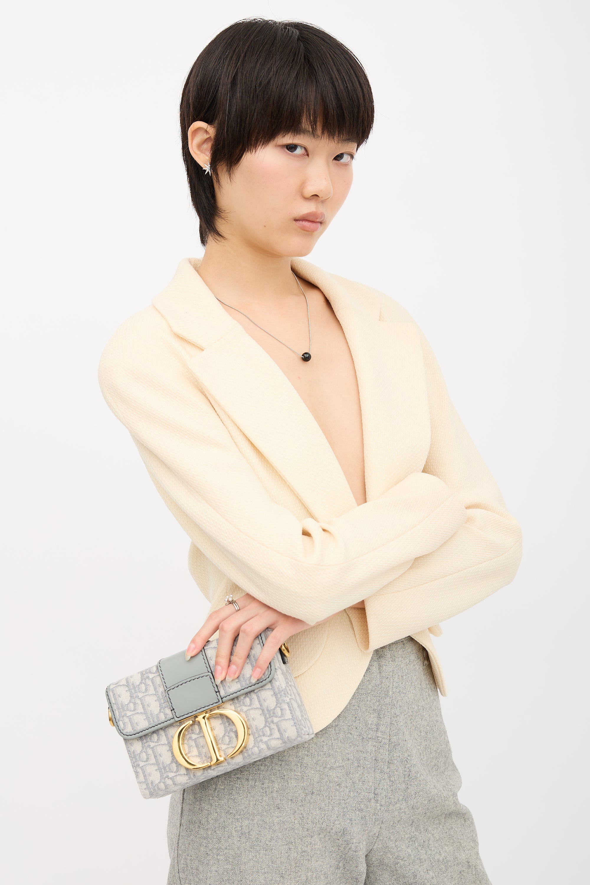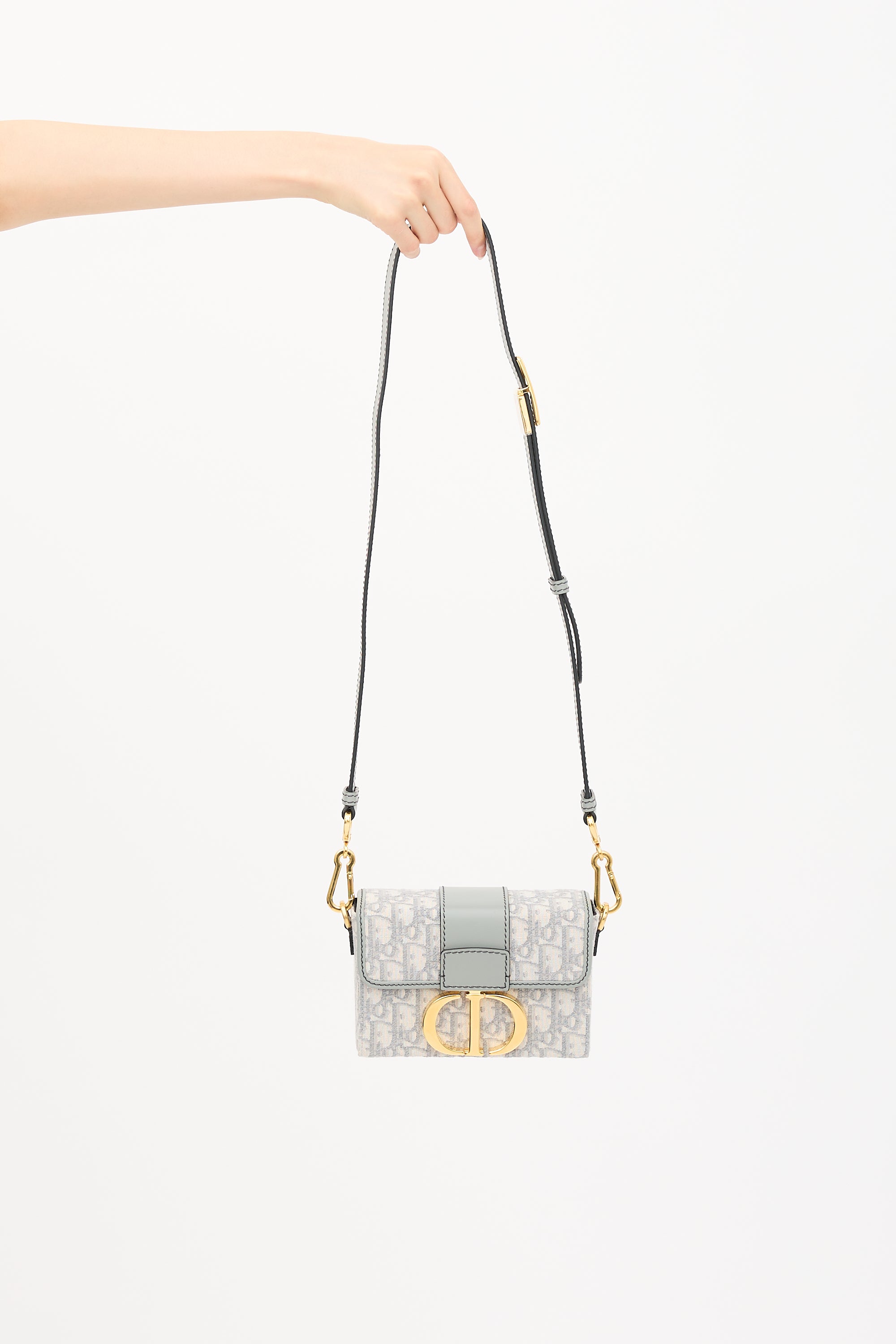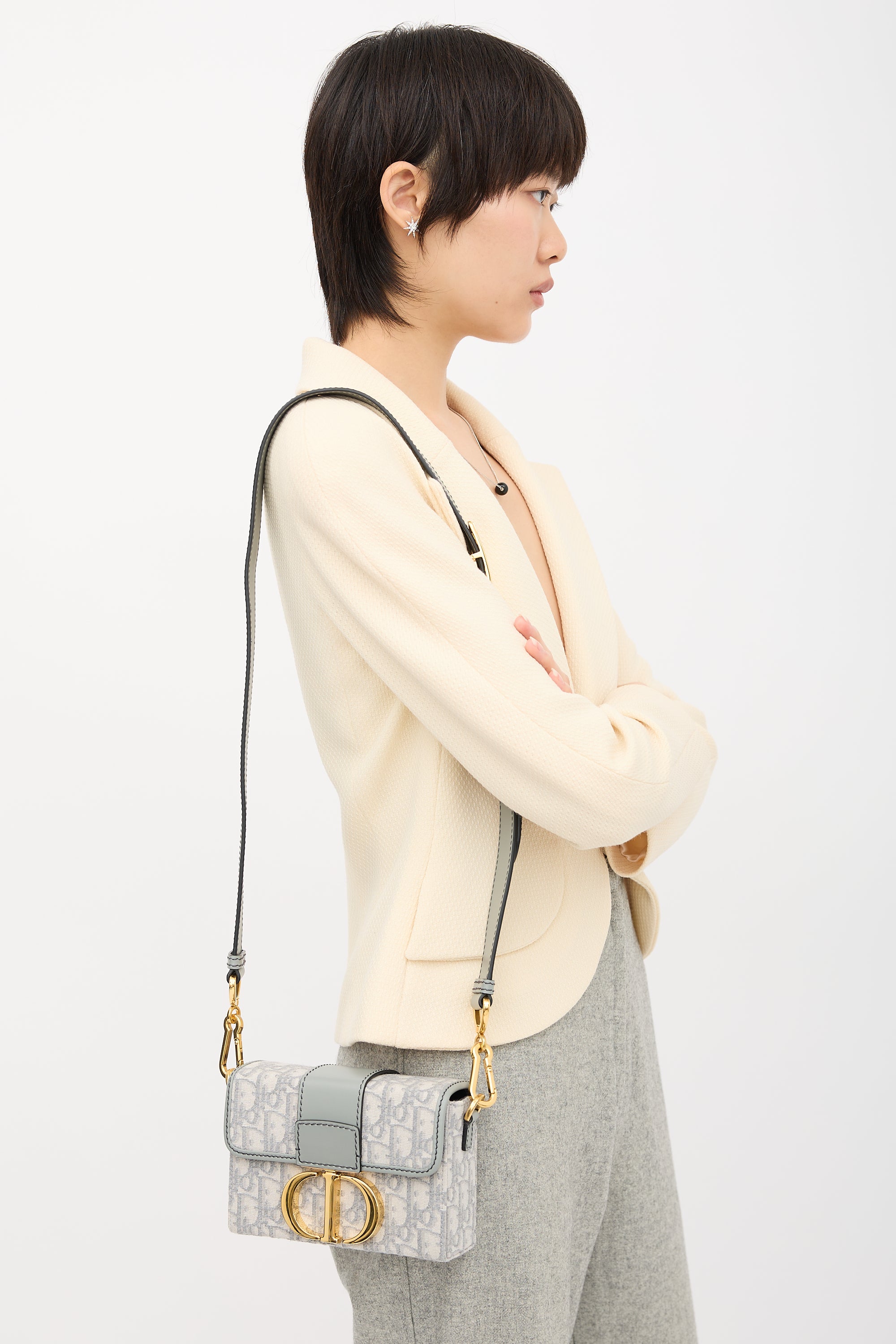 Pre-owned Christian Dior 2021 30 Montaigne crossbody bag featuring a signature grey Oblique jacquard, tonal leather trim, gold tone hardware, detachable and adjustable shoulder strap with debossed logo buckle, back slip pocket, front flap with CD push lock closure, and one lined main compartment with one slip pocket. Comes with original dust bag.