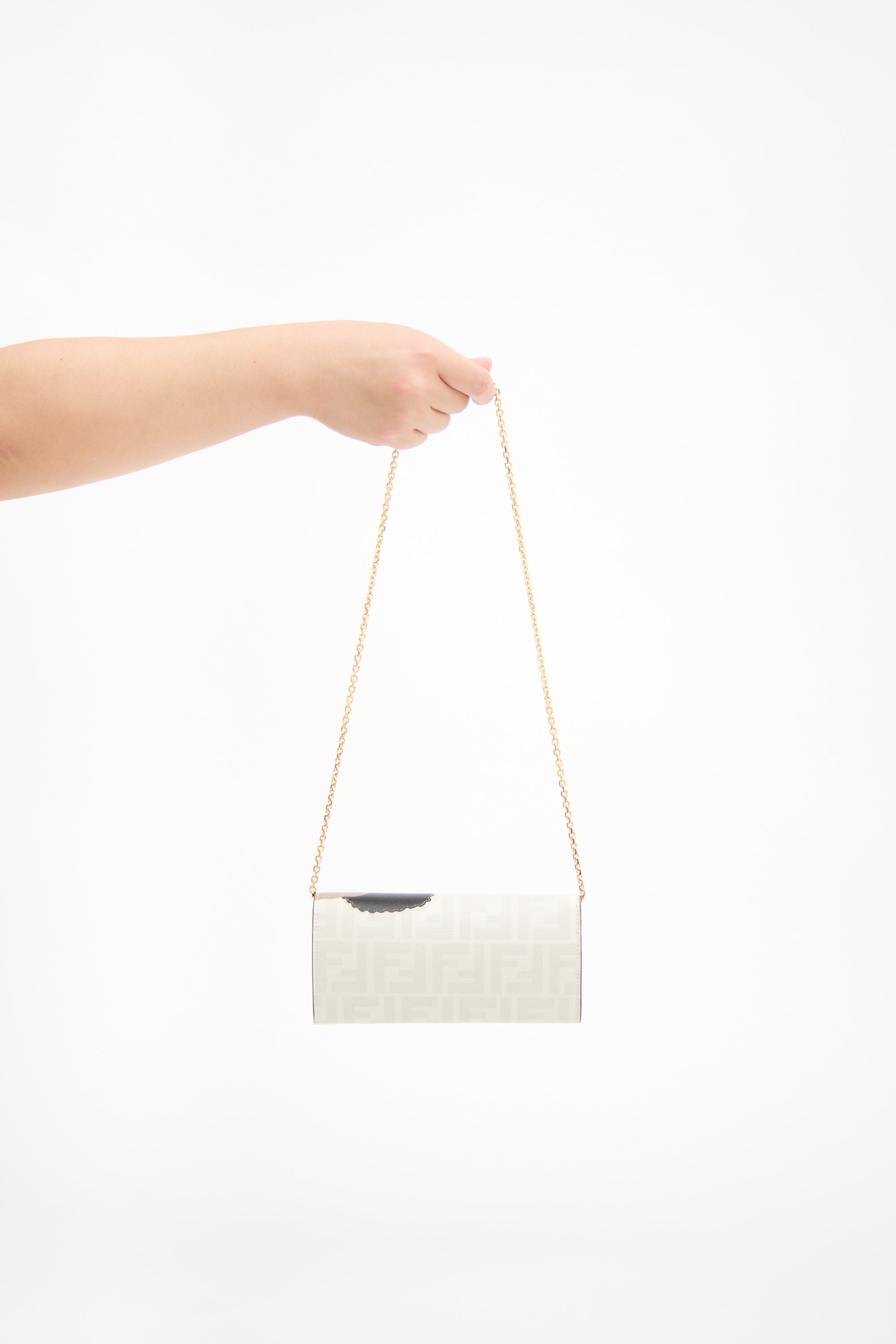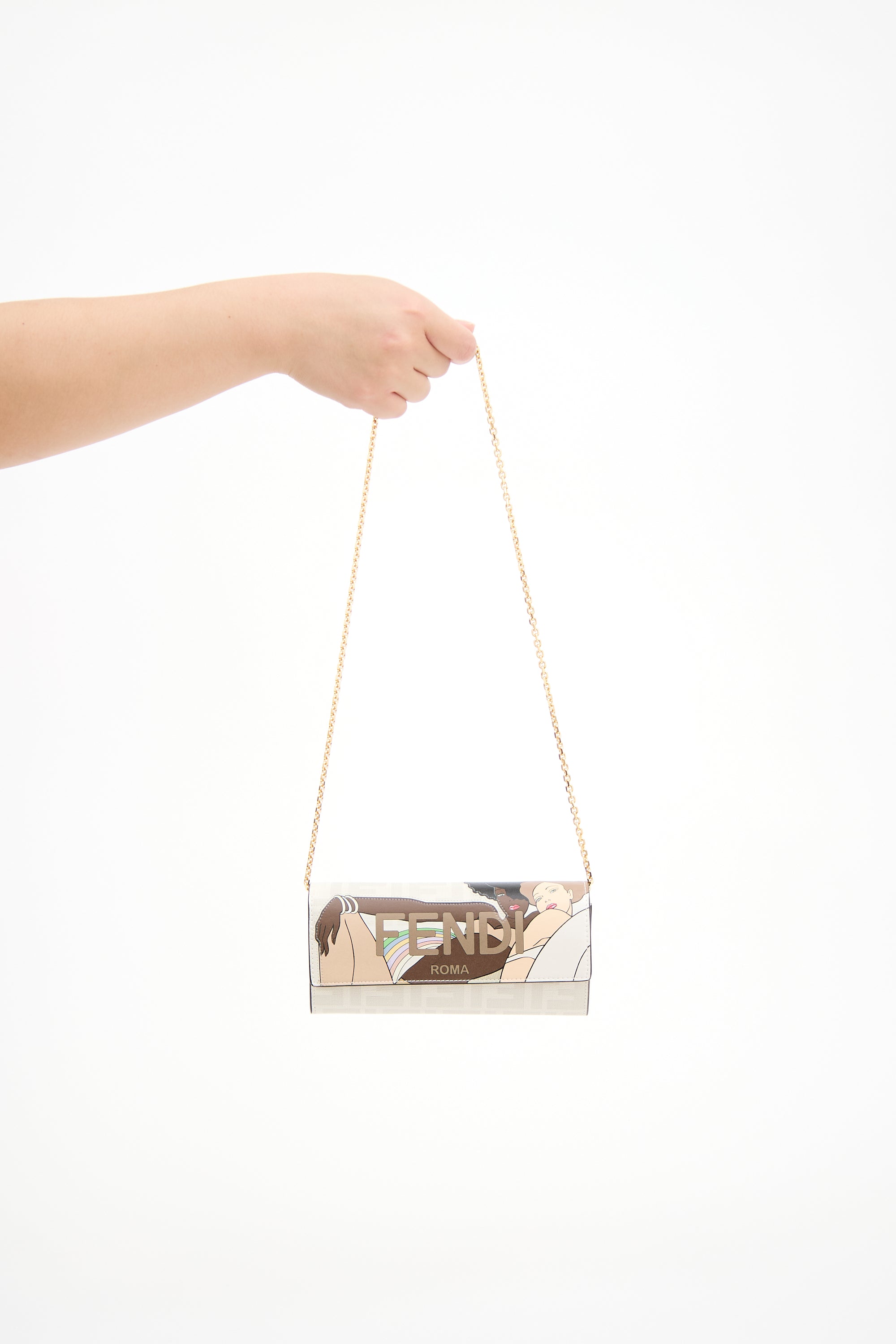 Pre-owned Fendi x Antonio Lopez cream leather wallet on chain featuring Bikini Girls print, FF monogram, snap button closure, gold tone hardware, detachable chain strap, and interior compartments include two bill pockets, one zip pocket, four slip pockets, and 12 card slots. Includes original dust bag.
