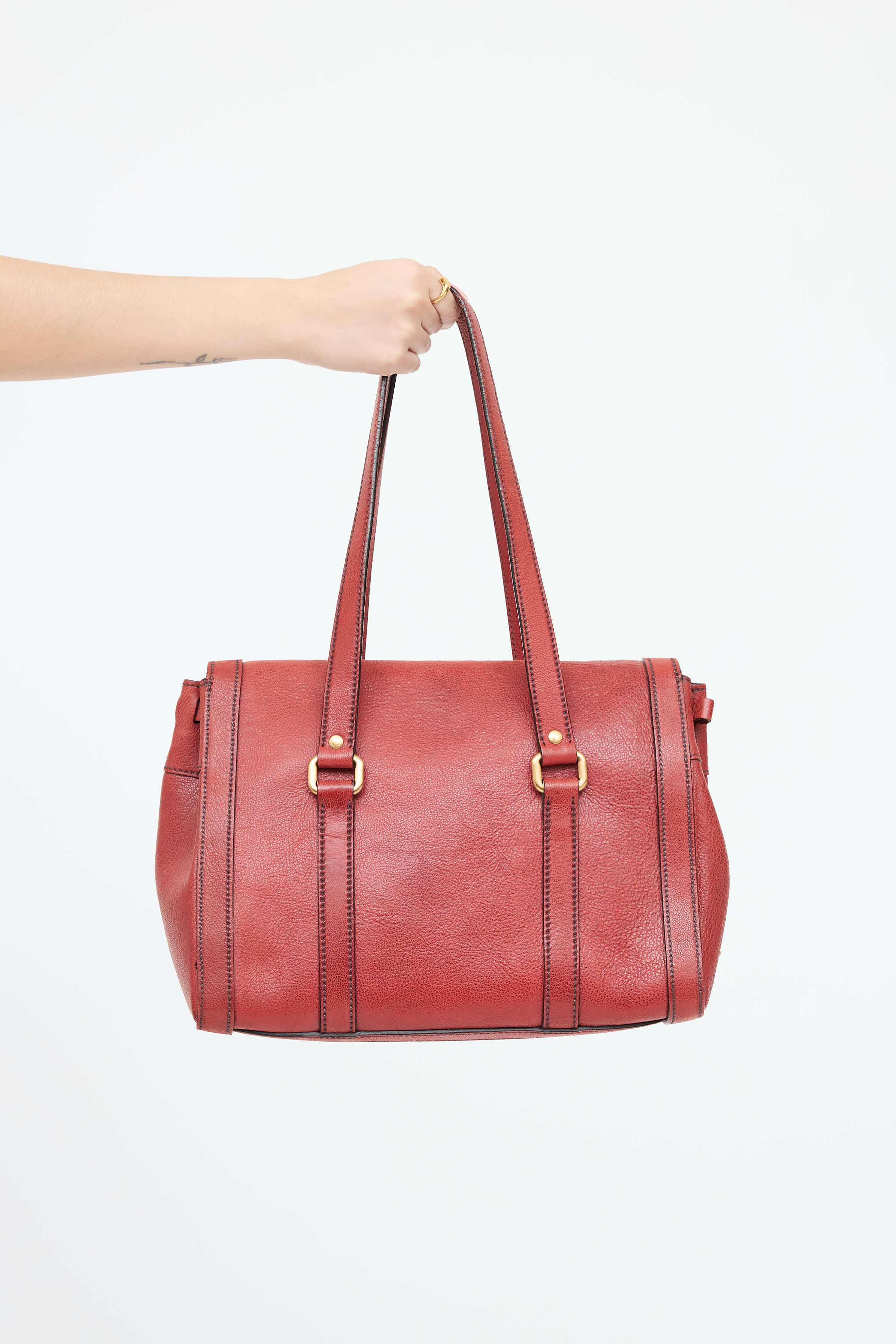 Pre-owned Prada red satchel bag featuring dual flat top handles, gold tone hardware, adjustable cinched sides, buckle details throughout, push lock closure with debossed logo, metal logo plaque at side, top flap with one main compartment, and one zip pocket.