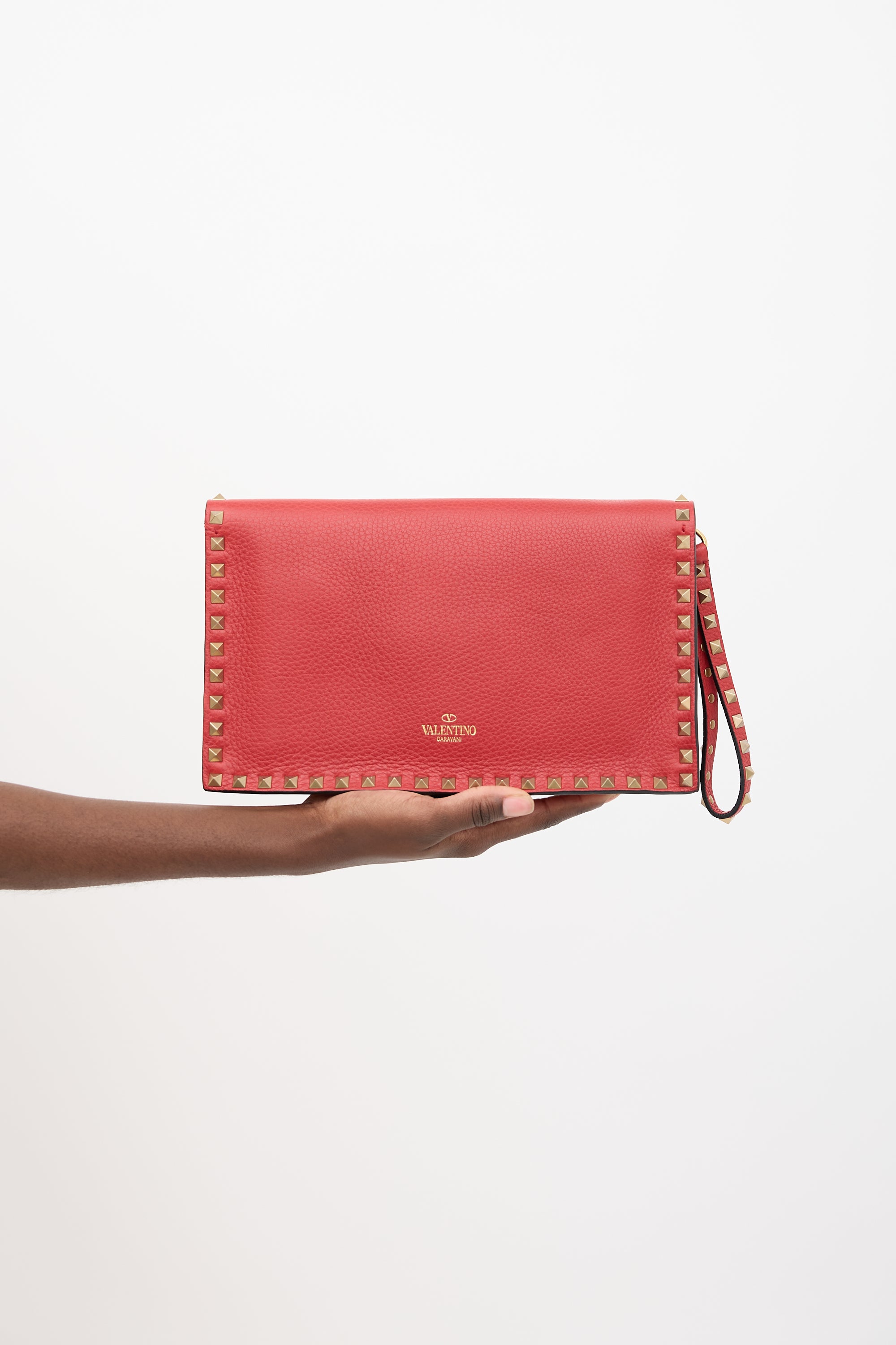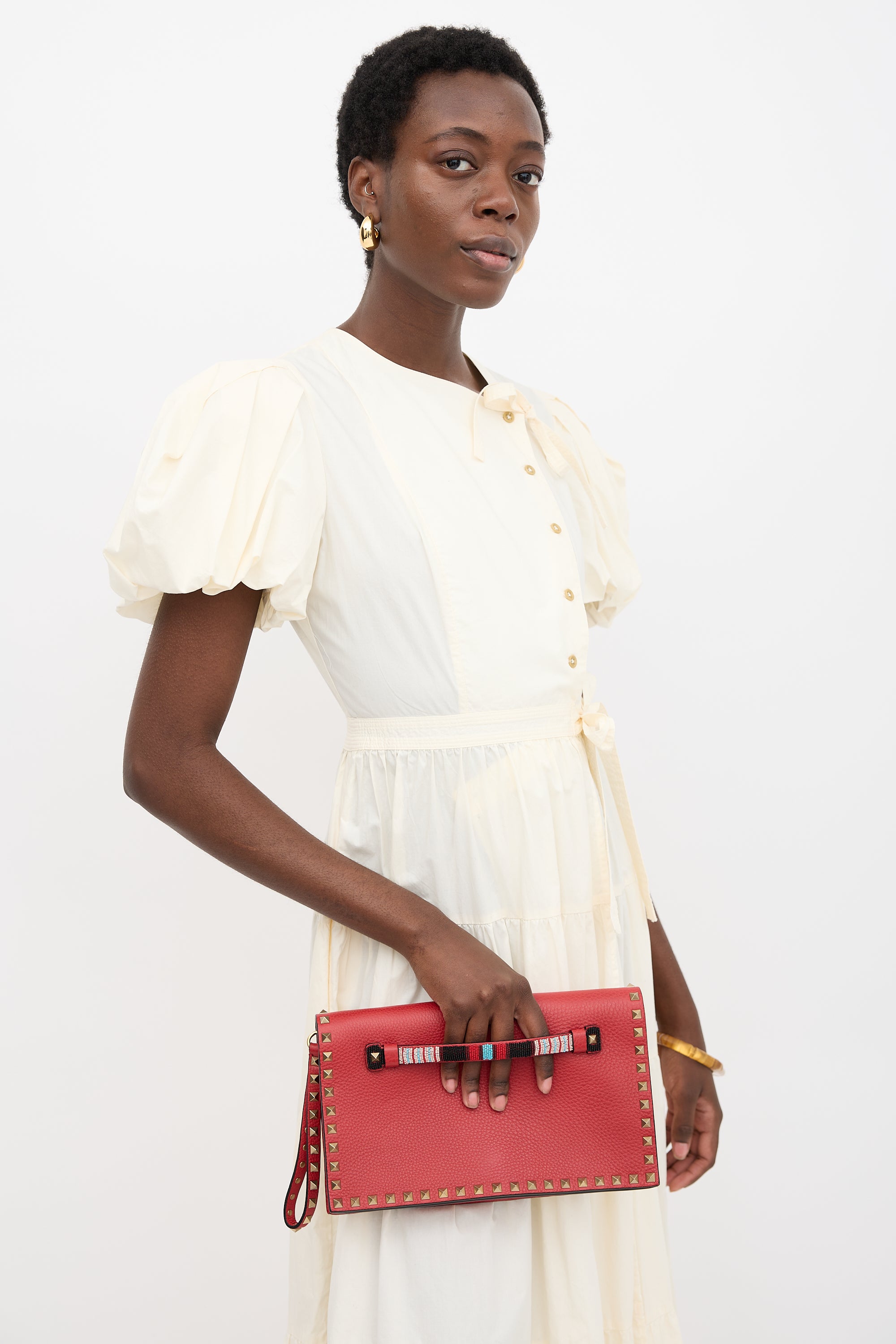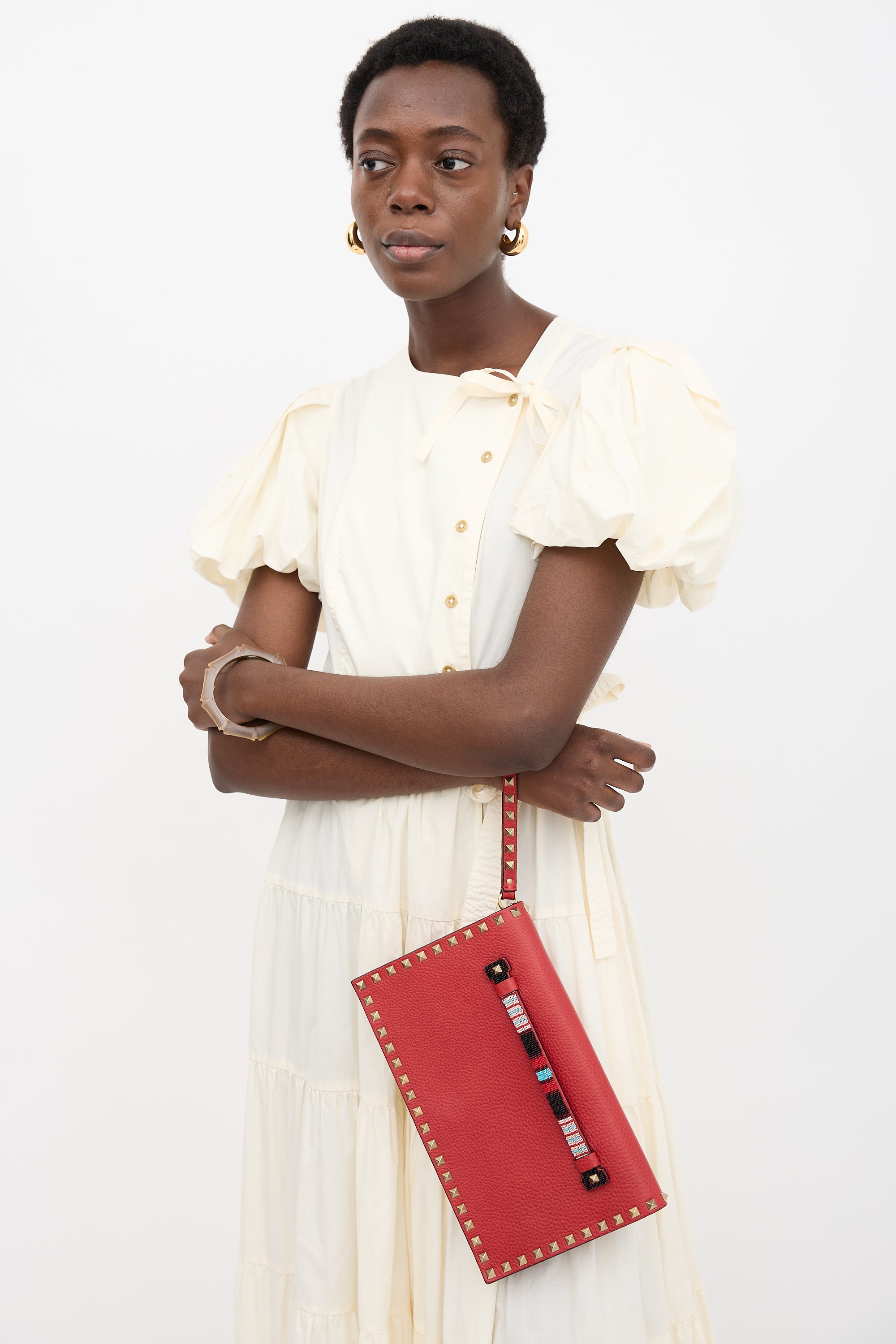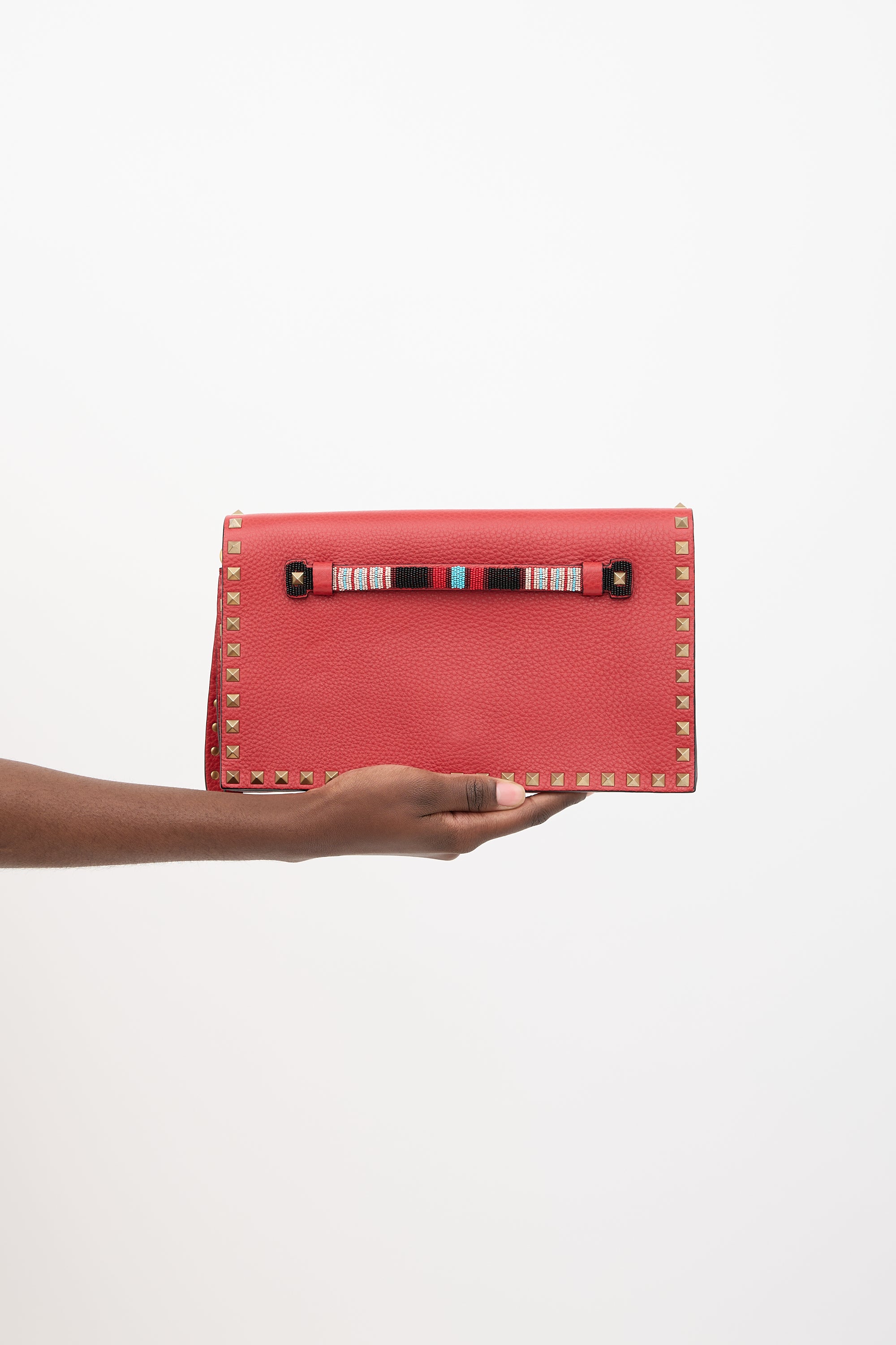 Pre-owned Valentino red leather wristlet clutch featuring removable wrist strap, gold tone Rockstud trim, gold tone foil logo at bottom centre back, front flap with multicolour beaded strap, magnetic closure, and two lined main compartments with slip divider and one zip pocket.
