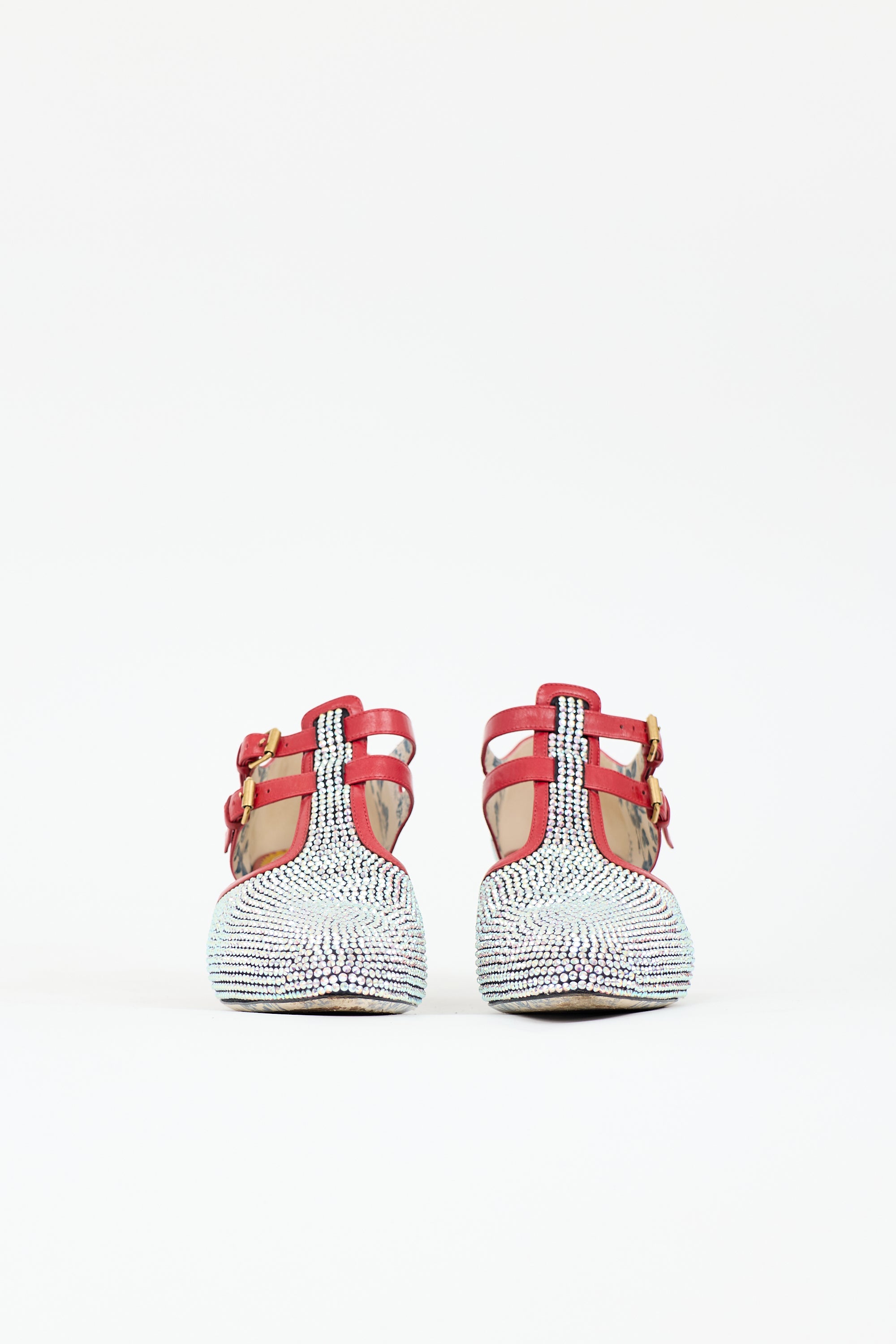 Pre-owned Gucci Mila heels featuring almond toe, silver tone crystal embellishment, floral printed insole, red leather trim, two buckled straps, and block kitten heel. Includes original dust bag and box.