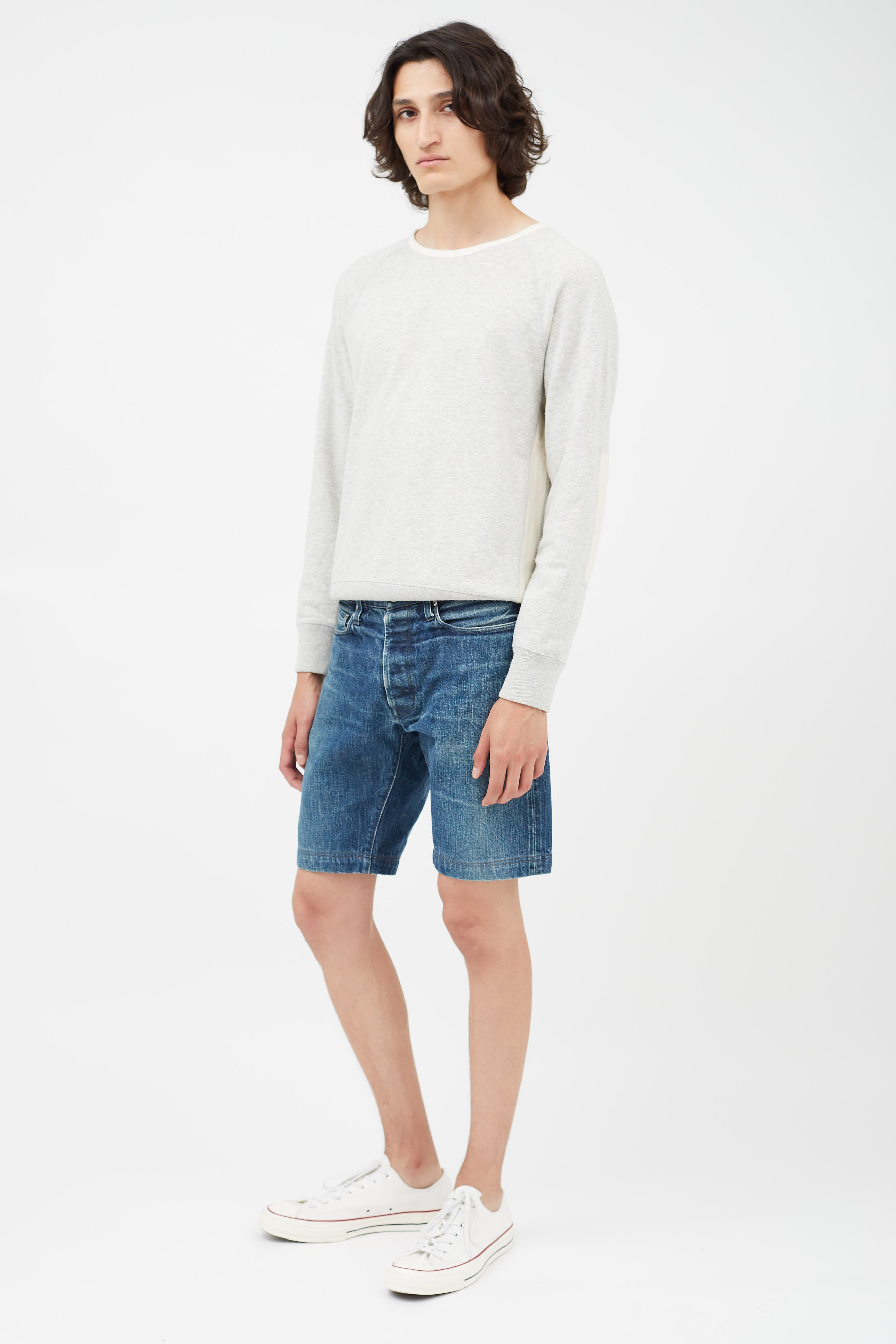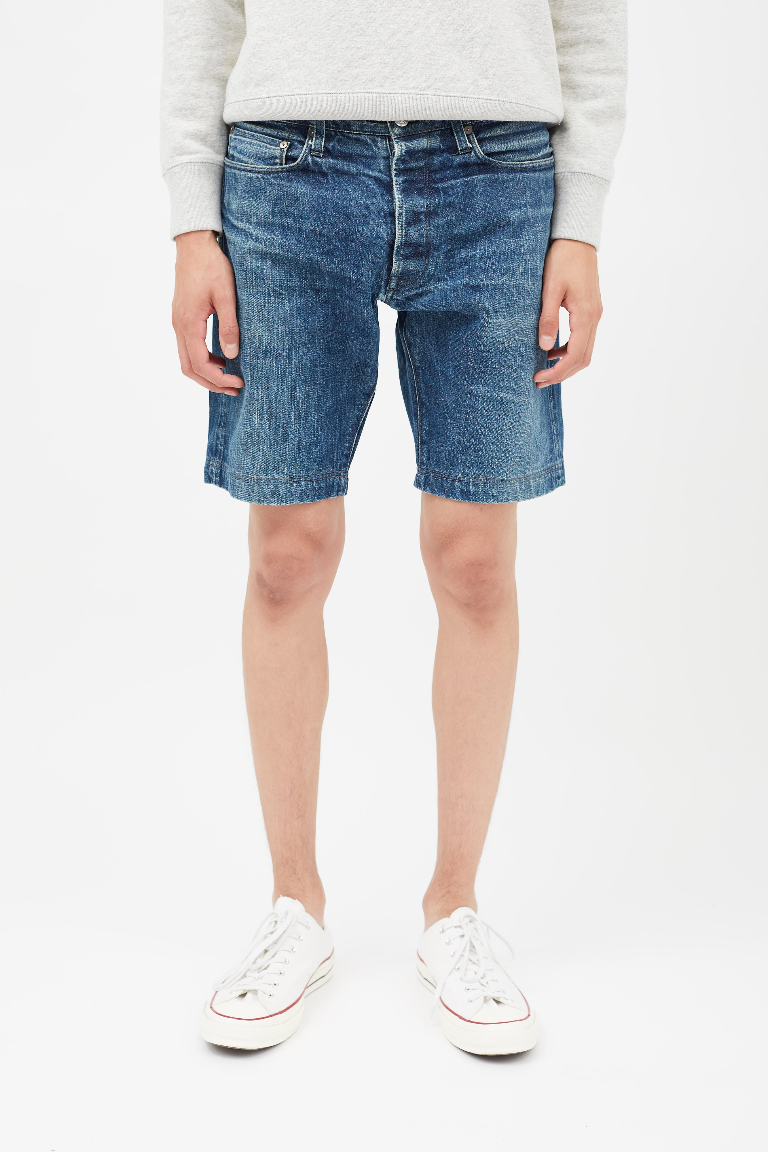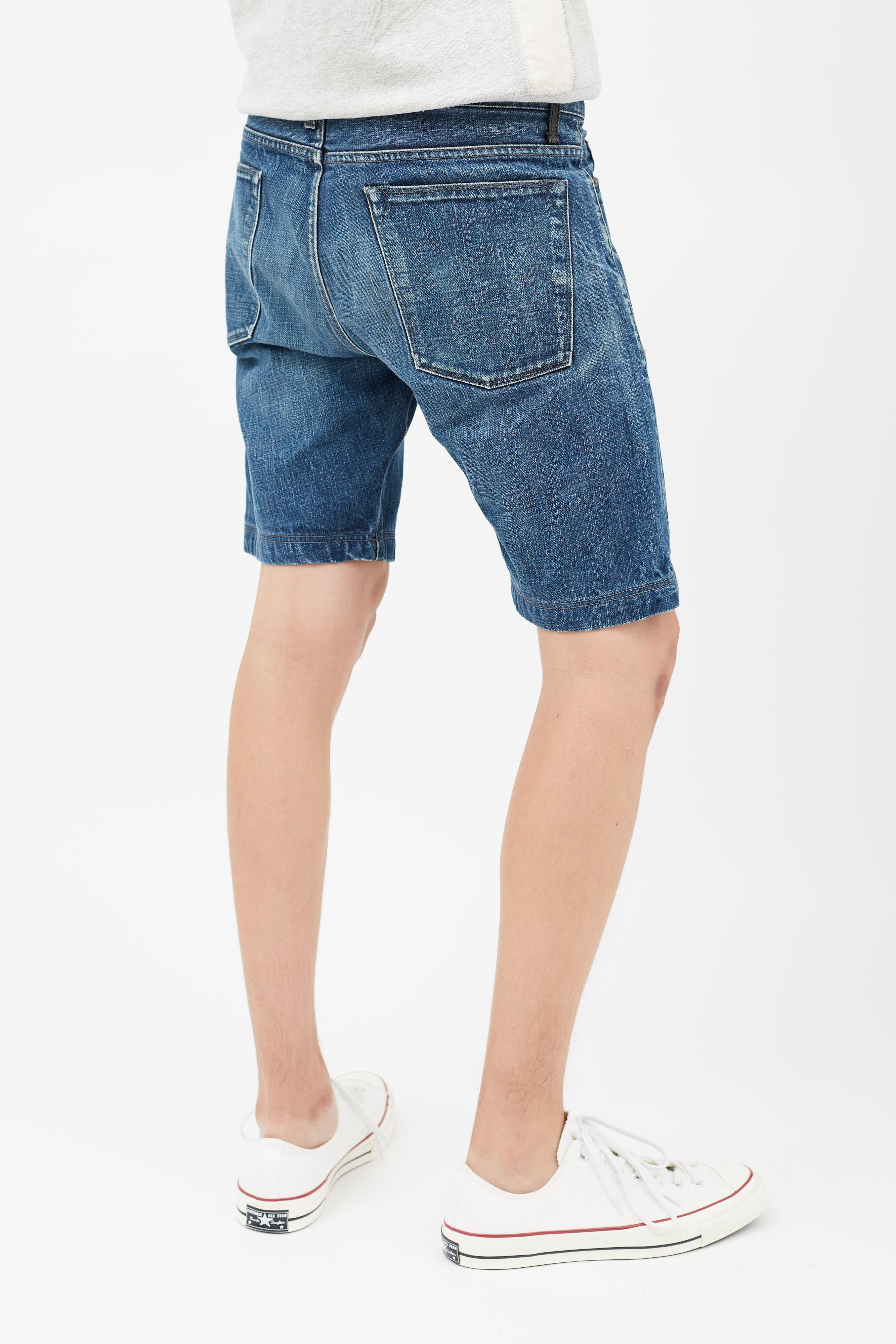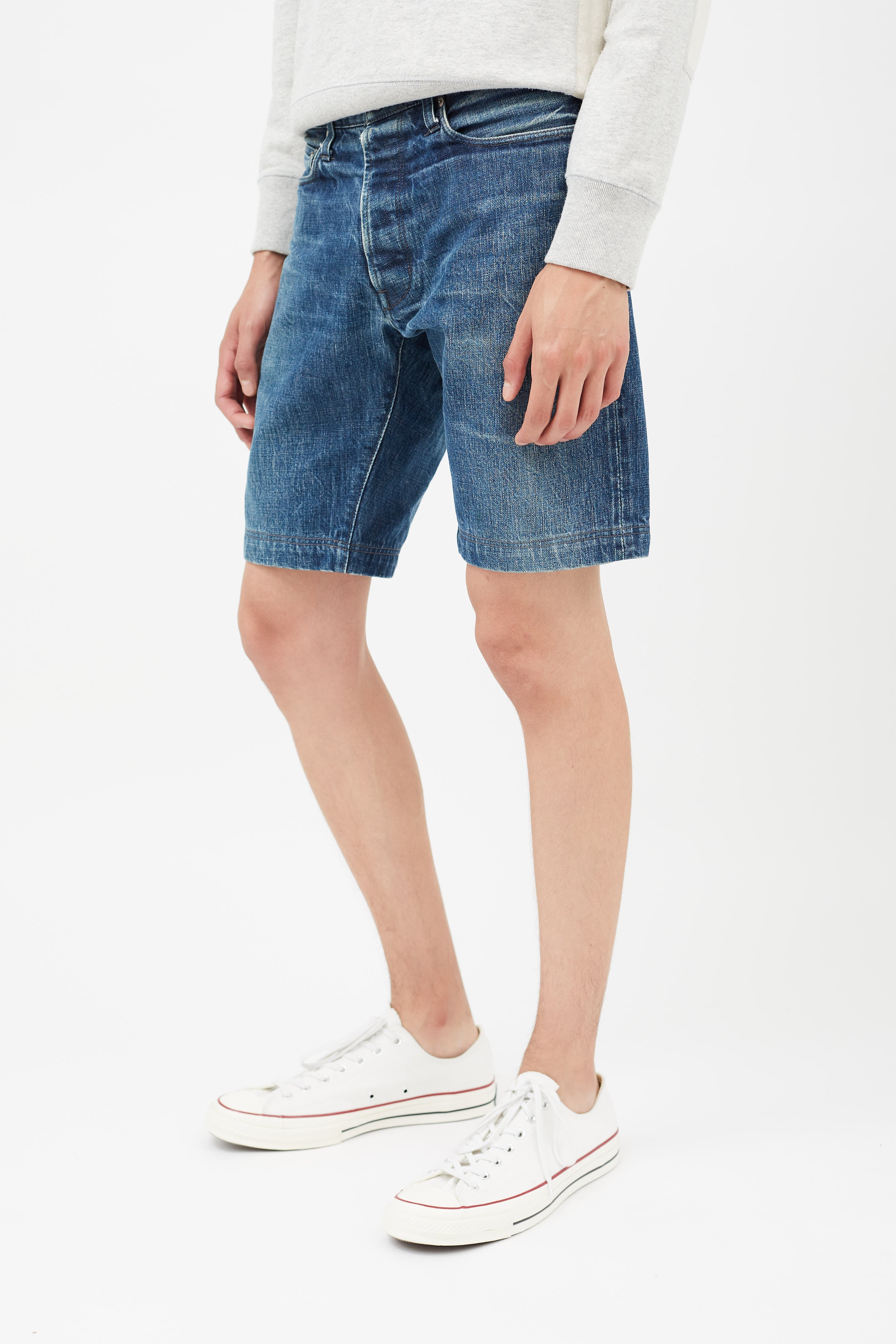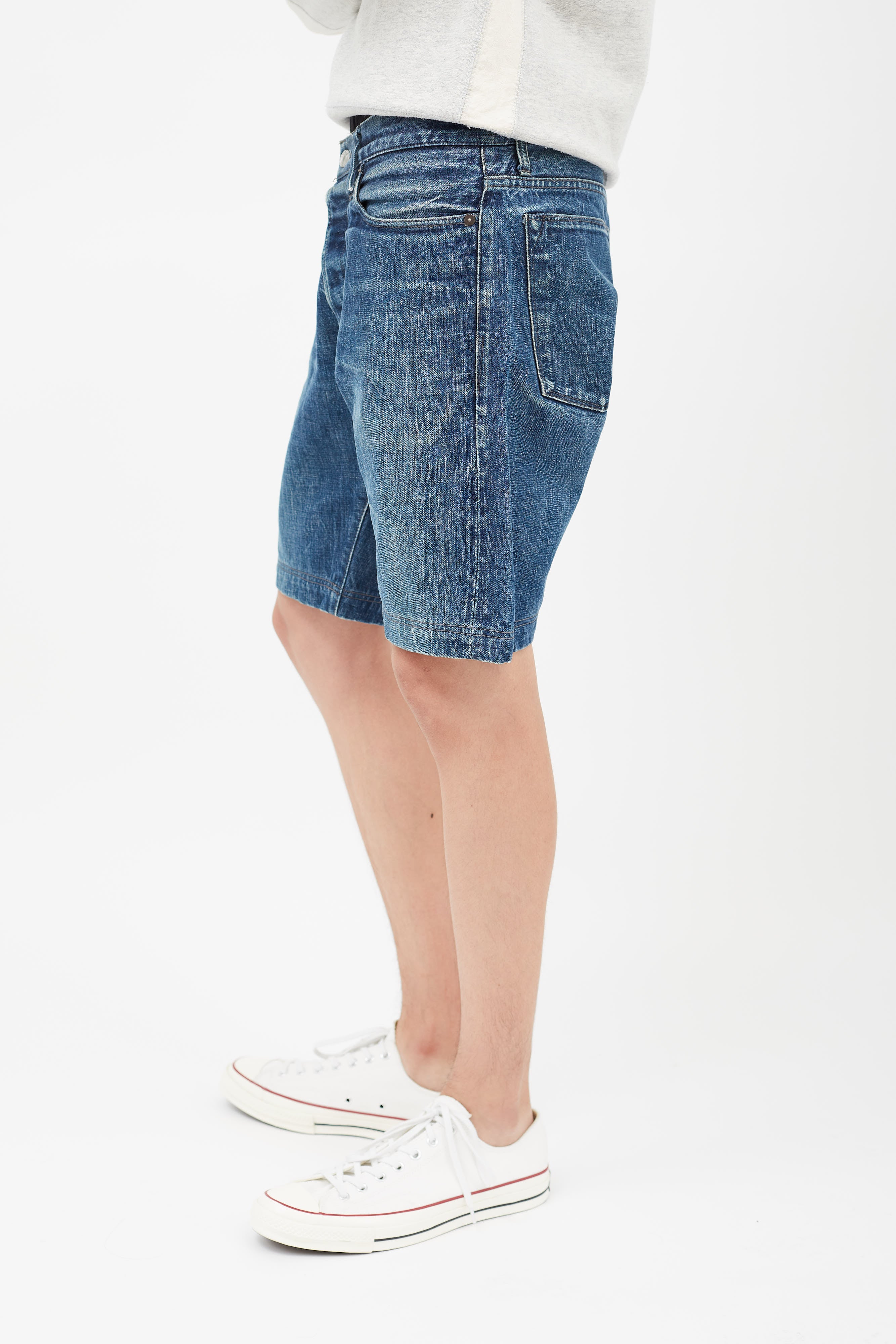 Pre-owned Helmut Lang blue denim jean shorts featuring five pocket styling, silver tone hardware, and button fly closure.