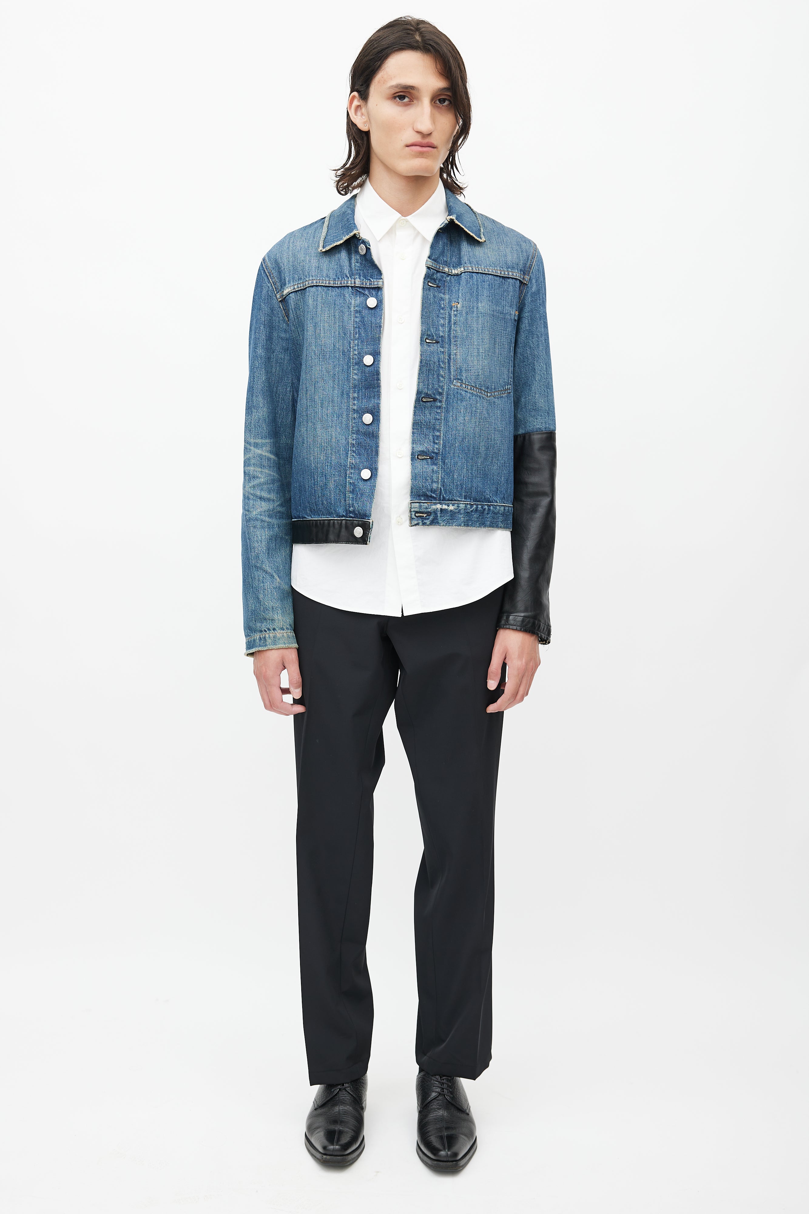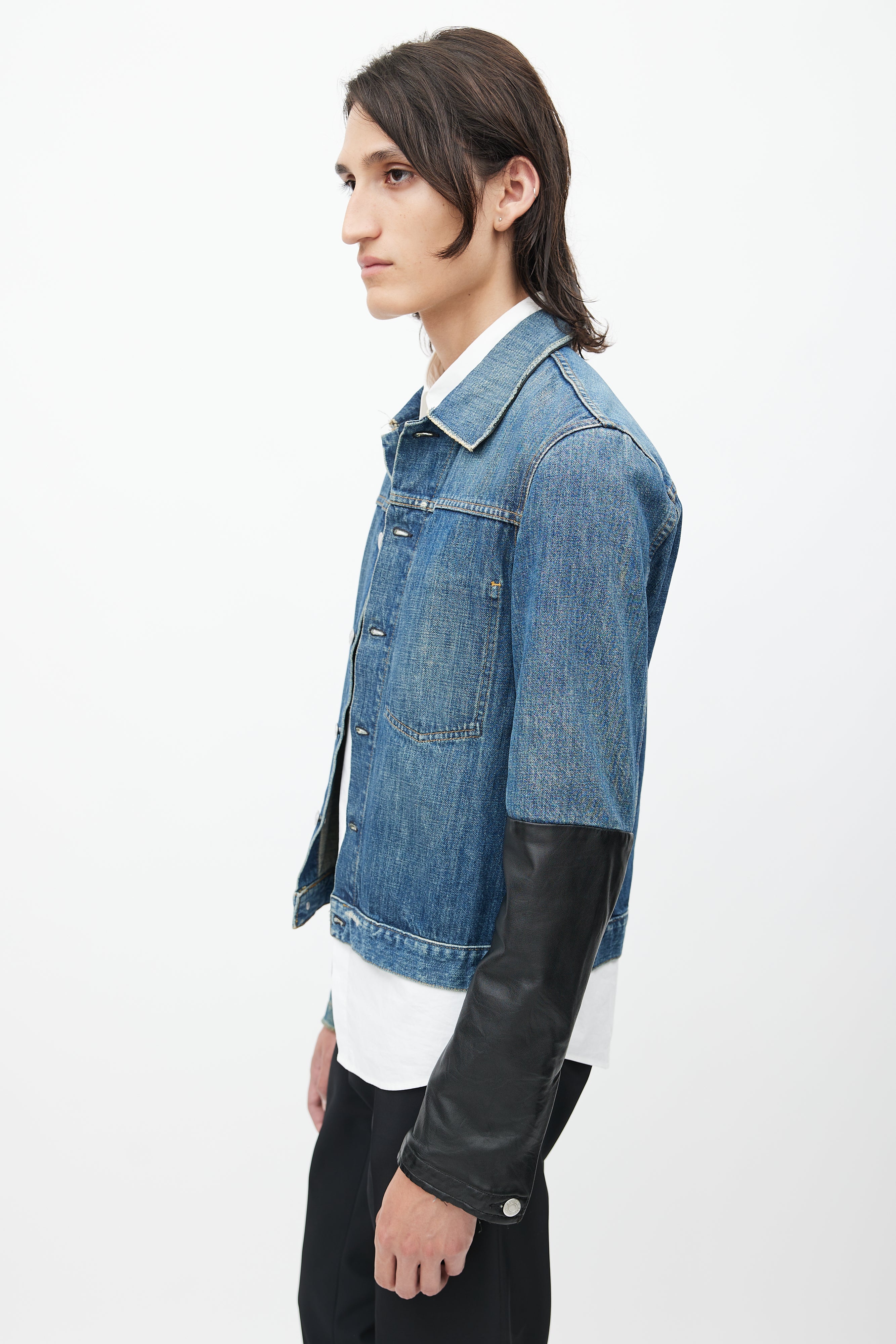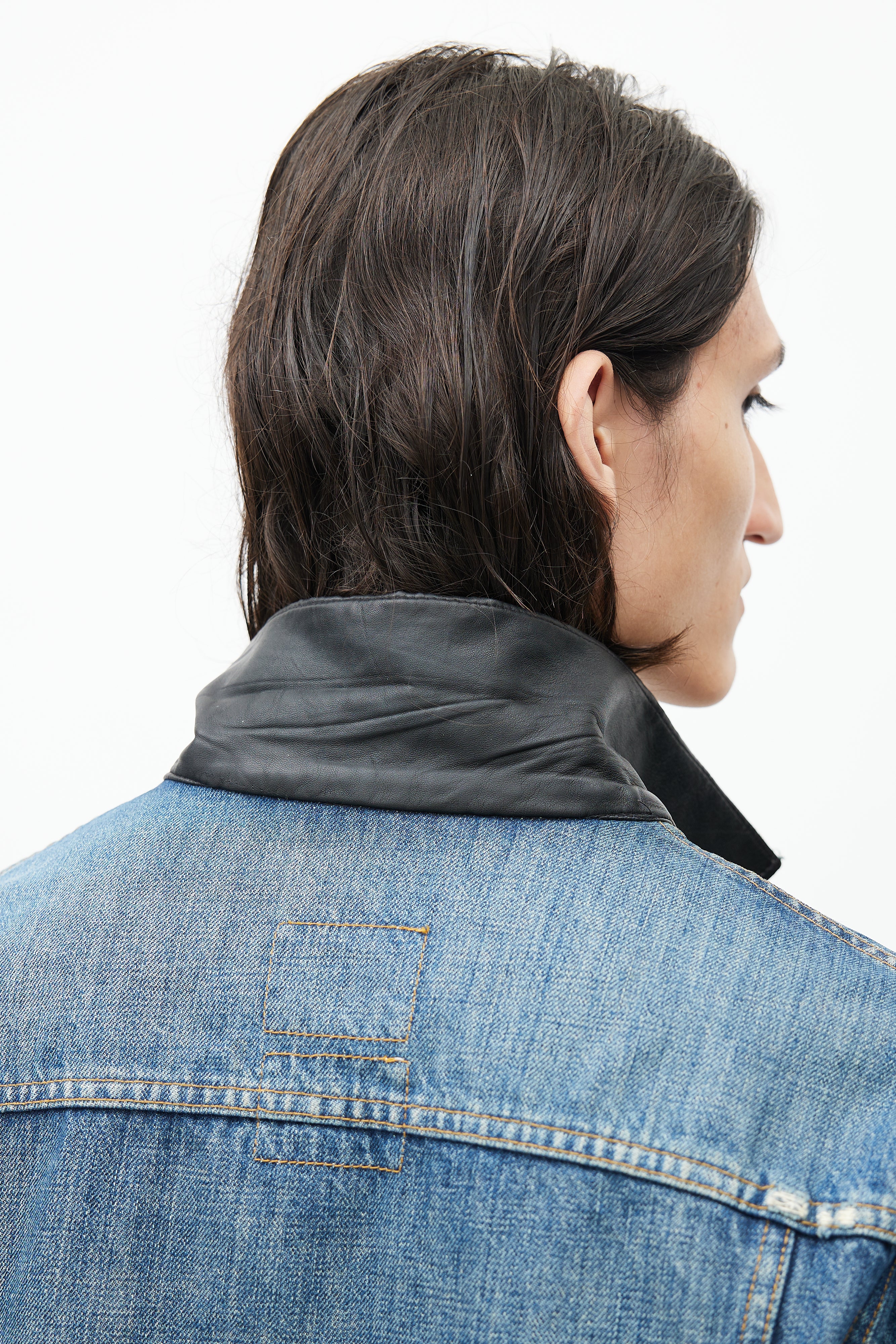 Pre-owned Spring 2003 Helmut Lang blue denim jacket featuring a pointed collar, long sleeves with buttoned cuffs, black leather detailing throughout, and button up front.