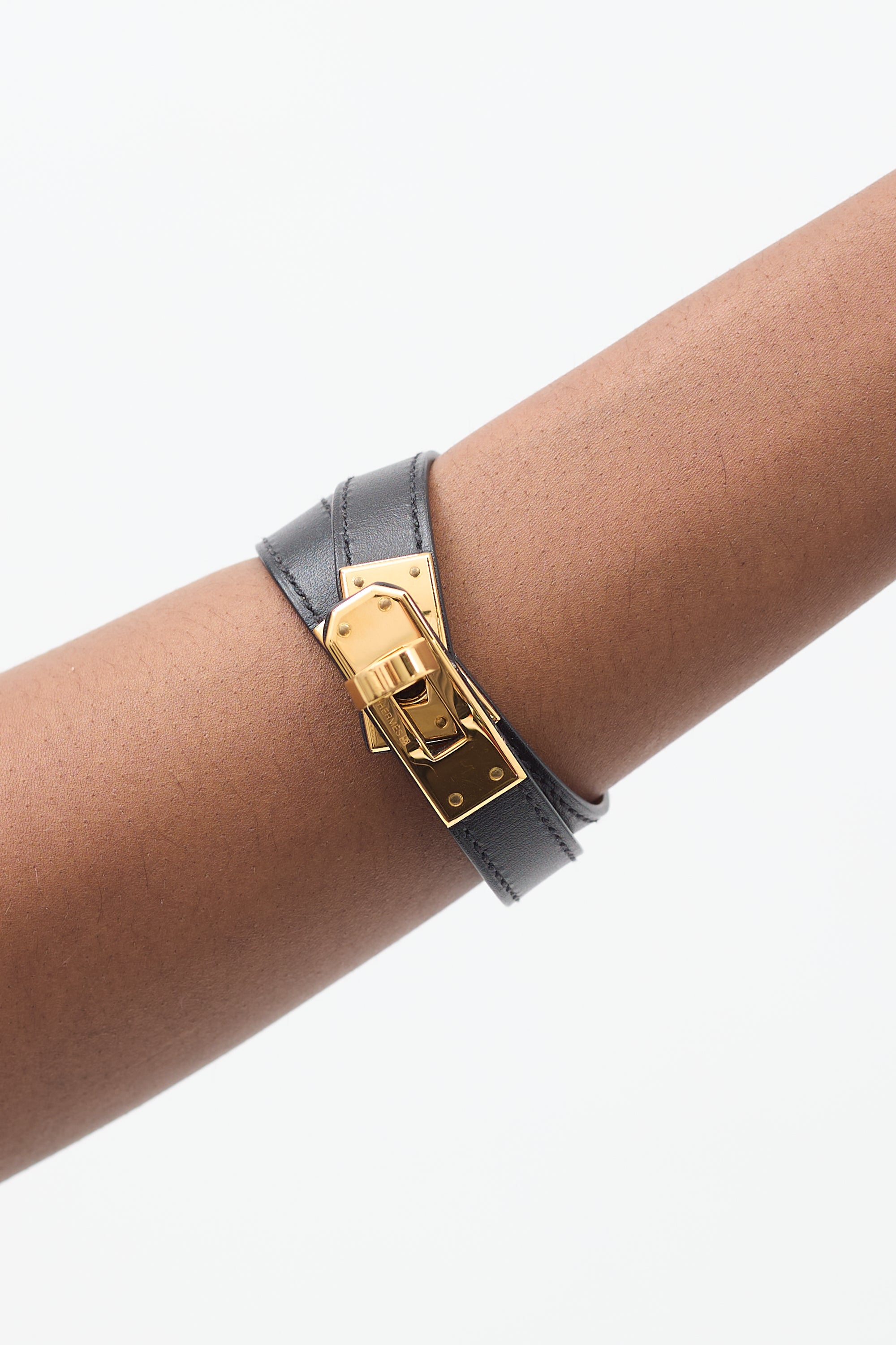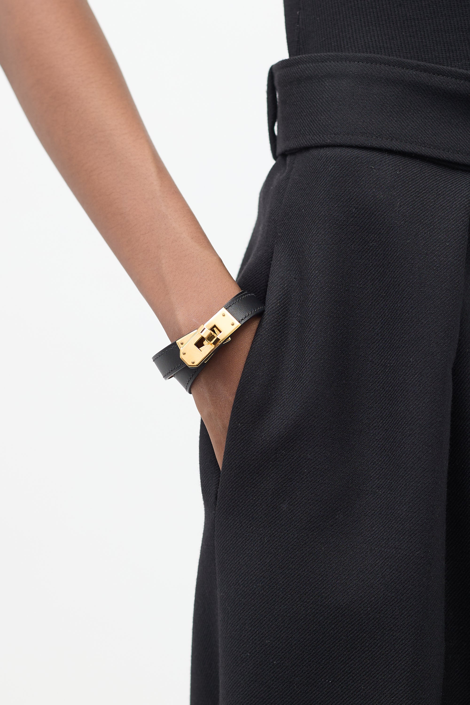 Pre-owned Hermès 2003 black Kelly Double Tour bracelet featuring wraparound box calf leather band, yellow gold plated hardware, and signature Kelly twist closure. Band stamped with "FL", Square "G", designer signature, "Made in France", and "S". Hardware stamped with designer signature and hallmark symbols. Comes with original box and pouch.