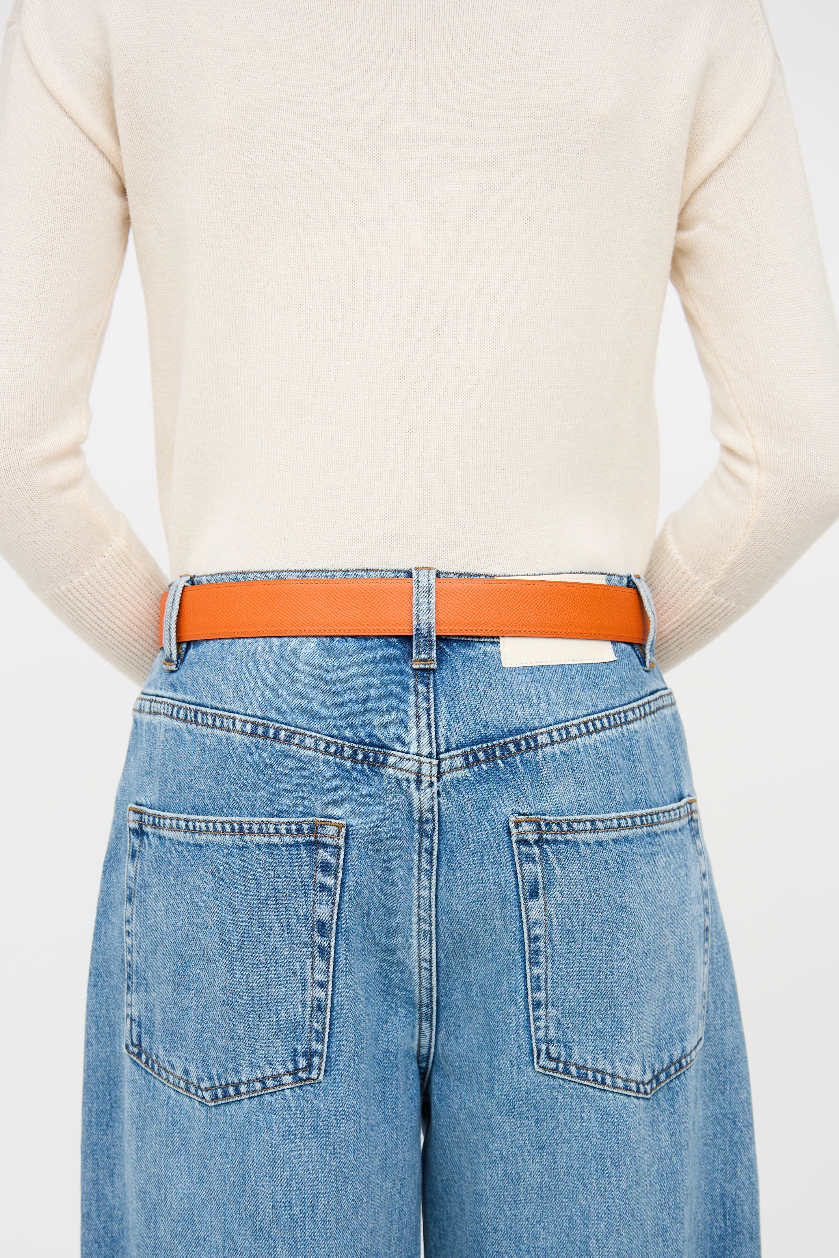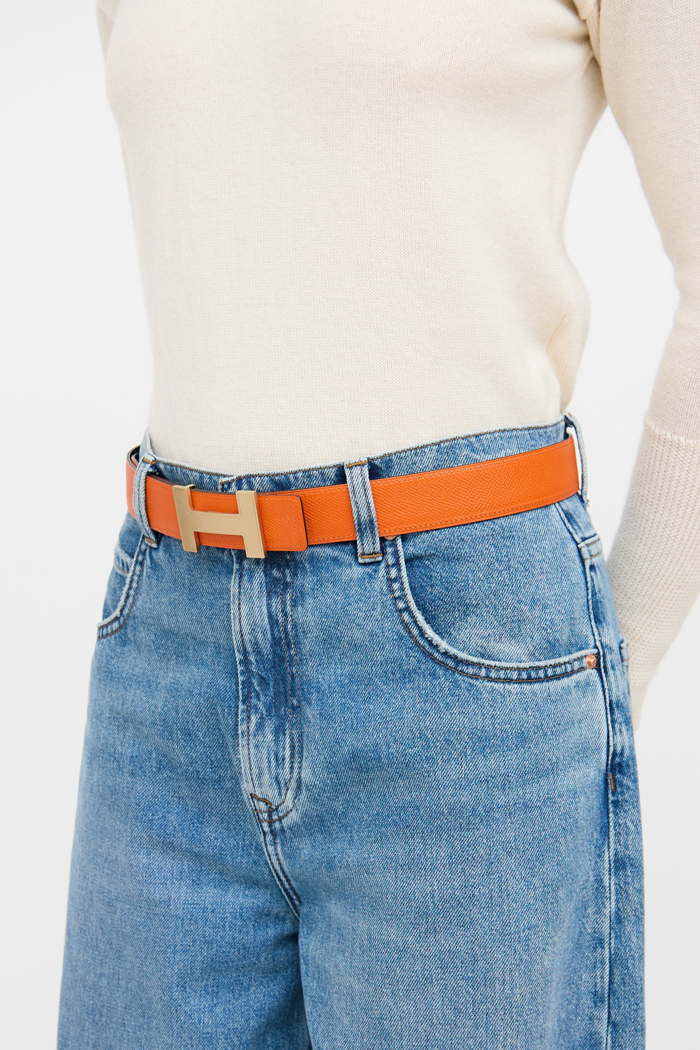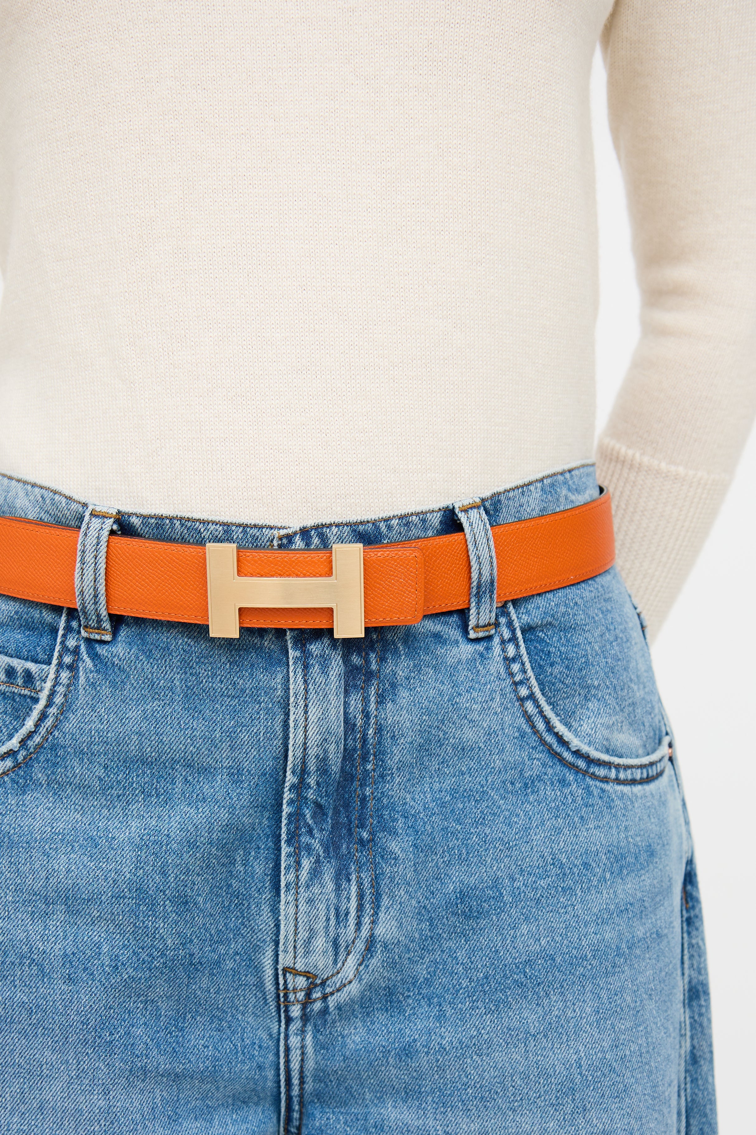 Pre-owned Hermès 2014 black and orange Constance mini reversible leather belt featuring tonal stitching, gold tone H logo buckle, and stamped logo at interior.