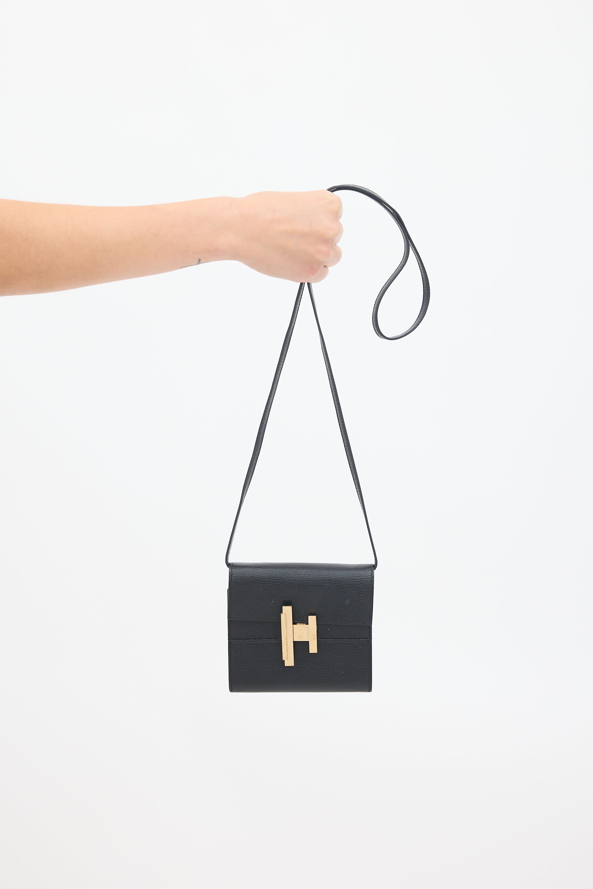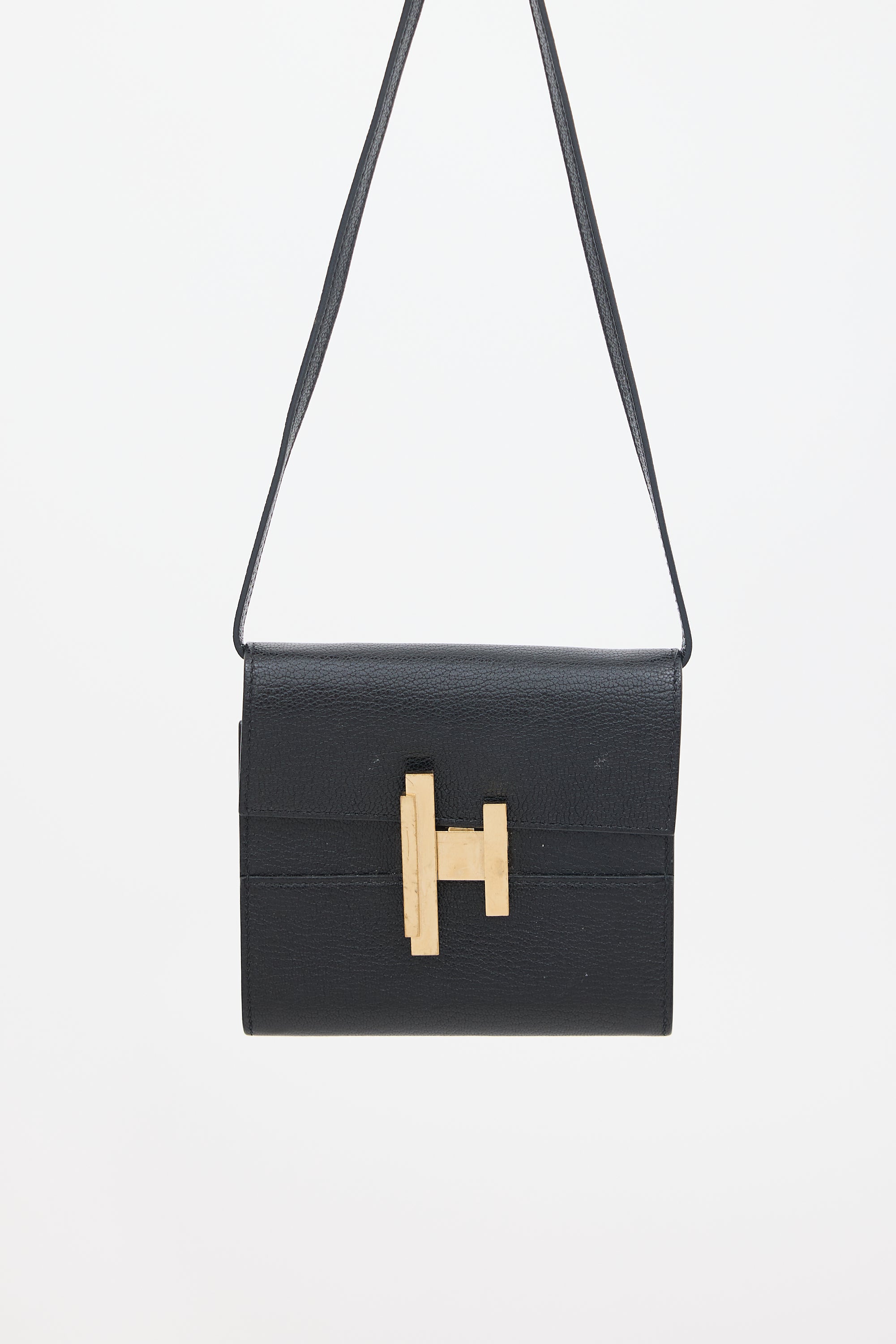 Pre-owned Hermès 2019 Cinhetic To Go wallet in Noir Chevre Mysore leather featuring tonal stitching, gold tone hardware, detachable shoulder strap, front flap with twist lock closure, gold tone stamped logo under flap, interior zip compartment at front face, and one main compartment with slip pocket for matching mirror. Comes with original box and dust bag.