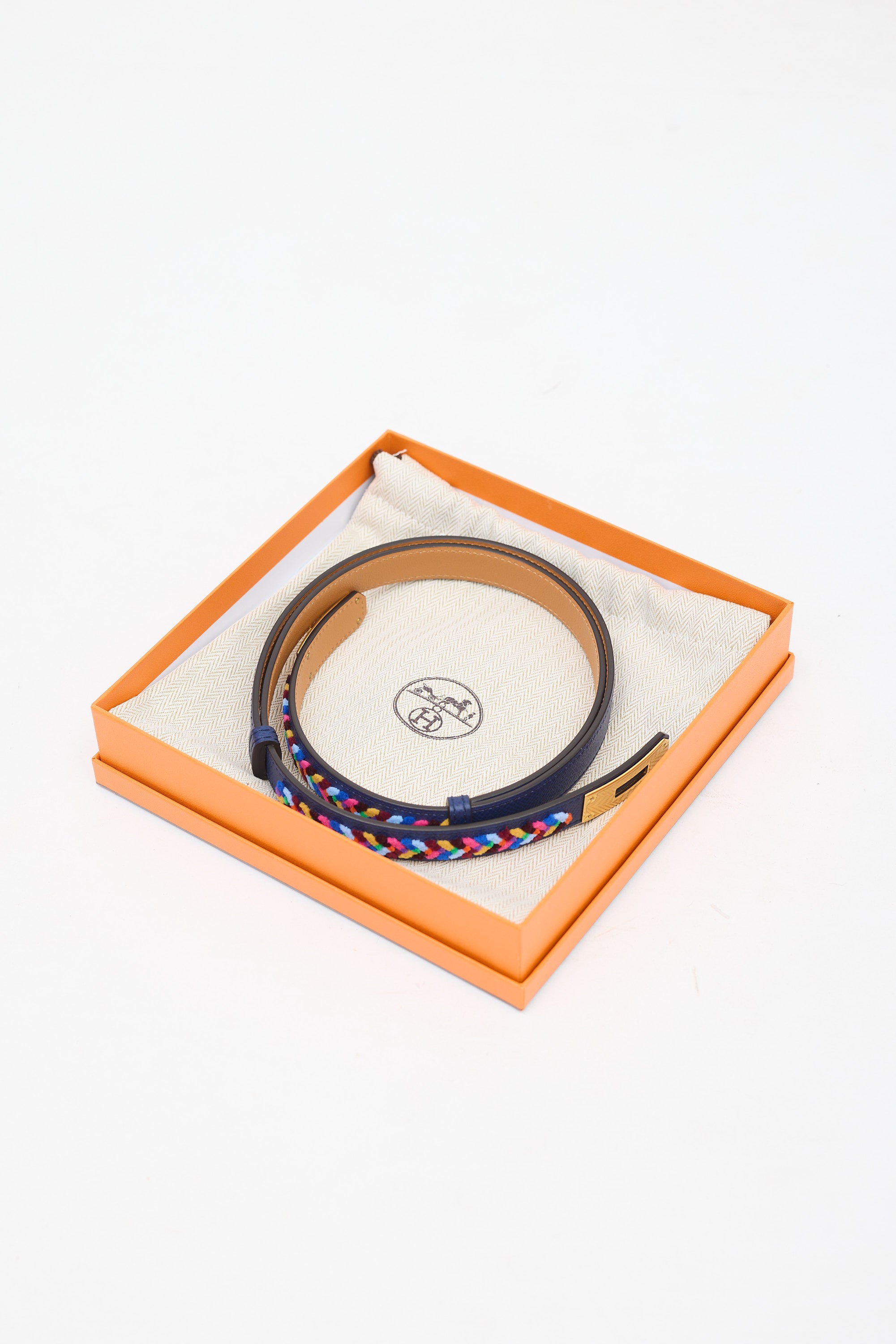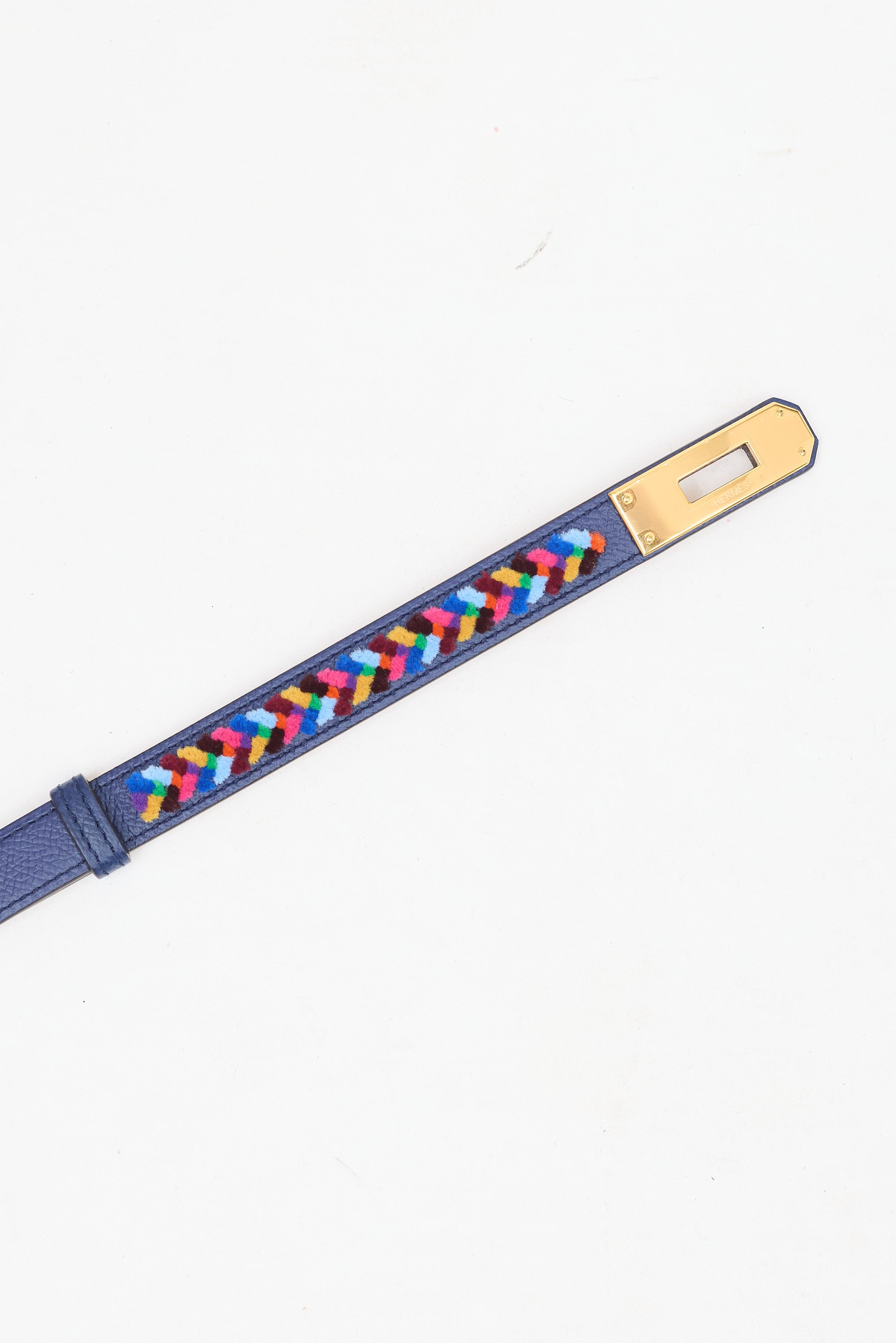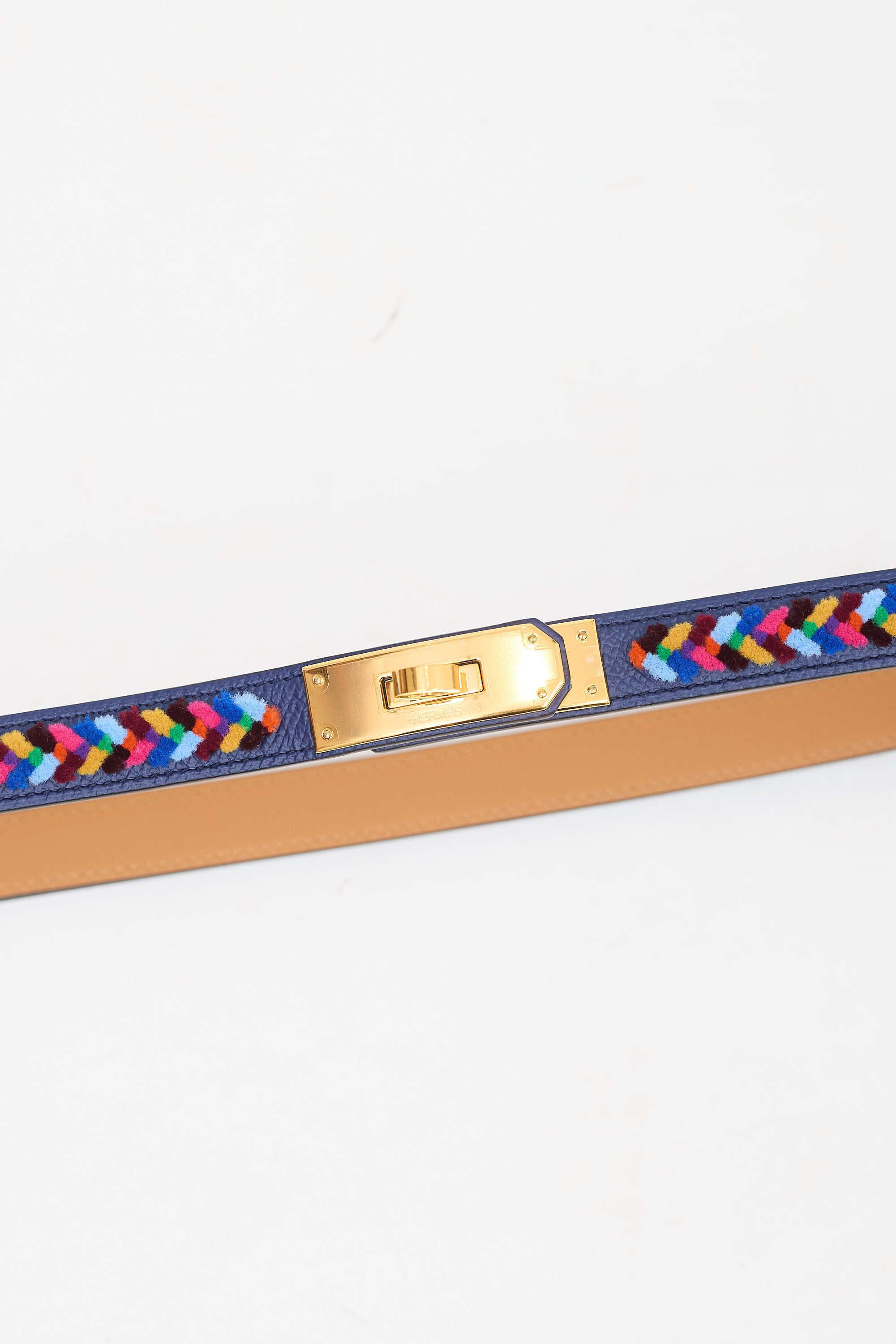 Pre-owned Hermès 2023 Kelly 18 belt in Bleu Saphir Epsom leather featuring yellow gold plated hardware, multicolour velvet tufting, signature Kelly buckle, etched logo plaque, slide adjustment, and stamped logo at reverse. Comes with original dust bags and box.