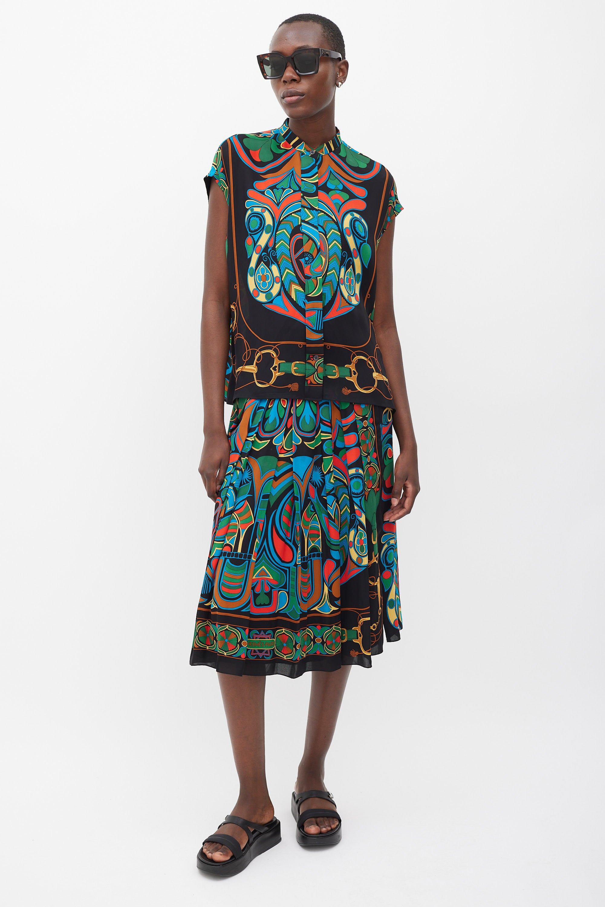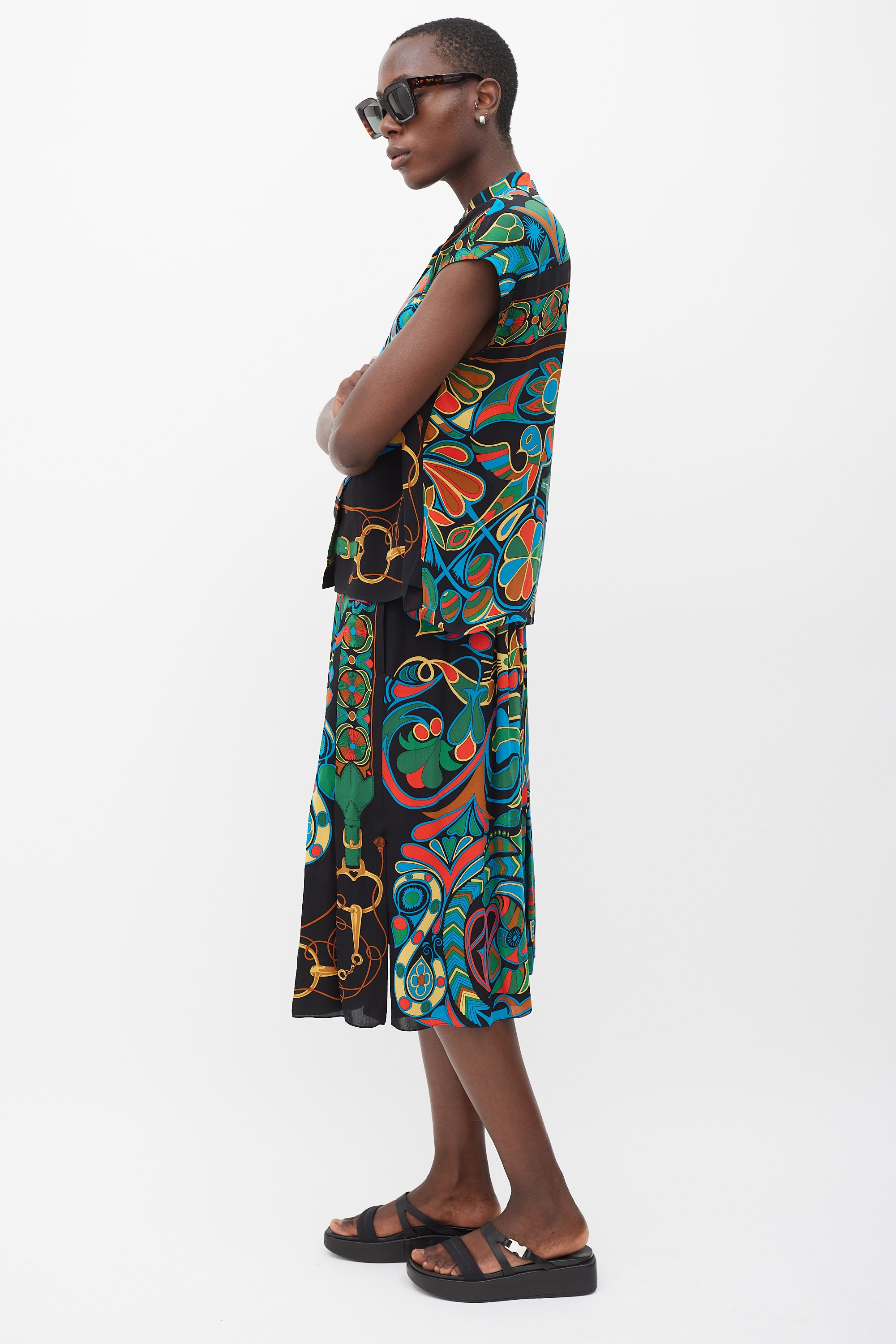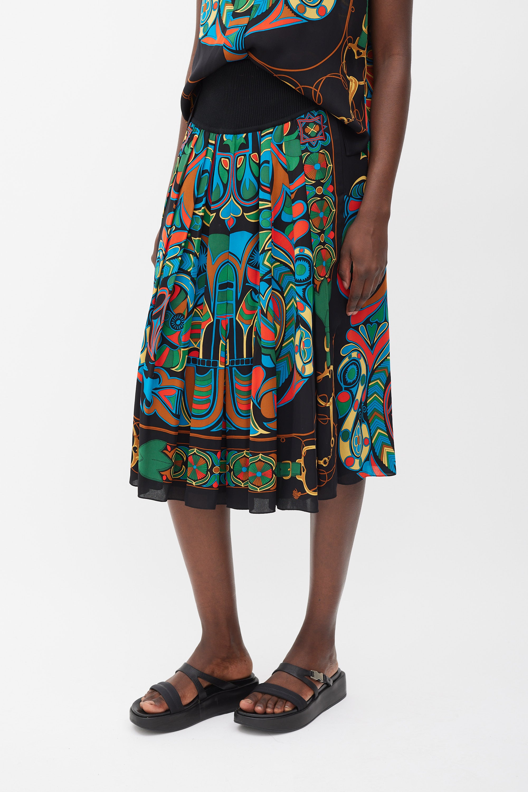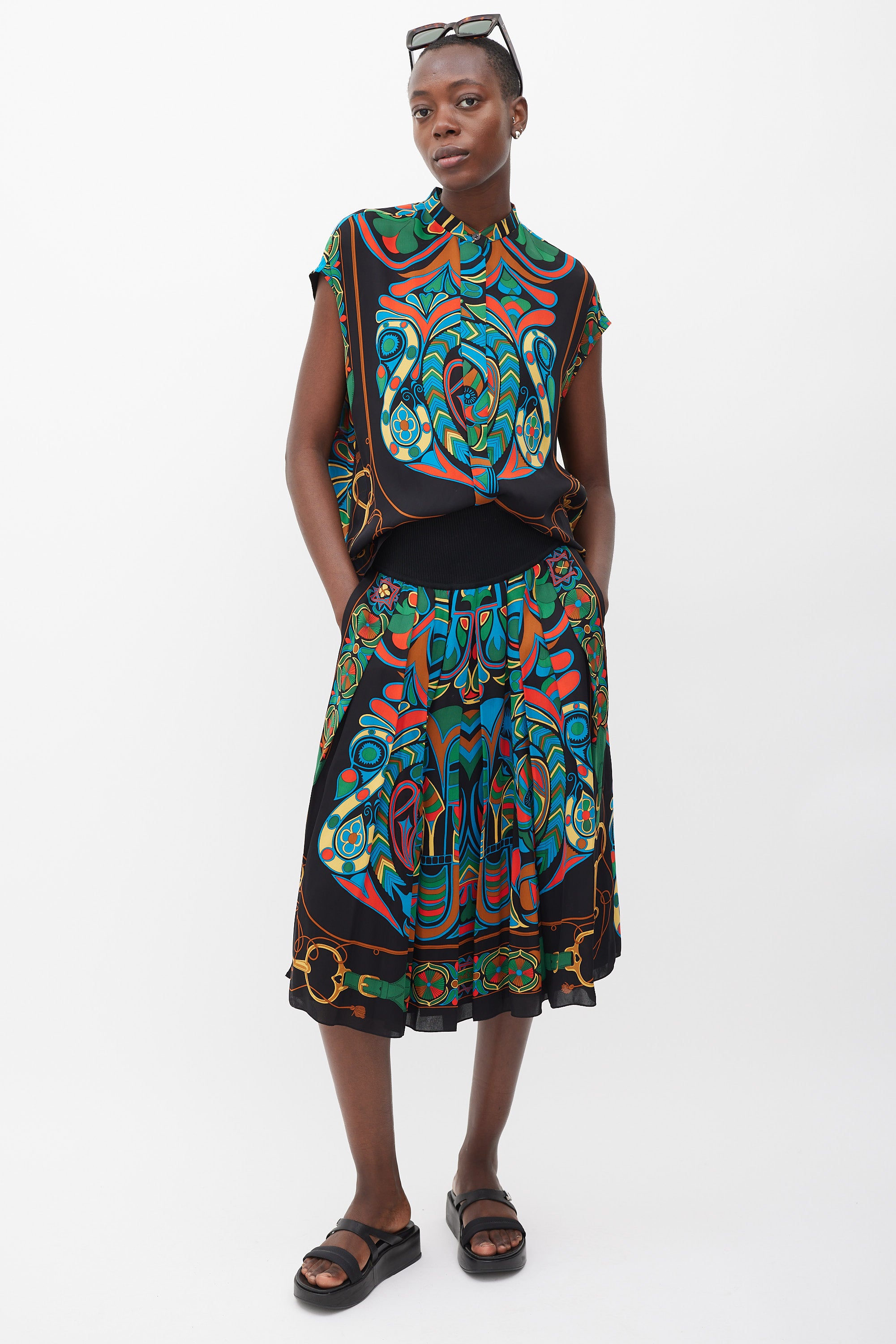 Pre-owned Hermès black silk top featuring Folklore print by Henri D'origny, multicolour Garden of Eden pattern throughout, round neckline, sleeveless styling, and button up closure. Matching skirt features an elasticized ribbed waist, two slip pockets at hip, and pleated detailing. Skirt is lined.