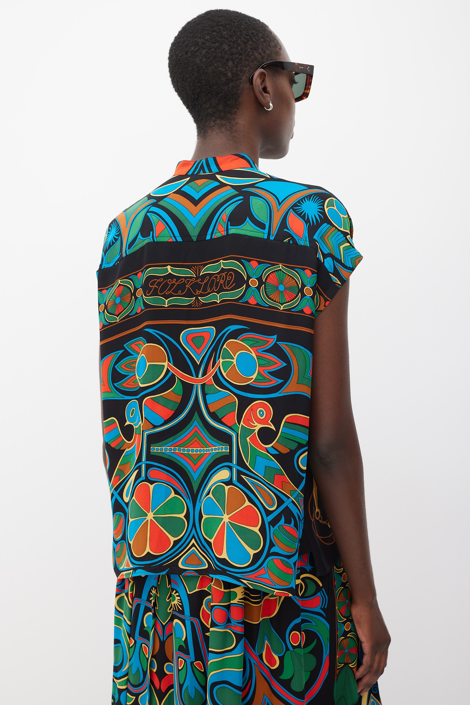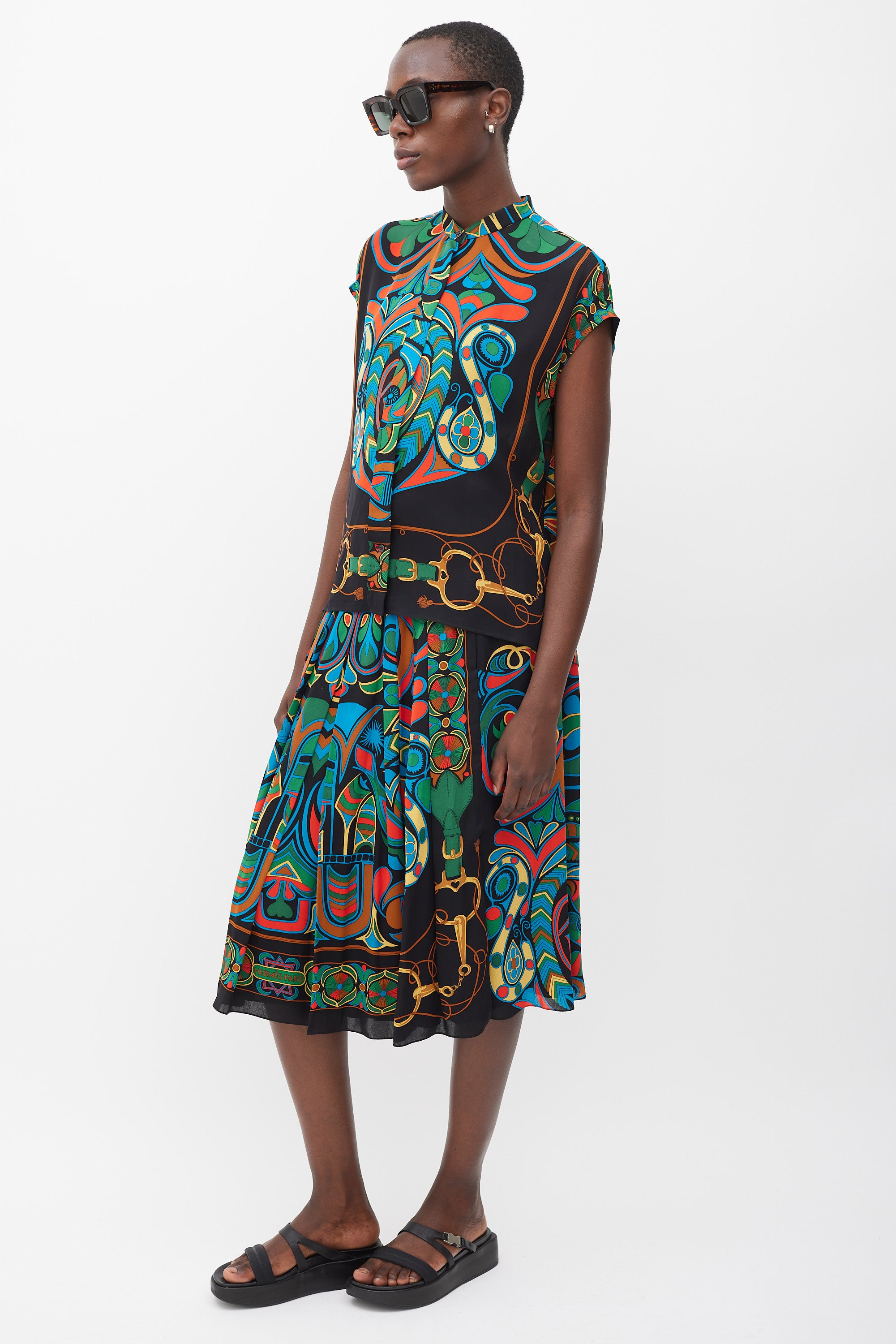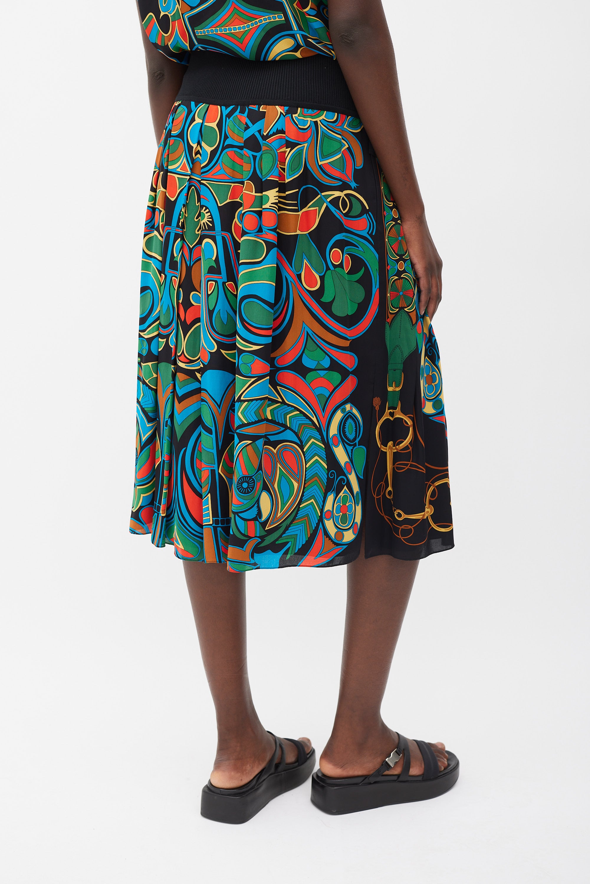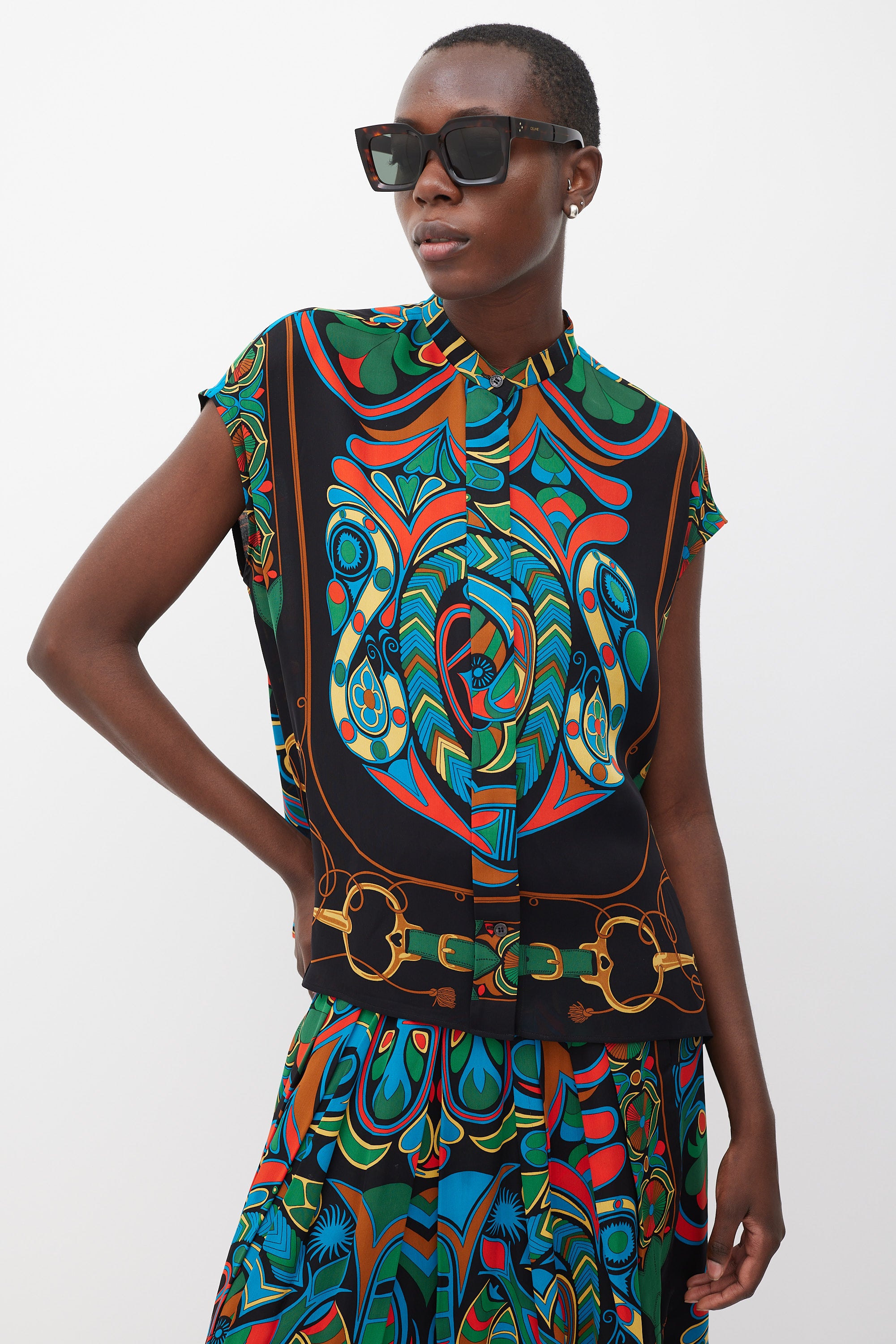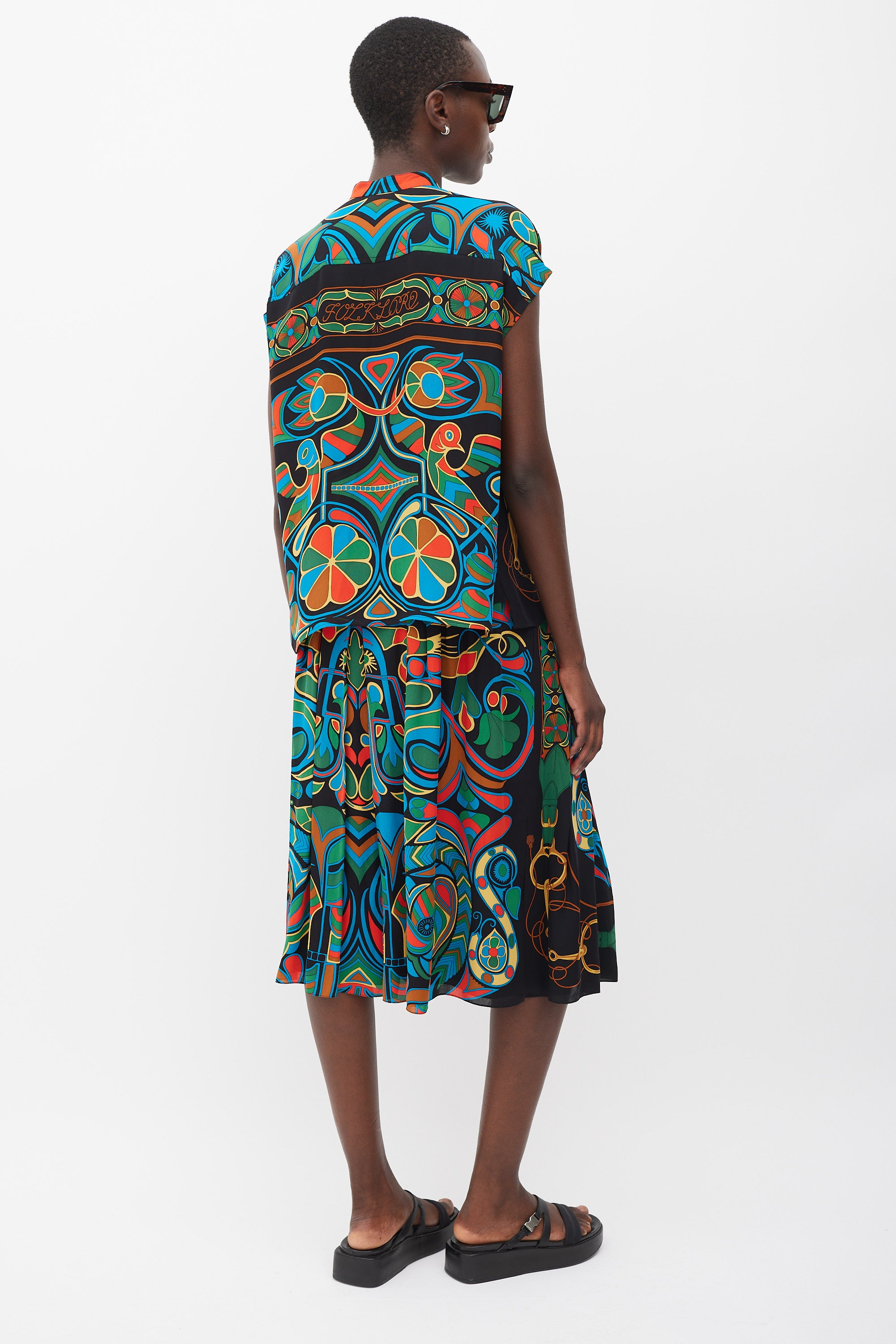 Pre-owned Hermès black silk top featuring Folklore print by Henri D'origny, multicolour Garden of Eden pattern throughout, round neckline, sleeveless styling, and button up closure. Matching skirt features an elasticized ribbed waist, two slip pockets at hip, and pleated detailing. Skirt is lined.