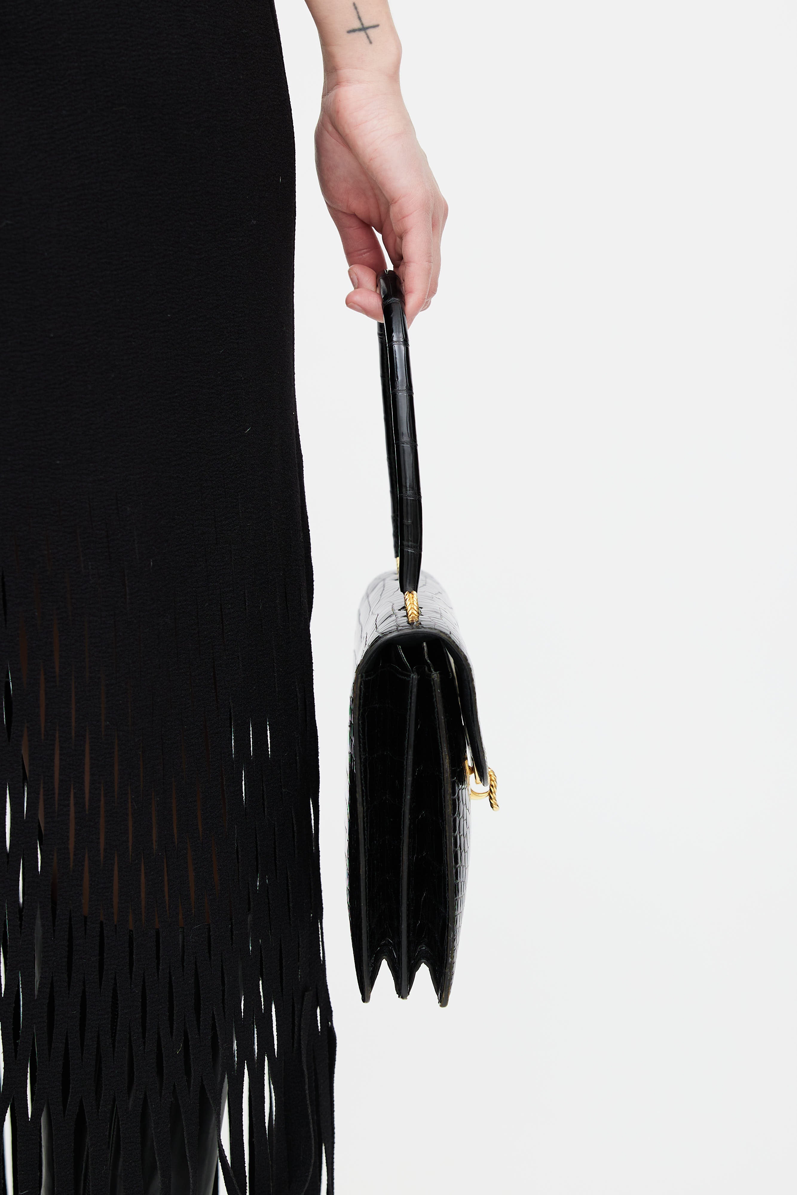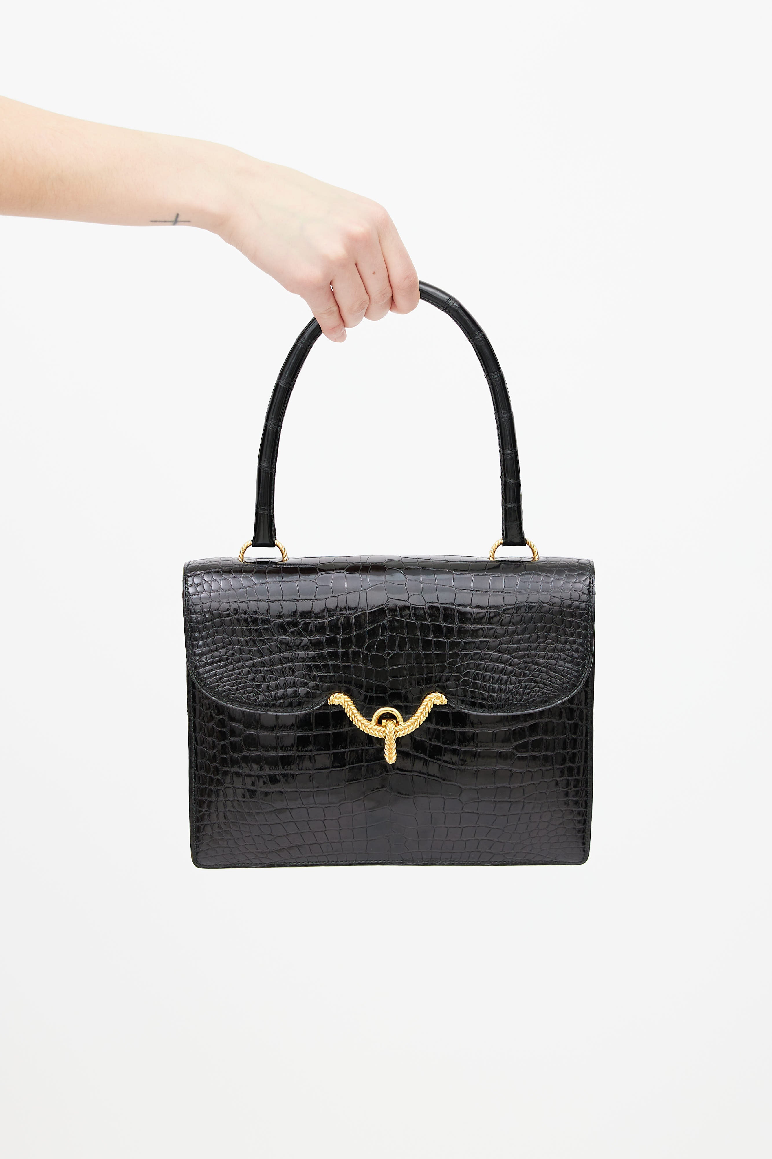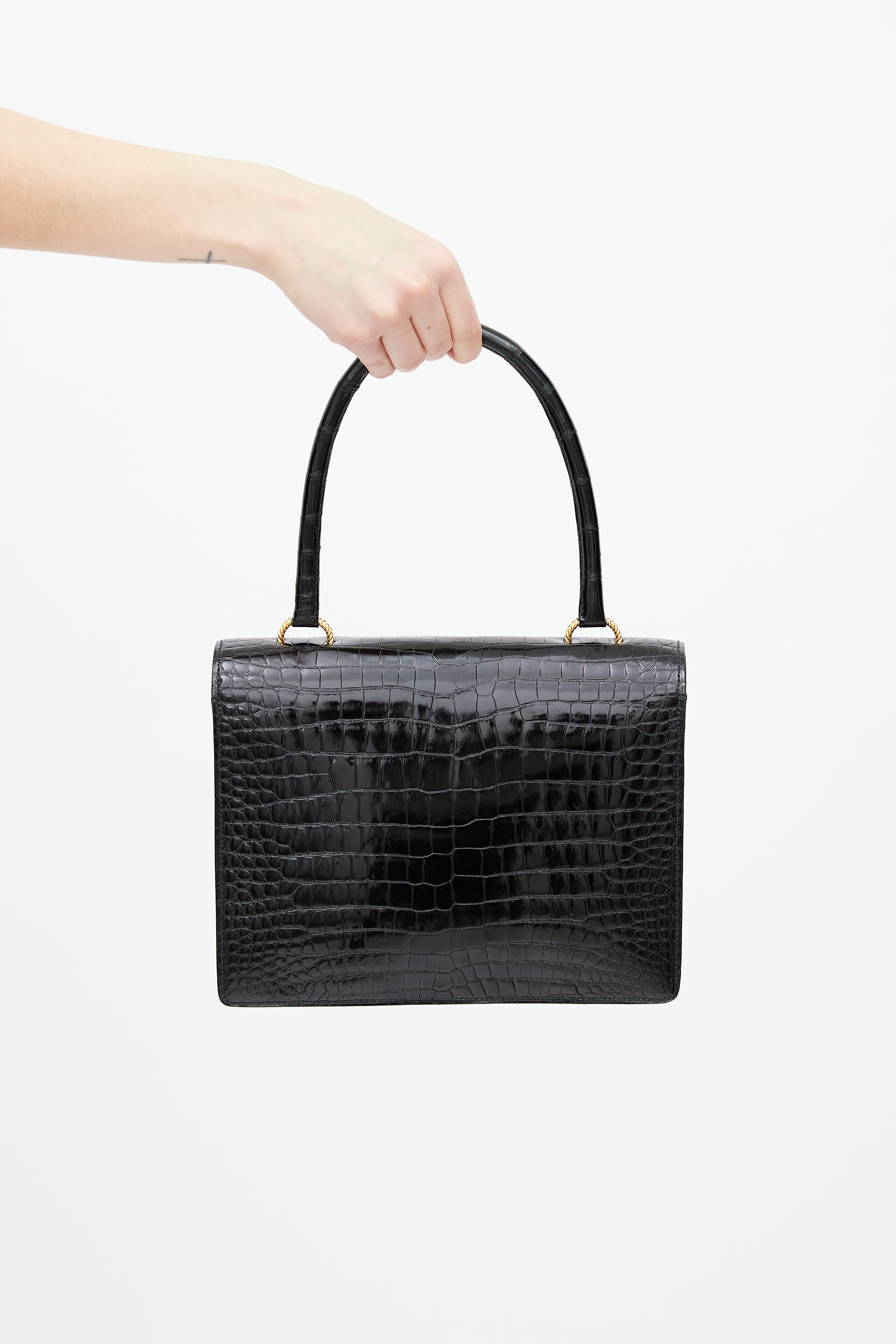 Pre-owned Hermès vintage black Crocodile Vasco top handle bag featuring polished, finish gold-tone hardware, hook closure at front, one rolled handle at top, three separate compartment interior with one slip pouch, one snap pocket and two slip pocket with removable mirror. Smooth black leather lining.