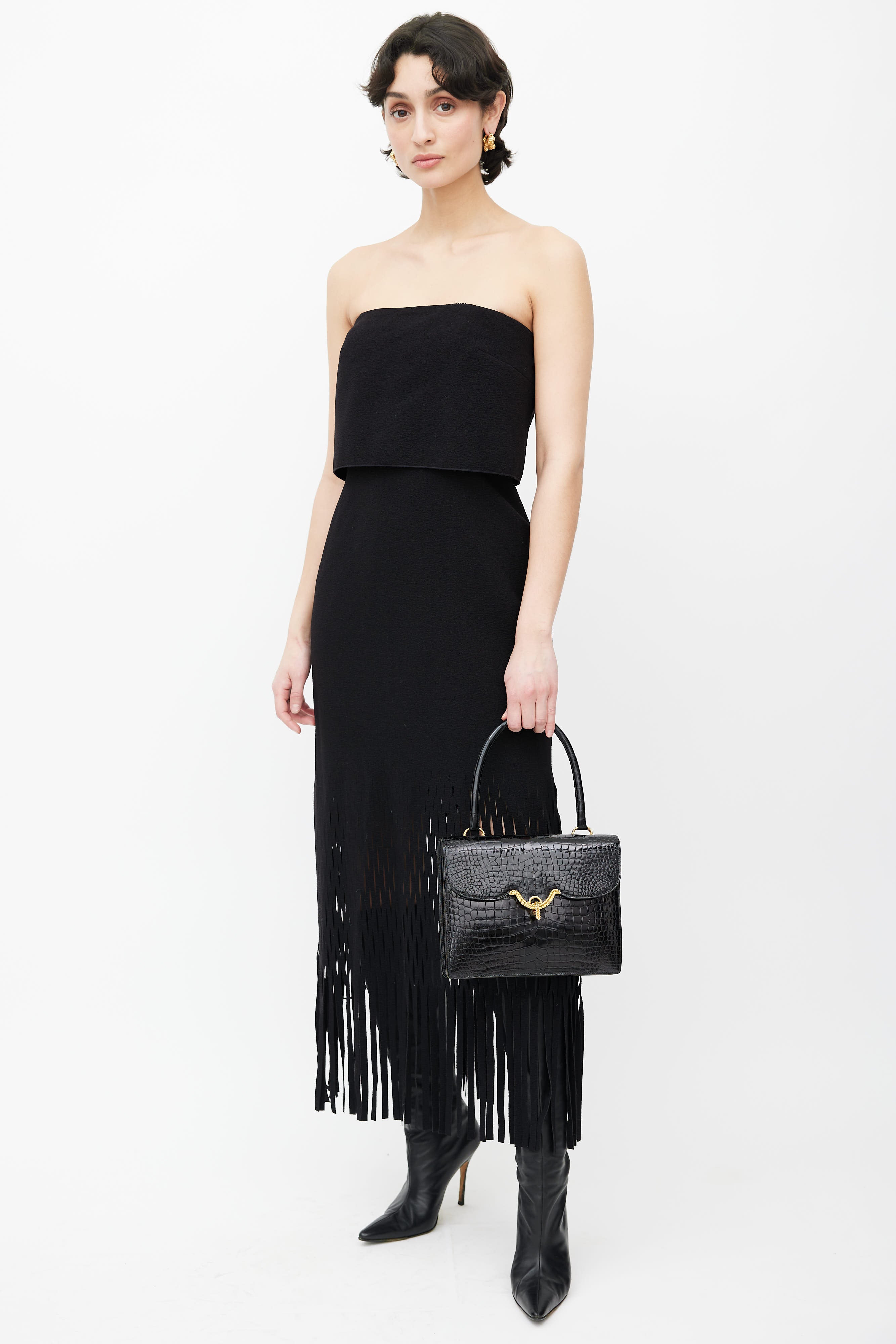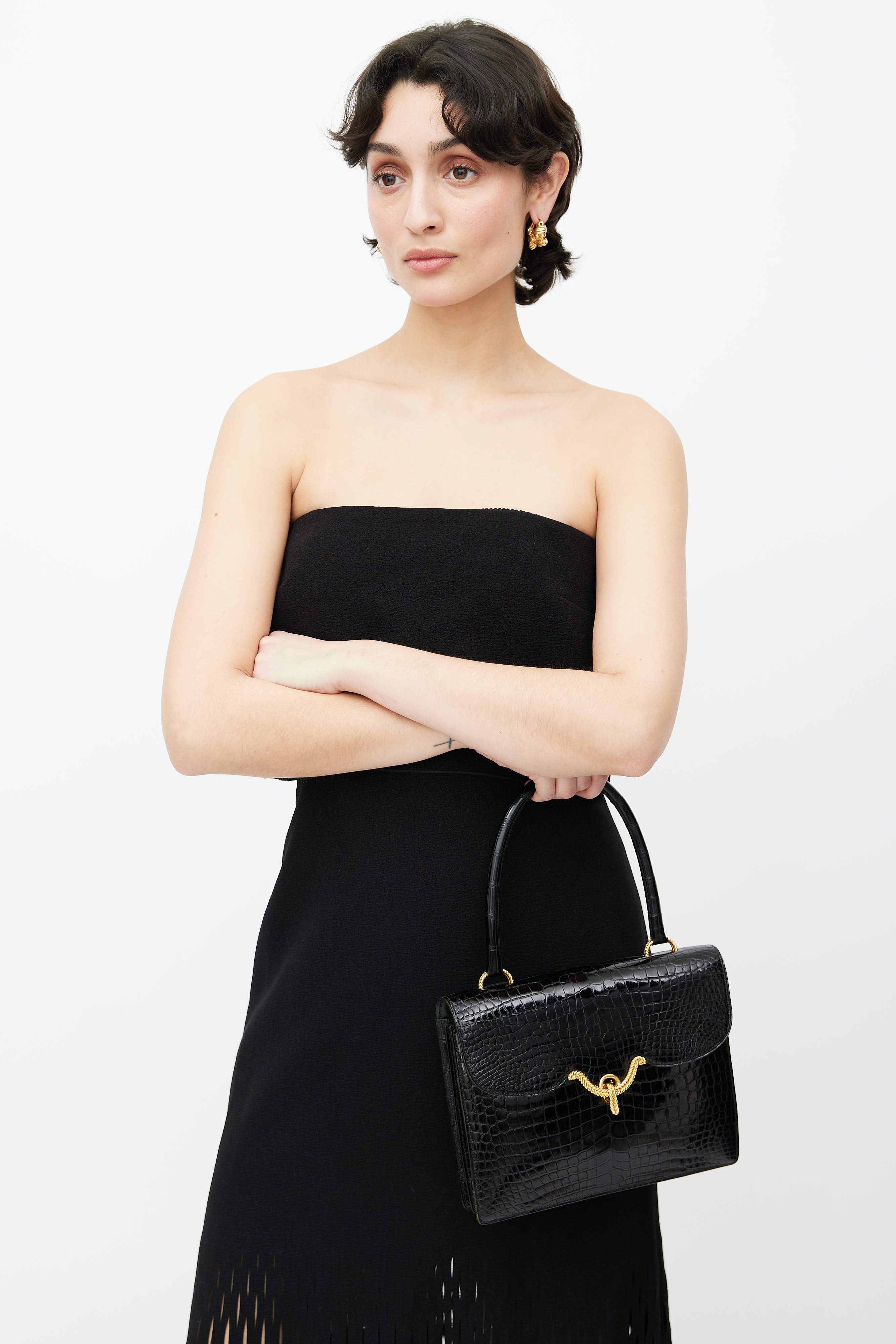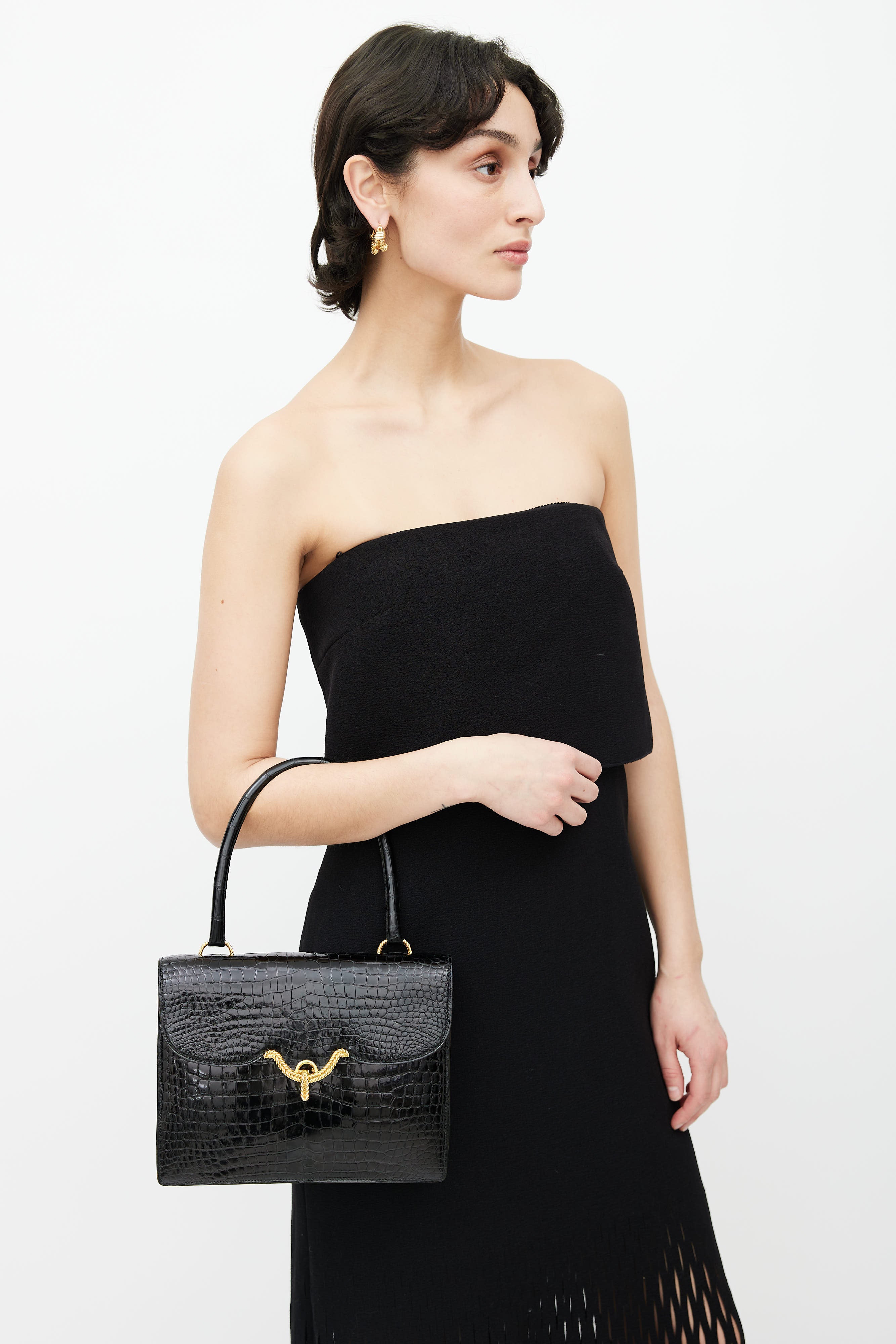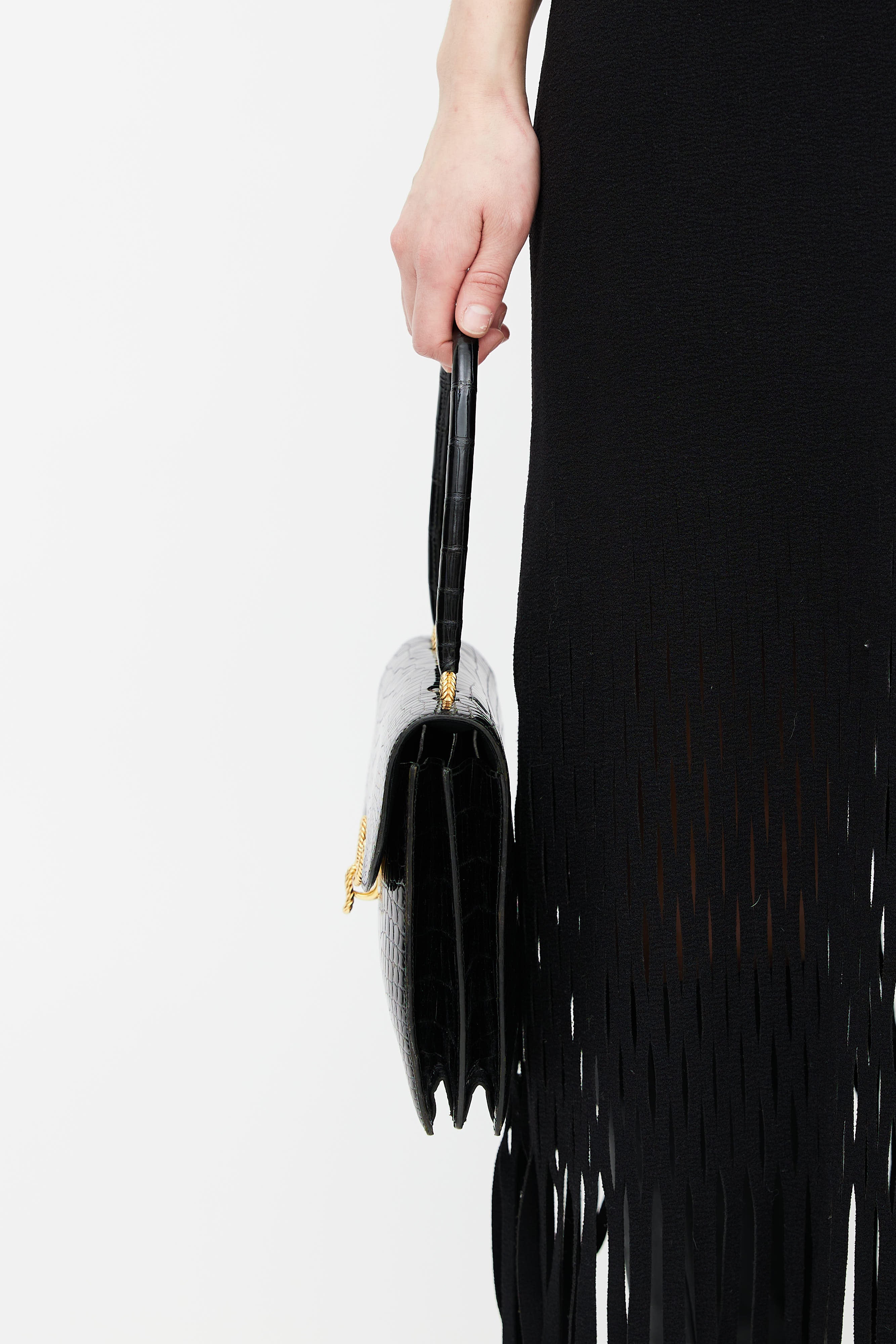 Pre-owned Hermès vintage black Crocodile Vasco top handle bag featuring polished, finish gold-tone hardware, hook closure at front, one rolled handle at top, three separate compartment interior with one slip pouch, one snap pocket and two slip pocket with removable mirror. Smooth black leather lining.