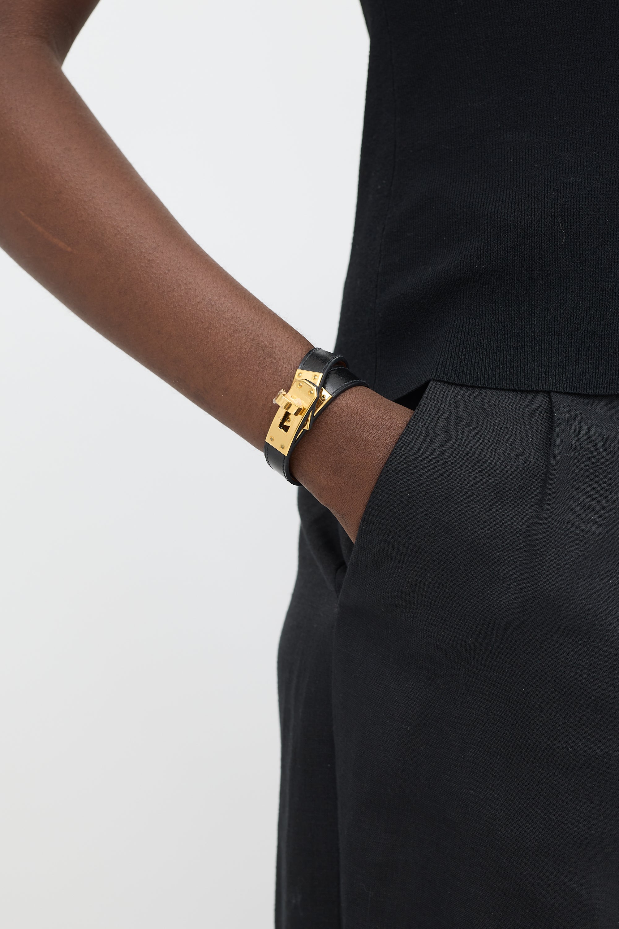 Pre-owned Hermès black Kelly Double Tour bracelet featuring wraparound box calf leather band, yellow gold plated hardware, and signature Kelly twist closure. Band stamped with "X FS 008 GX", "HERMÈS", "PARIS", "MADE IN FRANCE", and "XS". Comes with original pouch and box.