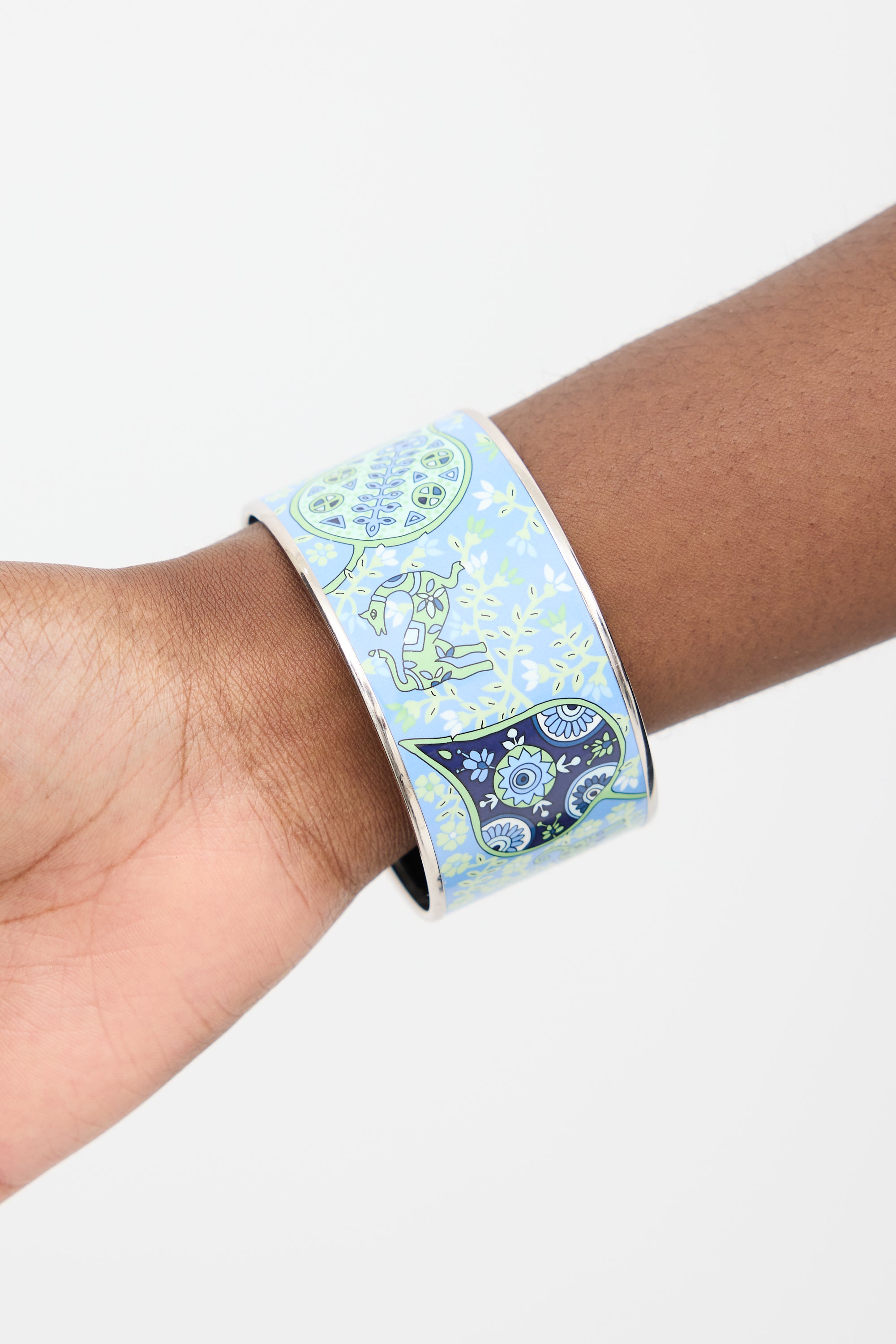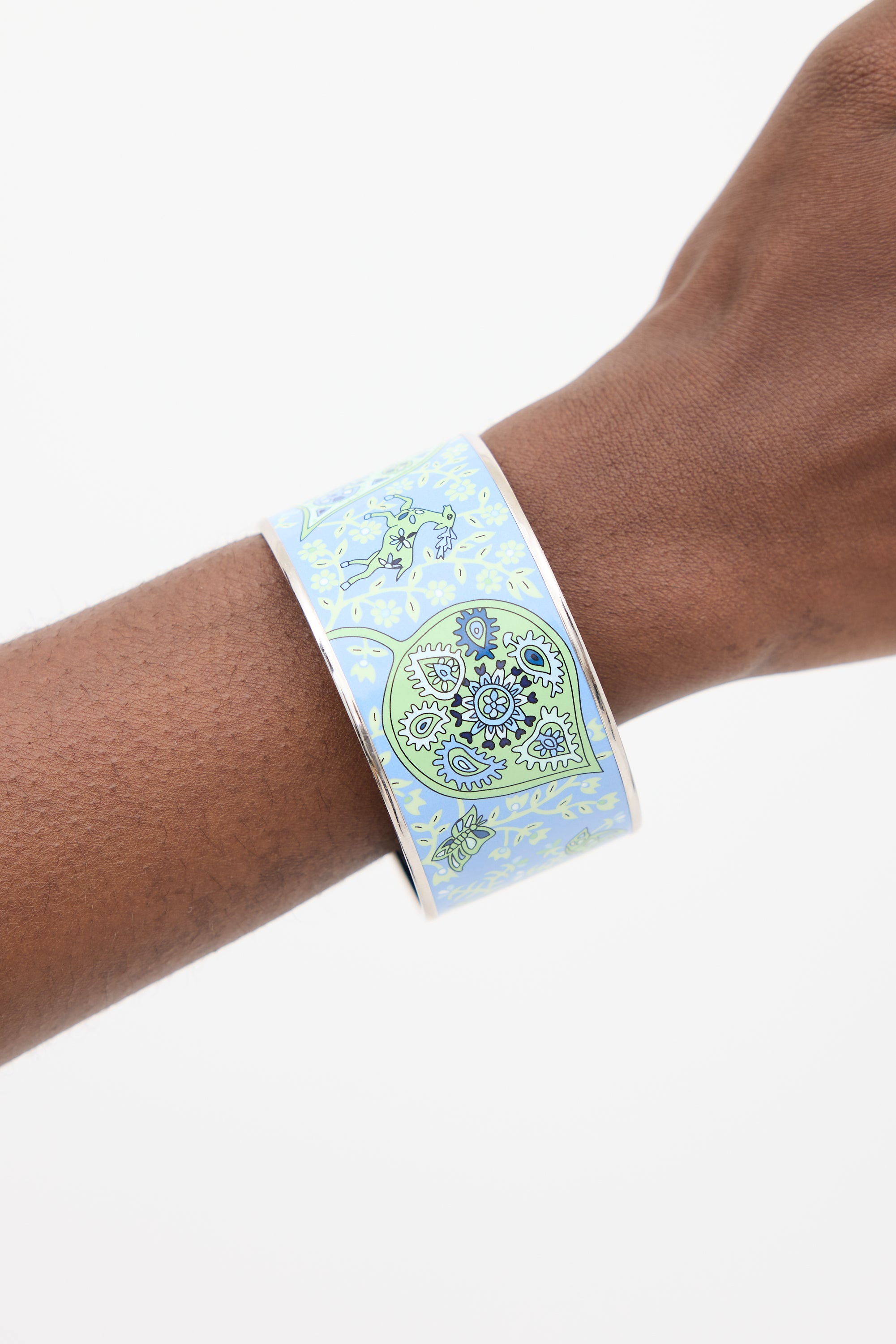 Pre-owned Hermès light blue and green Extra Wide bangle bracelet featuring a floral and animal motif print enamel inlay, silver tone gilded edge, and inner gold tone logo stamp.