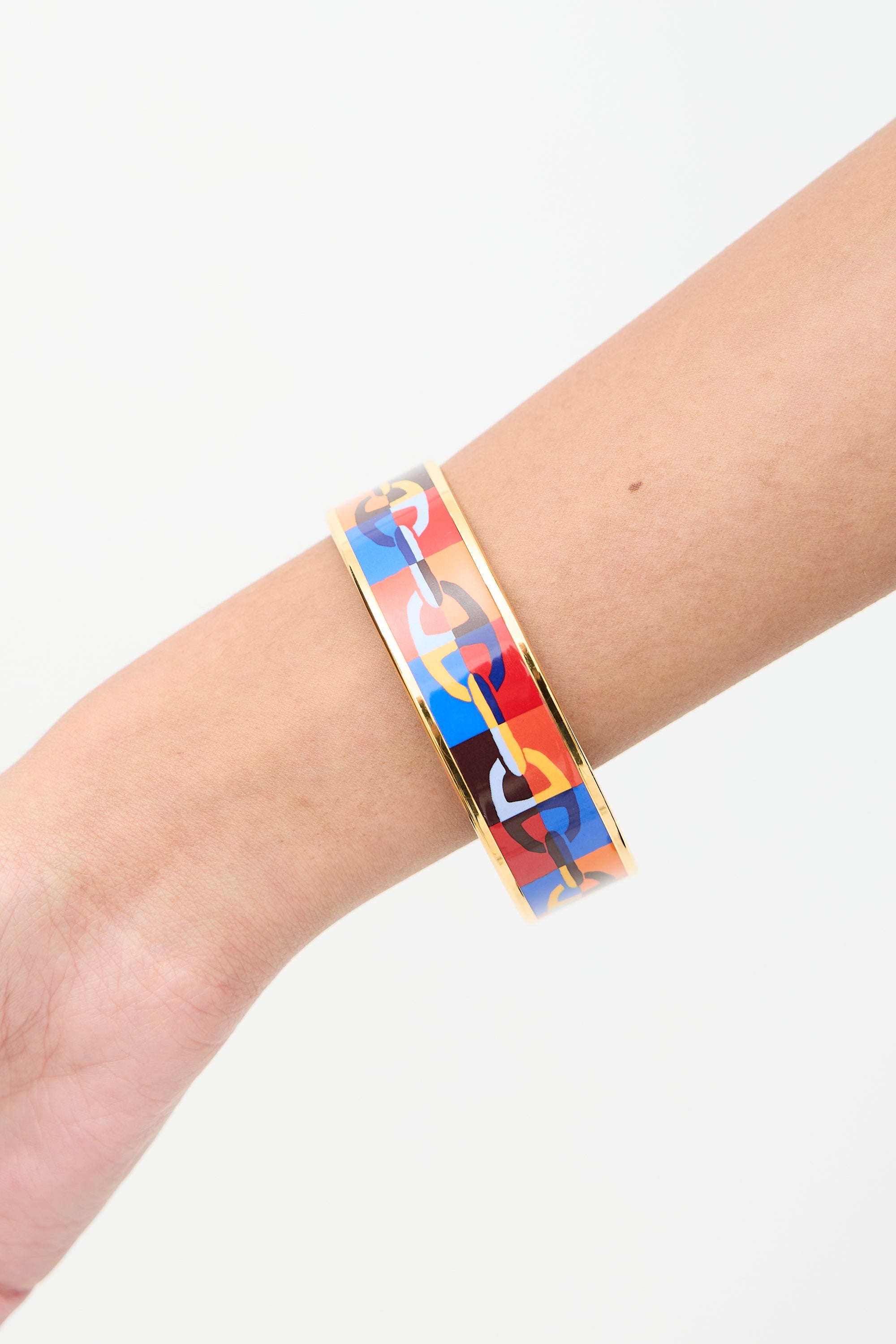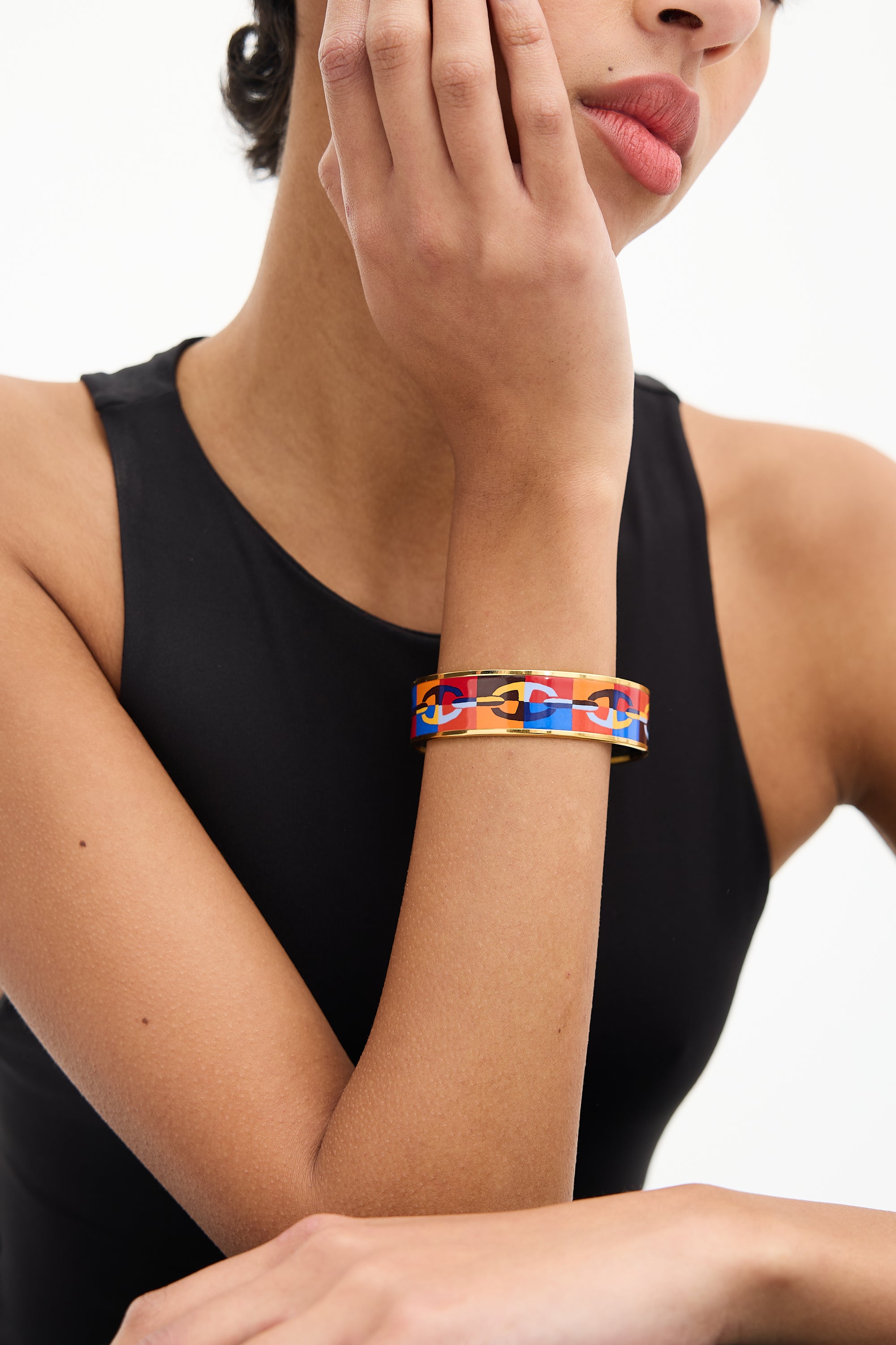 Pre-owned Hermès red and multicolour bangle bracelet featuring Chain D'Ancre motif print enamel inlay, gold plated gilded edge, and inner gold tone logo stamp. Comes with original box and pouch.