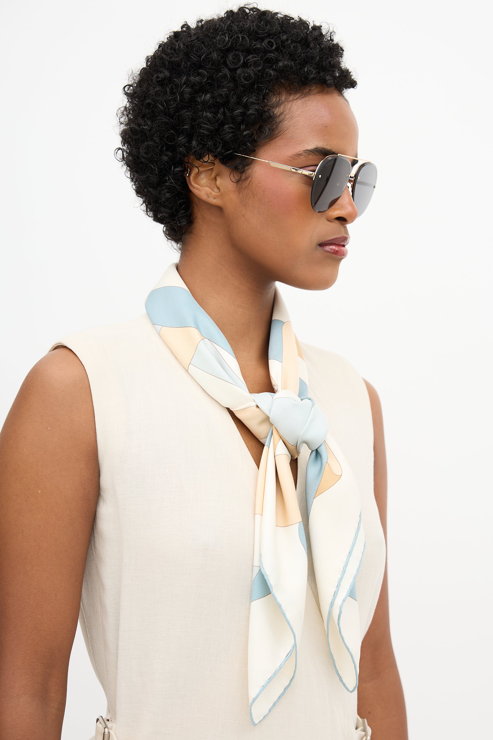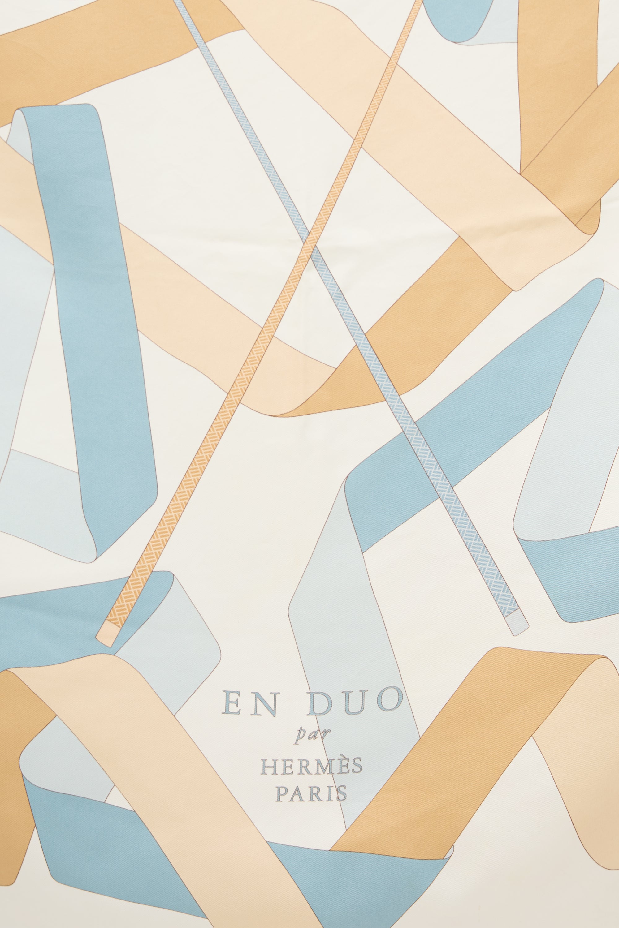 Pre-owned Hermès beige and light blue silk scarf featuring En Duo print by Cyrille Daitkane & Sandy Queudrus, ribbon motif, and hand rolled edges.