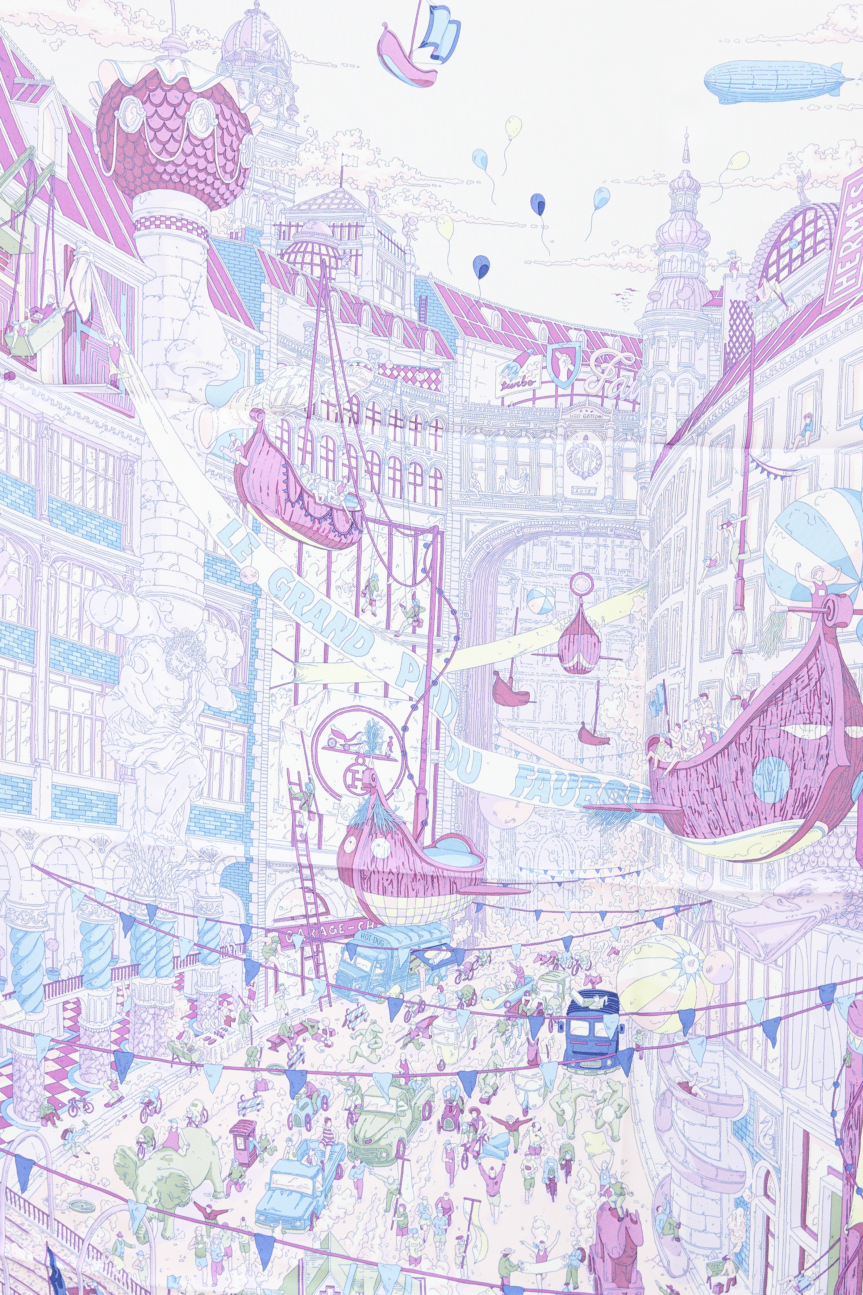 Pre-owned Hermès purple and multicolour silk scarf featuring Le Grand Prix du Faubourg print by Ugo Gattoni, race motif, and hand rolled edges.