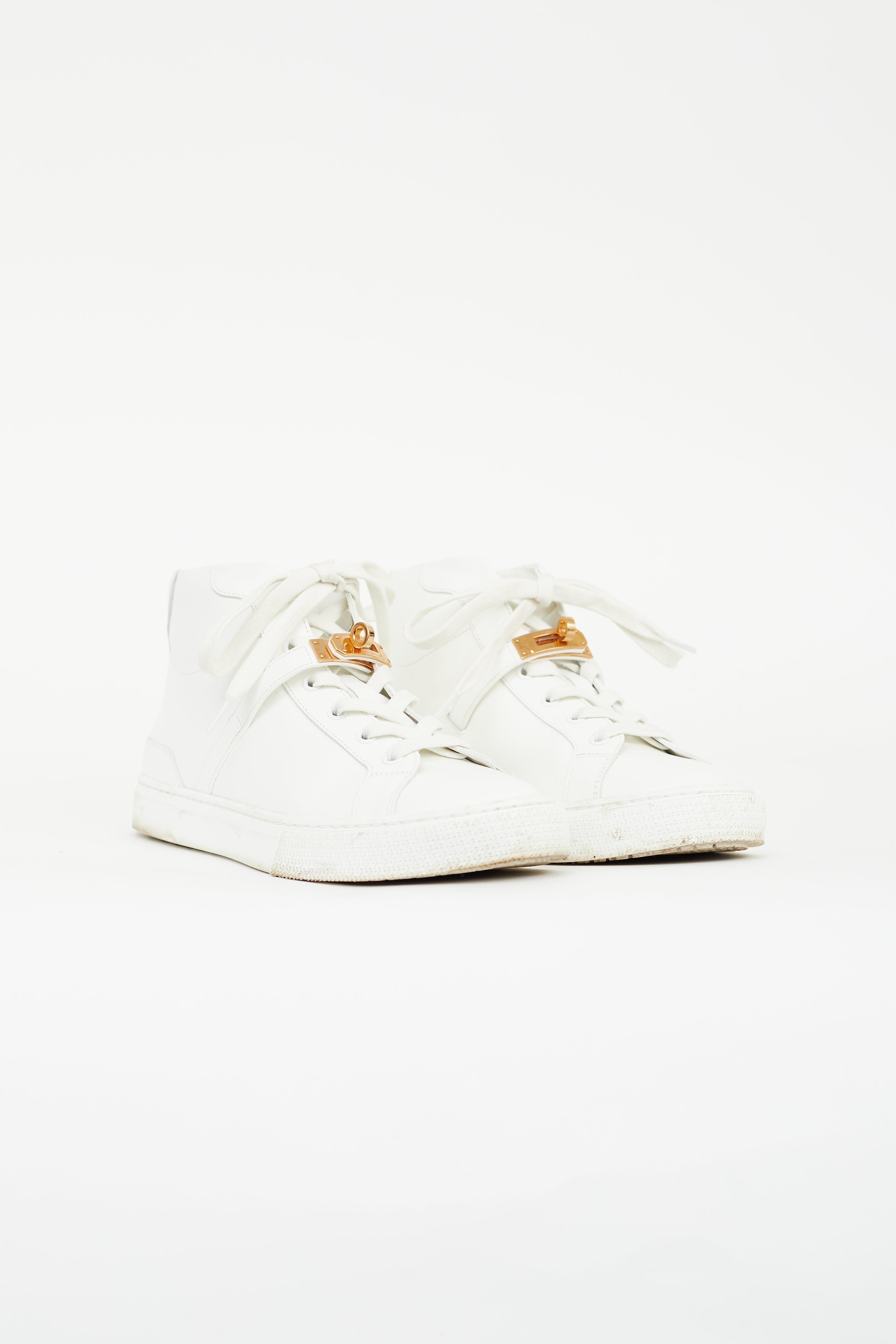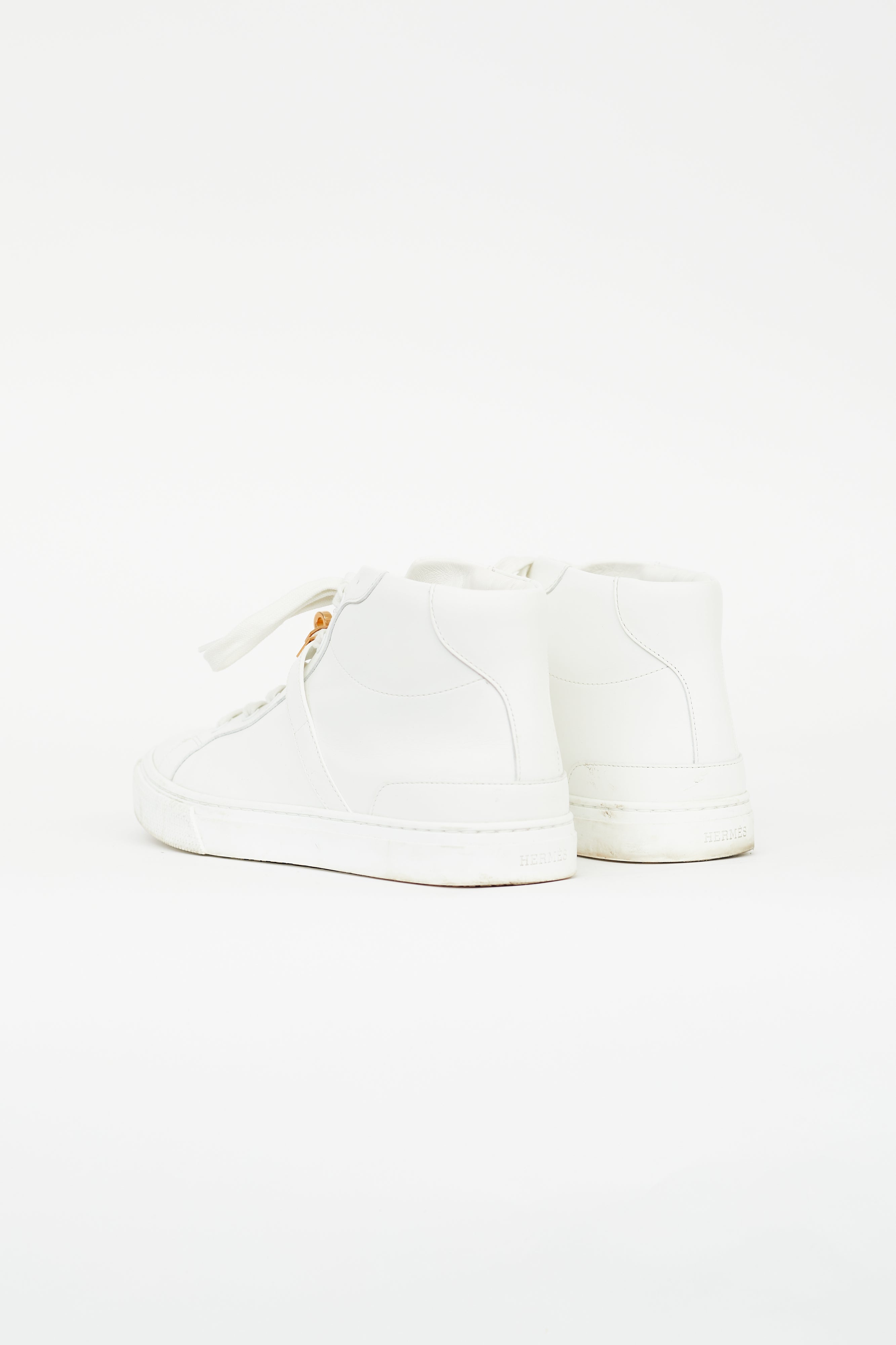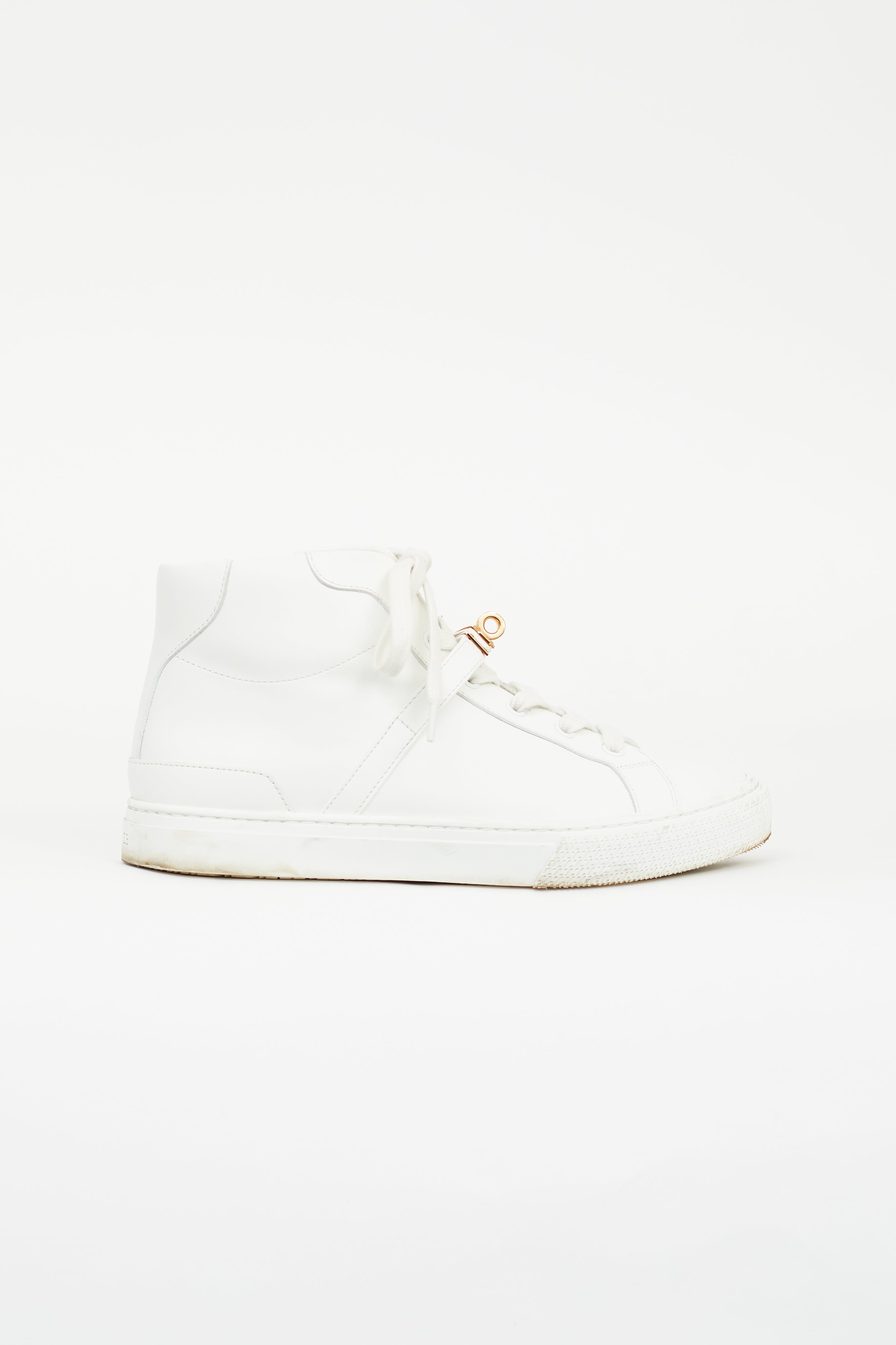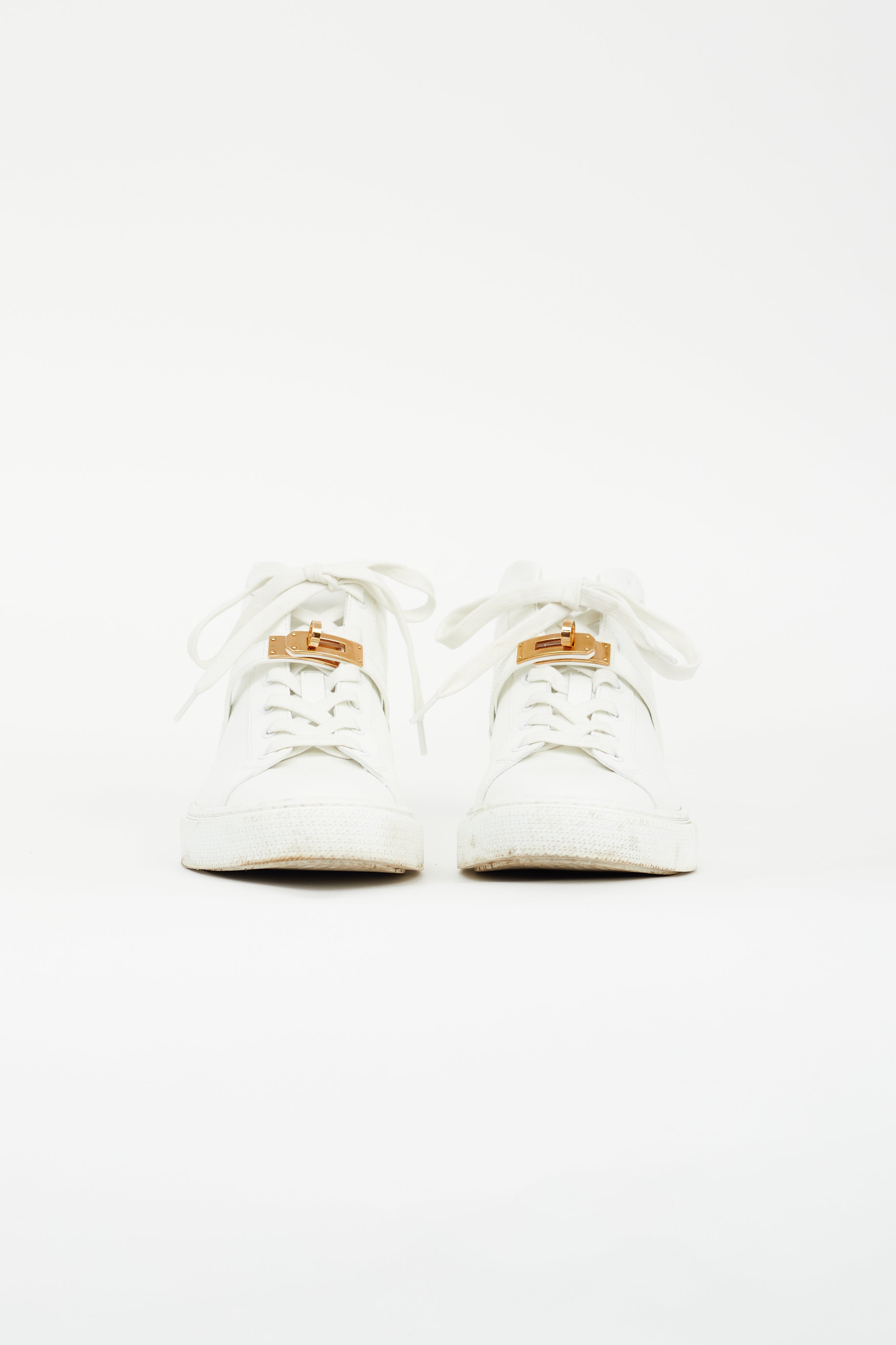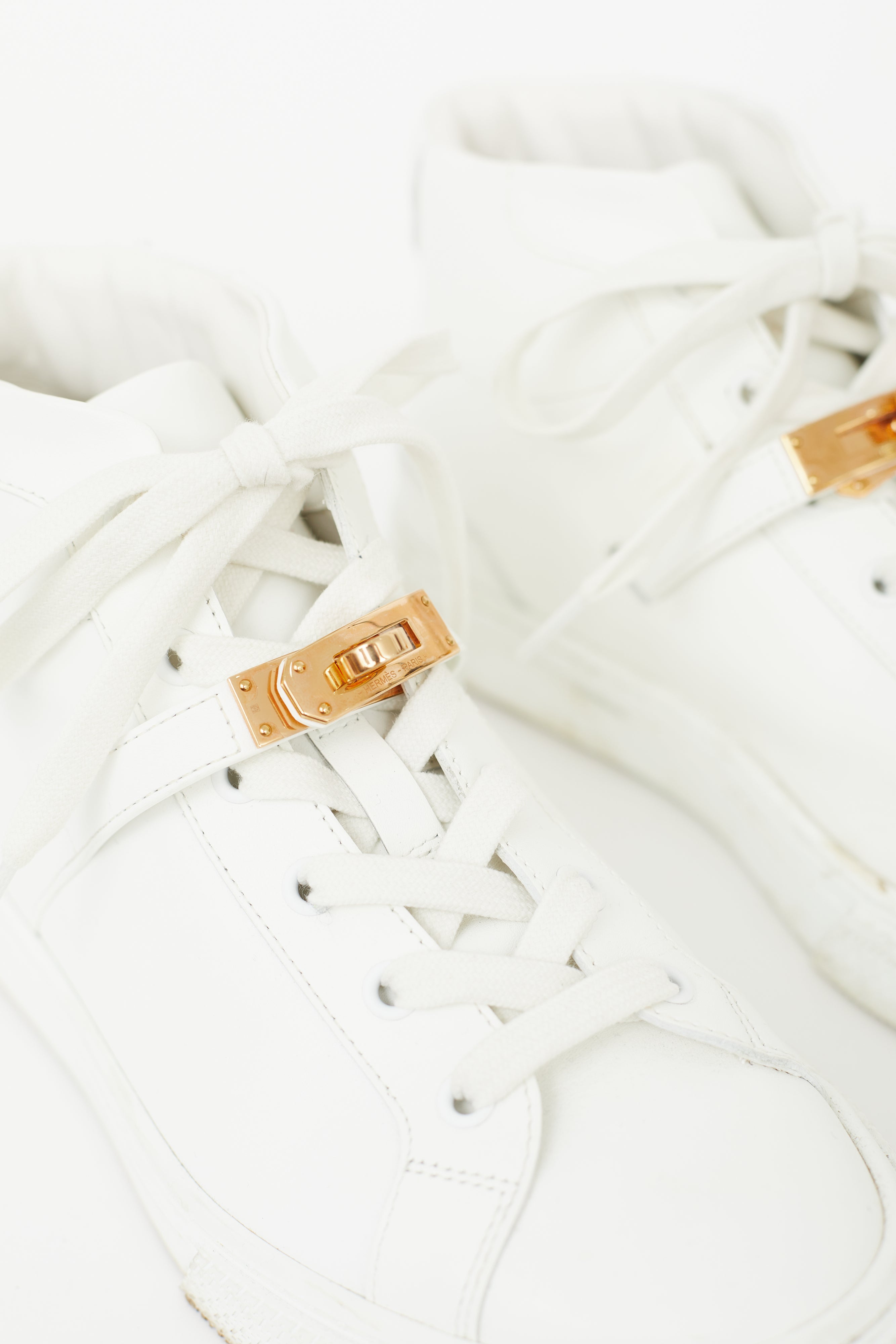 Pre-owned Hermès white Daydream sneaker featuring rounded toe, lace up vamp, rose gold Kelly buckle at vamp, and embossed logo at back of heel.