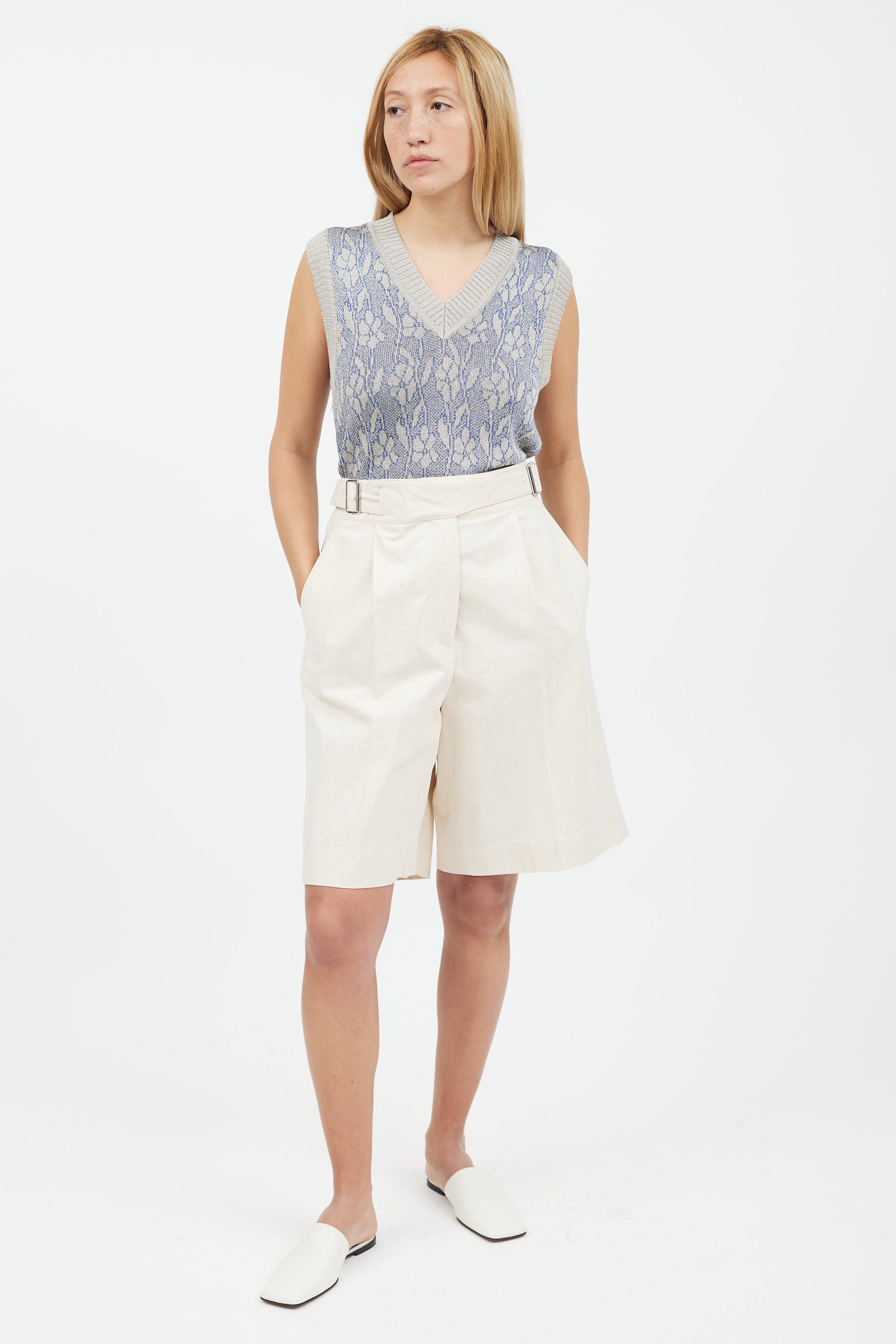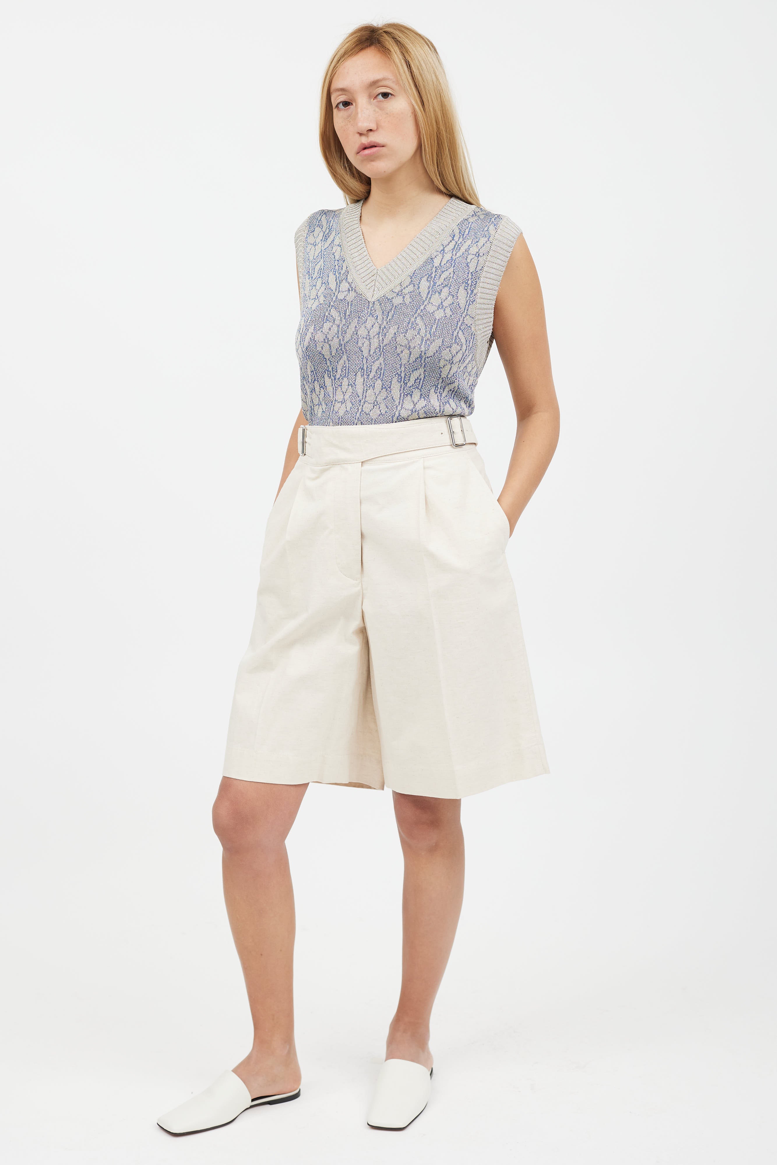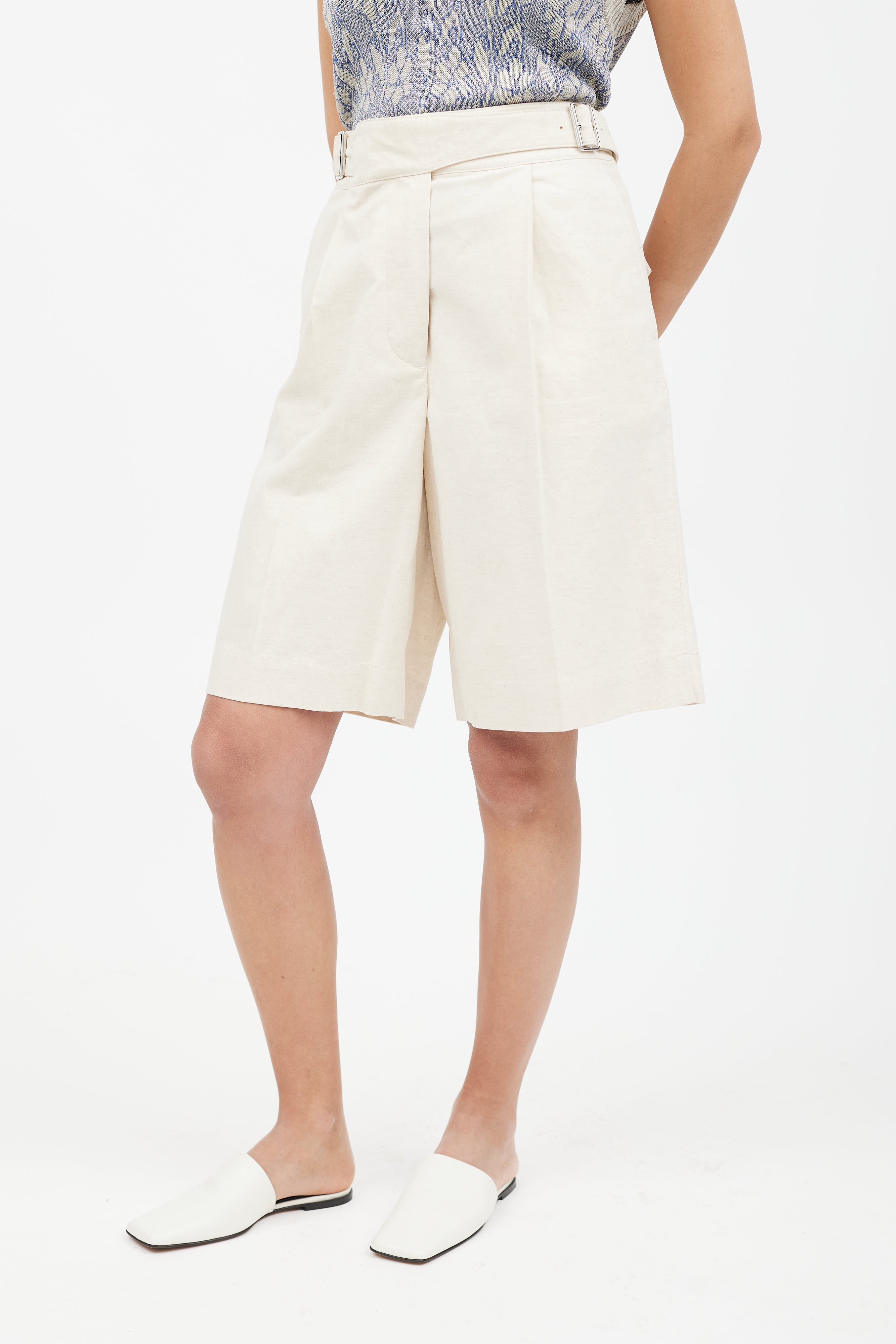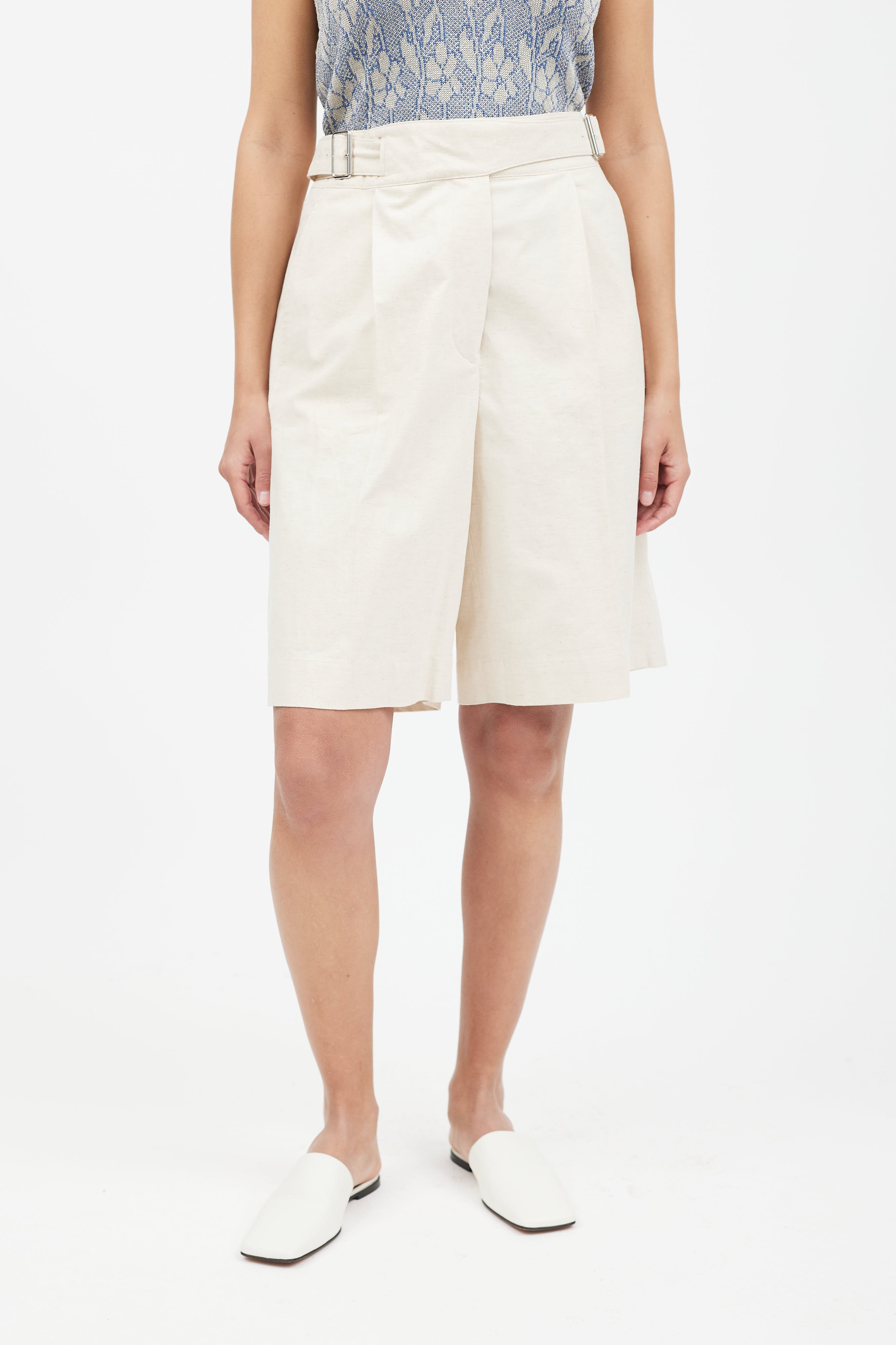 Pre-owned Acne Studios cream pleated linen shorts featuring adjustable belt strap at waist, silver tone buckle, two slip pockets, two patch pockets at back, and zip fly closure.