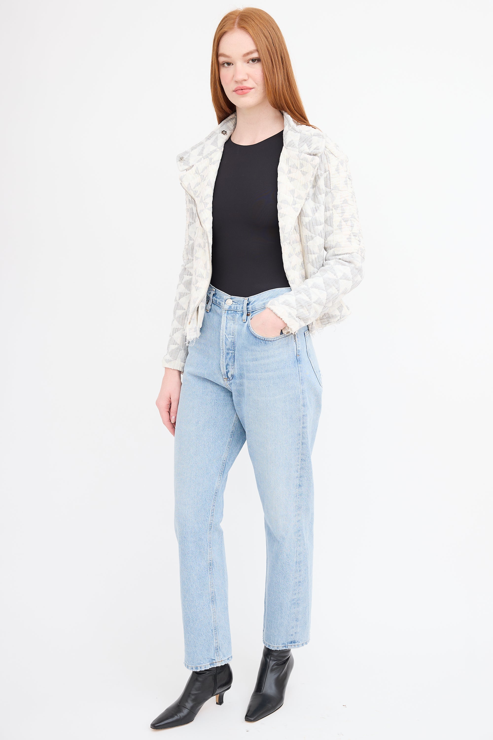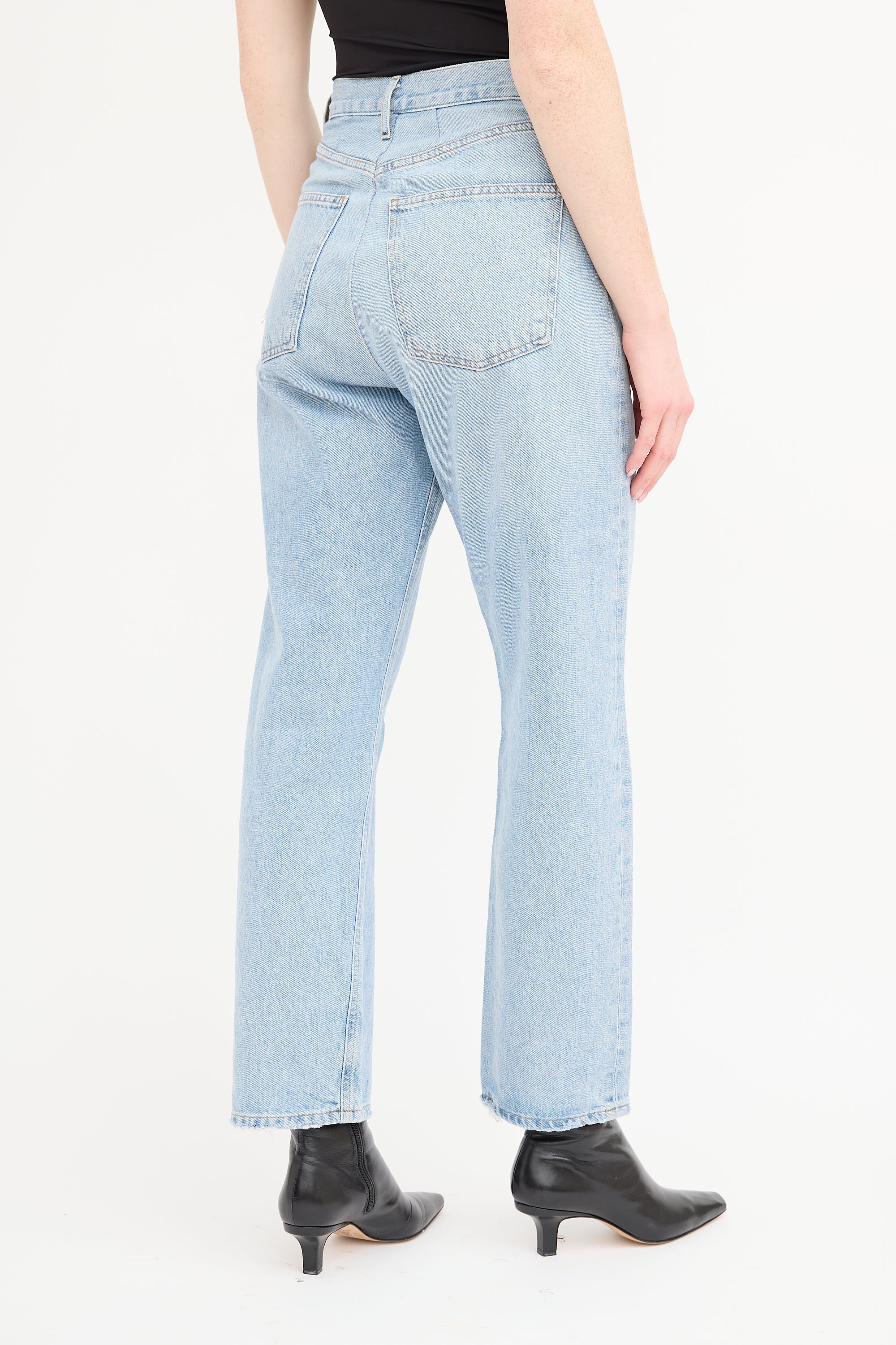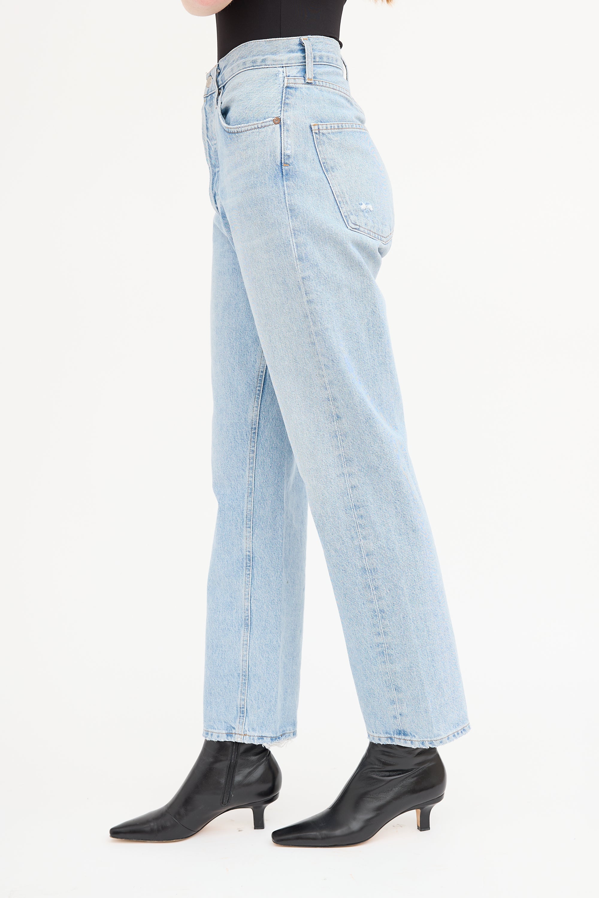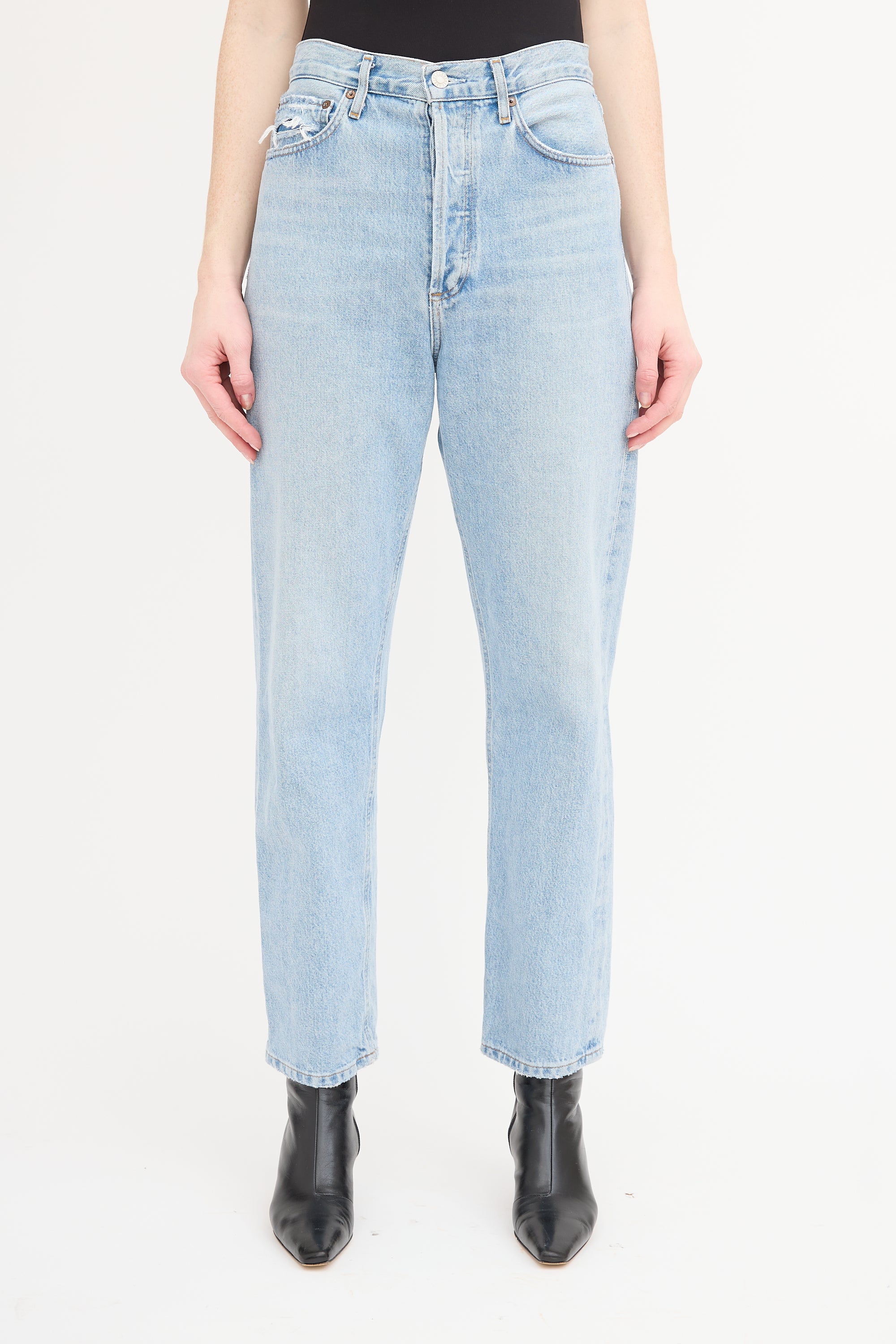 Pre-owned Agolde light wash 90s jeans featuring button fly, belt loops, five pocket styling with distressed trim, straight leg, and raw hem.